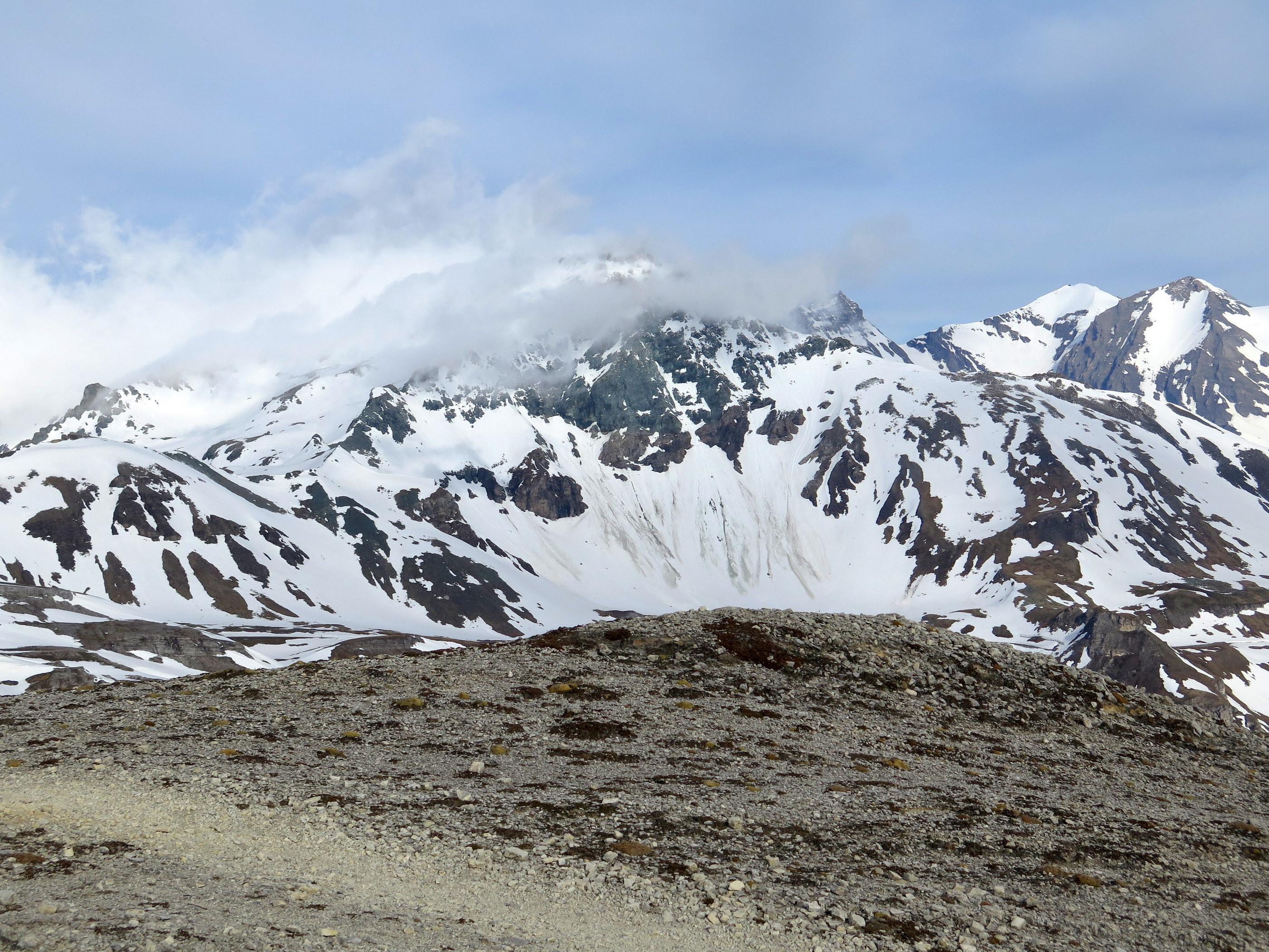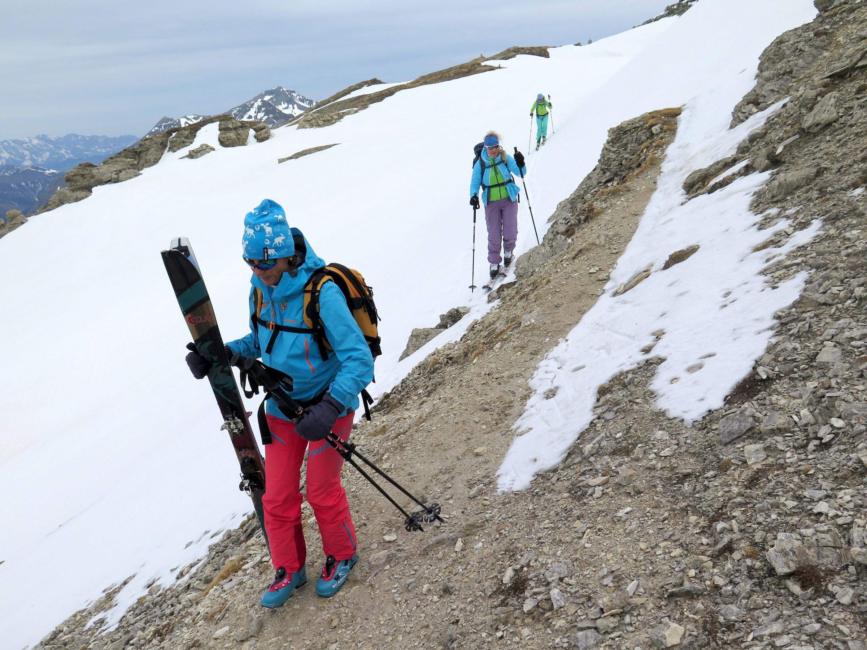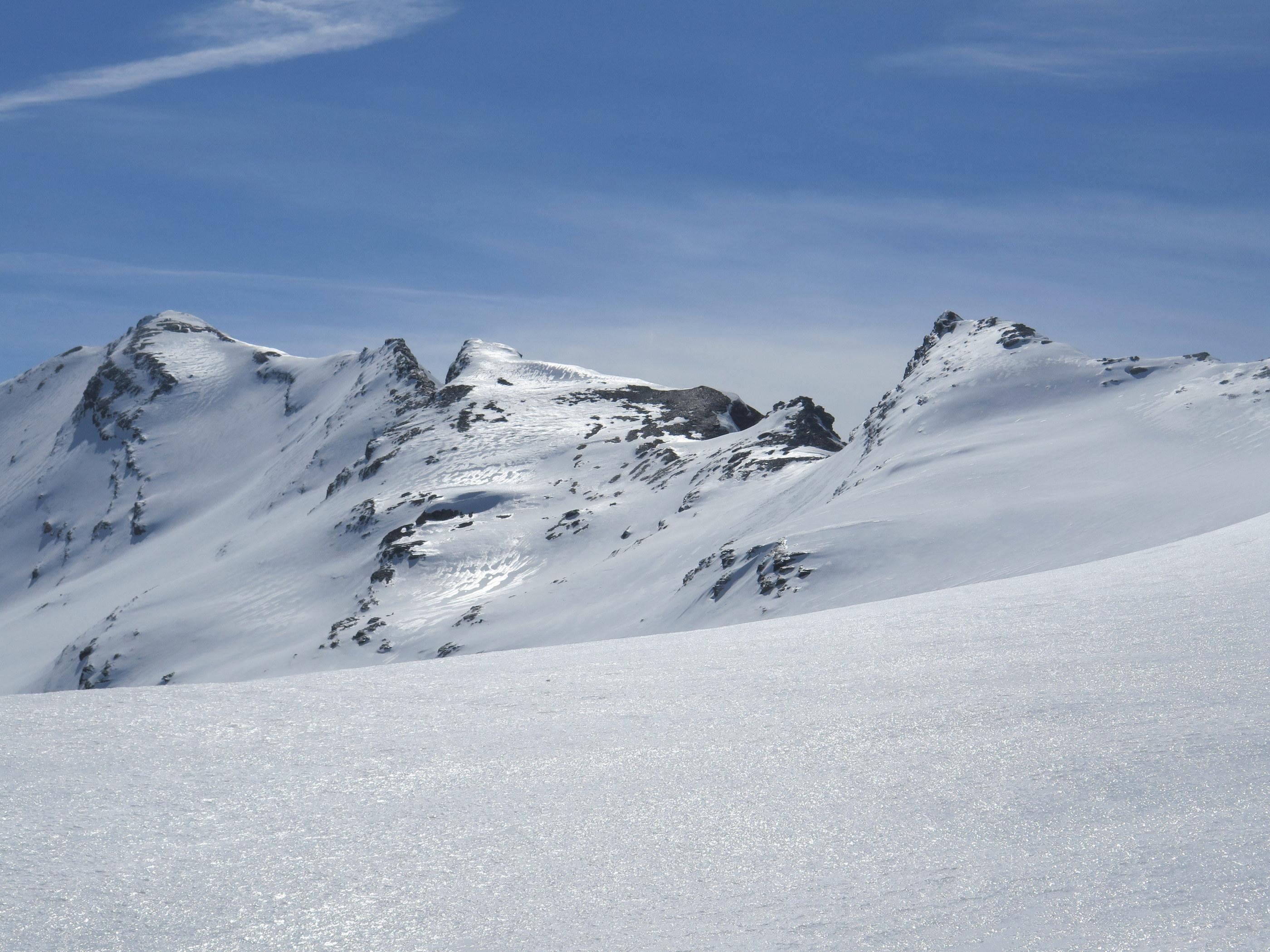 Bei der Auffahrt auf der Glocknerstraße sind Kloben und Brennkogel um kurz nach sieben noch in Wolken, lebhafter S-Wind treibt die Staubewölkung an den Alpenhauptkamm. Kurzfristig ändern wir beim Elendboden unsere Pläne und starten nun vom Hochtor aus in Richtung Modereck, weil dort zumindest durchgehend freie Sicht herrscht. Die Schneelage bis zur Weißenbachscharte ist schlichtwegs erschütternd, wir wandern abschnittweise "trockenen Fußes" am gut geschotterten Klagenfurter Höhenweg. Die Hänge hinauf zum Modereck glänzen verräterisch - eine eisige Oberfläche erinnert an die letzten Niederschläge, die bis über 2800 m hinauf als Regen gefallen sein müssen. Angesichts der wenig einladenden Verhältnisse verzichten wir auf den geplanten Gipfel neben dem Ht. Modereck und suchen erfolgreich eine noch durchgehend schneebedeckte Einfahrt in die oberste Weißenbachrinne, wo sich nach einer veritablen Gratis-Fußmassage auf dem eisig-schattigen Einfahrtshang zumindest auf der sonnigen Seite gegenüber schon so etwas wie Firn finden lässt. Wir fahren bis etwa 2150 m ab und freuen uns dabei am immer feiner werdenden "Firn-Schmieren". Leider zieht es zwischenzeitlich immer mehr zu, sodass wir auf eine weitere Abfahrt verzichten, und steigen wieder in Richtung Weißenbachscharte auf - teilweise ein Feeling, als wären wir zu Testzwecken im Windkanal! Bis wir wieder am Klagenfurter Jubiläumsweg sind, heißt es noch mehrmals Ski aus - Ski an, um die ausgeaperten Stellen zu passieren. Am Weg zum Hochtor zurück zieht die Wokendecke völlig zu - und auch die Föhnlücke im Norden ist mittlerweile fast ganz geschlossen. Na ja - immerhin ist heute der "Tag der Arbeit" - und nicht vorrangig des Vergnügens ...