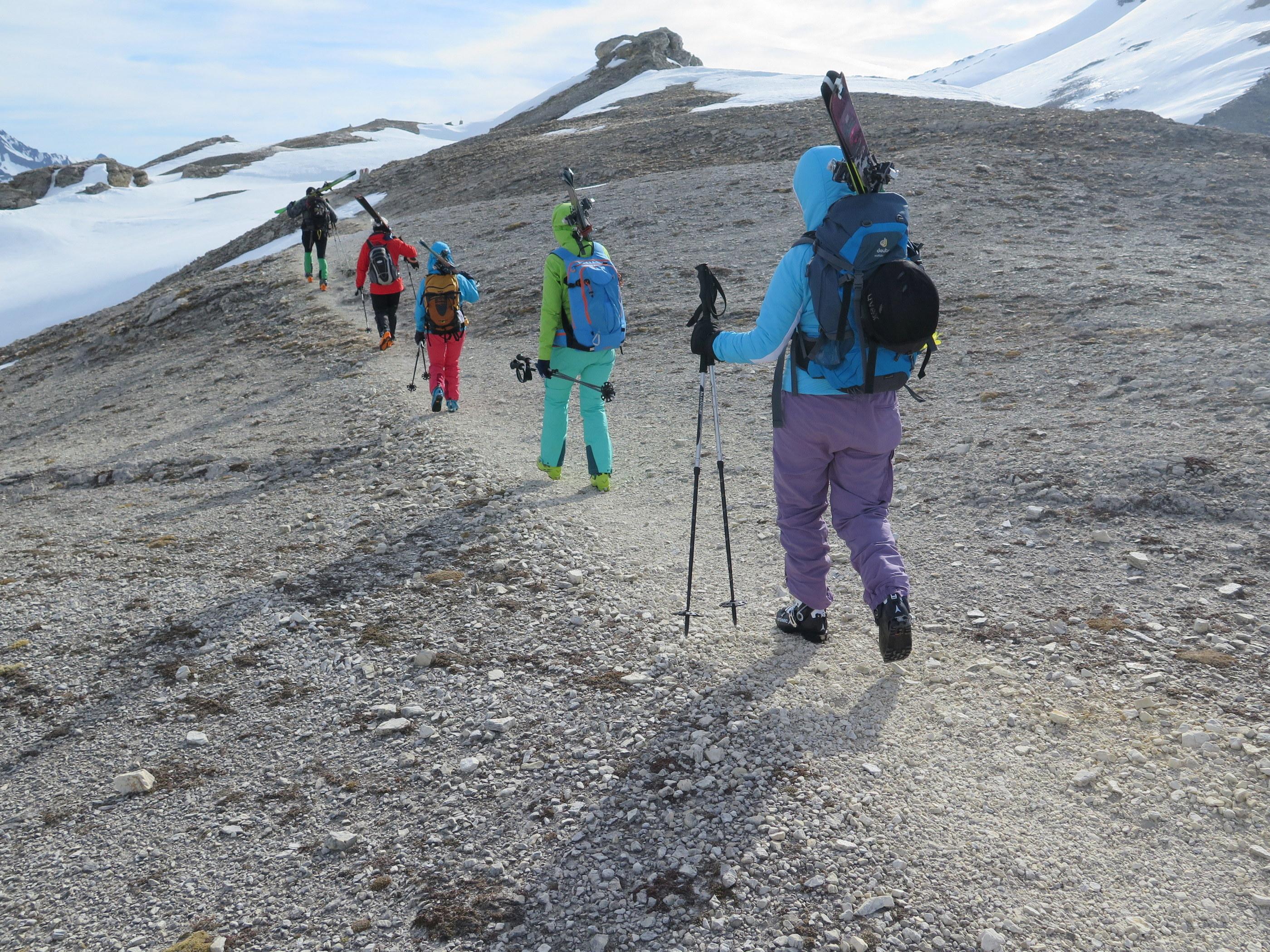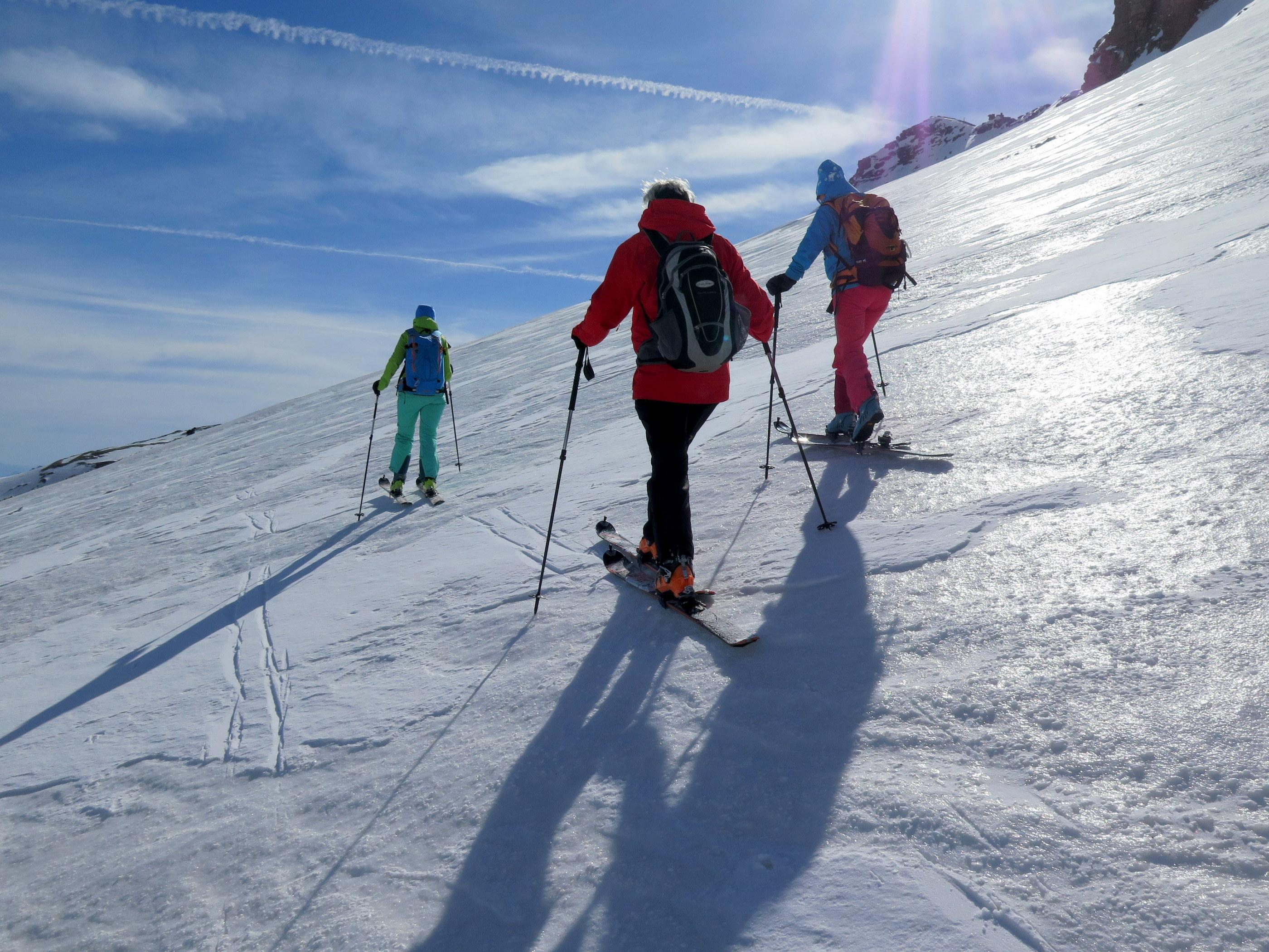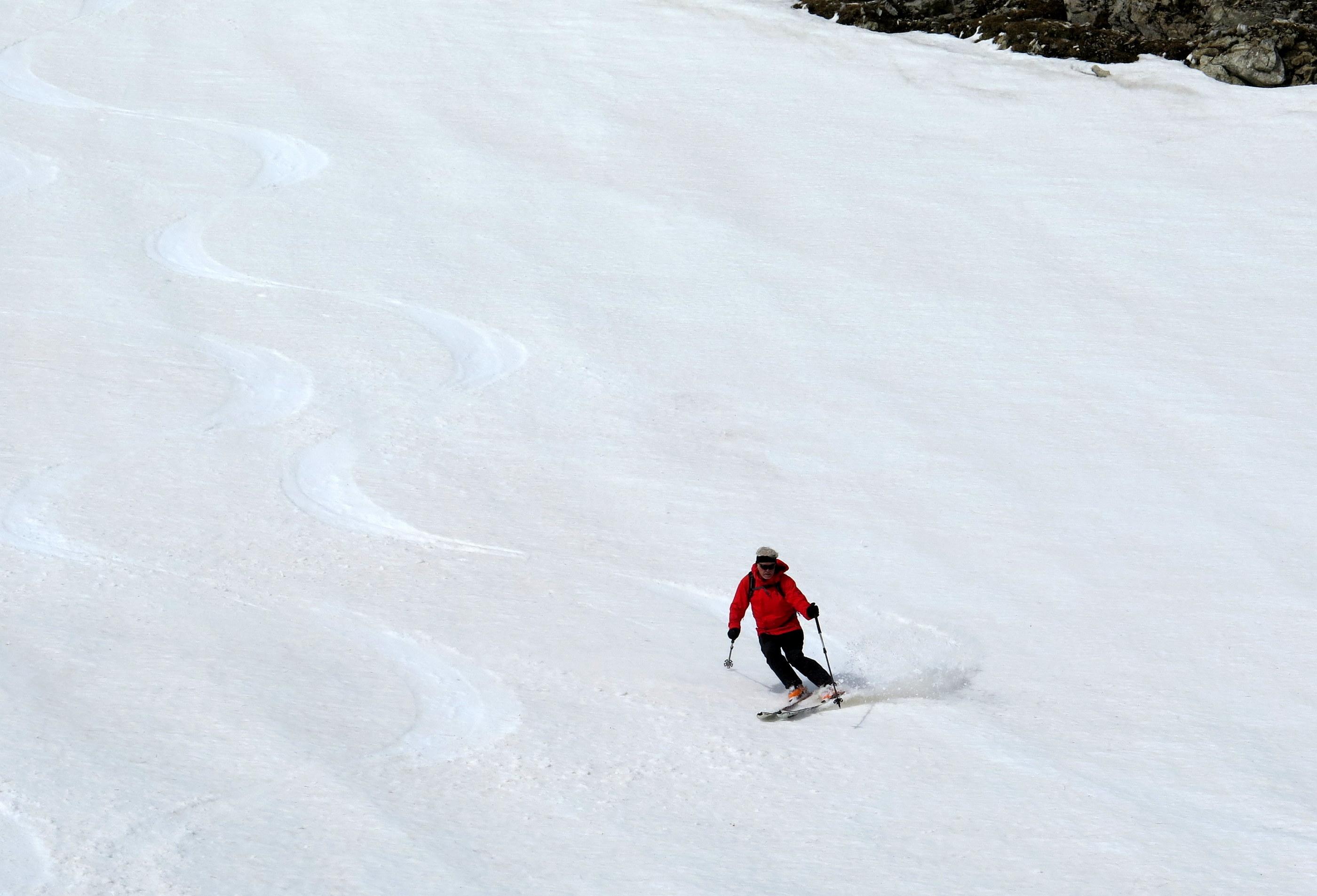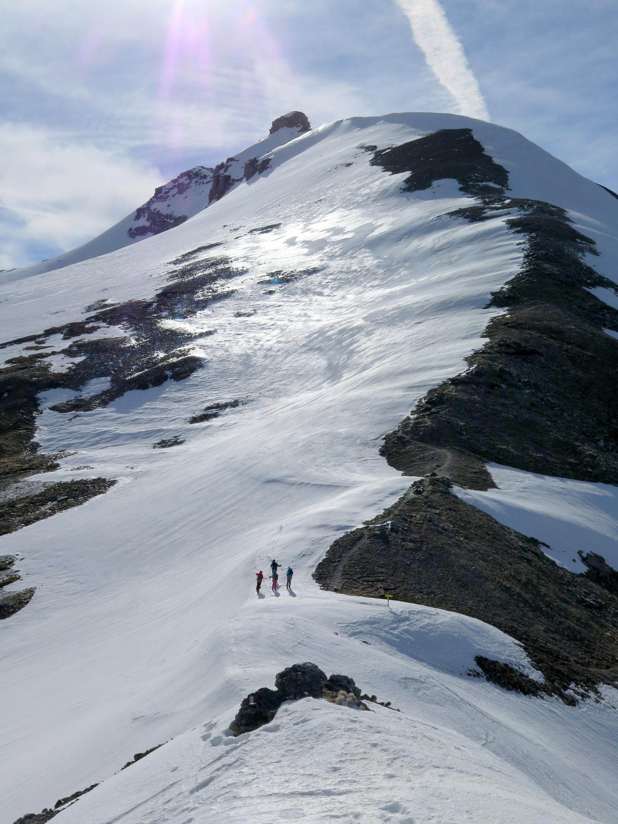 Bei der Auffahrt auf der Glocknerstraße sind Kloben und Brennkogel um kurz nach sieben noch in Wolken, lebhafter S-Wind treibt die Staubewölkung an den Alpenhauptkamm. Kurzfristig ändern wir beim Elendboden unsere Pläne und starten nun vom Hochtor aus in Richtung Modereck, weil dort zumindest durchgehend freie Sicht herrscht. Die Schneelage bis zur Weißenbachscharte ist schlichtwegs erschütternd, wir wandern abschnittweise "trockenen Fußes" am gut geschotterten Klagenfurter Höhenweg. Die Hänge hinauf zum Modereck glänzen verräterisch - eine eisige Oberfläche erinnert an die letzten Niederschläge, die bis über 2800 m hinauf als Regen gefallen sein müssen. Angesichts der wenig einladenden Verhältnisse verzichten wir auf den geplanten Gipfel neben dem Ht. Modereck und suchen erfolgreich eine noch durchgehend schneebedeckte Einfahrt in die oberste Weißenbachrinne, wo sich nach einer veritablen Gratis-Fußmassage auf dem eisig-schattigen Einfahrtshang zumindest auf der sonnigen Seite gegenüber schon so etwas wie Firn finden lässt. Wir fahren bis etwa 2150 m ab und freuen uns dabei am immer feiner werdenden "Firn-Schmieren". Leider zieht es zwischenzeitlich immer mehr zu, sodass wir auf eine weitere Abfahrt verzichten, und steigen wieder in Richtung Weißenbachscharte auf - teilweise ein Feeling, als wären wir zu Testzwecken im Windkanal! Bis wir wieder am Klagenfurter Jubiläumsweg sind, heißt es noch mehrmals Ski aus - Ski an, um die ausgeaperten Stellen zu passieren. Am Weg zum Hochtor zurück zieht die Wokendecke völlig zu - und auch die Föhnlücke im Norden ist mittlerweile fast ganz geschlossen. Na ja - immerhin ist heute der "Tag der Arbeit" - und nicht vorrangig des Vergnügens ...