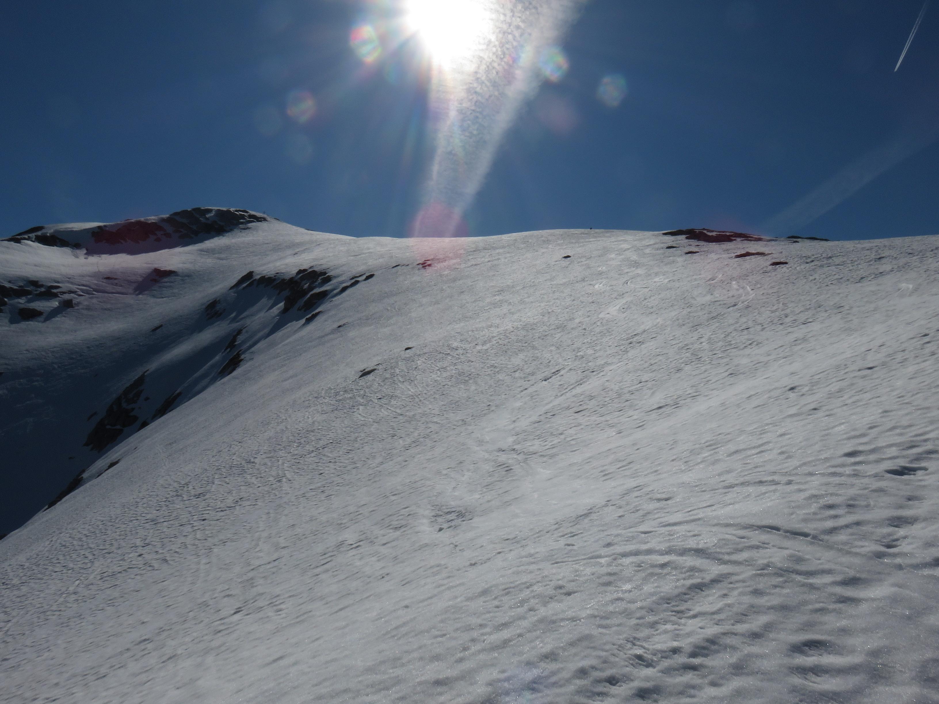 Schnee: Bei der Abfahrt um 11:30 Gipfelhang schön aufgefirnt ab ca. 2000m weicher Frühjahrsschnee mit geringer Einsinktiefe ca. 5cm, es hat schön geschmiert.