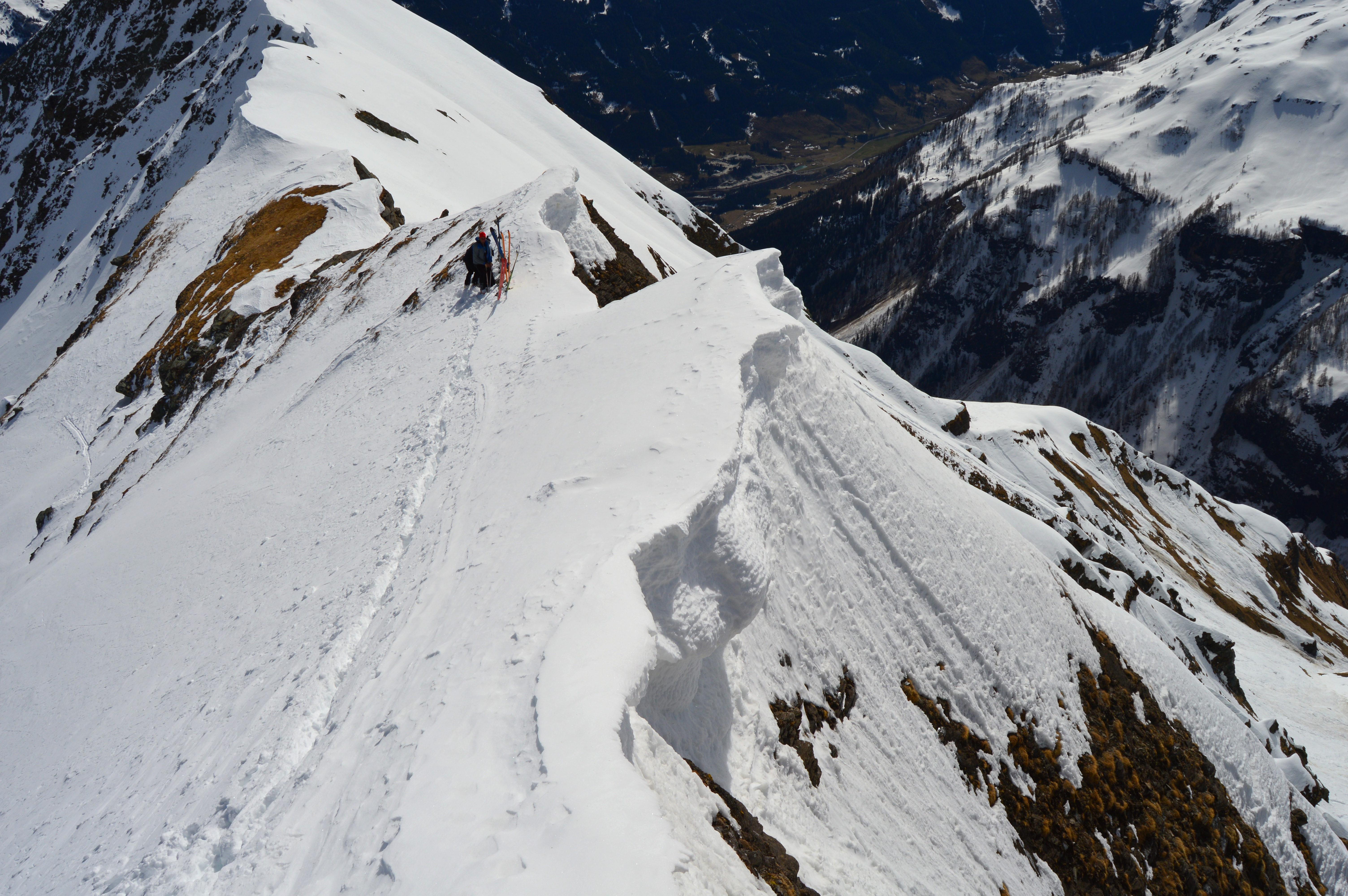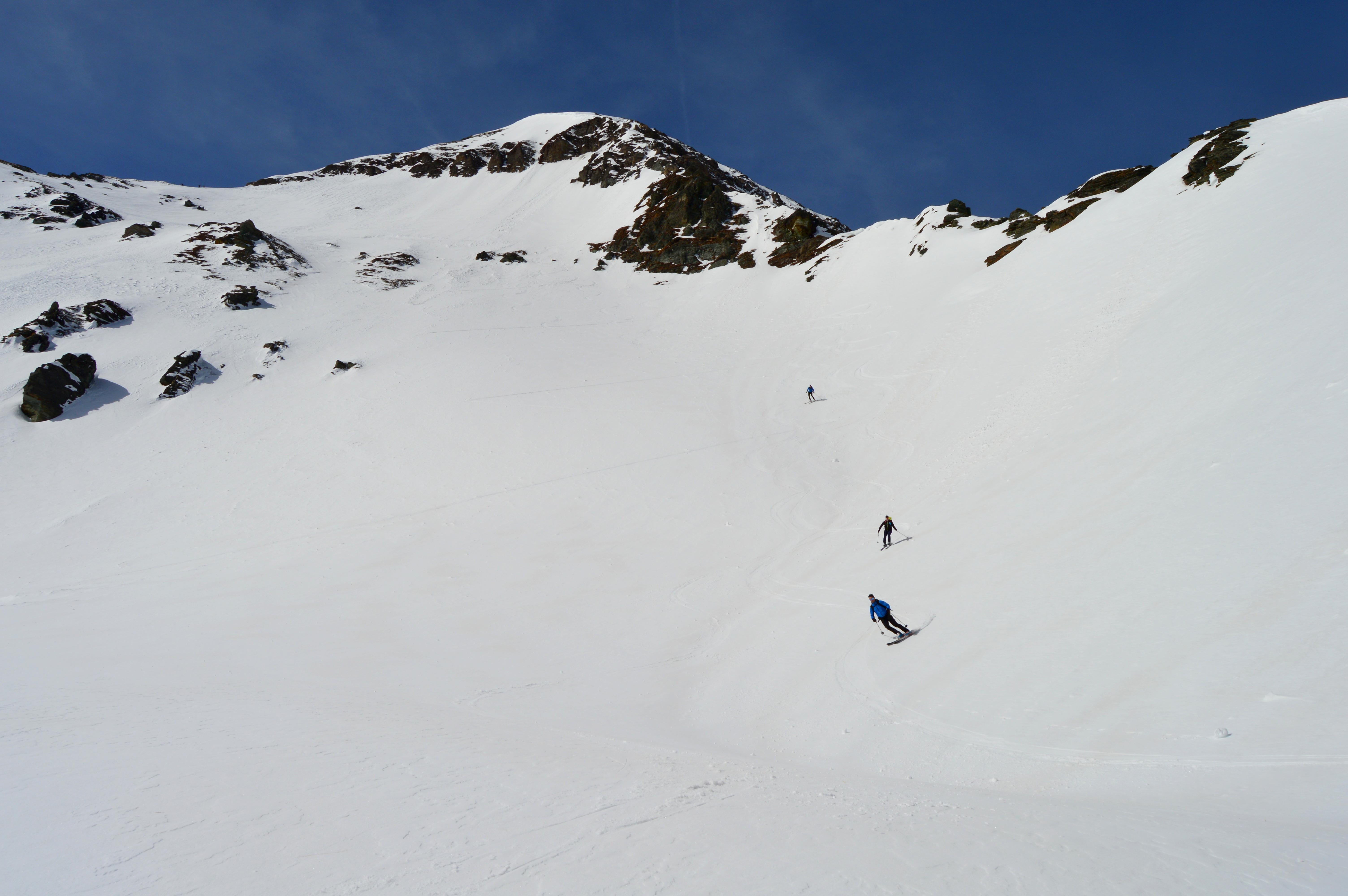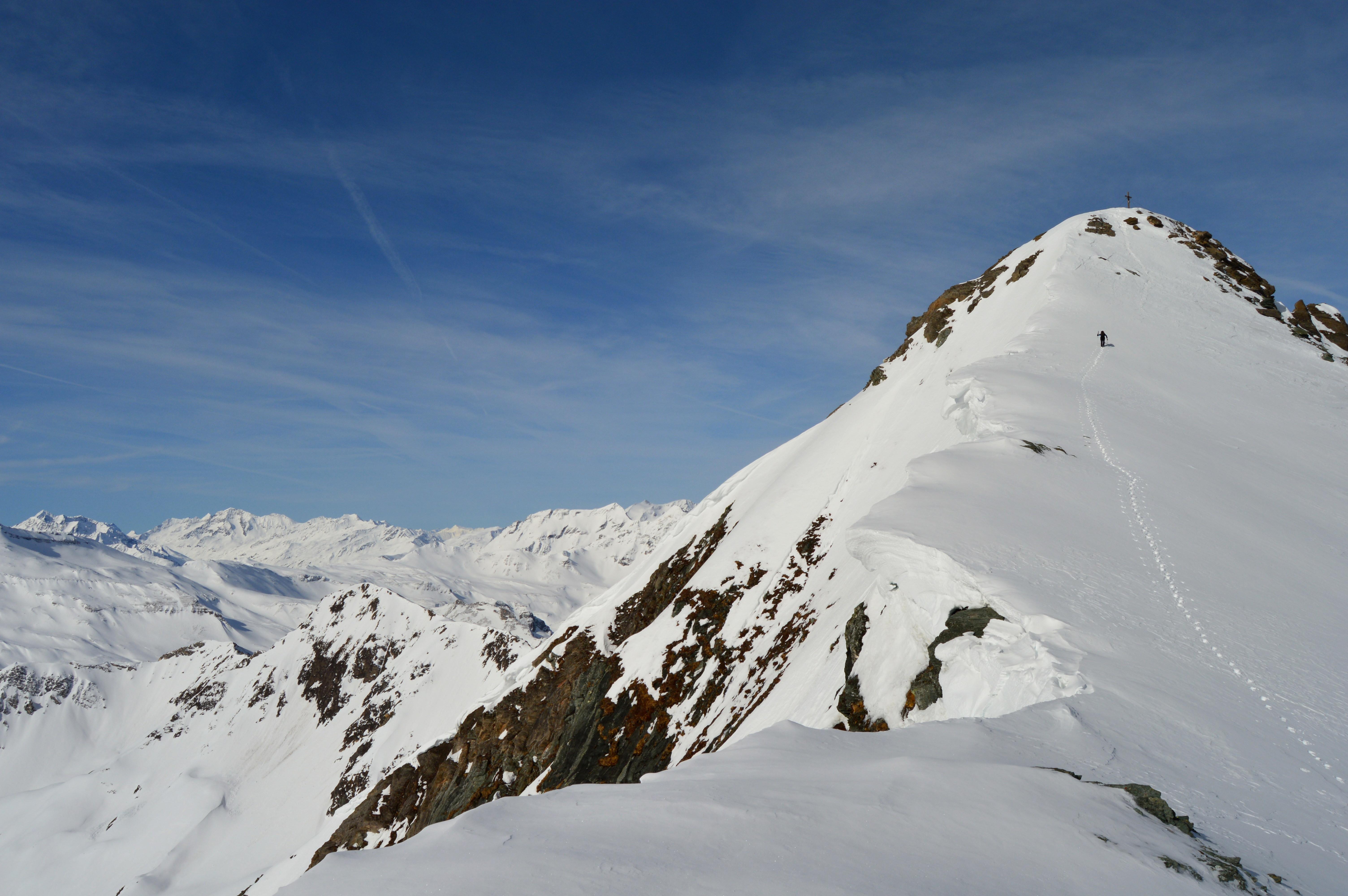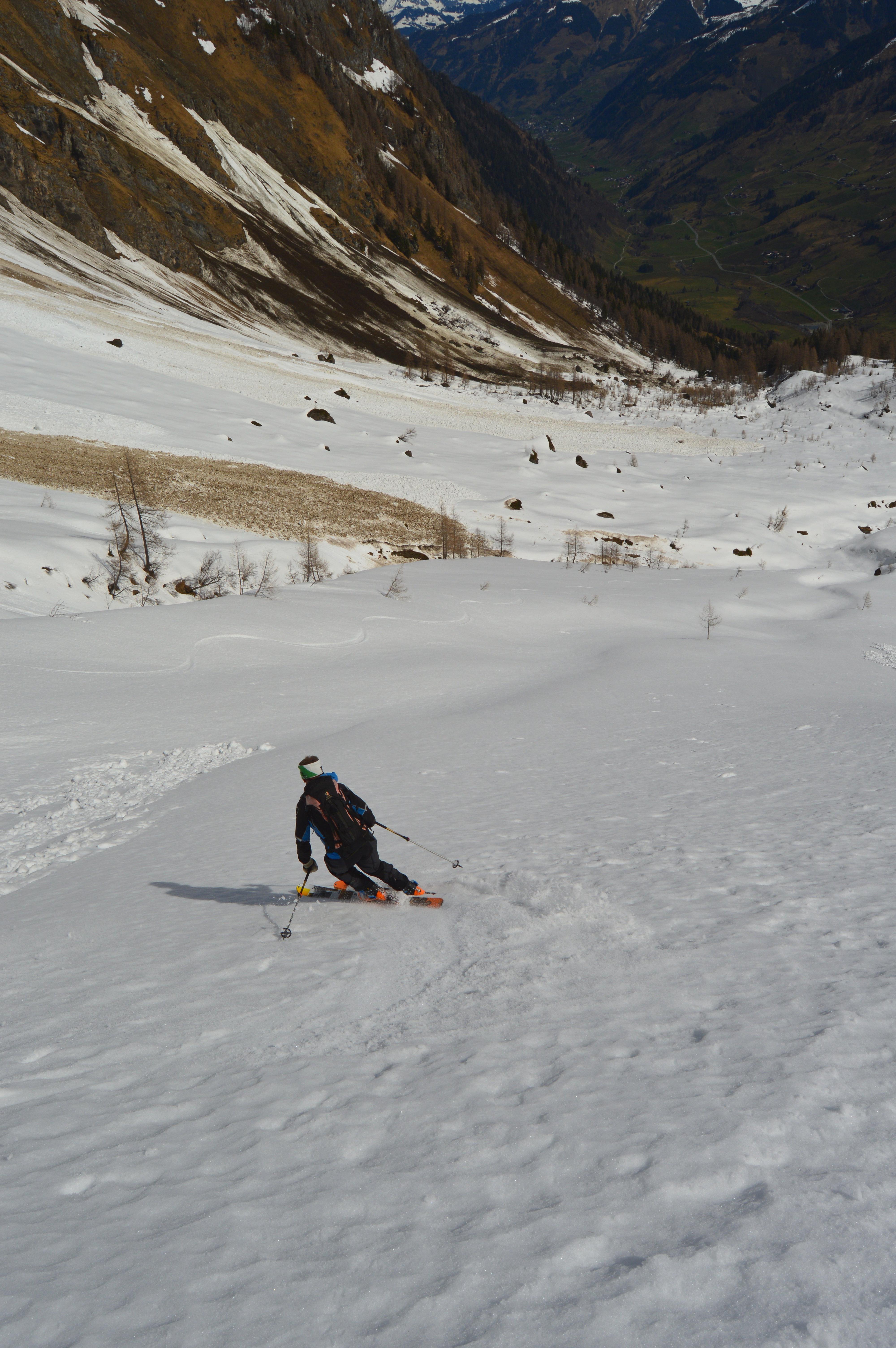 Ab den freien Almböden ging´s dann mit Schi weiter. Die Schneedecke war von unten bis oben gut durchgefrohren. Wir gingen die Tour nicht, wie im Skitourenführer beschrieben über die Feldereralm, sondern direkt über die Steilaufschwünge ins Roßkar. Zweimal mussten wir die Ski über kurze steile Rinnen schultern. Ab dem Schidepot ging´s über den Grat in schöner aussichtsreicher Stapferei unschwierig auf den Gipfel. Für die Abfahrt haben wir den richtigen (frühen) Zeitpunkt erwischt und schwebten in perfektem Firn über die teilweise steilen Hänge hinunter bis zum flachen Karboden.