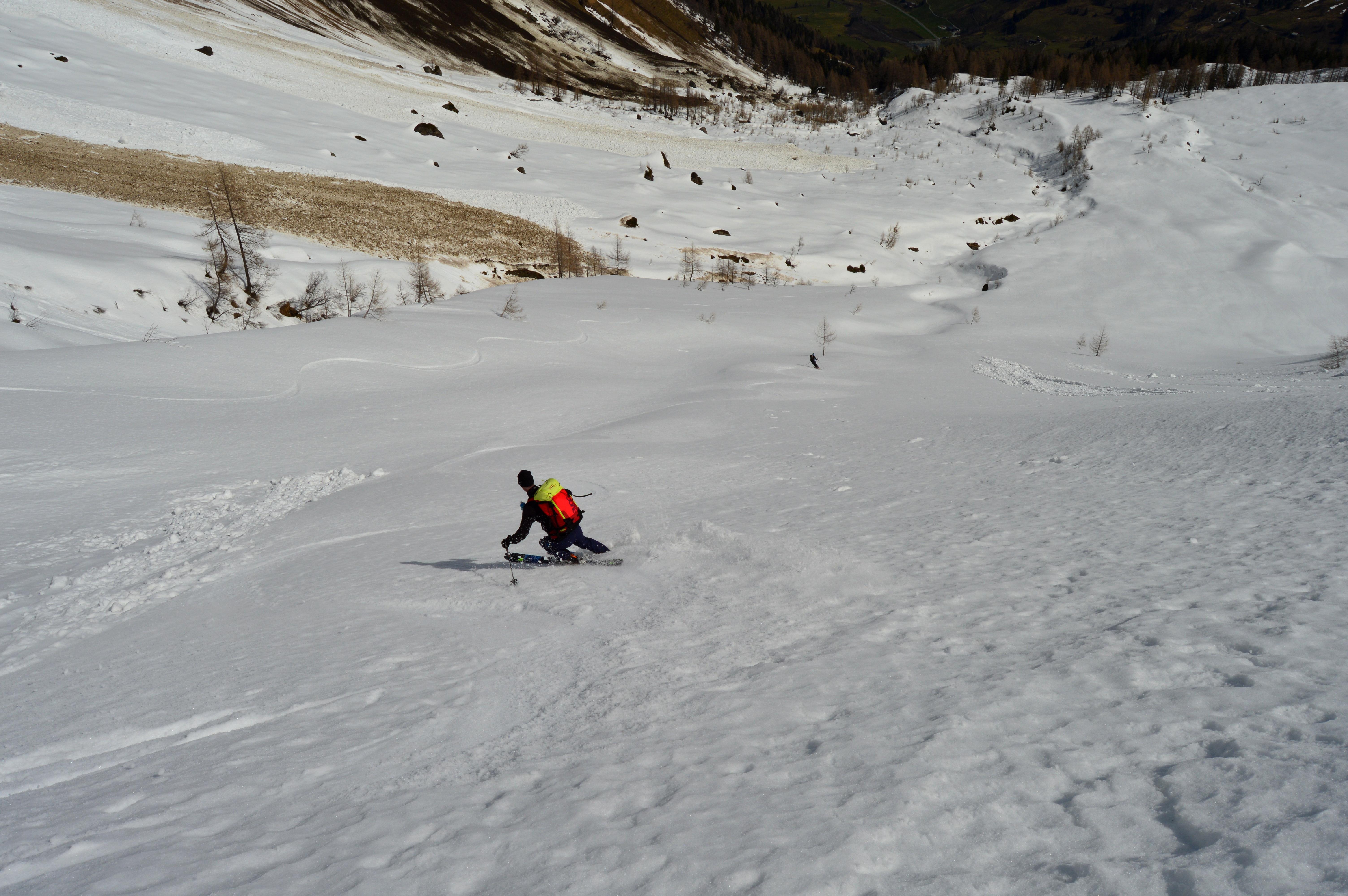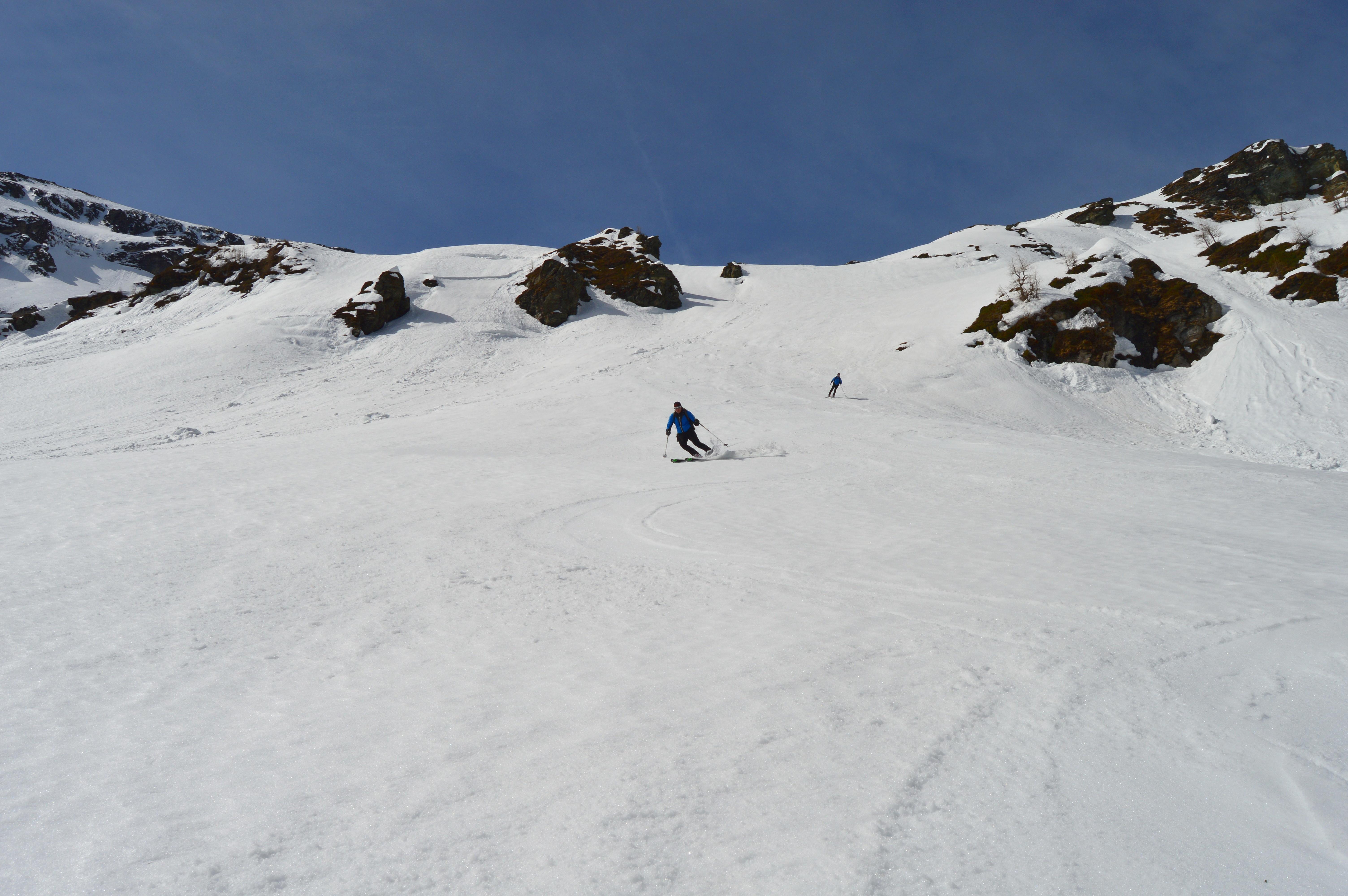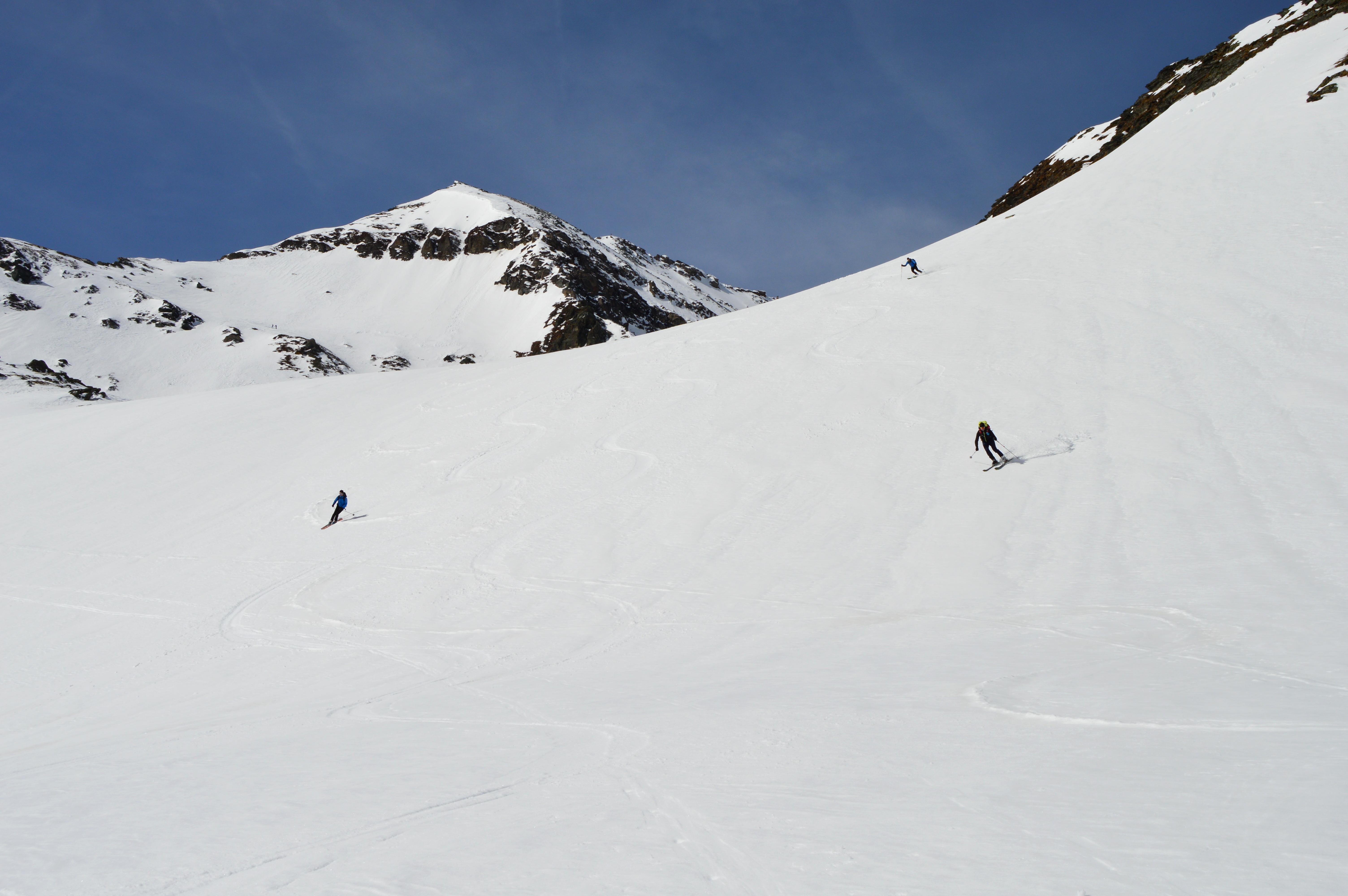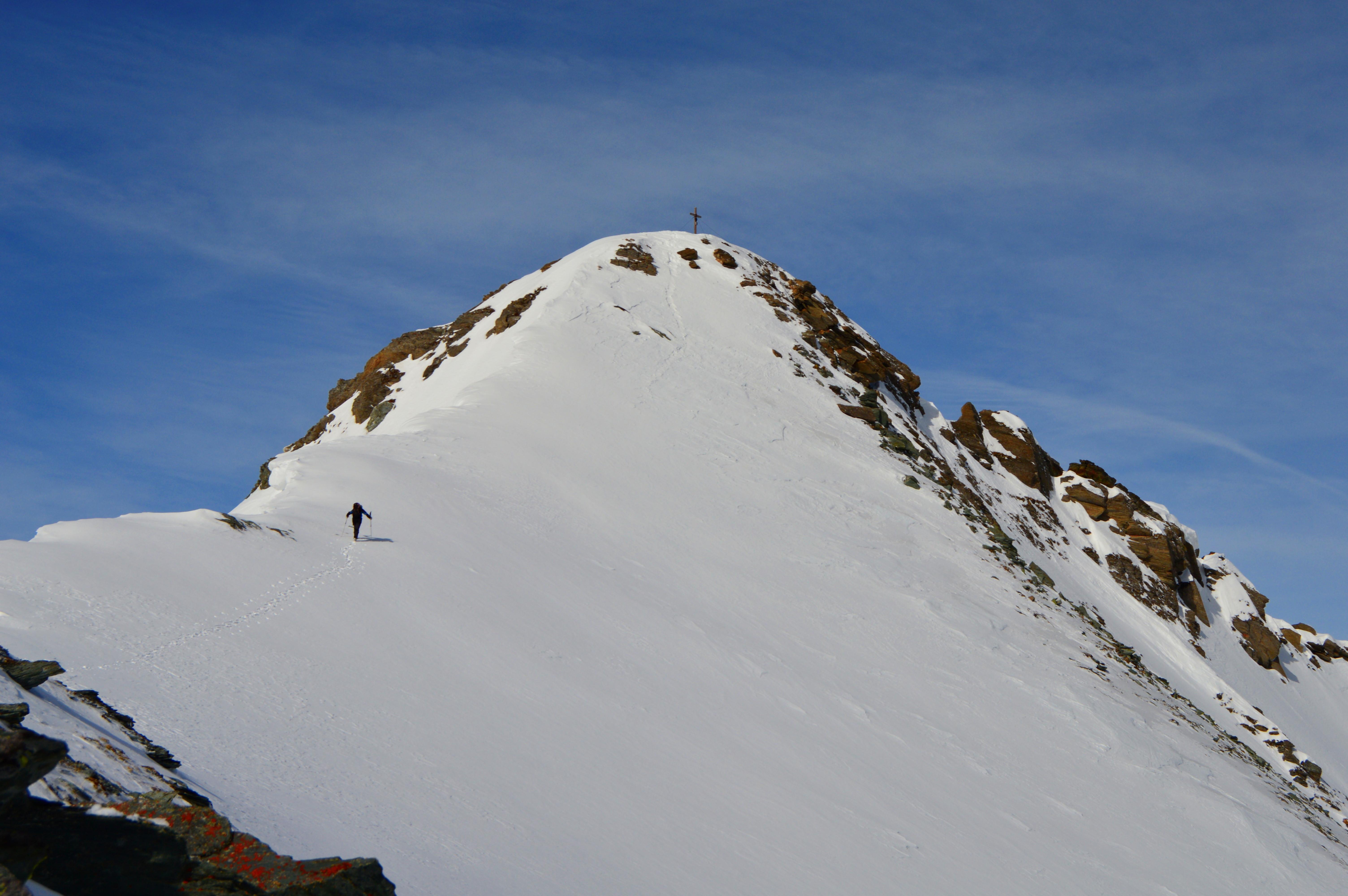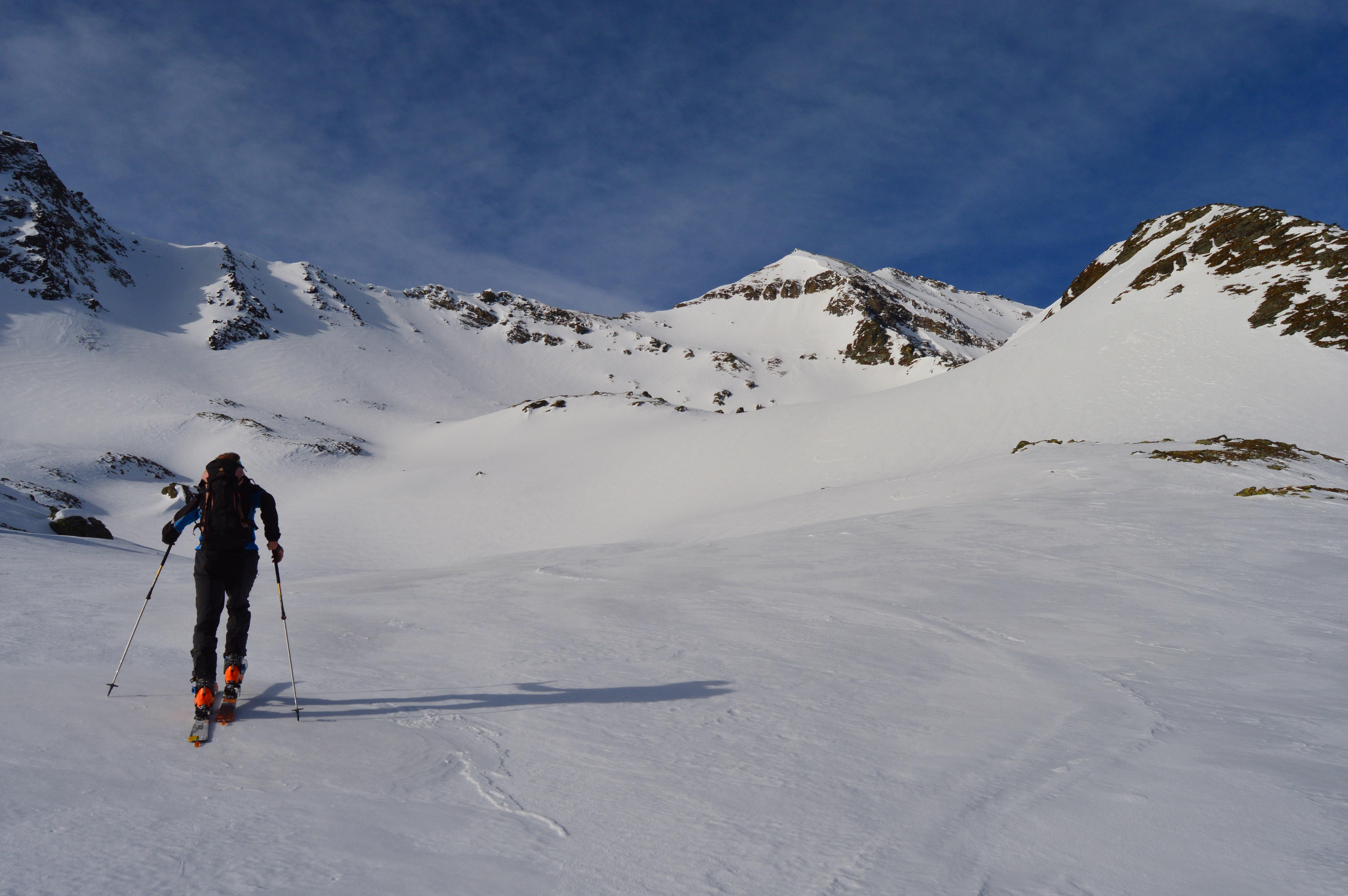 Ab den freien Almböden ging´s dann mit Schi weiter. Die Schneedecke war von unten bis oben gut durchgefrohren. Wir gingen die Tour nicht, wie im Skitourenführer beschrieben über die Feldereralm, sondern direkt über die Steilaufschwünge ins Roßkar. Zweimal mussten wir die Ski über kurze steile Rinnen schultern. Ab dem Schidepot ging´s über den Grat in schöner aussichtsreicher Stapferei unschwierig auf den Gipfel. Für die Abfahrt haben wir den richtigen (frühen) Zeitpunkt erwischt und schwebten in perfektem Firn über die teilweise steilen Hänge hinunter bis zum flachen Karboden.