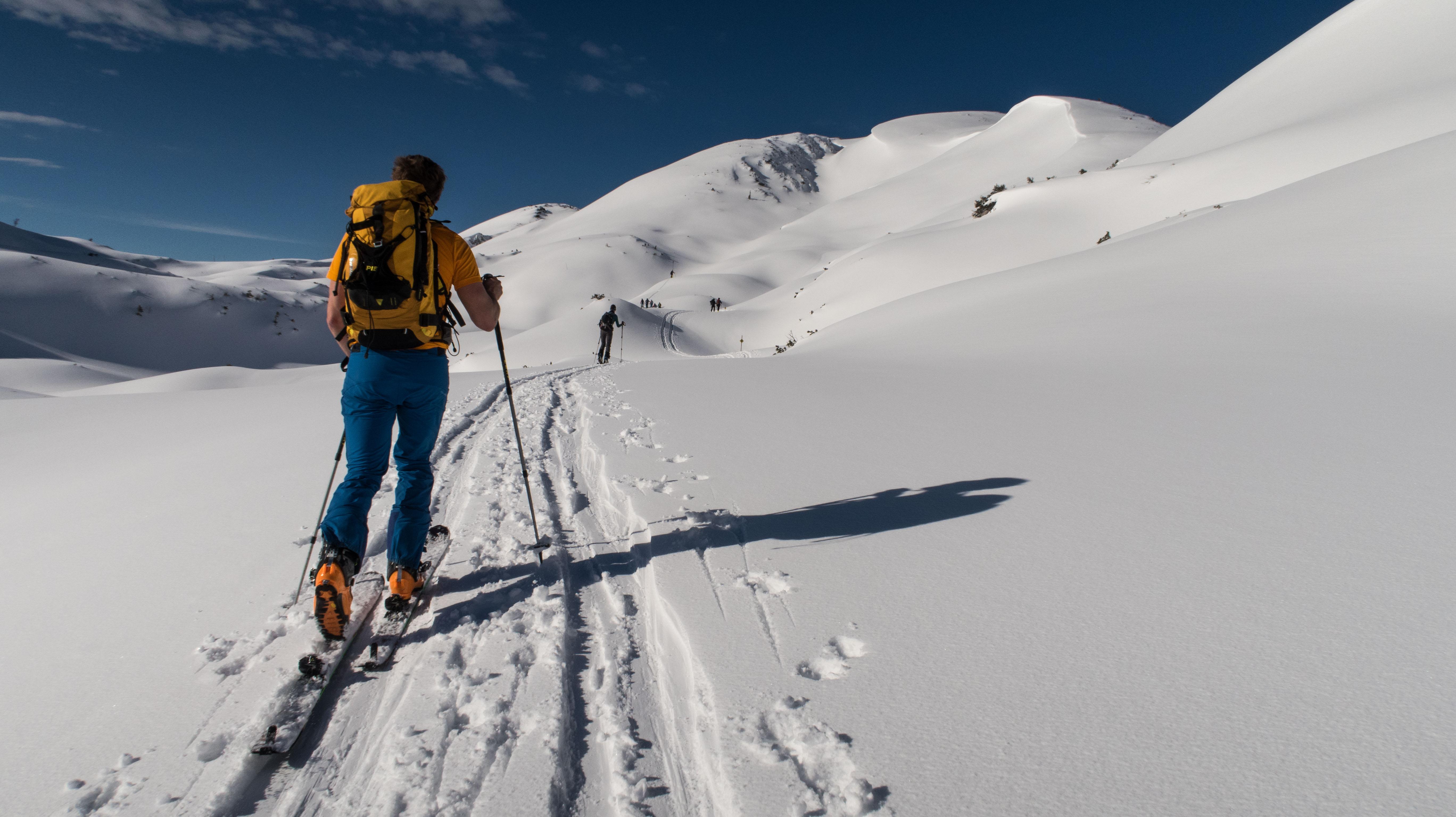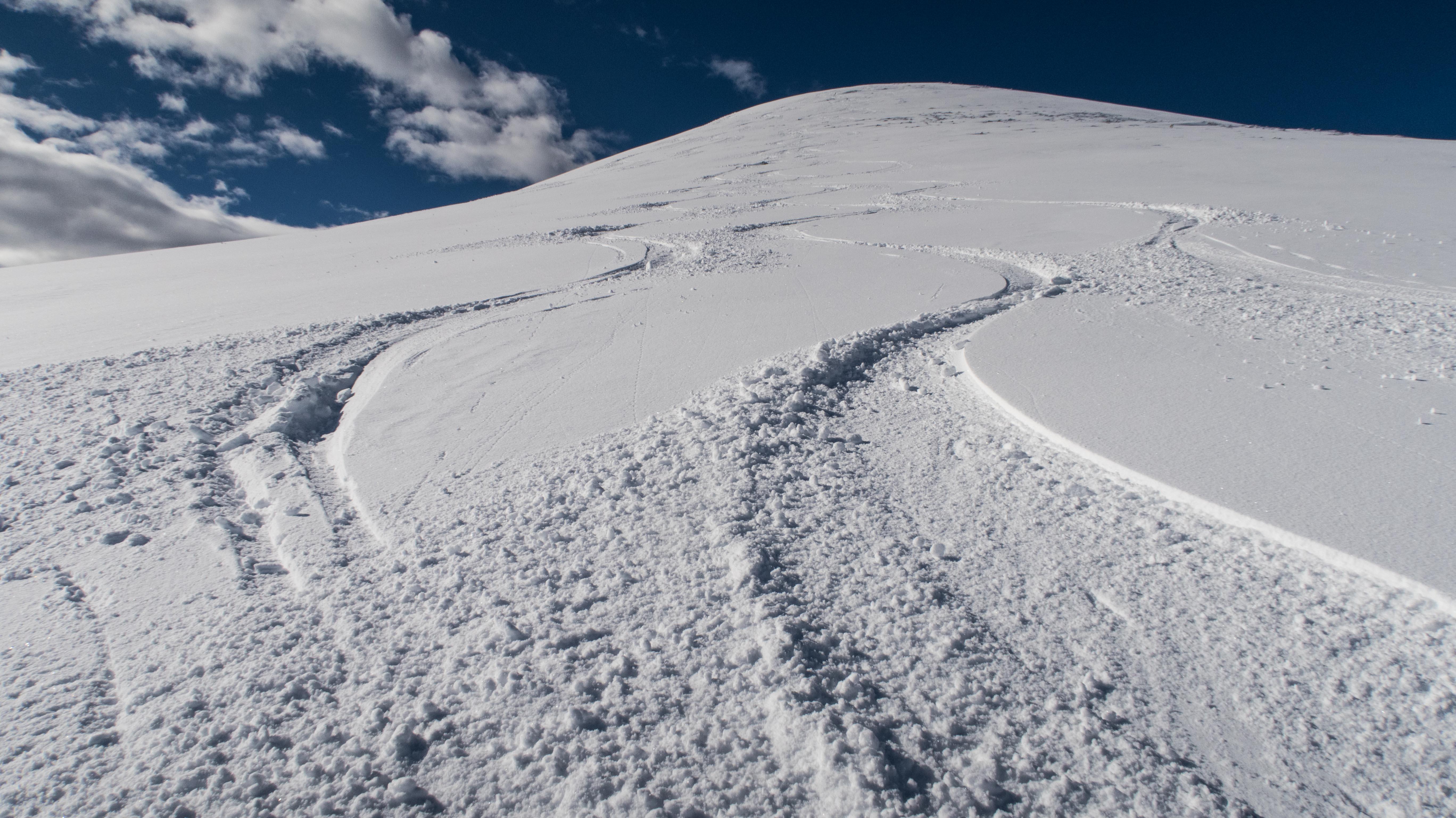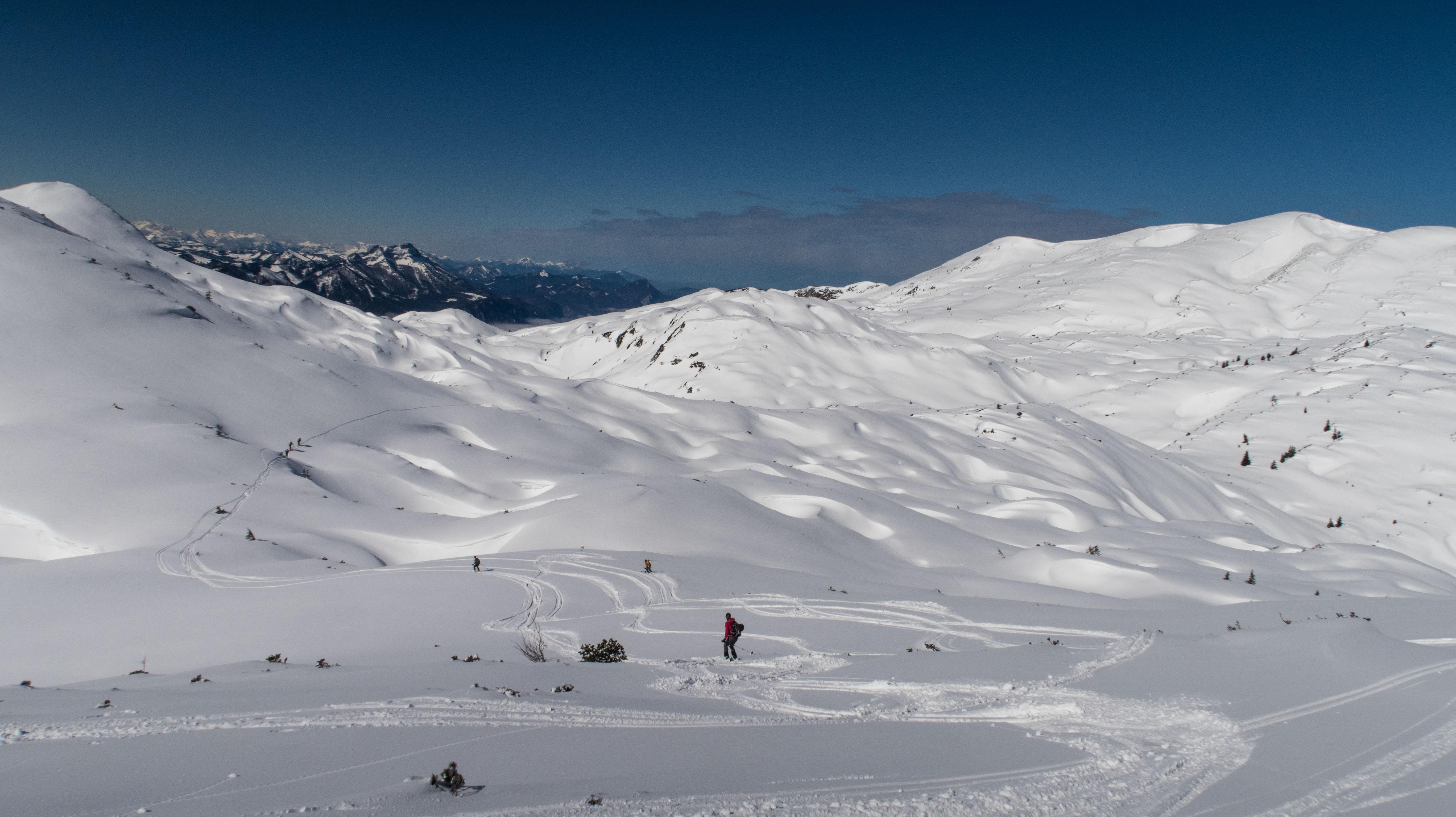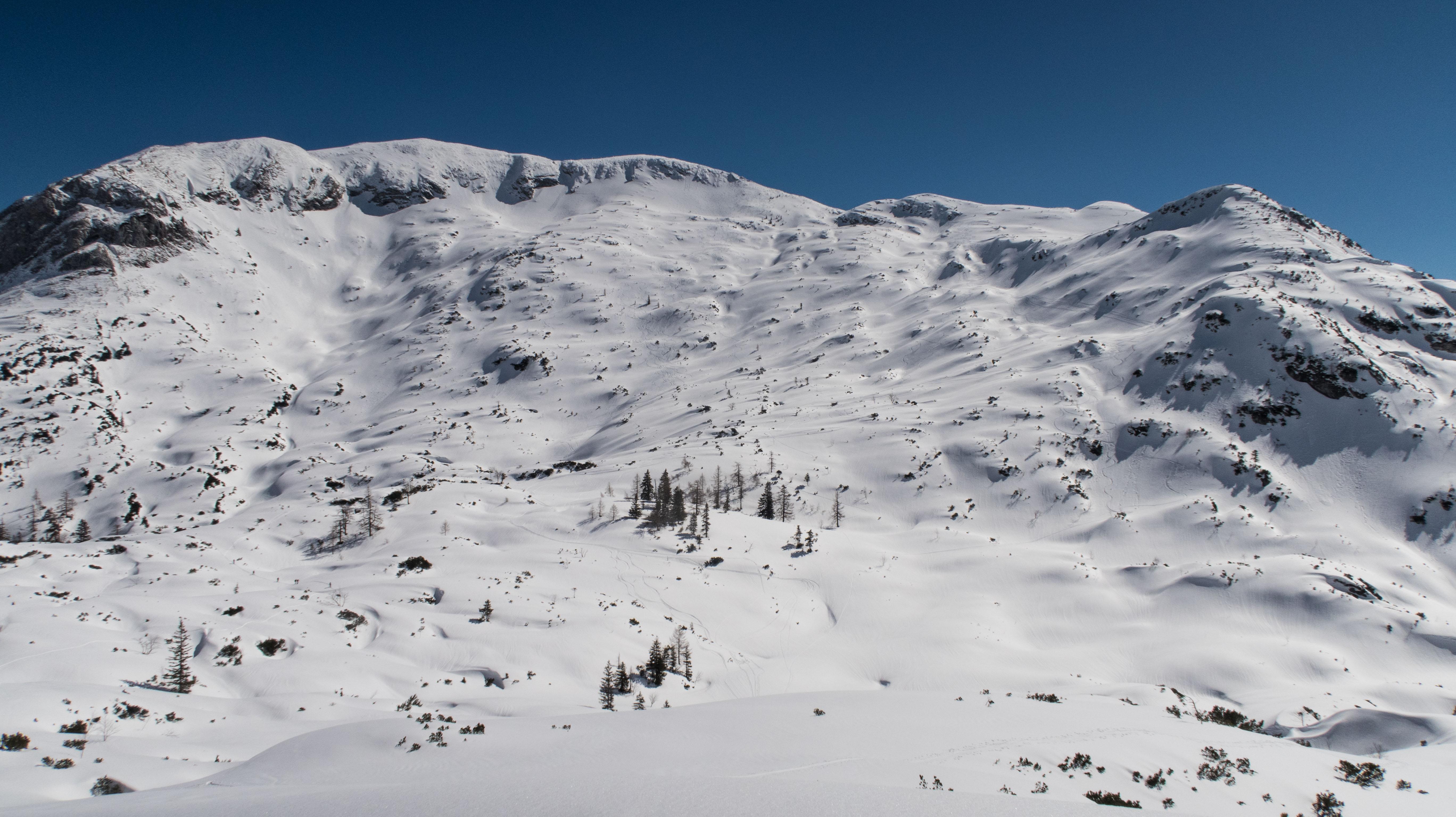 Bedingungen: Derzeit ideale am Plateau. Durchgängig 10-30cm Neuschnee-Auflage auf solidem Untergrund, Abfahrt vom Höllkogel und Grünalmkogel in den Pfaffengraben deshalb ein Traum.