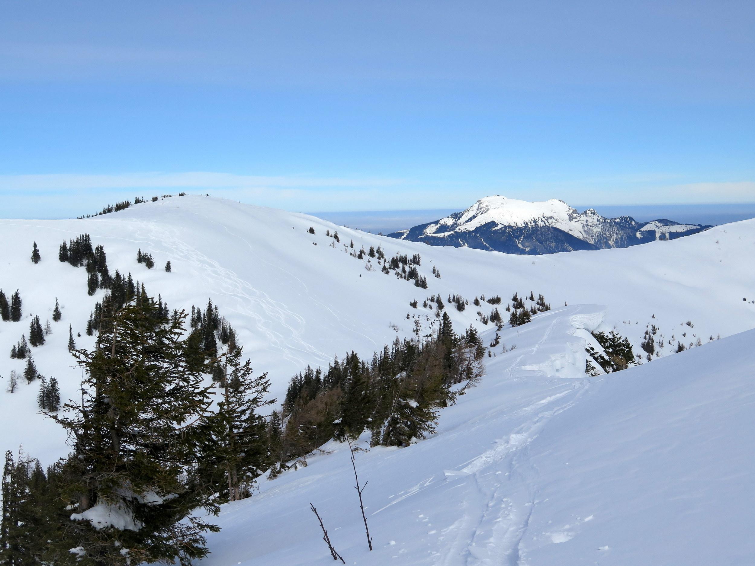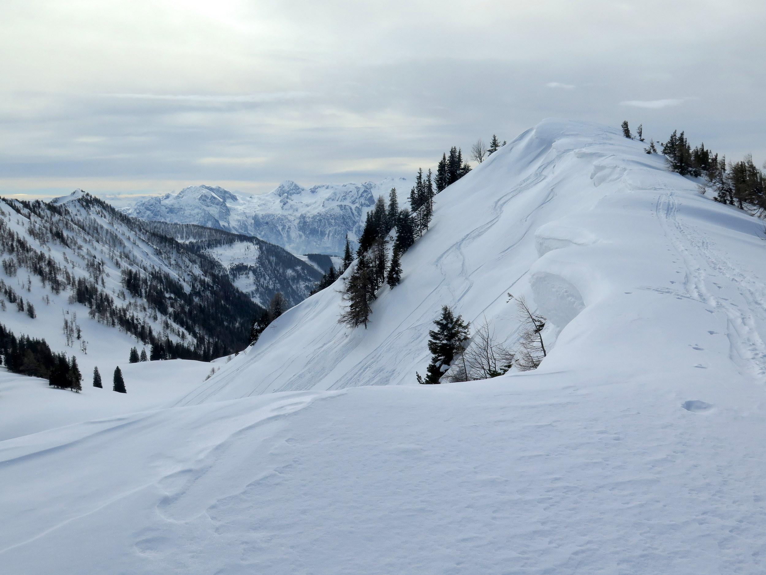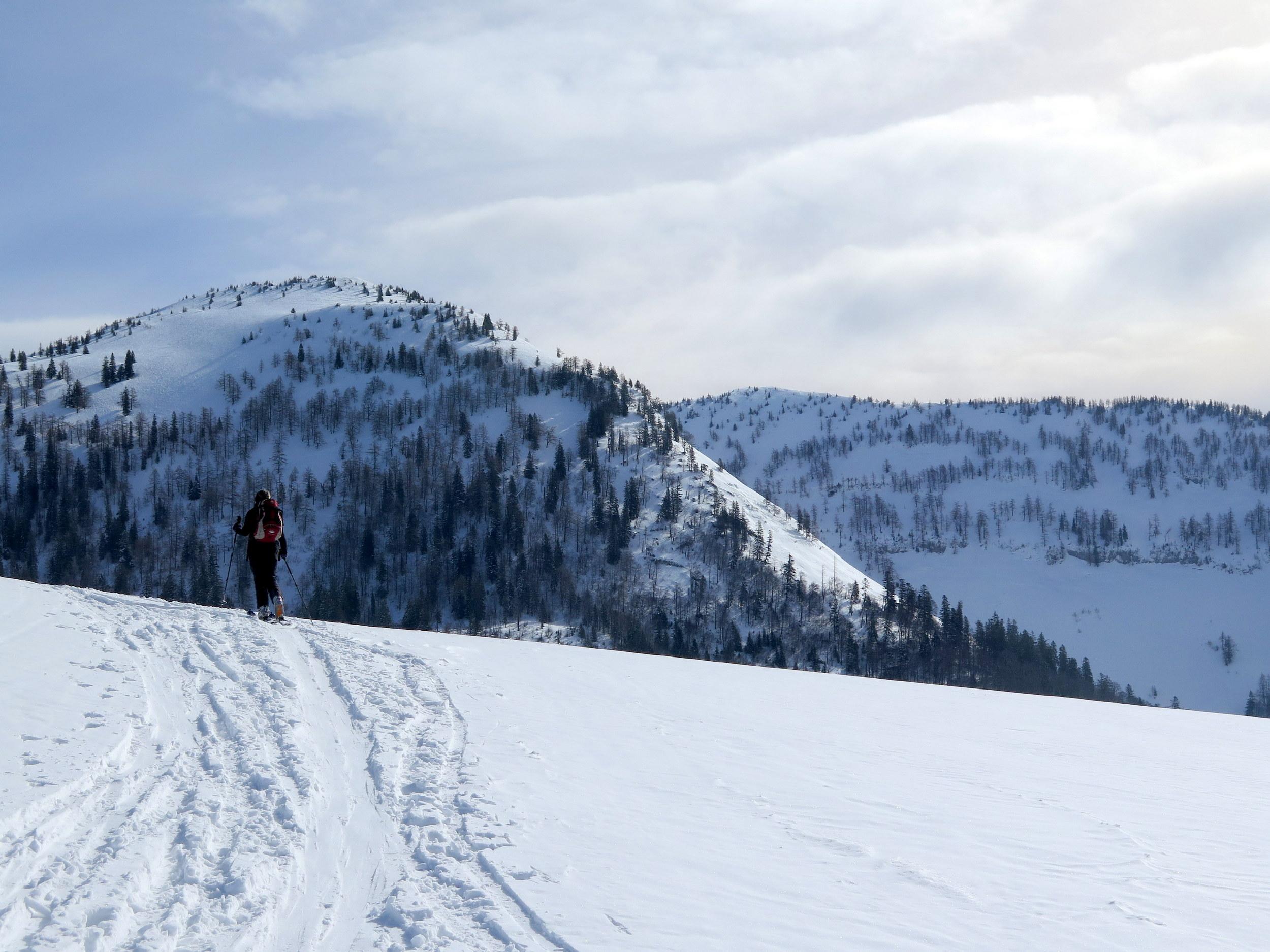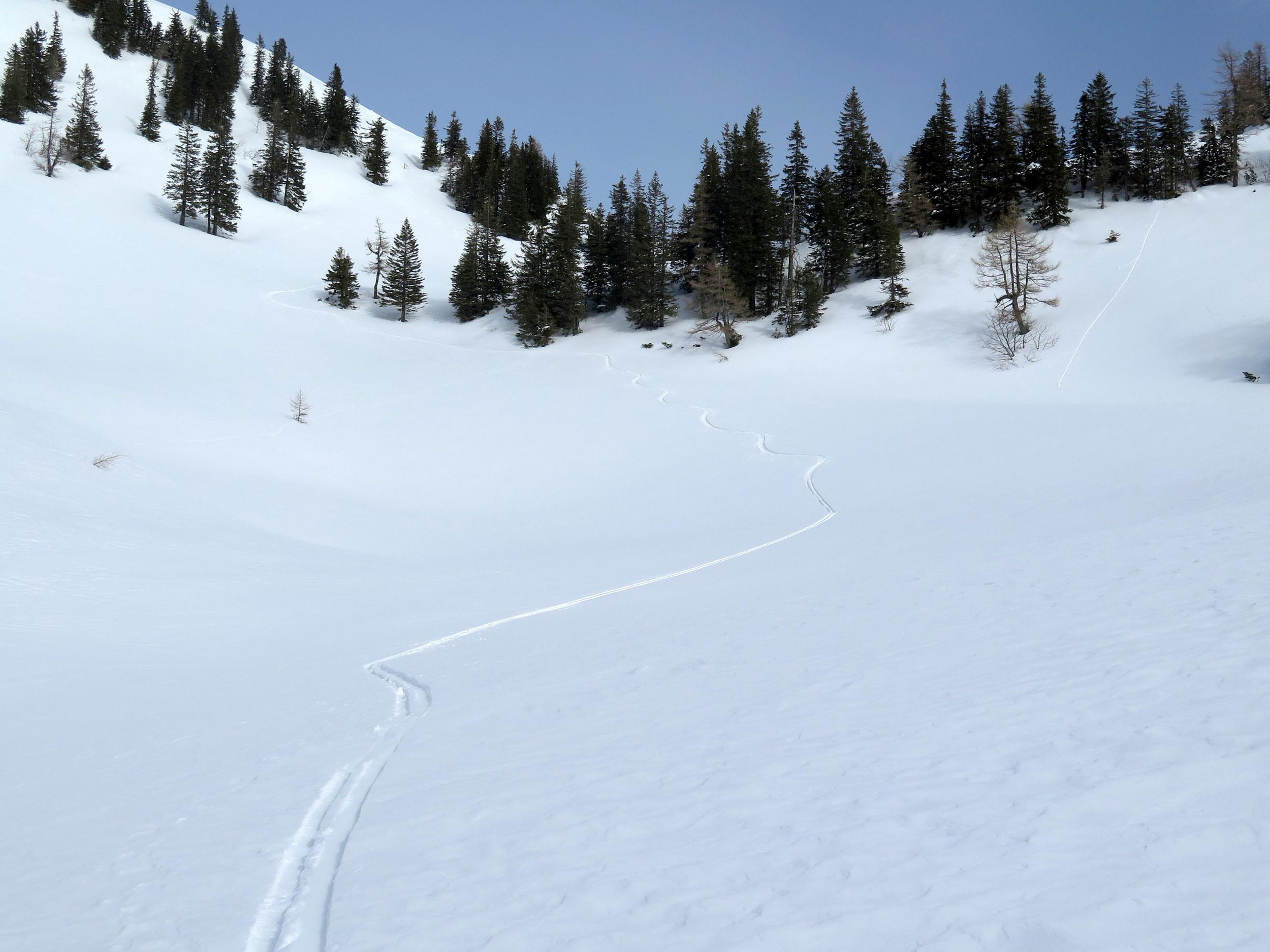 Start bei -10 Grad in Lämmerbach, sonnig noch unterm Gennerhorn, doch dann rascher Aufzug von hohen Schichtwolken von Süden bei gleichzeitigem Temperaturanstieg. Da die Nordhänge des Hohen Zinken bereits stark verspurt sind, interessiert mich heute die Abfahrt vom Gr. Radl über den Schneegraben. Die Schneequalität wäre allerdings ostseitig in Richtung Goldenes Schüsserl deutlich besser gewesen. Sonn- wie auch schattseitig beiderseits des Schneegrabens zahlreiche alte Lawinenabgänge, deren Rutschflächen schattseitig bockhart sind. Der untere Teil des Schneegrabens schaut wenig verheißungsvoll aus, daher ist die Querung zur nach N führenden Forststraße auf ca. 1240 m die ökonomischste Lösung, um zur Zinken-Anstiegsspur in der Senke zwischen Holzeck und dem Zinken-N-Hang zurück zu kommen.