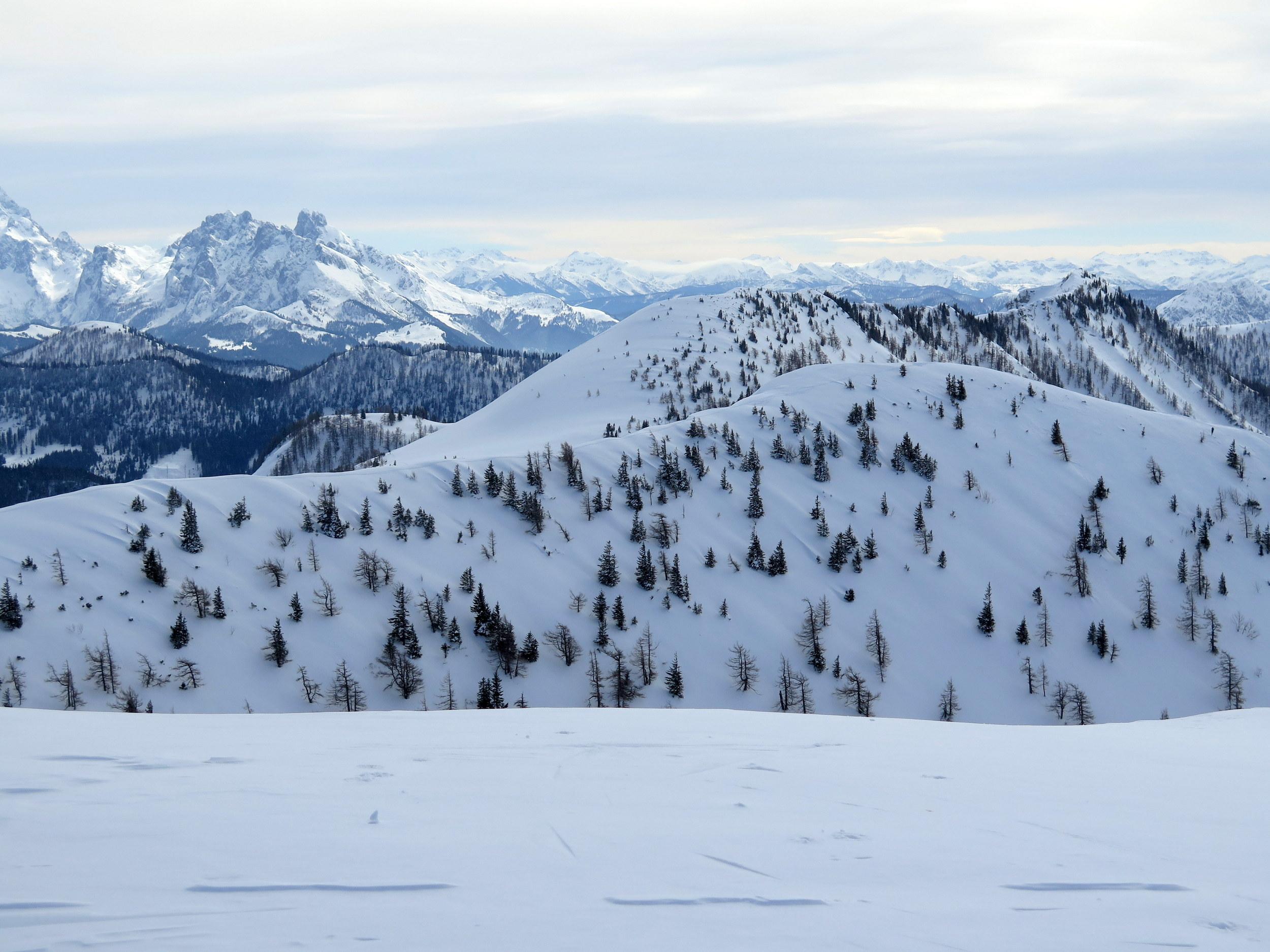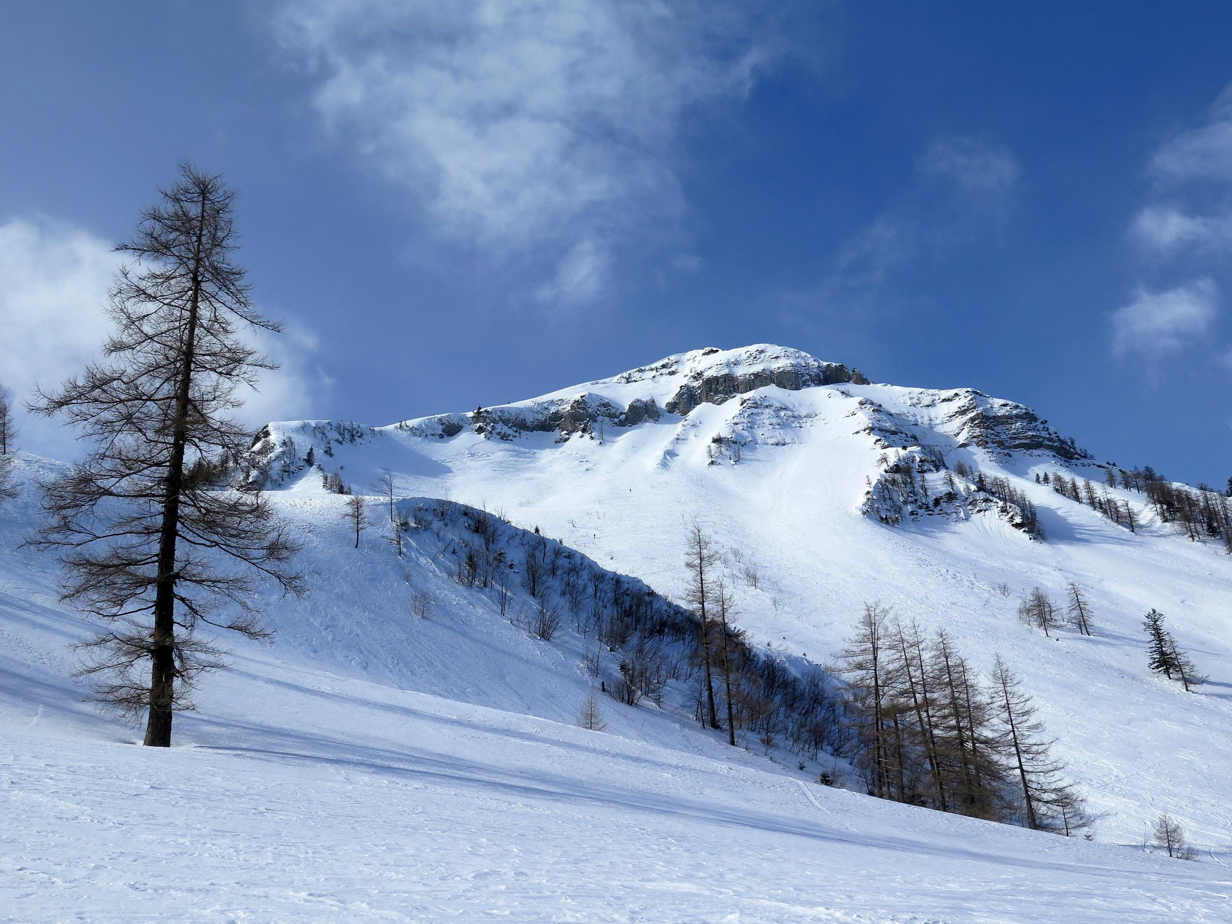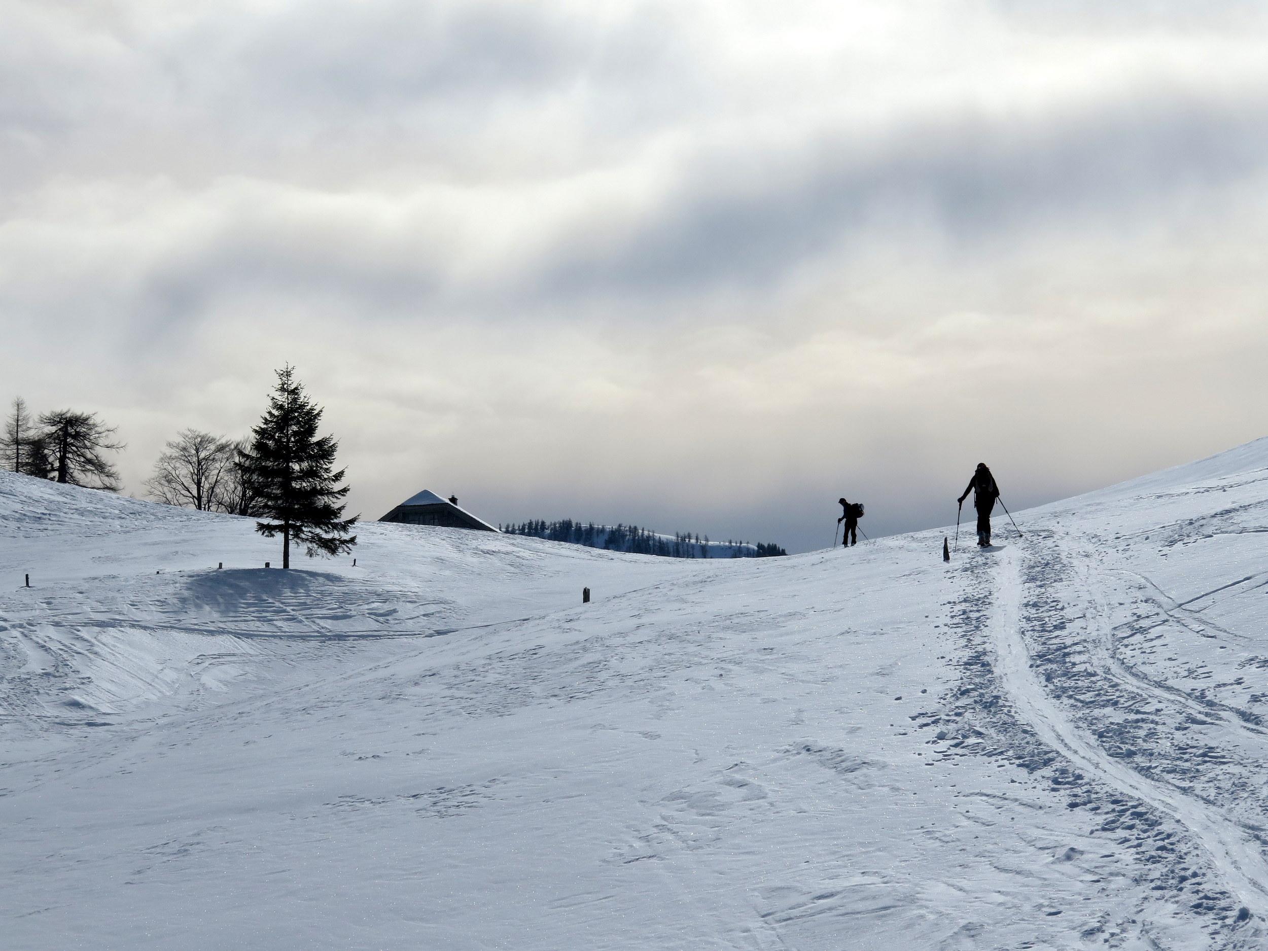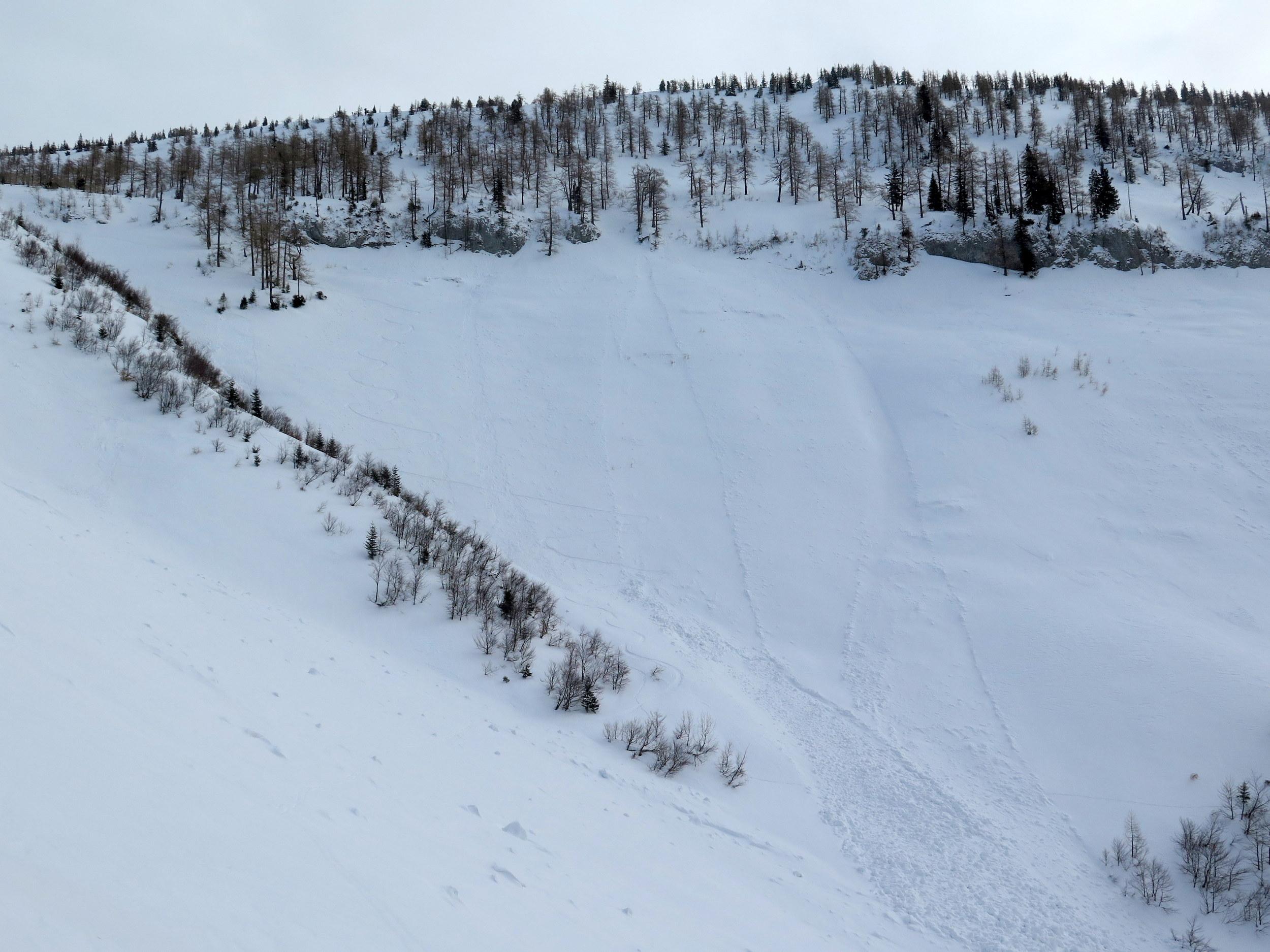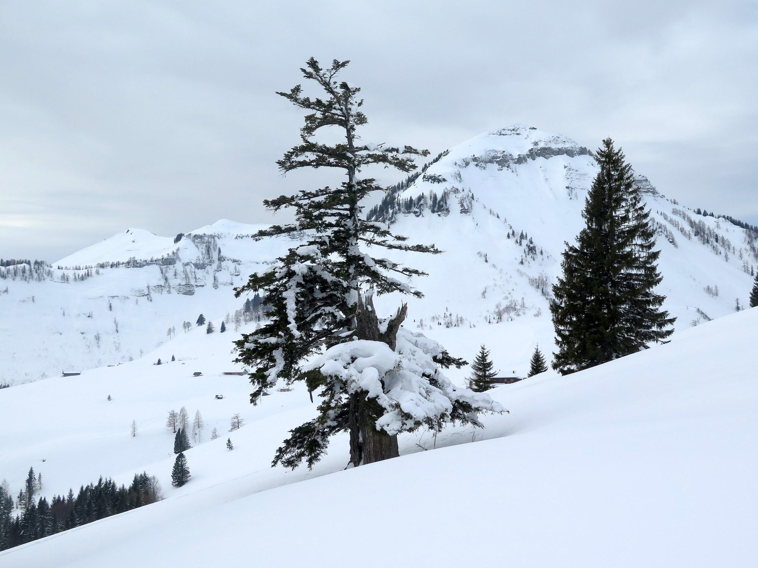 Start bei -10 Grad in Lämmerbach, sonnig noch unterm Gennerhorn, doch dann rascher Aufzug von hohen Schichtwolken von Süden bei gleichzeitigem Temperaturanstieg. Da die Nordhänge des Hohen Zinken bereits stark verspurt sind, interessiert mich heute die Abfahrt vom Gr. Radl über den Schneegraben. Die Schneequalität wäre allerdings ostseitig in Richtung Goldenes Schüsserl deutlich besser gewesen. Sonn- wie auch schattseitig beiderseits des Schneegrabens zahlreiche alte Lawinenabgänge, deren Rutschflächen schattseitig bockhart sind. Der untere Teil des Schneegrabens schaut wenig verheißungsvoll aus, daher ist die Querung zur nach N führenden Forststraße auf ca. 1240 m die ökonomischste Lösung, um zur Zinken-Anstiegsspur in der Senke zwischen Holzeck und dem Zinken-N-Hang zurück zu kommen.