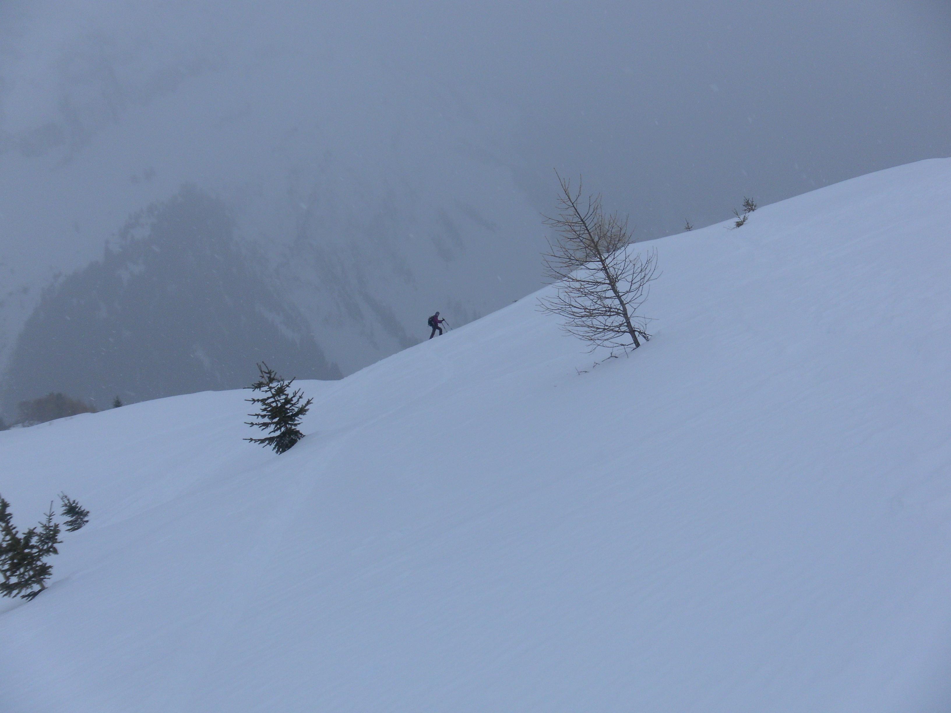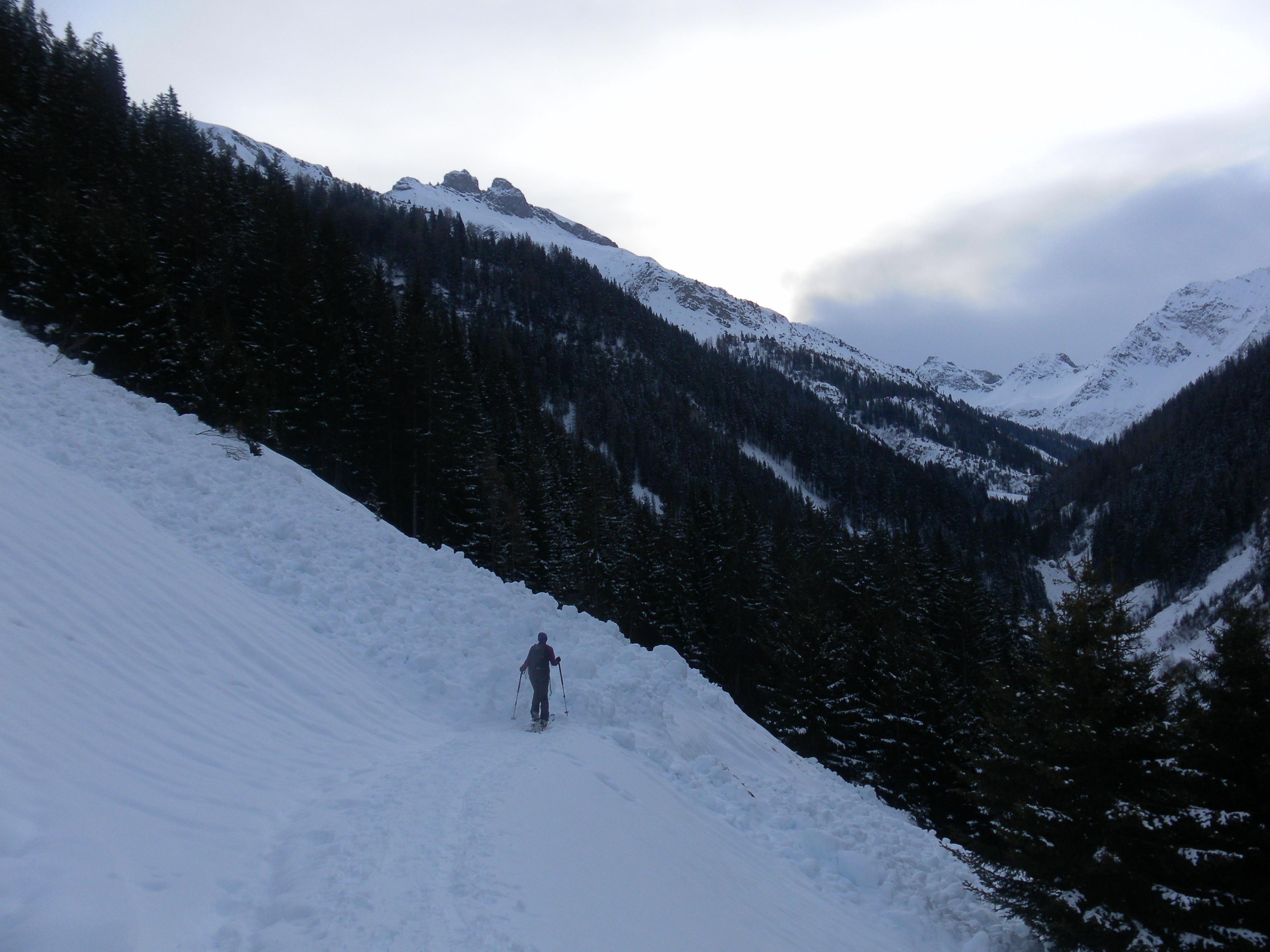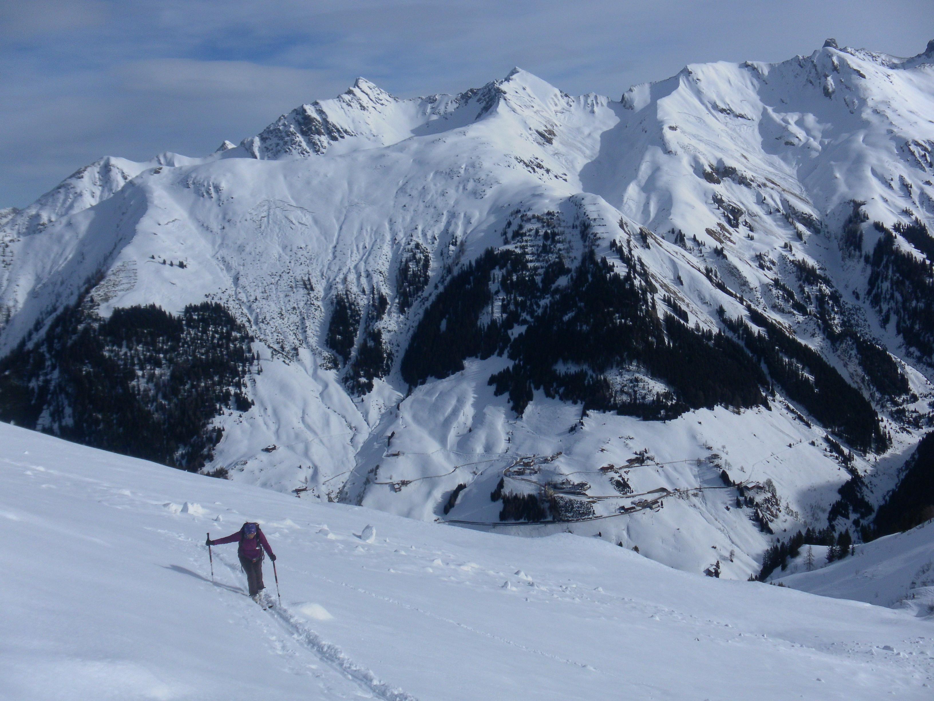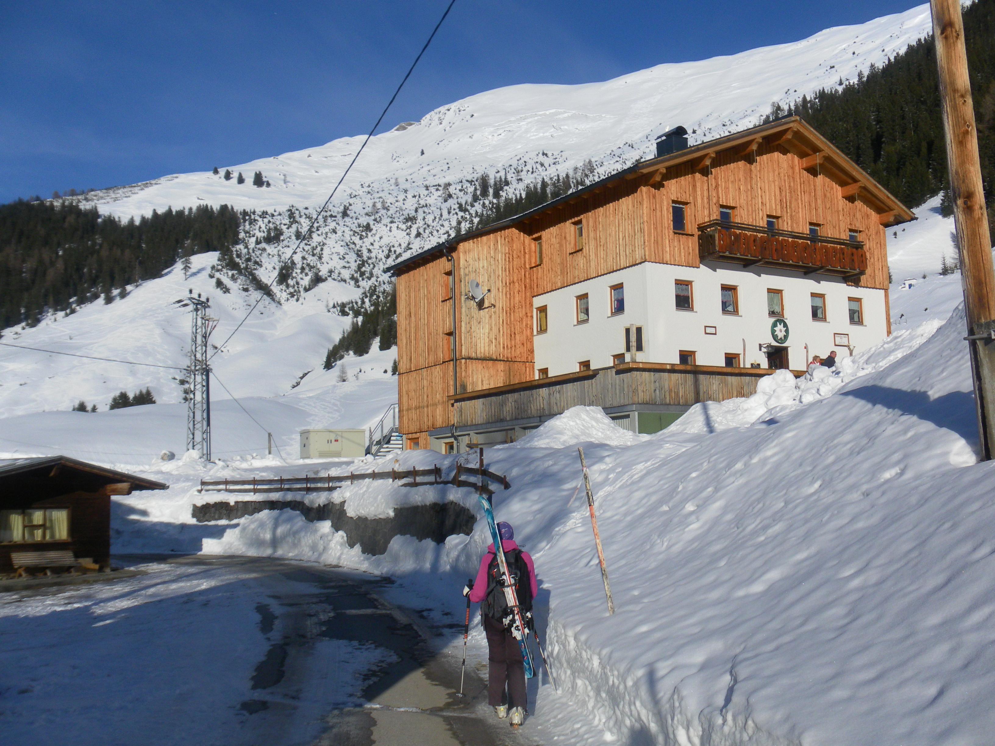 Das Edelweißhaus in Kaisers bei Steeg im Lechtal ist ein hervorragender Stützpunkt für eine Menge schöner bis anspruchsvoller Skitouren (Hahnleskopf, Griestalerspitze, Guflesspitze, Alplespleisspitze, Grießkopf, Vorderseespitze, Feuerspitze, Wetterspitze, Stanskogel, Schwarzer Kranz). Nach den massiven Schneefällen der jüngeren Vergangenheit (LWS 4-5, der Zugang einige Tage gesperret) hat es die letzten Tage deutlich weniger Neuschnee als bei uns gegeben. 10-20cm gesamt wurden es auch, der harschige Untergrund war aber dennoch spürbar. Durchwachsenes Wetter.