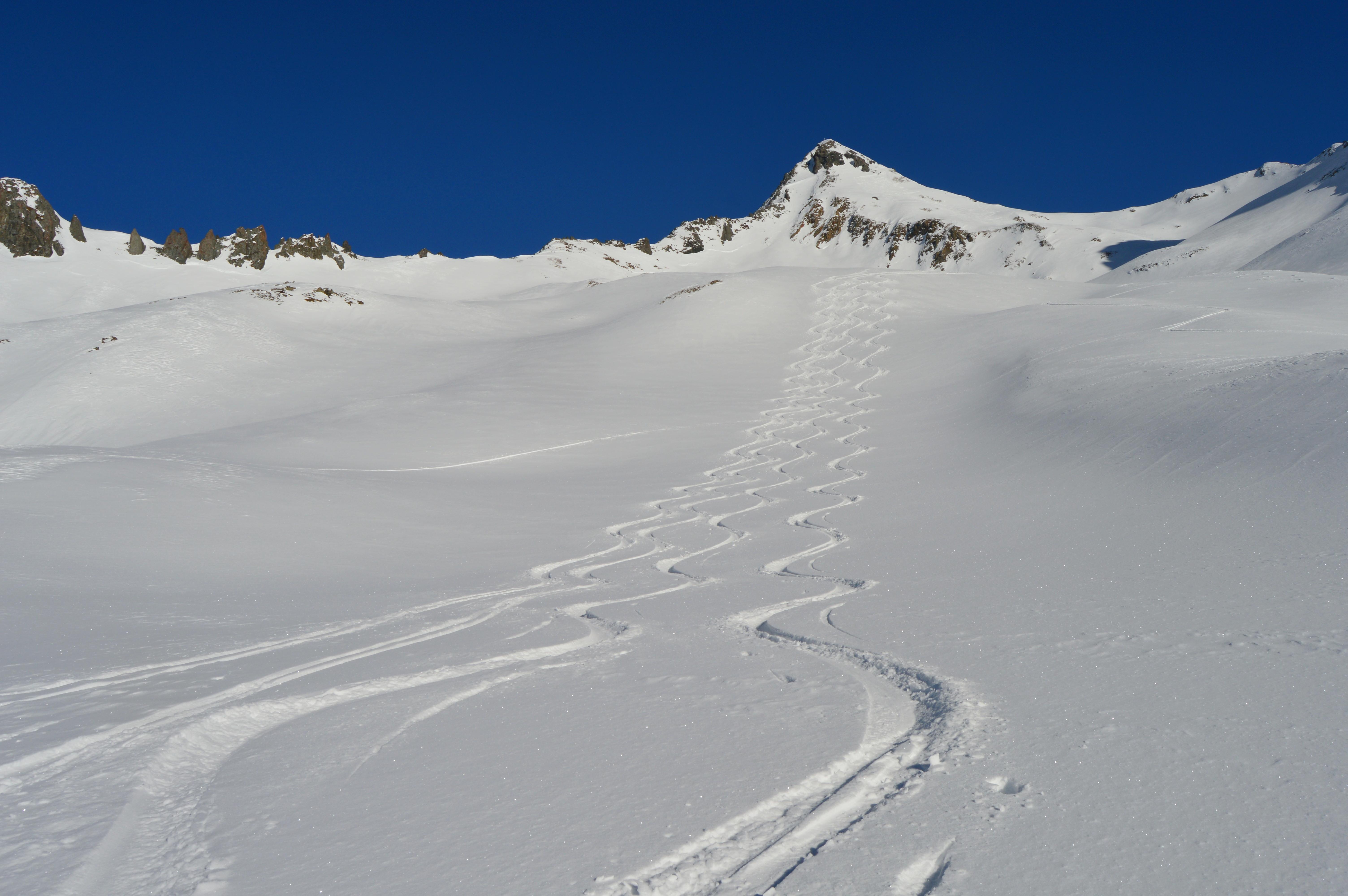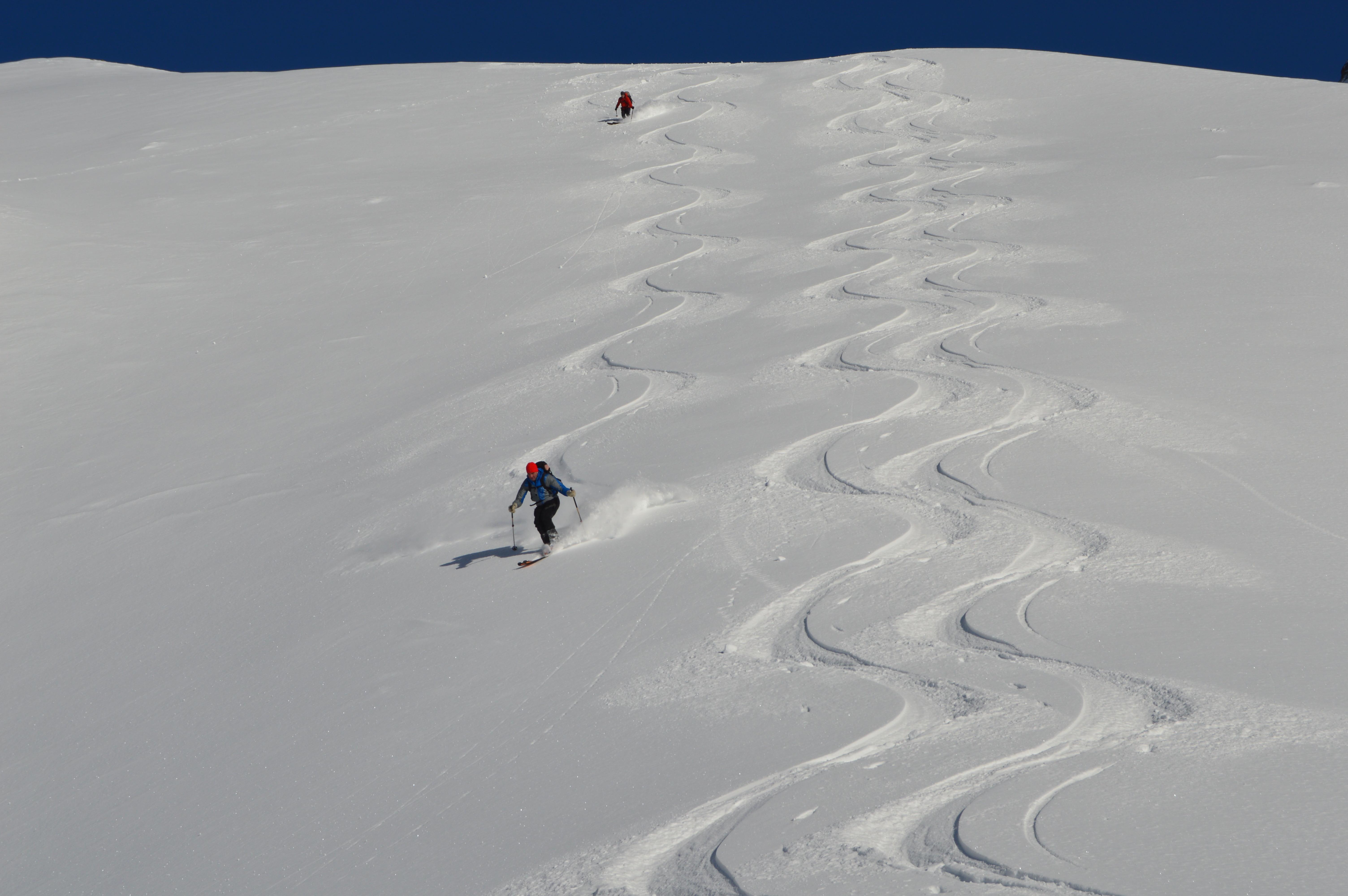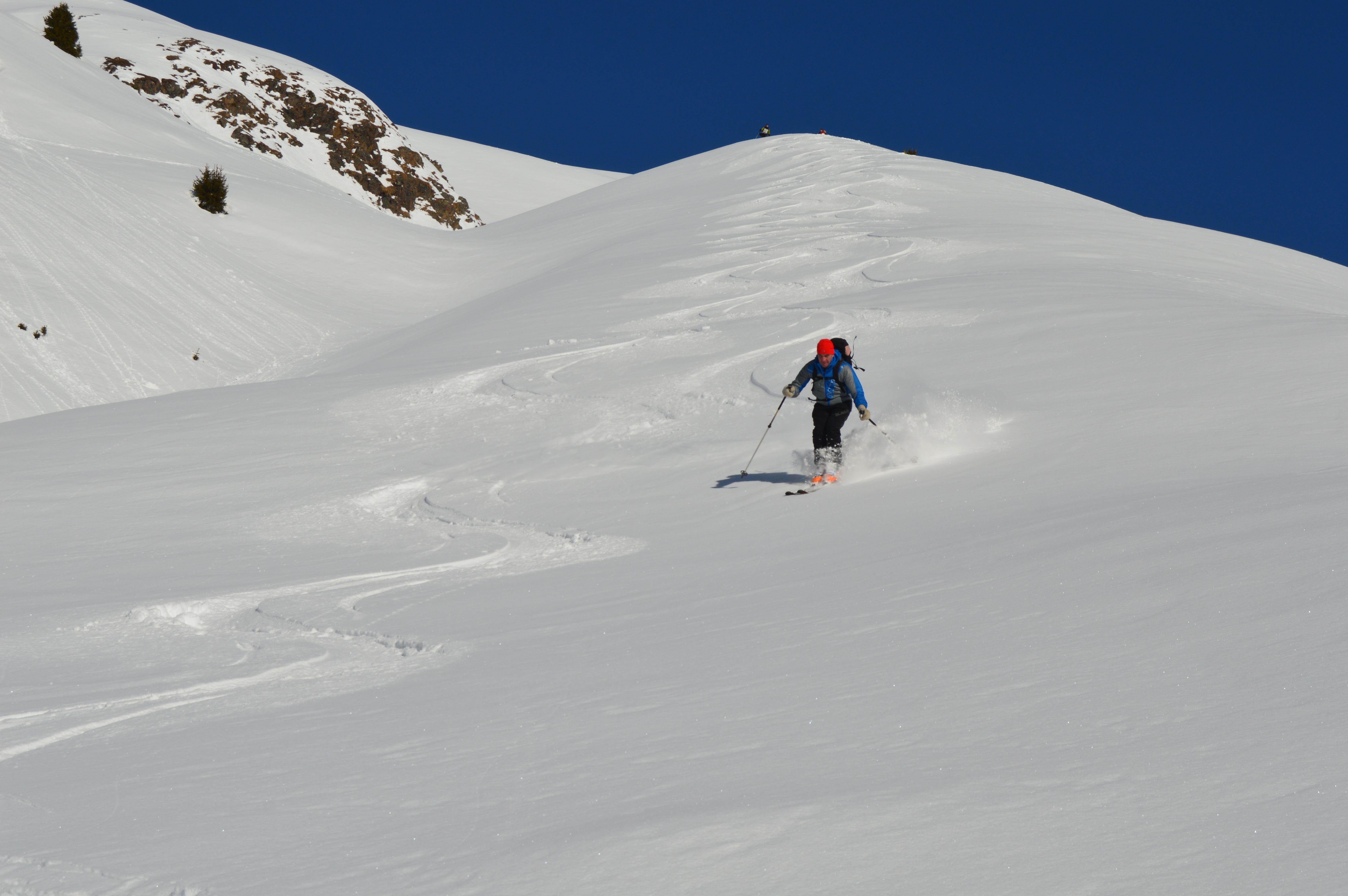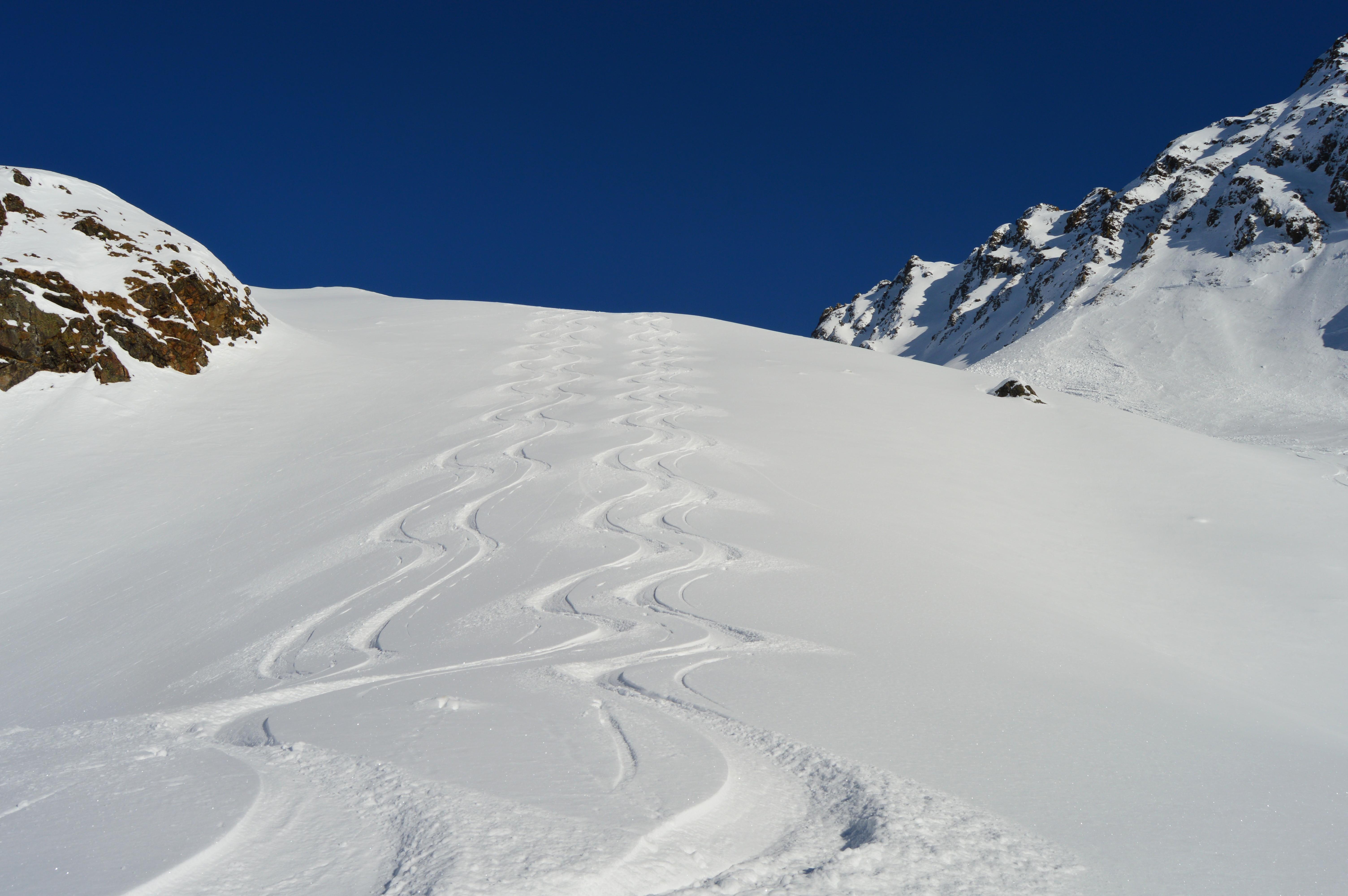 Unsere Tour wies absolut perfekte und sichere Schneeverhältnisse auf. Seltsamerweise hatten die ostseitigen Hänge im Kar einen Deckel und die Süd, bzw. Südwesthänge völlig lockeren und kalten Pulver. (Vielleicht gab es an einem der Vortage Vormittags Sonneneinstrahlung, die sich dann am Nachmittag wieder hinter Wolken versteckte). Die Temperaturen spielten sich alle drei Tage permanent im Minusbereich ab. So sollte eigentlich der Hochwinter aussehen :-).