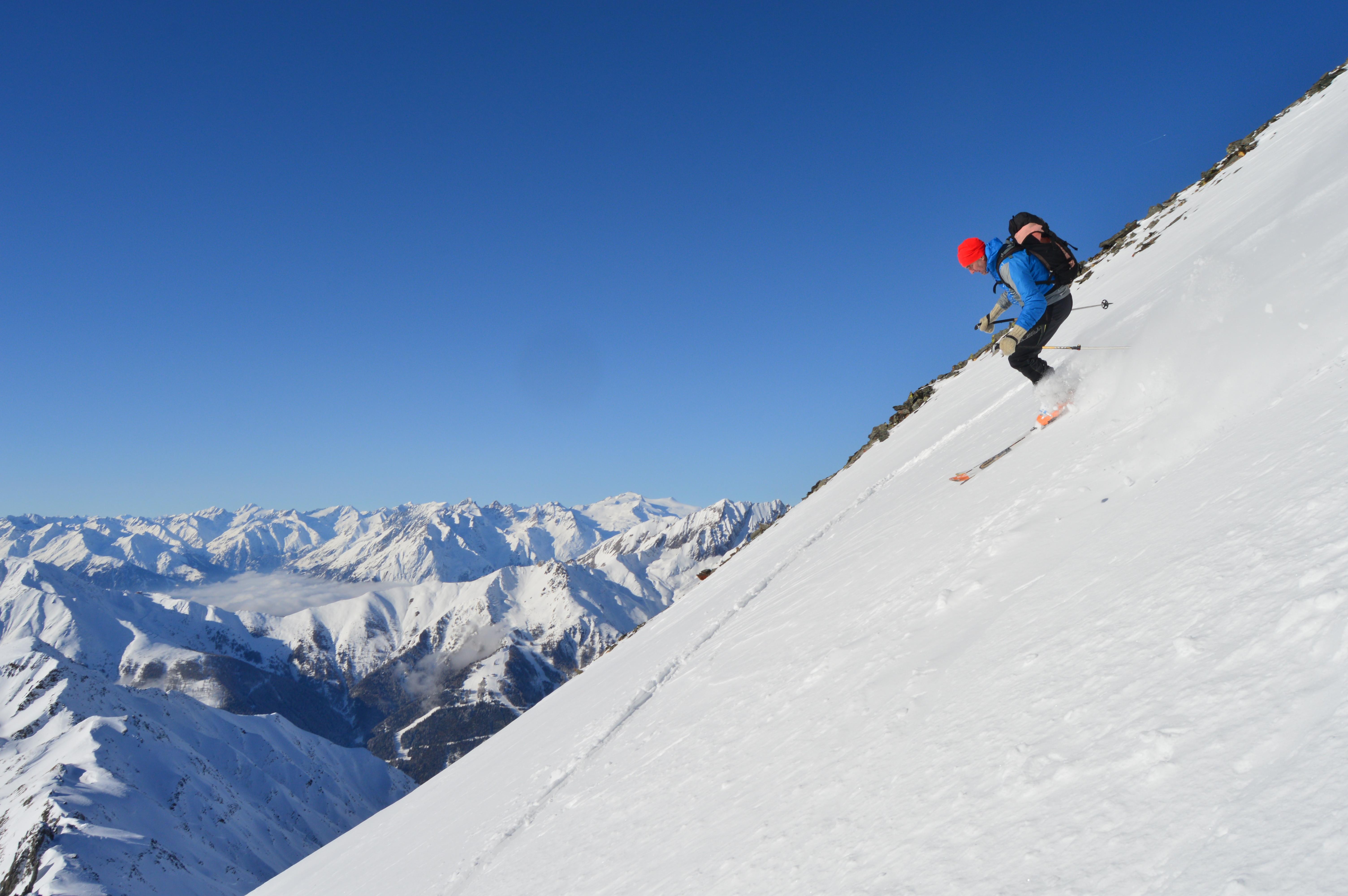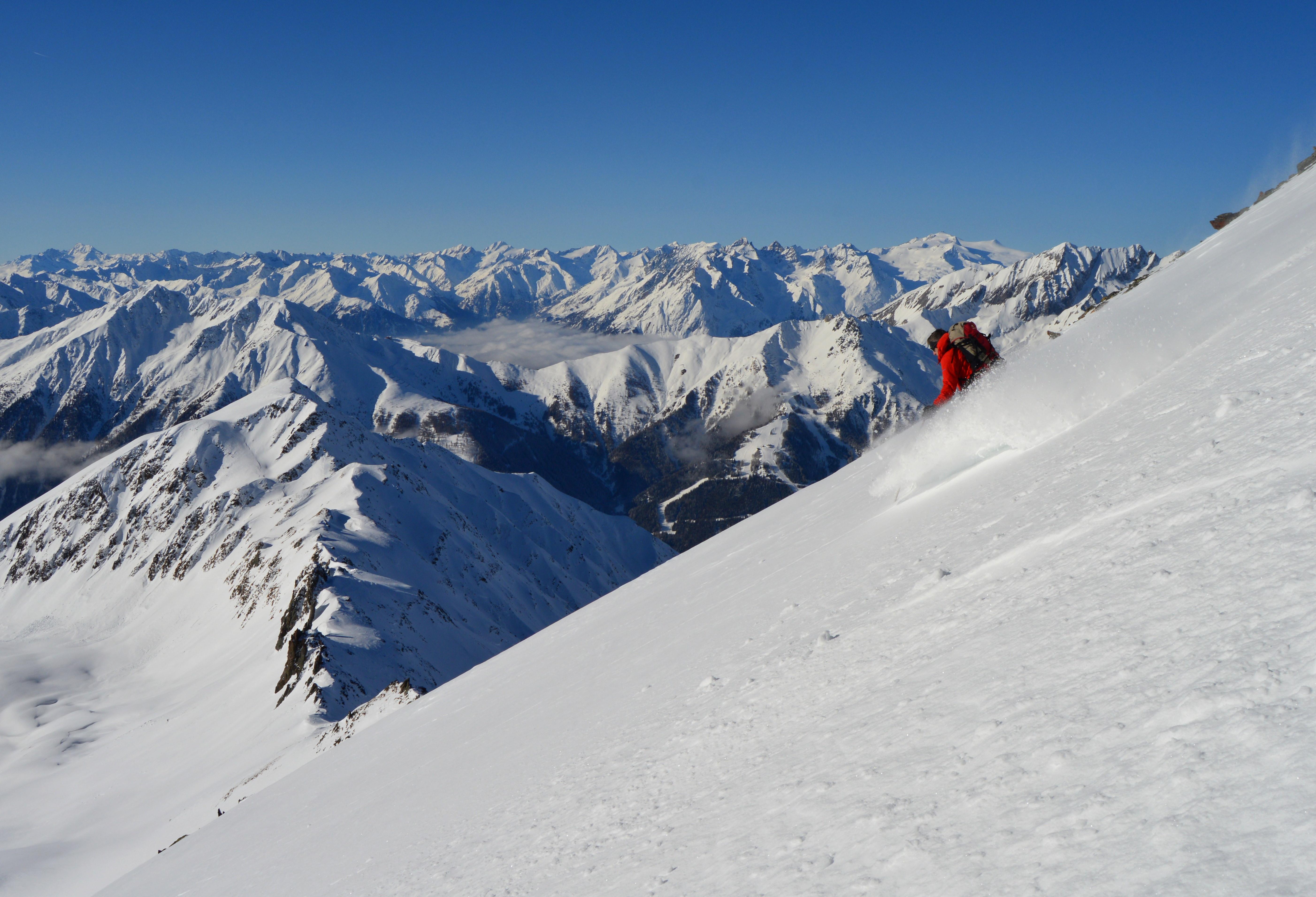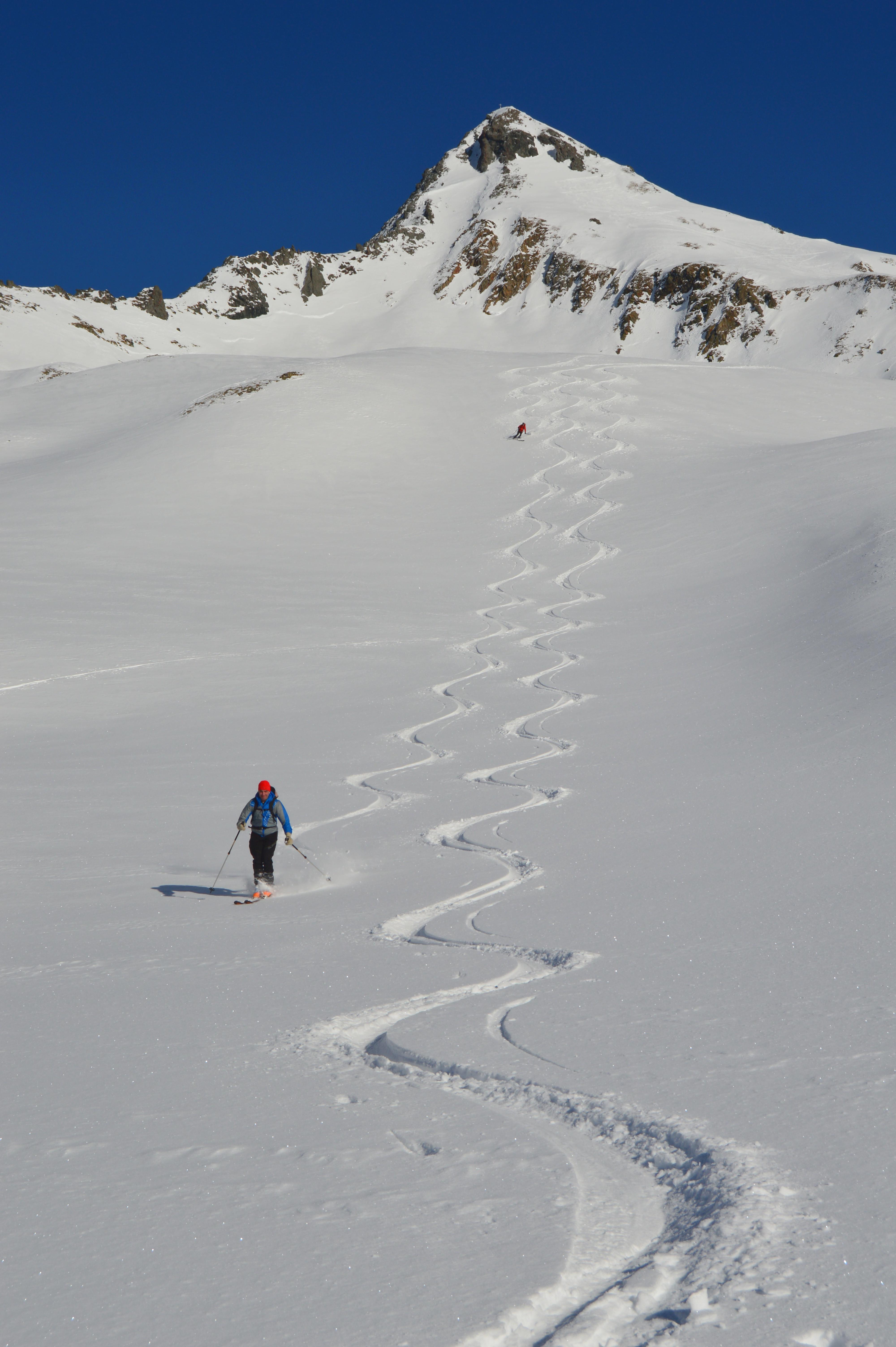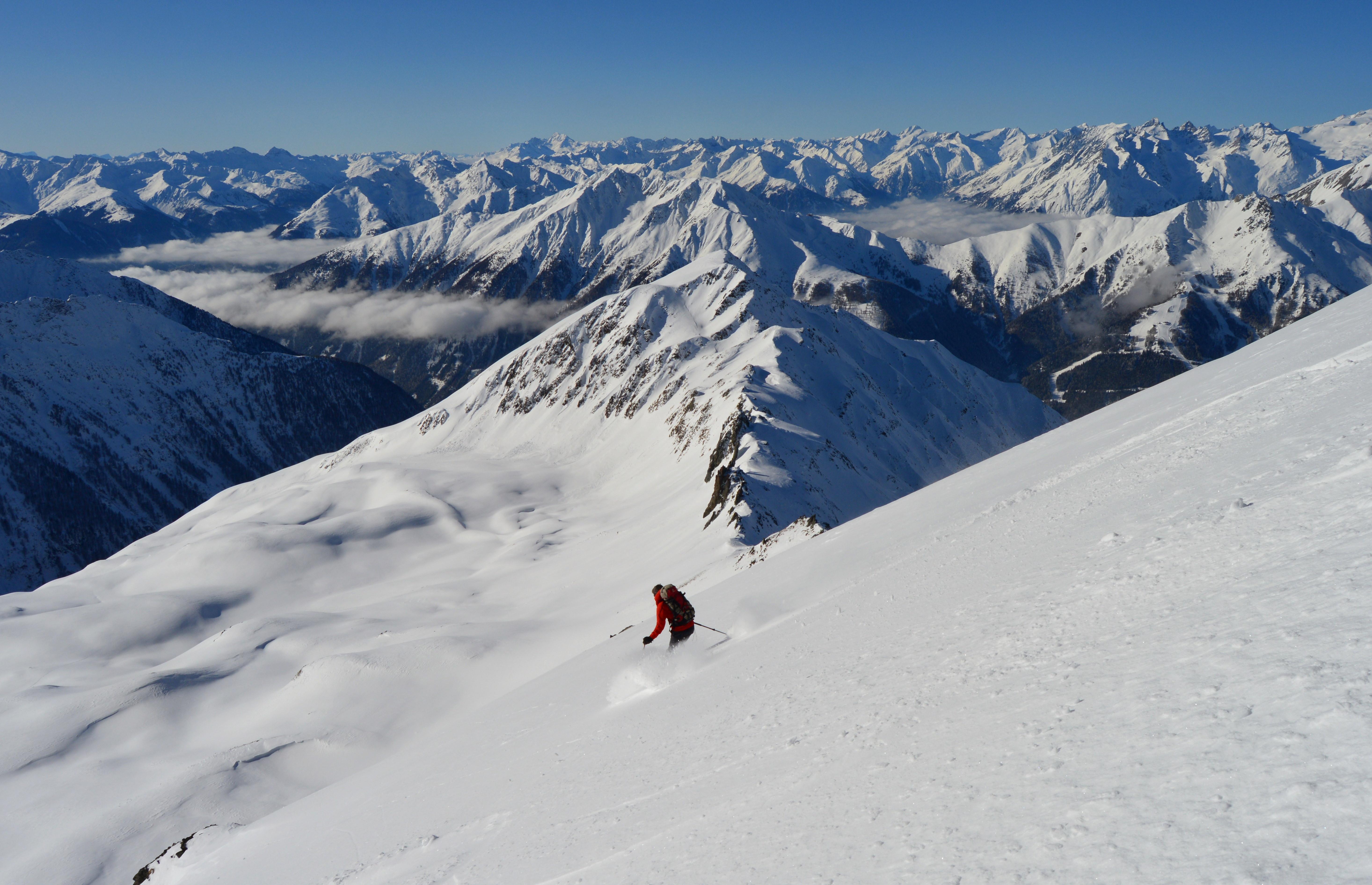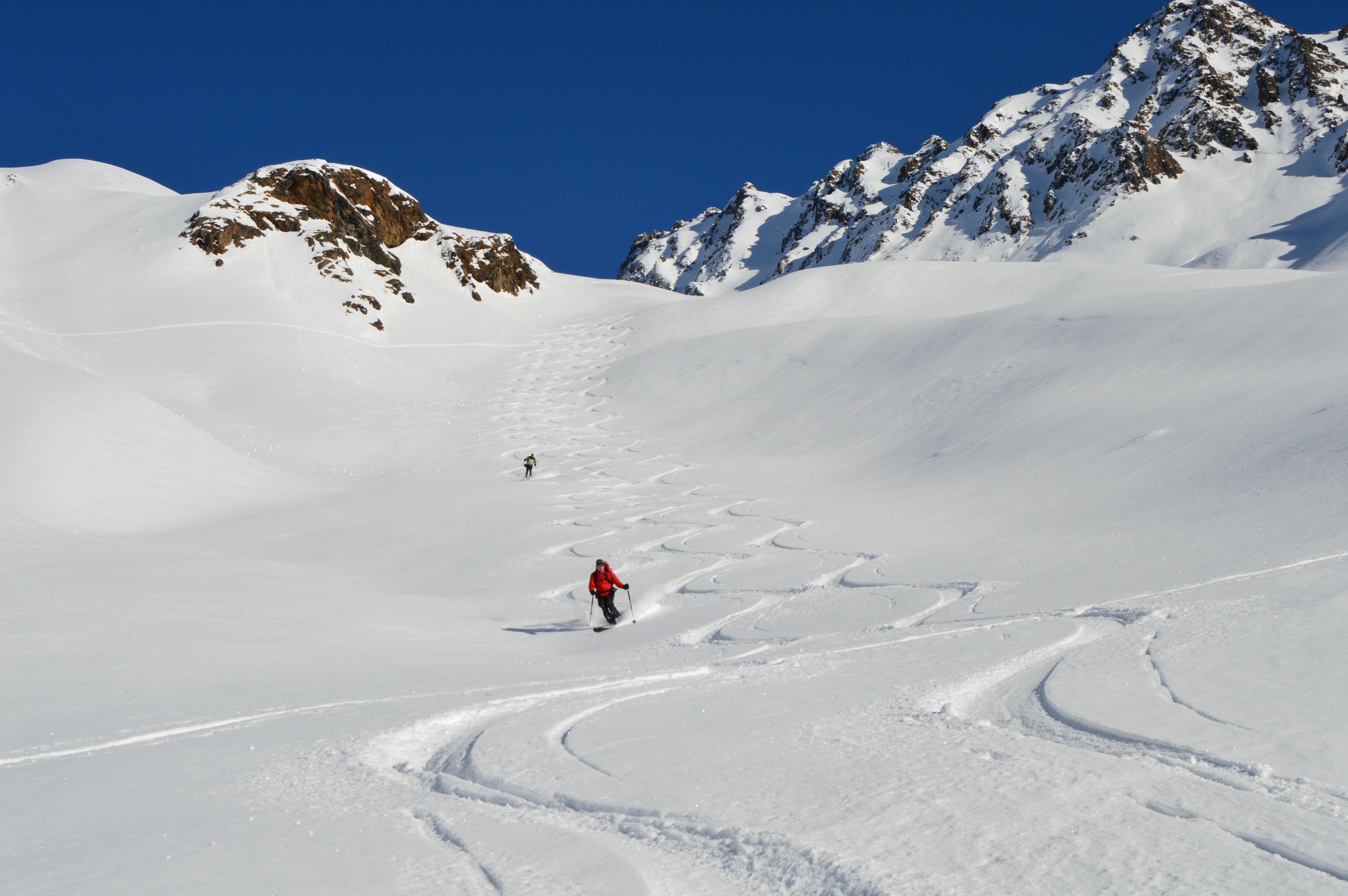 Unsere Tour wies absolut perfekte und sichere Schneeverhältnisse auf. Seltsamerweise hatten die ostseitigen Hänge im Kar einen Deckel und die Süd, bzw. Südwesthänge völlig lockeren und kalten Pulver. (Vielleicht gab es an einem der Vortage Vormittags Sonneneinstrahlung, die sich dann am Nachmittag wieder hinter Wolken versteckte). Die Temperaturen spielten sich alle drei Tage permanent im Minusbereich ab. So sollte eigentlich der Hochwinter aussehen :-).