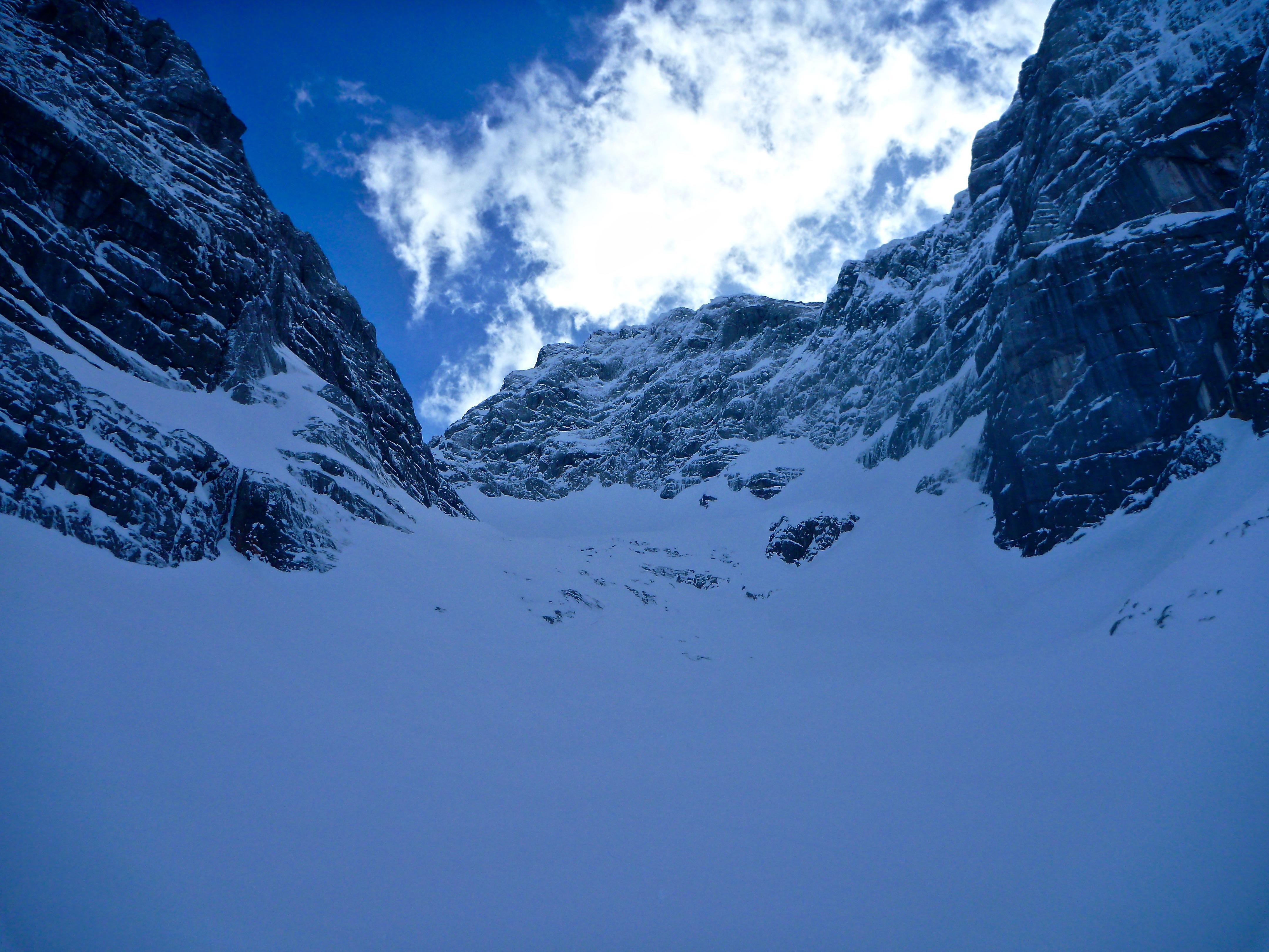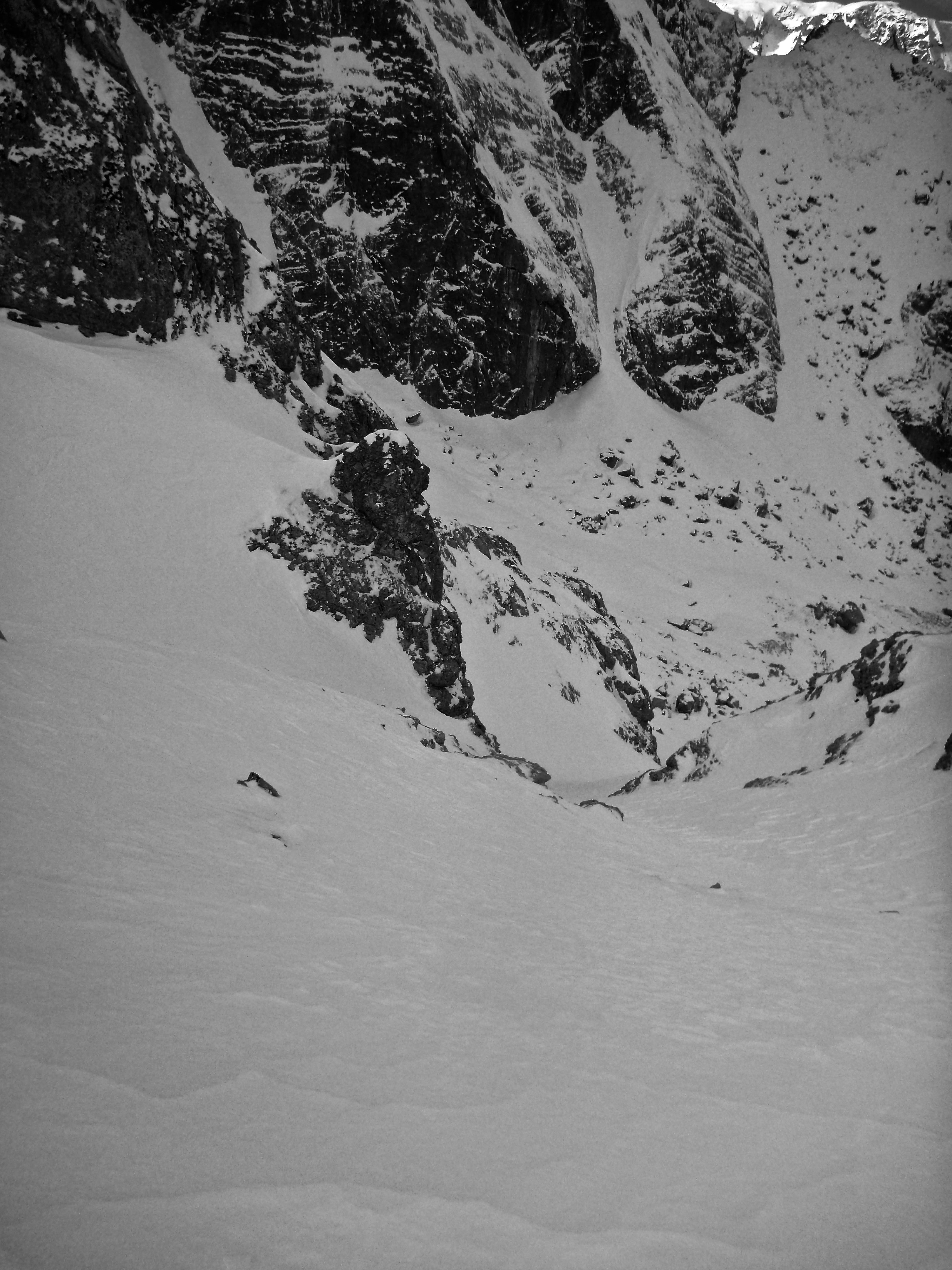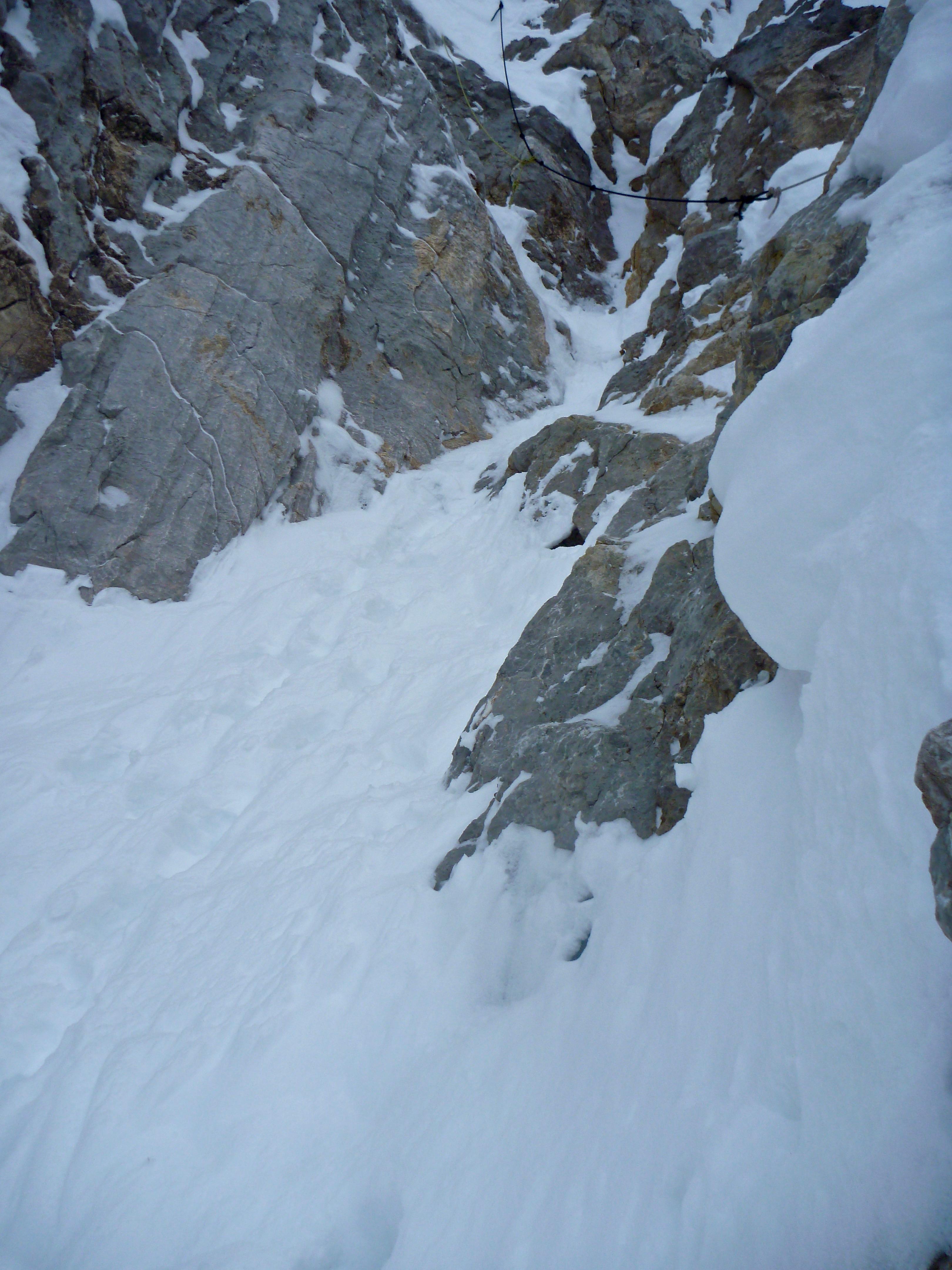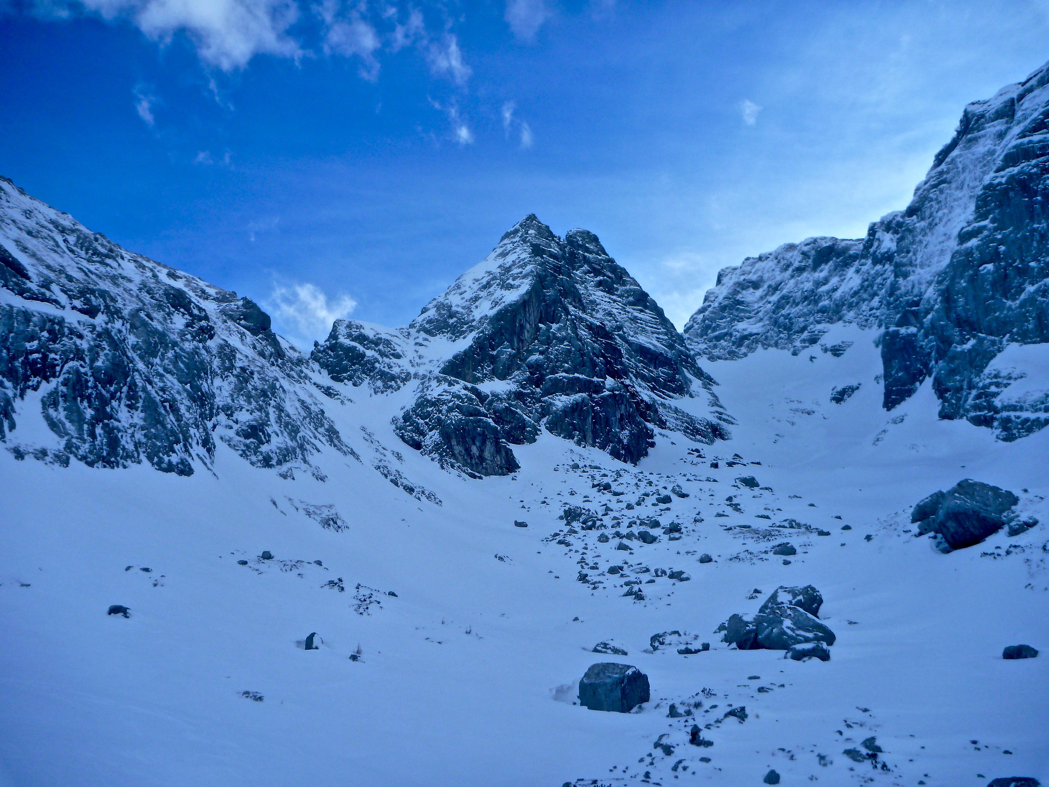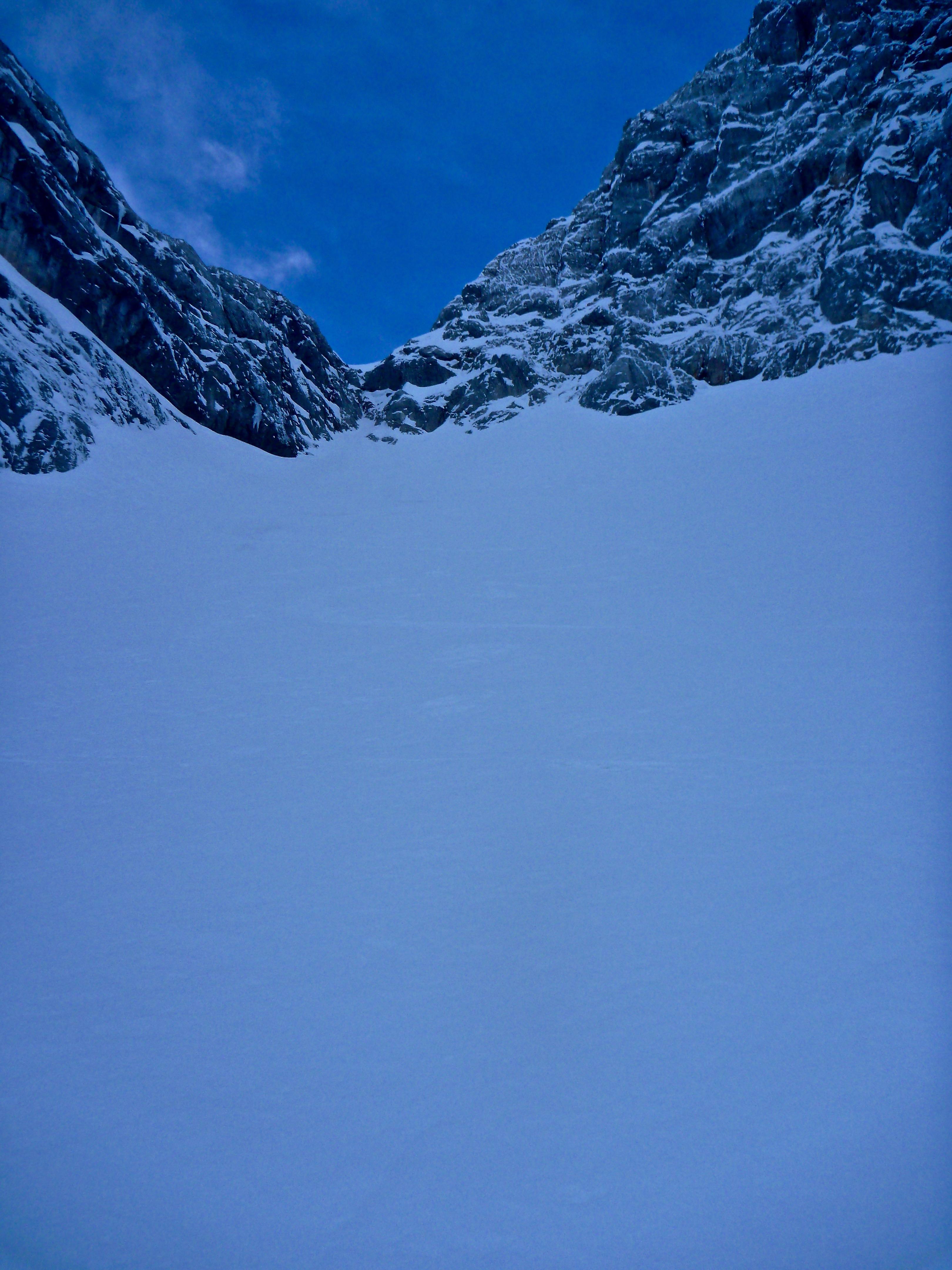 Schnee: vorwiegend fester kompakter Pulver, tw. mit leichtem Deckel, tw. auch lockerer; Harscheisen waren ganz gut, jeweils 100hm in die beiden Scharten war mühsames Stapfen angesagt.