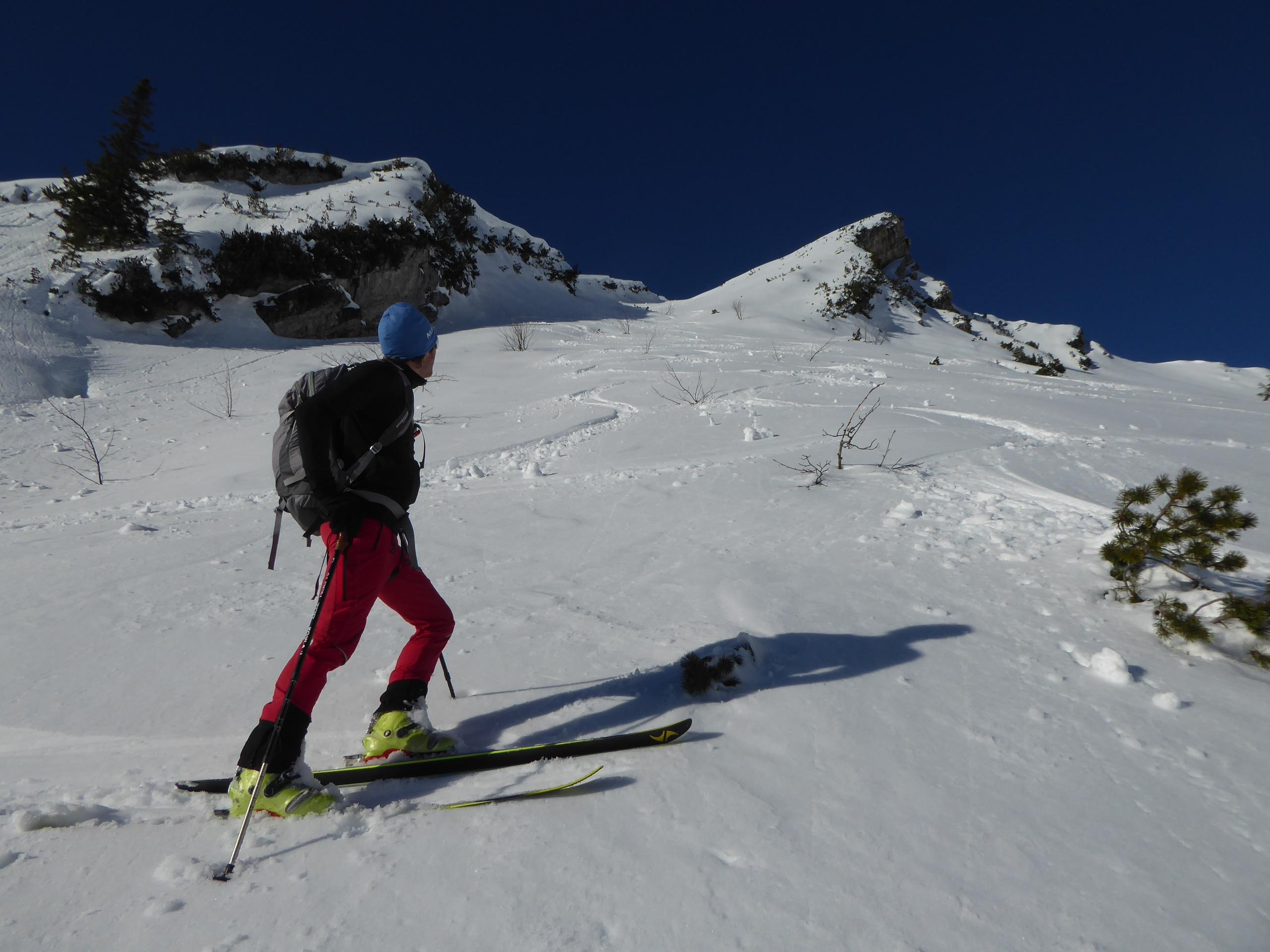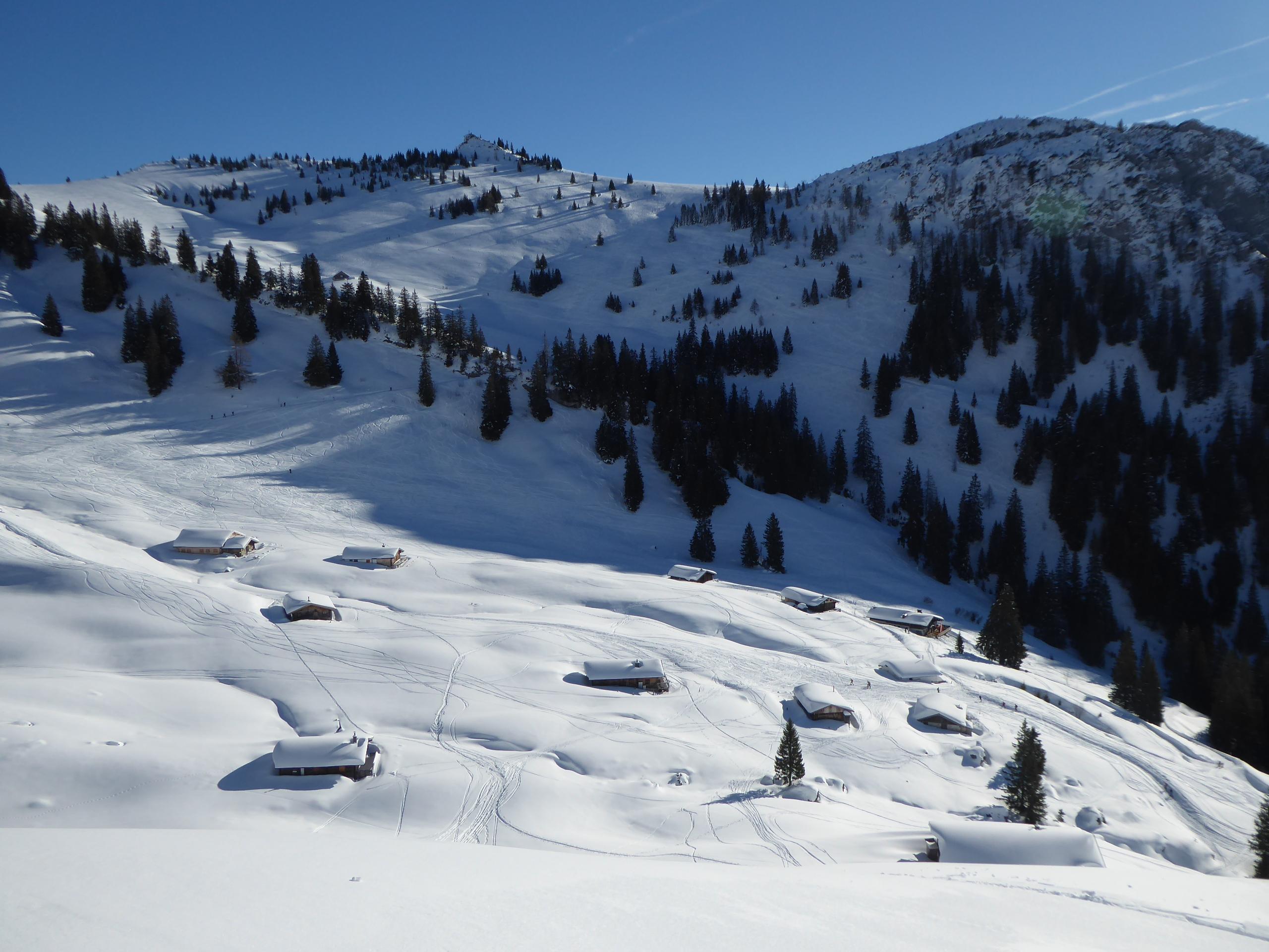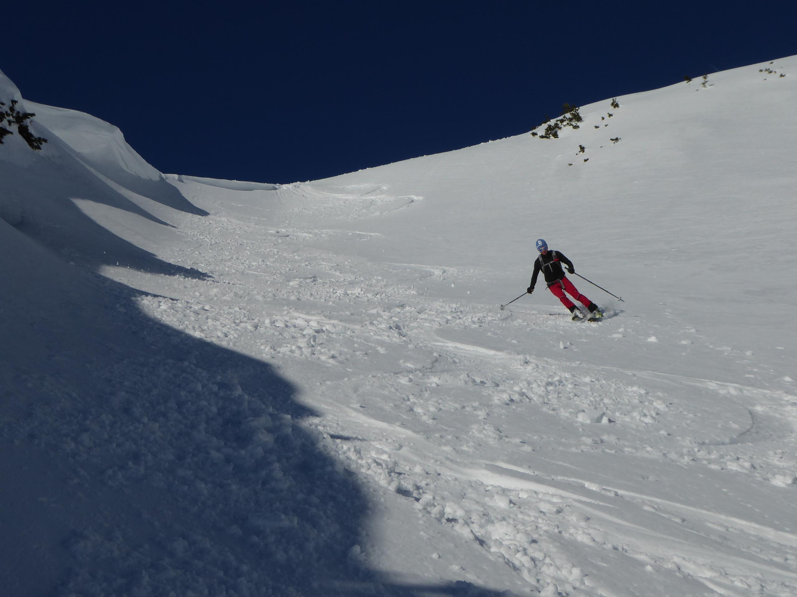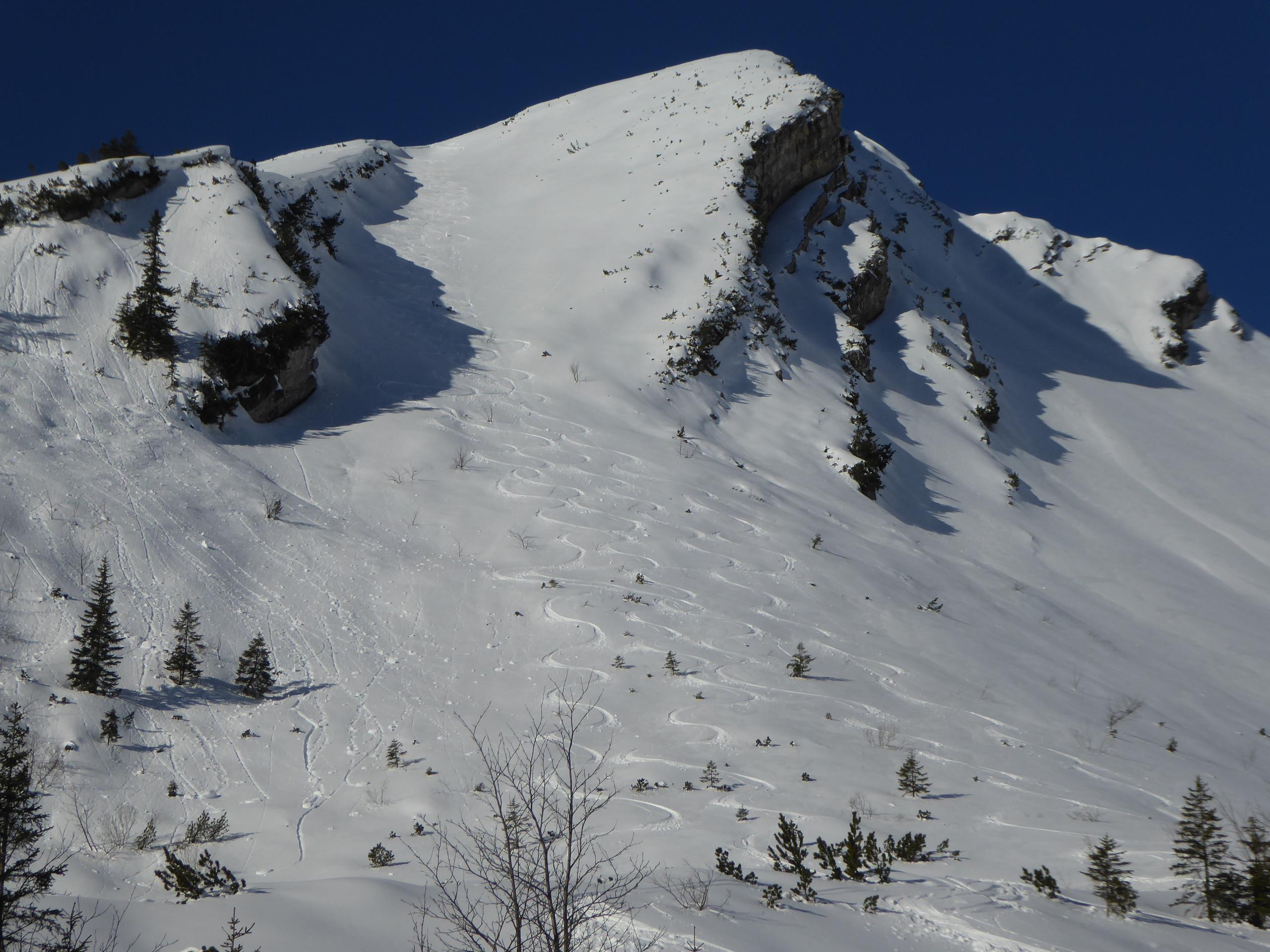 Sehr warm heute, trotz klarer Nacht in der Früh (na gut, sagnma Vormittag) am Parkplatz Heutalbauer schon plus 1°. Andrang: XXL (no na), am Hirscheck selber außer uns 5, während wir oben waren, später sind dann noch einige nachgekommen. Abfahrt Reifelrinne waren wir Nummer 3 und 4.