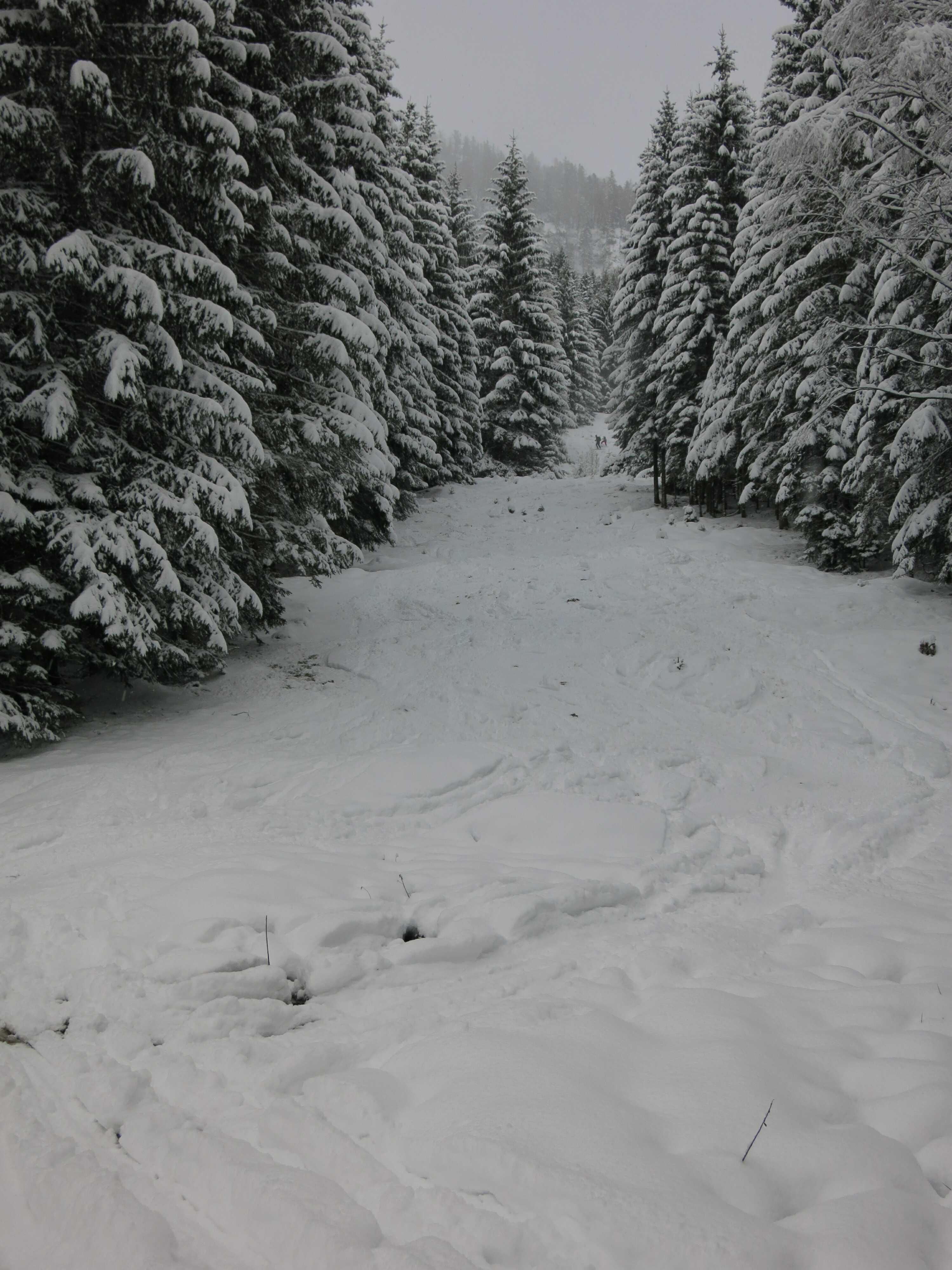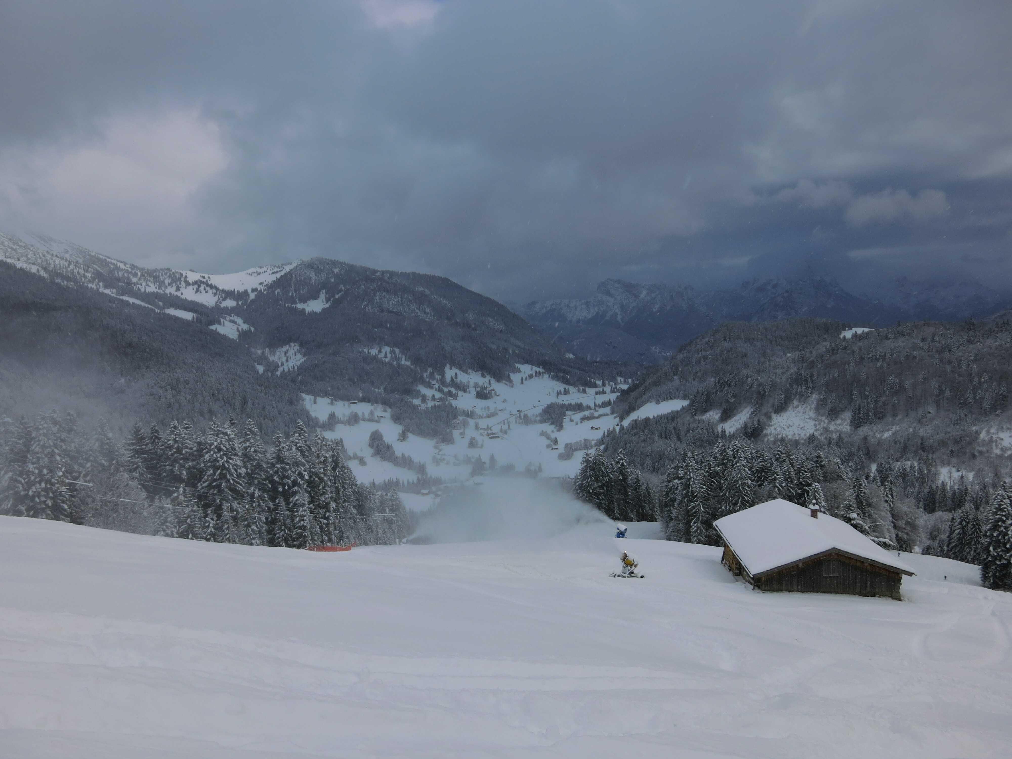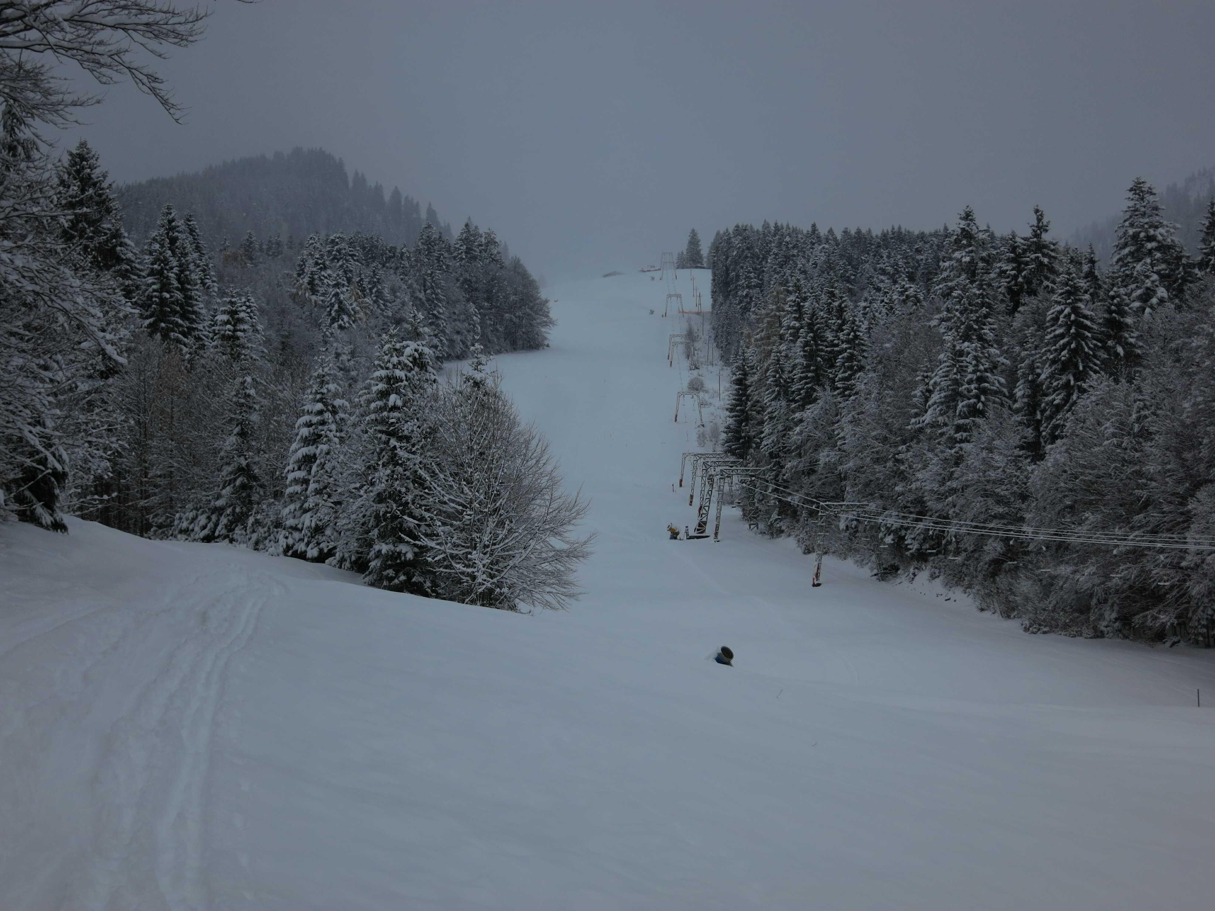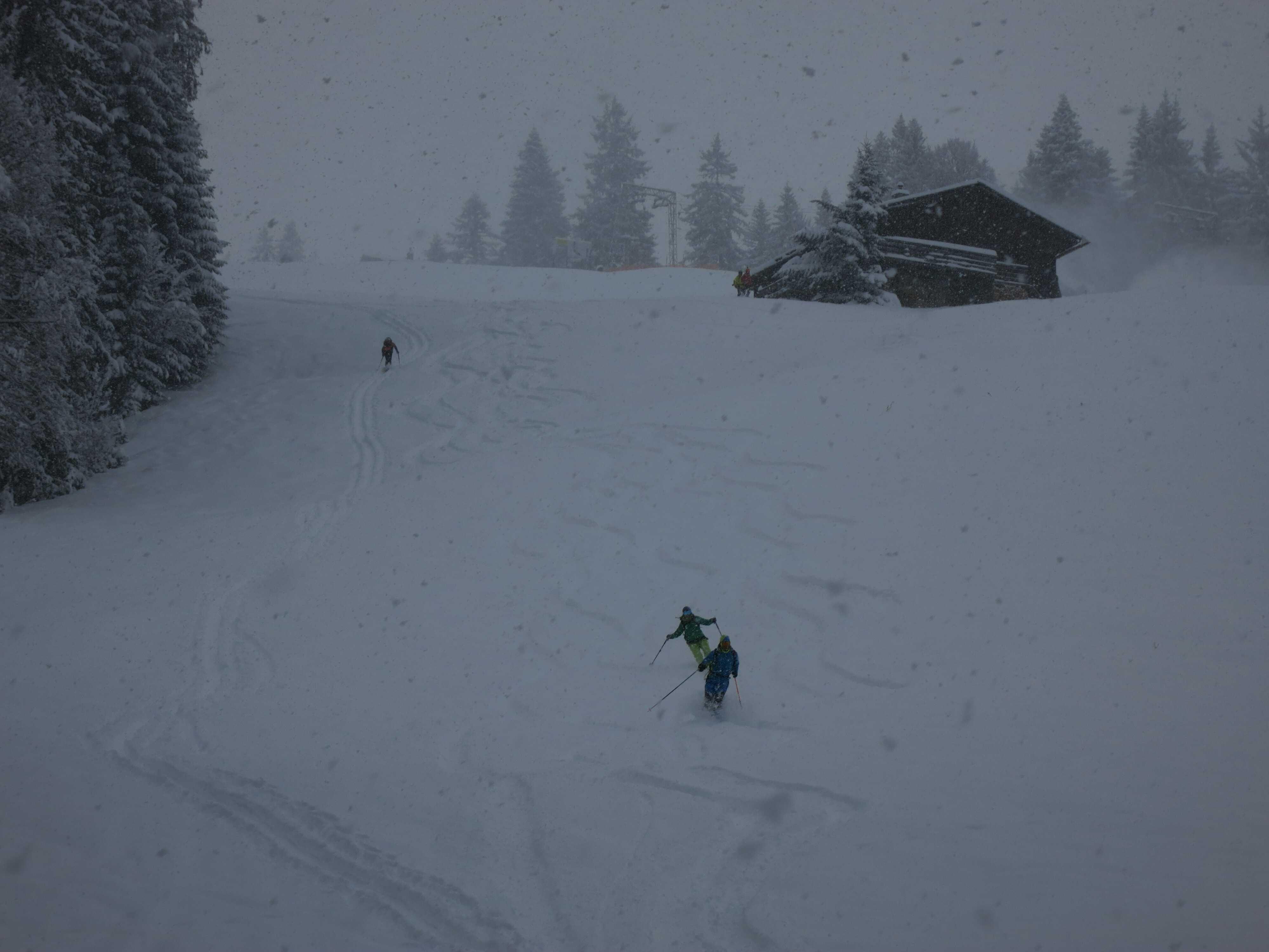 Schneelage: Im Tal ca. 15cm Pulver, nach oben zunehmend auf ca. 35cm. Die Liftabfahrt hat durchgehend Unterlage und ist bis ins Tal ganz gut fahrbar. Mittag wurde die Piste bis ganz oben teilweise gewalzt, was in den Flachstücken nicht schlecht war, denn der Schnee dort war für das Gefälle zu tief. Die Latschen oben sind problemlos zu durchqueren.