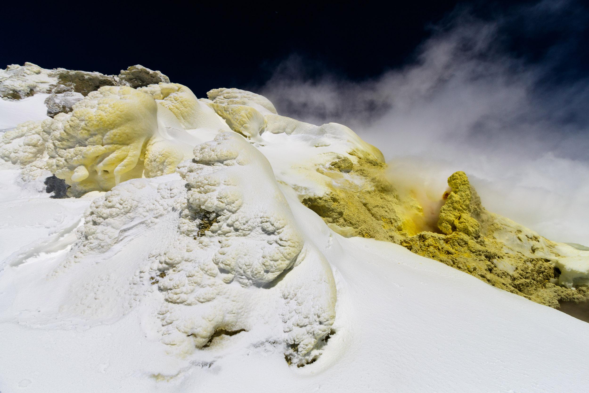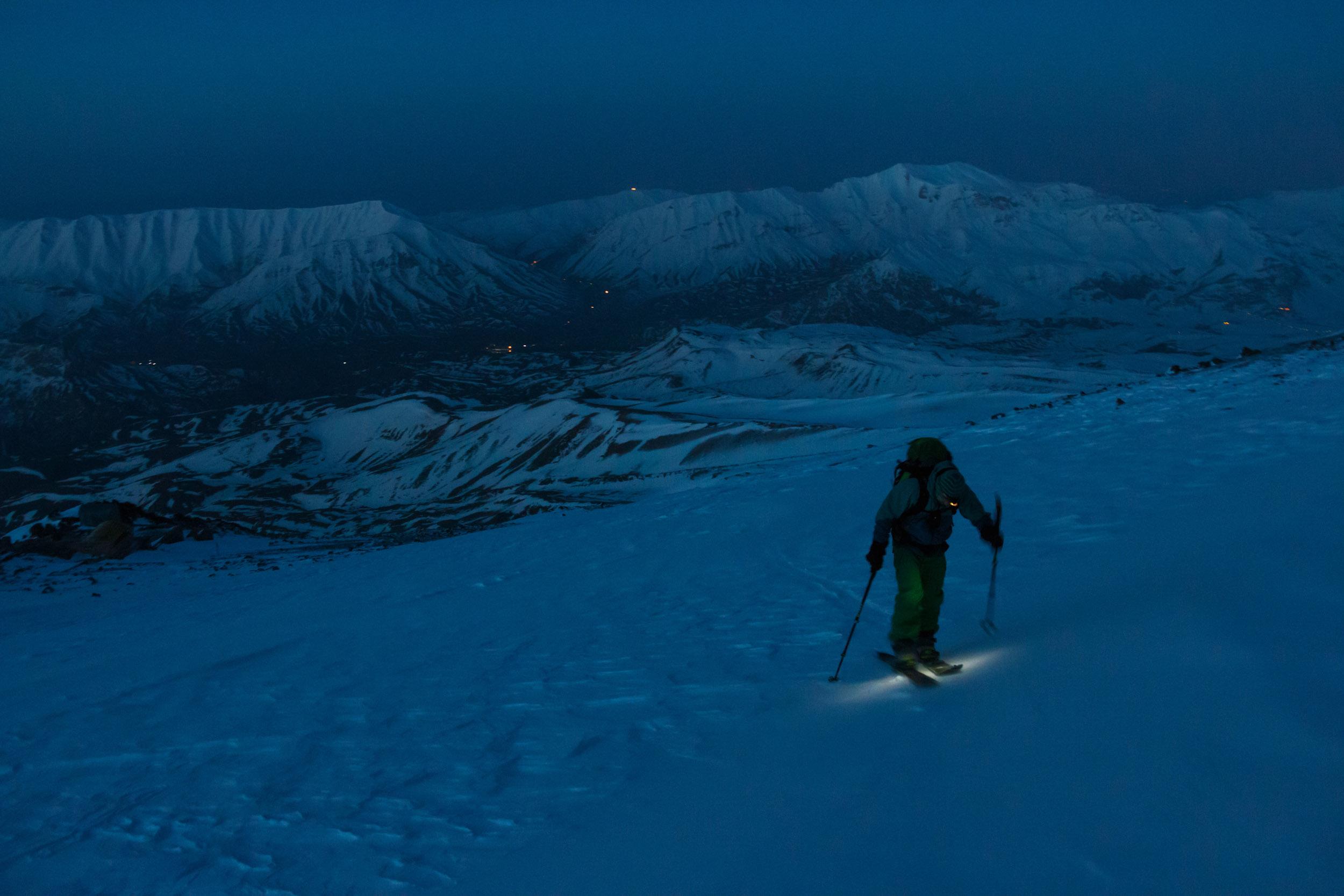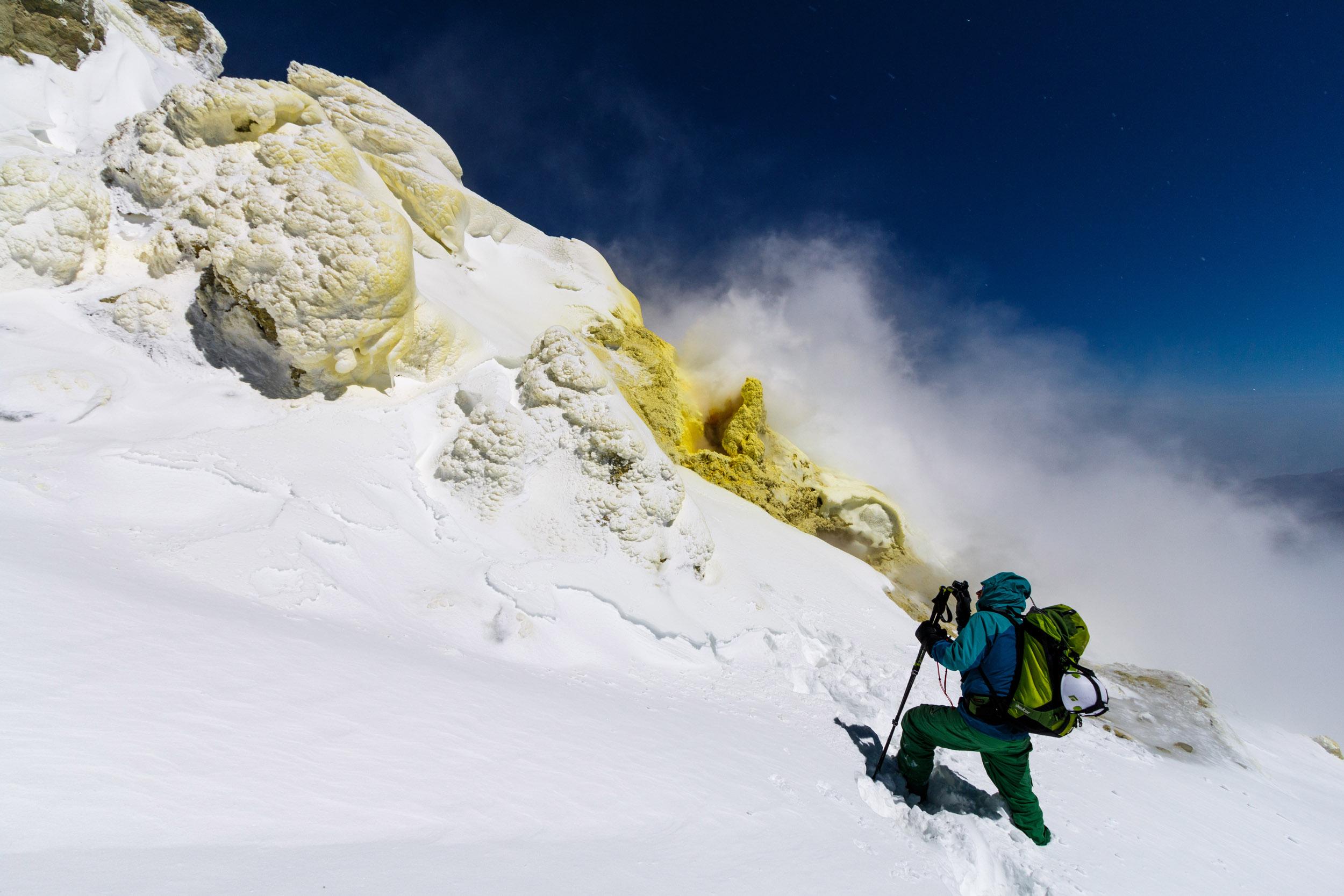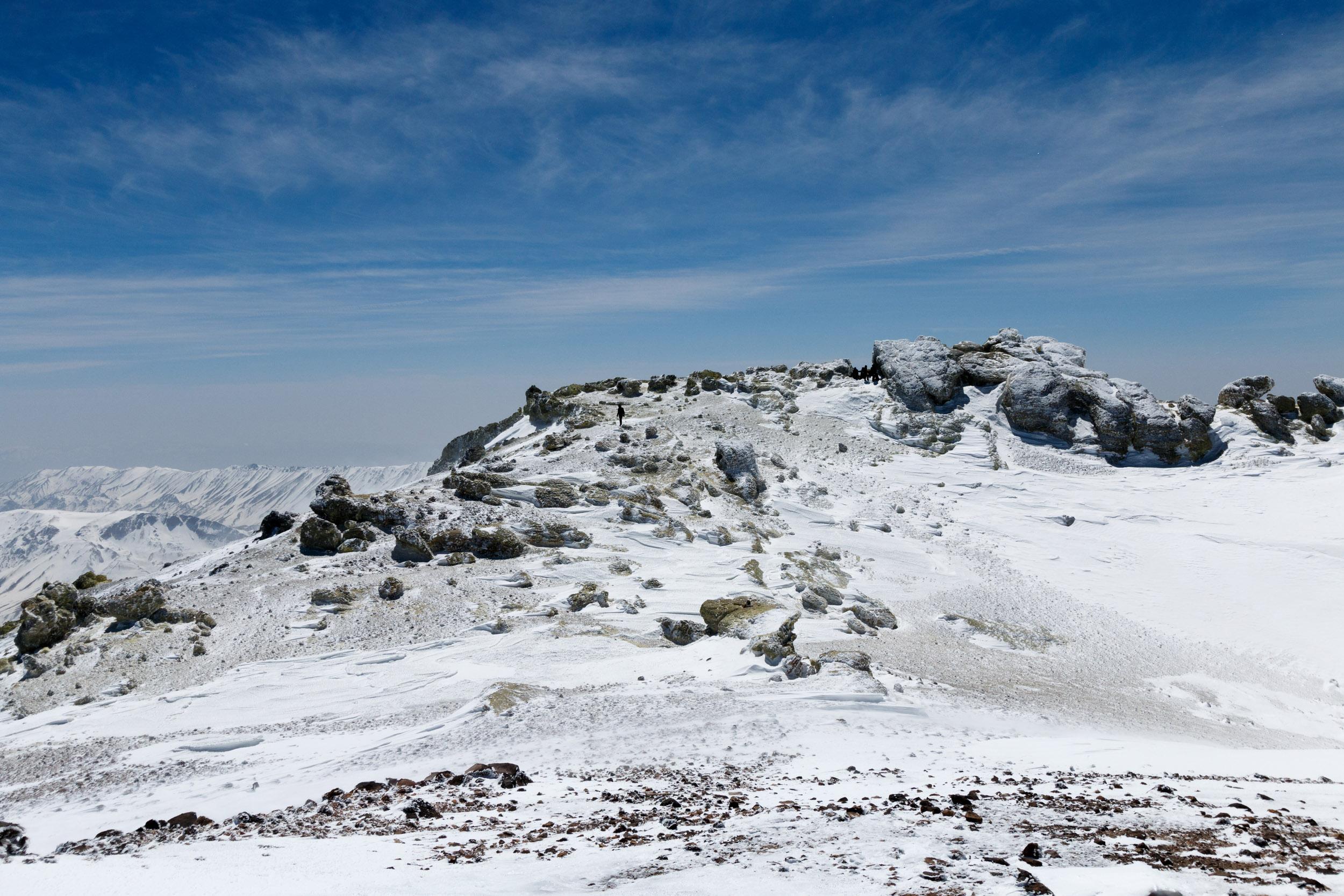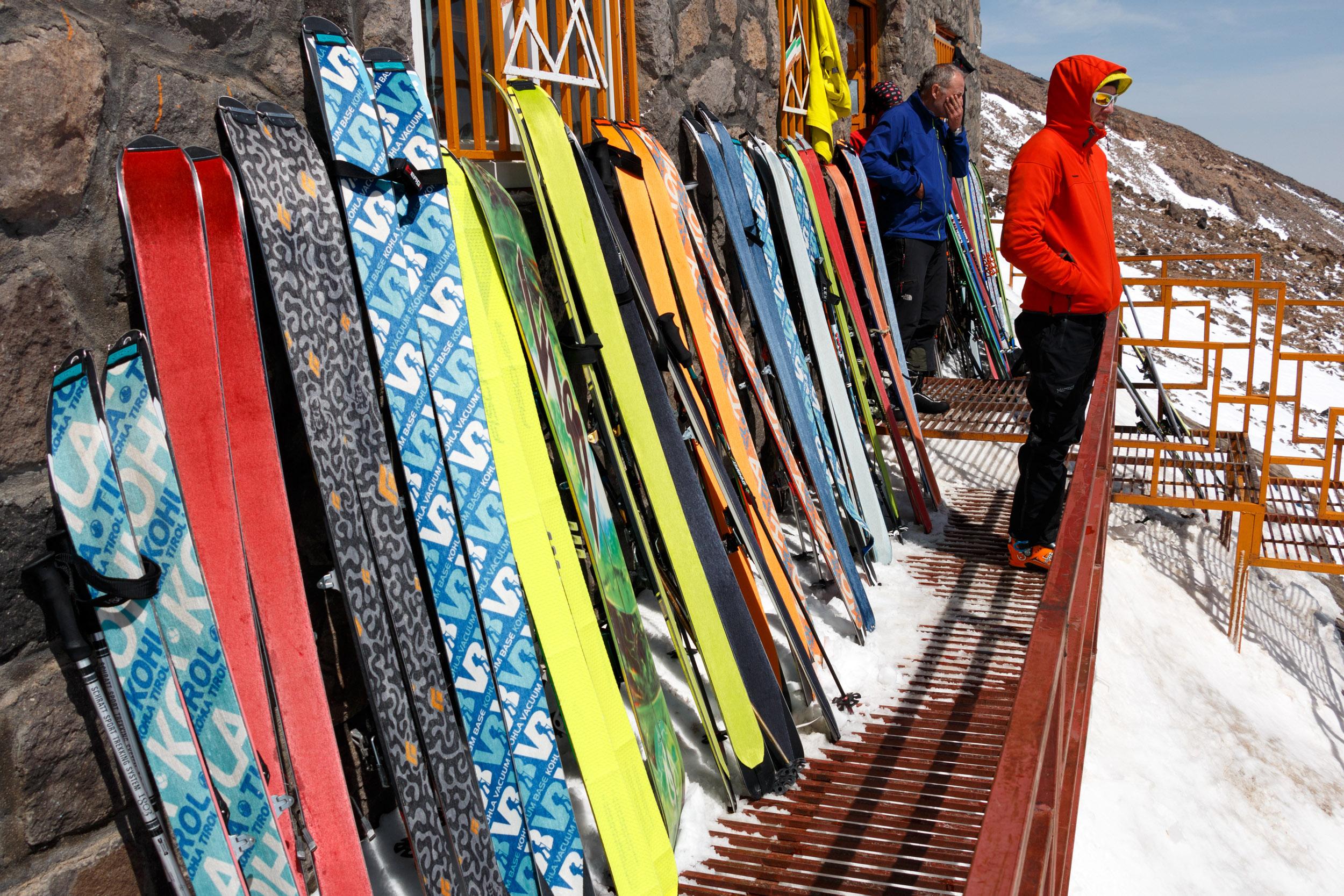 Der Damavand ist technisch einfach und nicht besonders steil, Schnee fast immer sehr hart gepresst vom Sturm. Pickel unnötig, Steigeisen hätten wir auch nicht gebraucht. Das Lawinenzeugs kann man ev. auch in Frage stellen. Da der Berg aus lauter Rinnen und Rücken besteht, kann er auch im Winter rel. problemlos zu Fuß gemacht werden: Mit Ski geht man in den schneegefüllten Rinnen, zu Fuß auf den abgeblasenen Rücken.