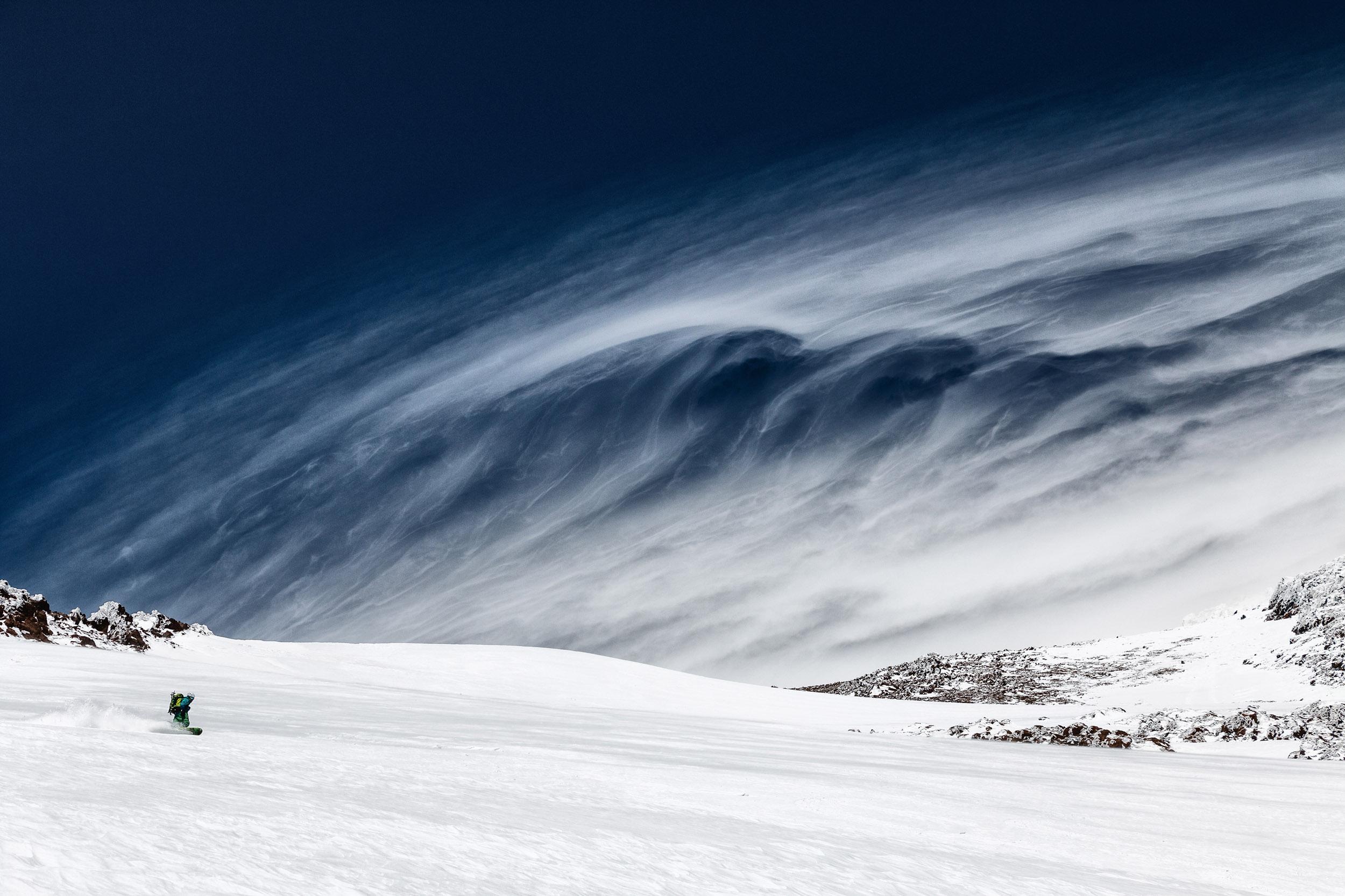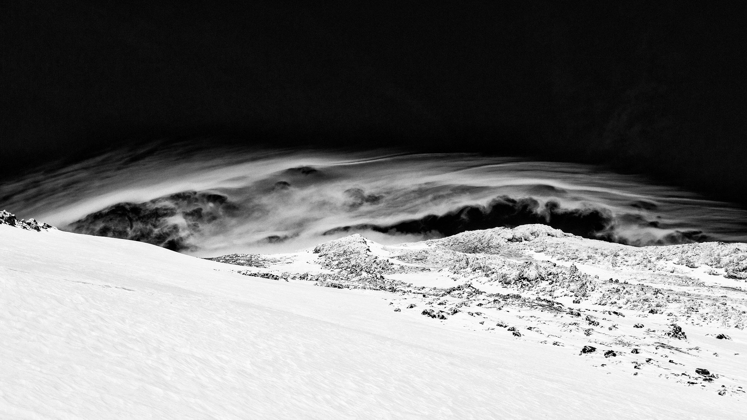 Start um 6 Uhr bei bestem Wetter, nur leichter Wind. In endlosen Kehren immer weiter rauf, bis bei ca. 5400m die Ski deponiert werden müssen. Durch die ständigen Stürme ist der Gipfelbereich einfach freigeblasen. Nach ca. 5:30h dann der Gipfel! Immer noch wolkenlos, Wind zwar schon an die 60 kmh, aber rel. warm bei -12°, ein Traum!