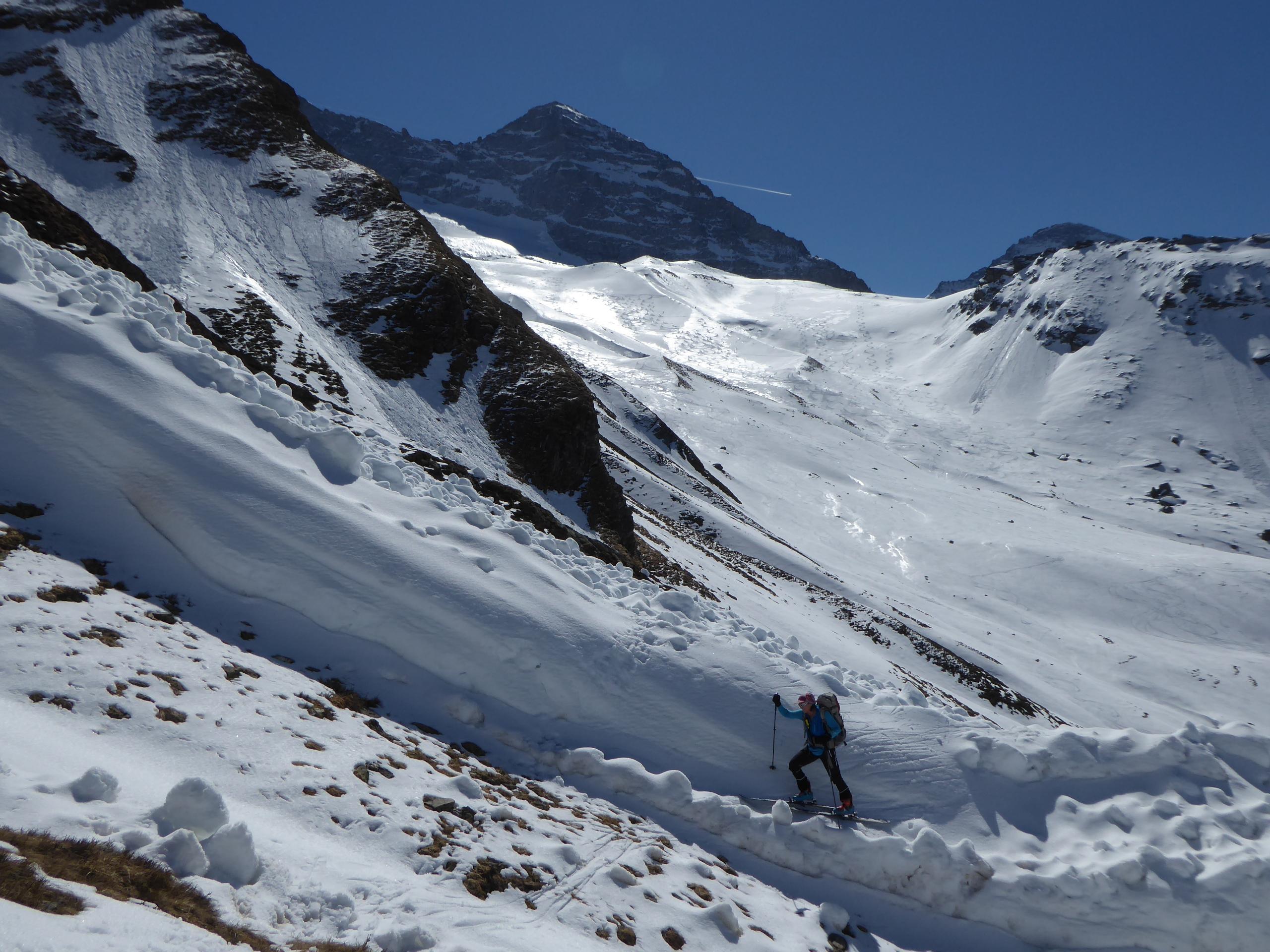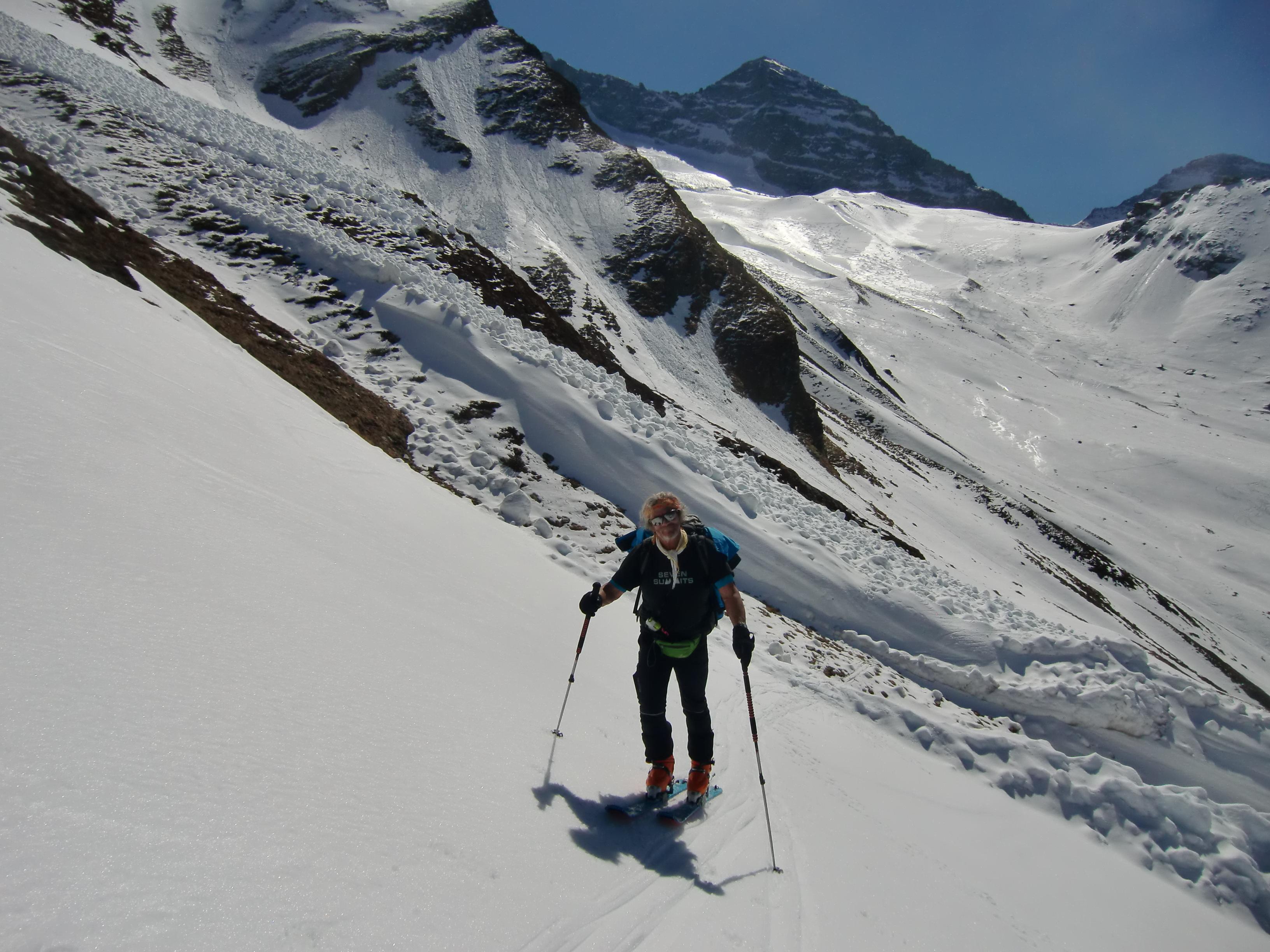 Landschaftlich atemberaubende Runde in extrem skifreundlichem Gelände im Herzen der Tuxer und zu Füßen des Olperers. Auffahrt mit Gondel zur Gefrorene-Wand-Spitze, 3250m (3 Sektionen, €28.-) plus Schlepplift ohne Anfellen in die Höllscharte (2991m) unterm Kleinen Kaserer. Einfahrt in die fantastisch schöne "Höll", Aufstieg (ohne Abschnallen) in die Kleegrubenscharte (2498m), Abfahrt in den Kaserer Winkel, Aufstieg zum Tuxer Joch (2338m) (knapp 200Hm Tragestrecke) und Abfahrt über die Pisten bis zum Auto. Über 3000 Abfahrts-Hm (bei nur 900 Aufstiegsmetern).