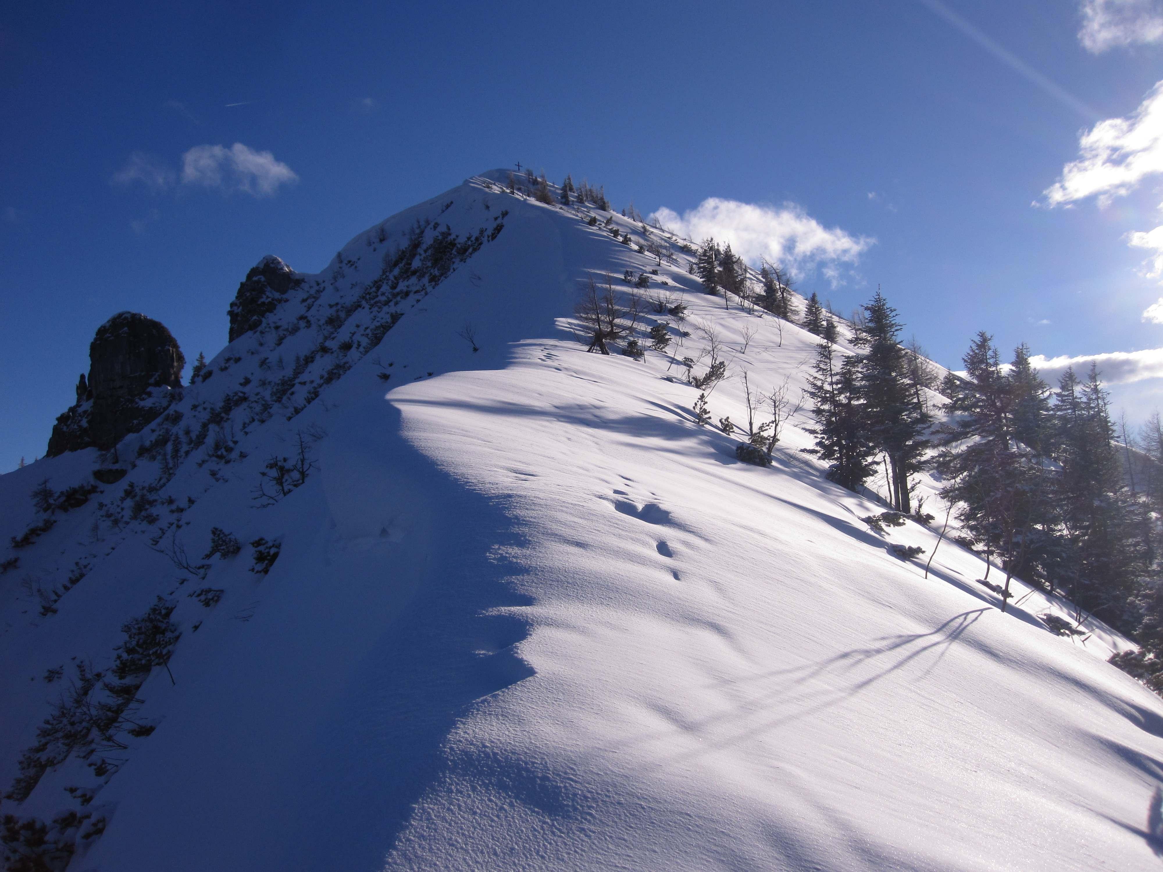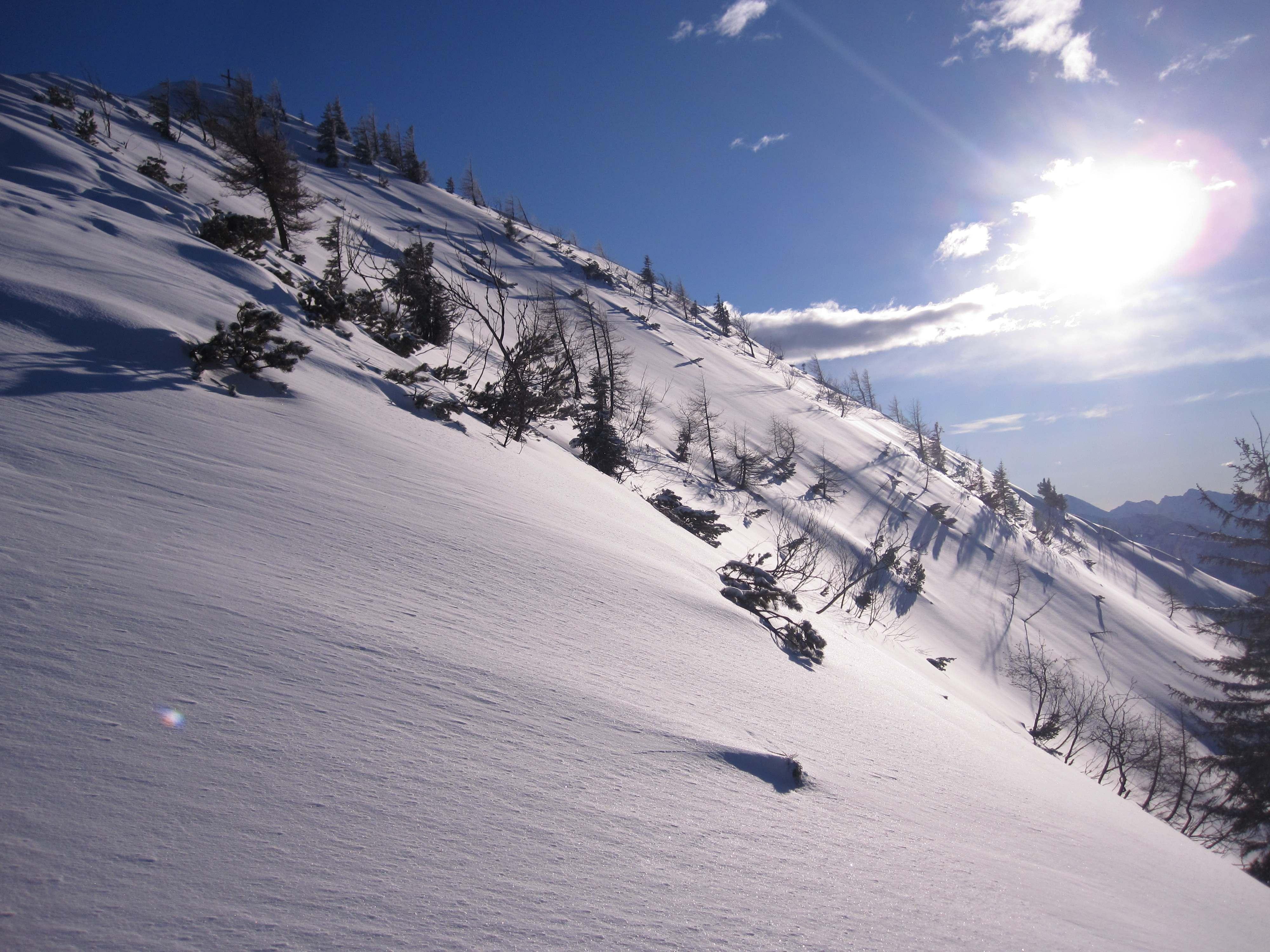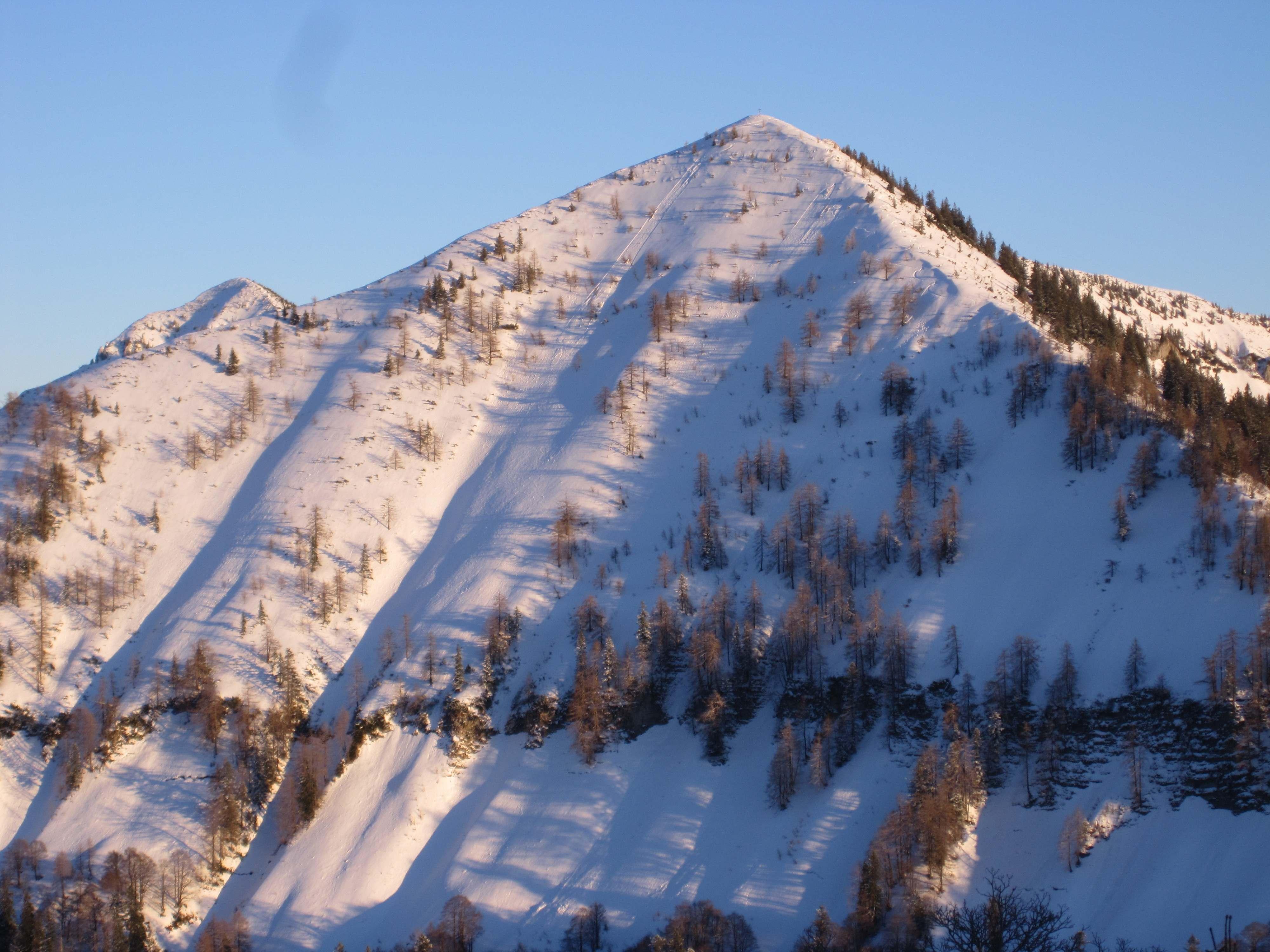Beim Aufstieg zur Feichtensteinalm den Schlag gewählt, da die Forststraße dort oben schon ziemlich ausapert. Unten leicht angezuckert bis oben auf 10 -15 cm Pulver