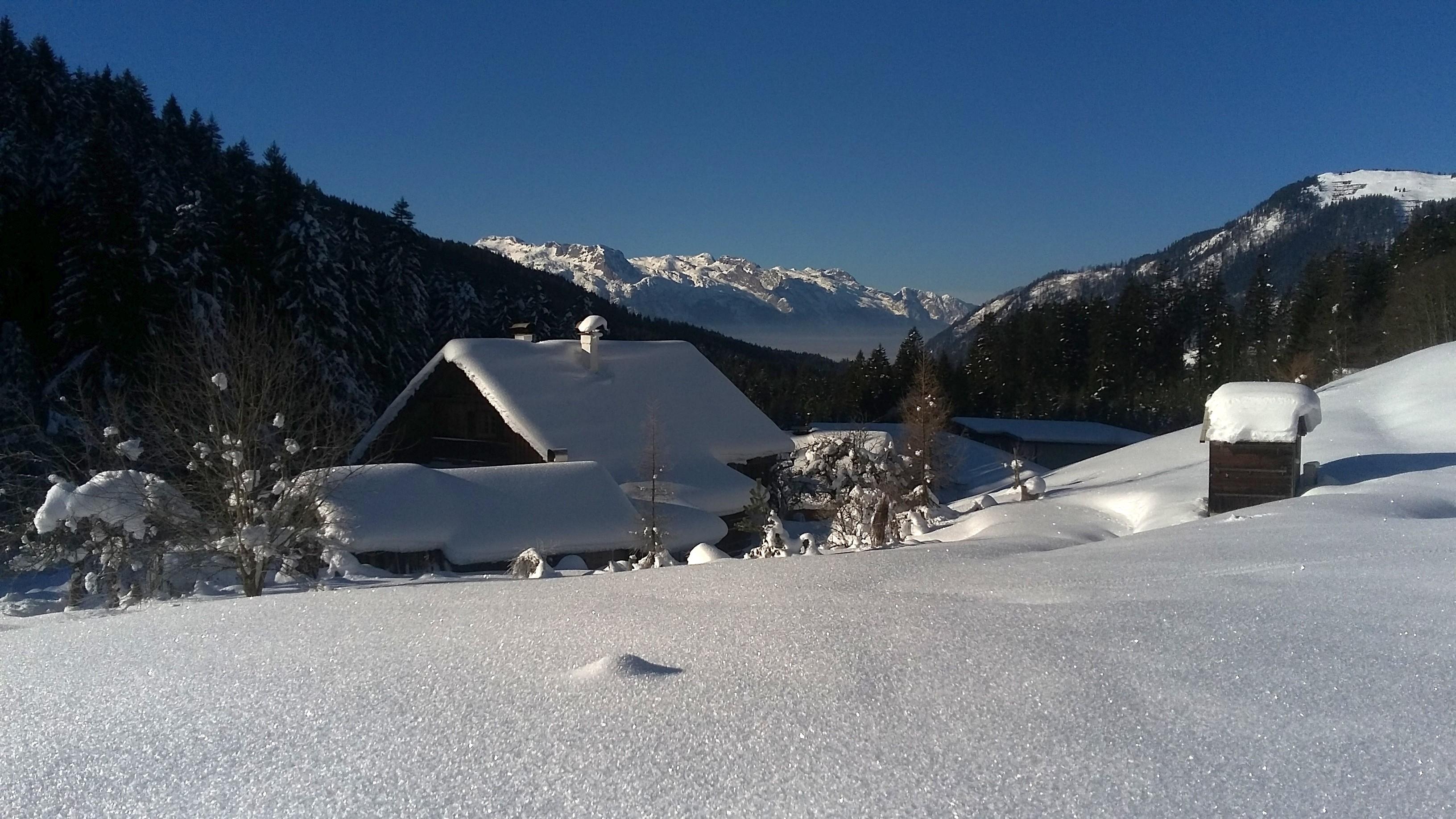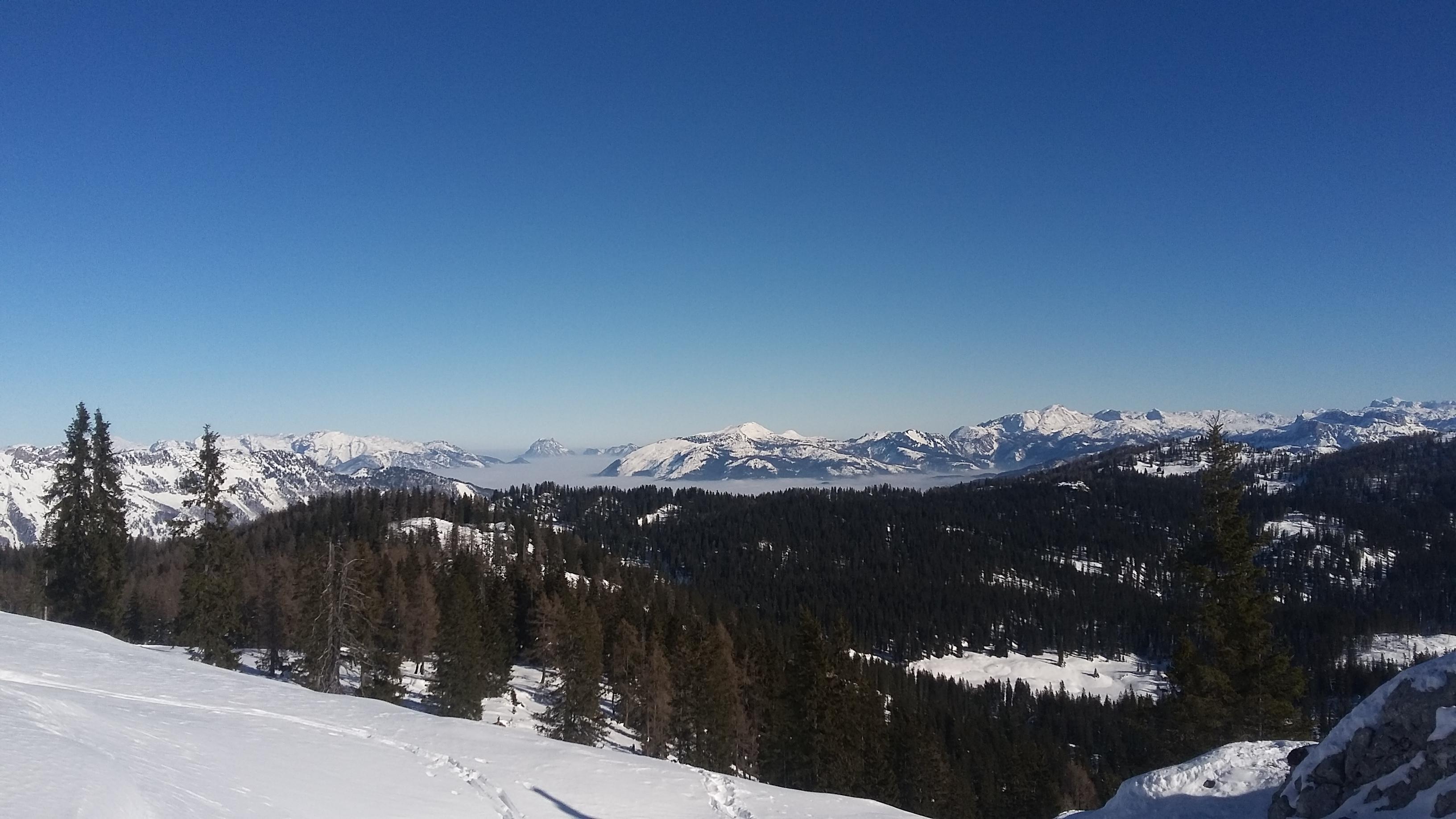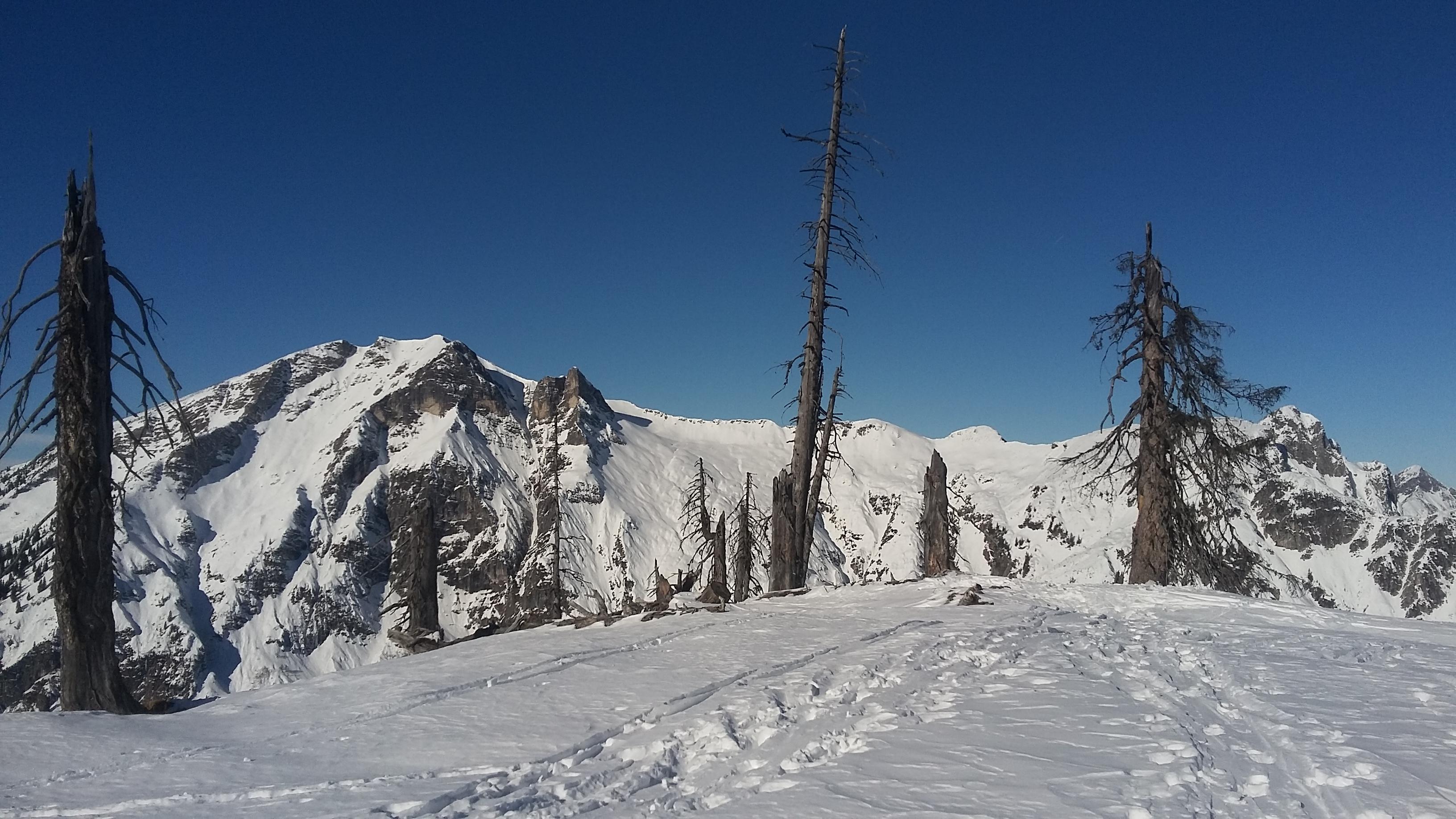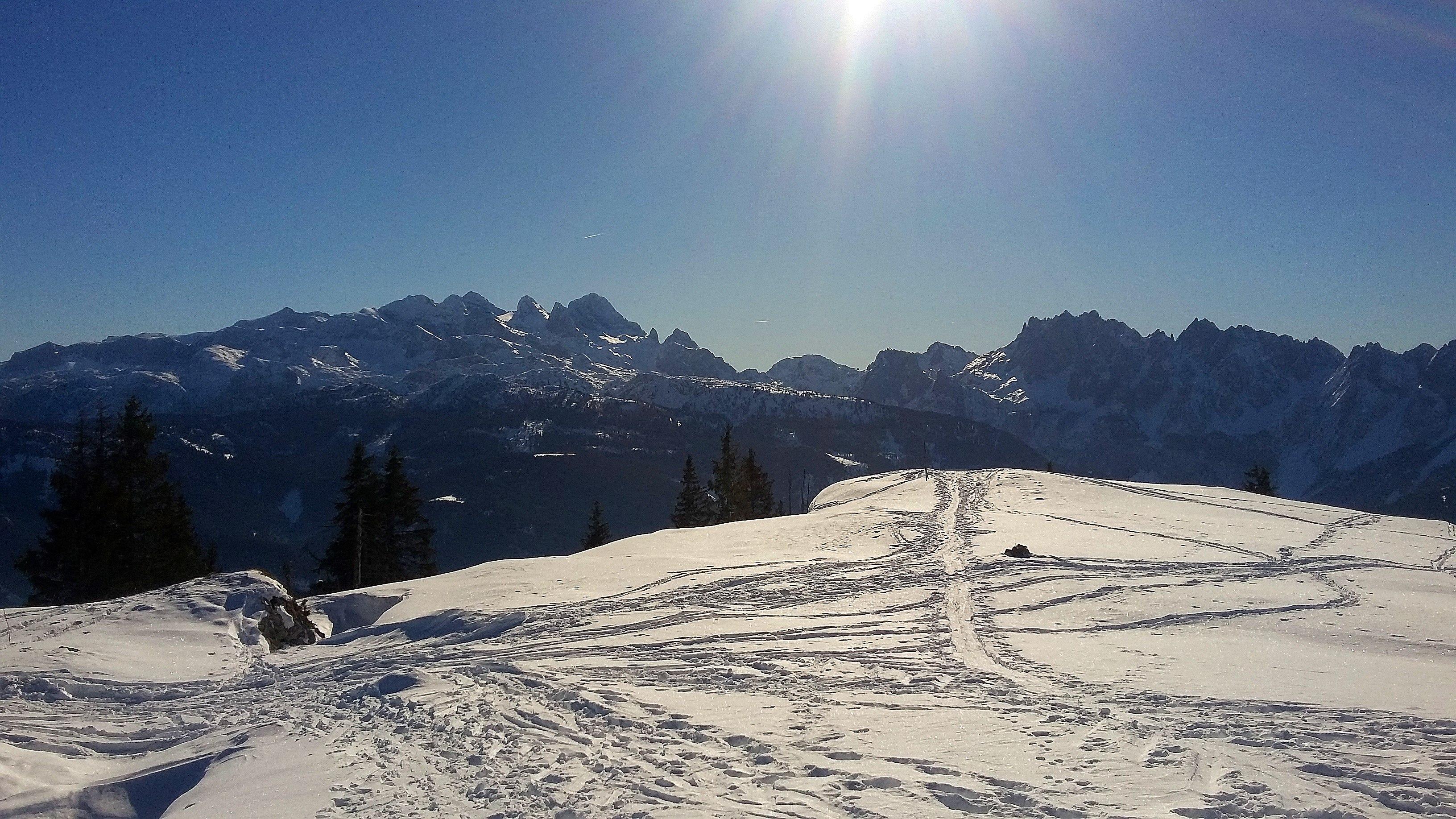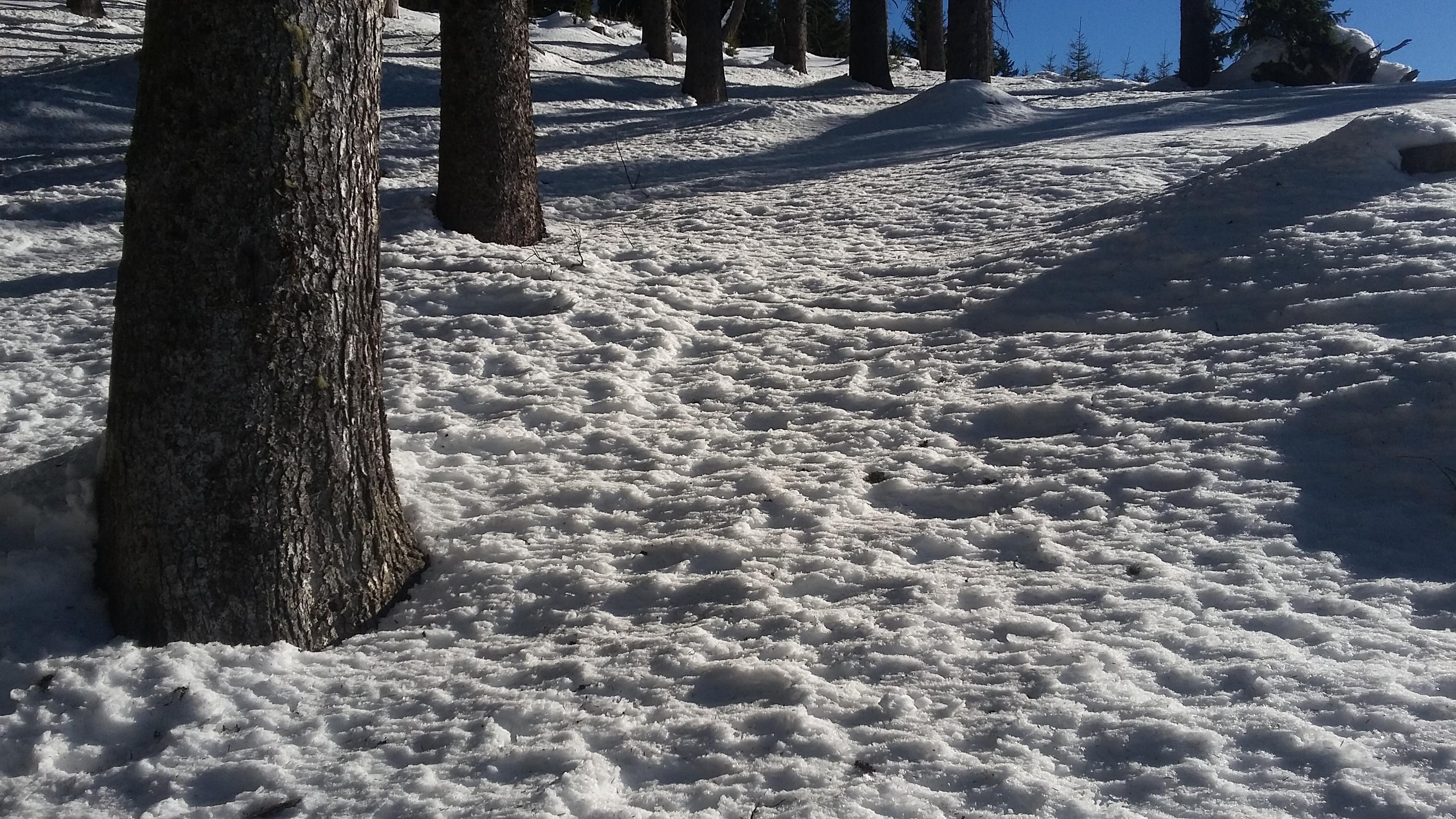 Der Rußberg mit dem Ausgangspunkt vom Pass Gschütt ist ein nicht unbedingt bekannter Schitourenberg. Er wird zwar von Einheimischen oft bestiegen, das ideale westseitige steile lichte Waldgelände wird aber kaum befahren. Hier konnte man heute sogar bei richtiger Routenwahl Pulverschnee vorfinden. Sonnenbeschienene Hänge wiesen wiederum praktisch unfahrbaren Bruchharsch auf.
