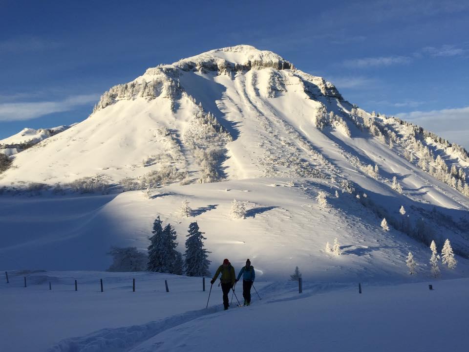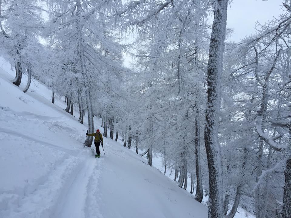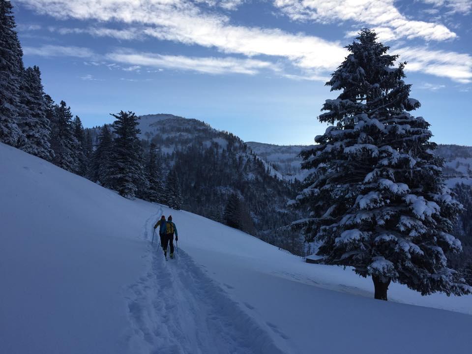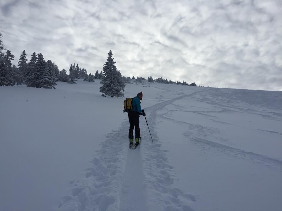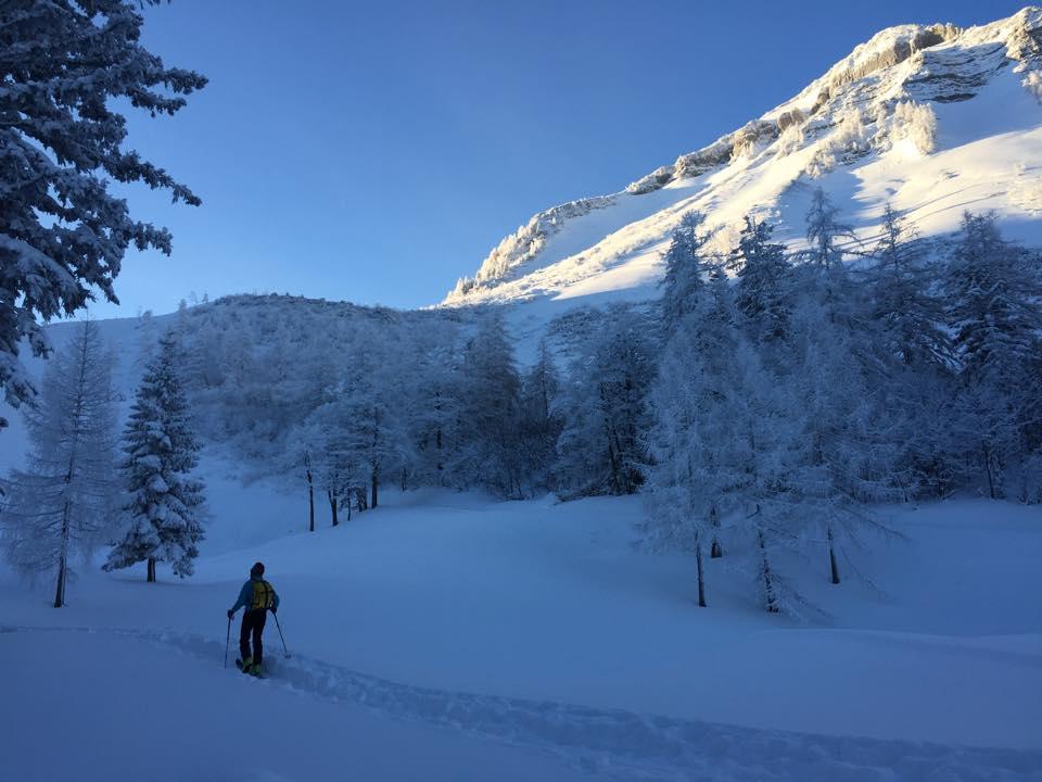 Wetter: Sehr kalt. Tal -18°, Alm -16°, Gipfel -15°. Zuerst wolkenlos dann aufziehende Bewölkung. Bei der Abfahr difuses Licht.
