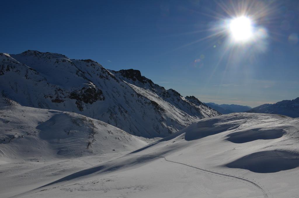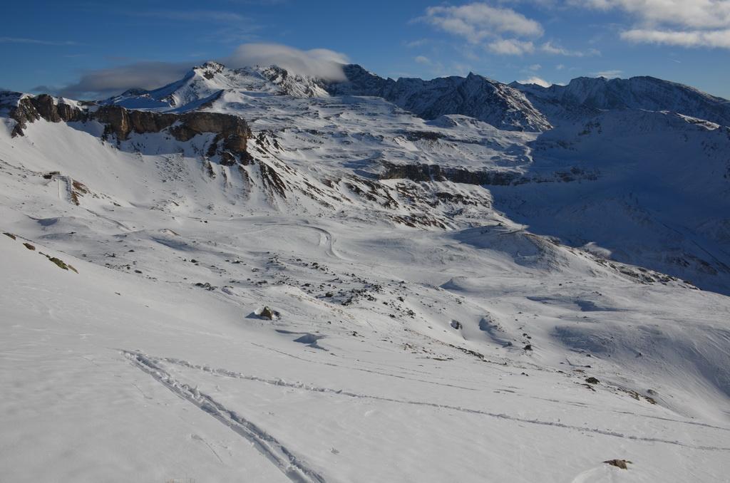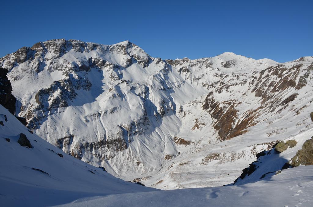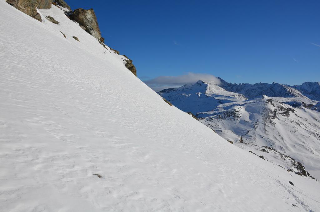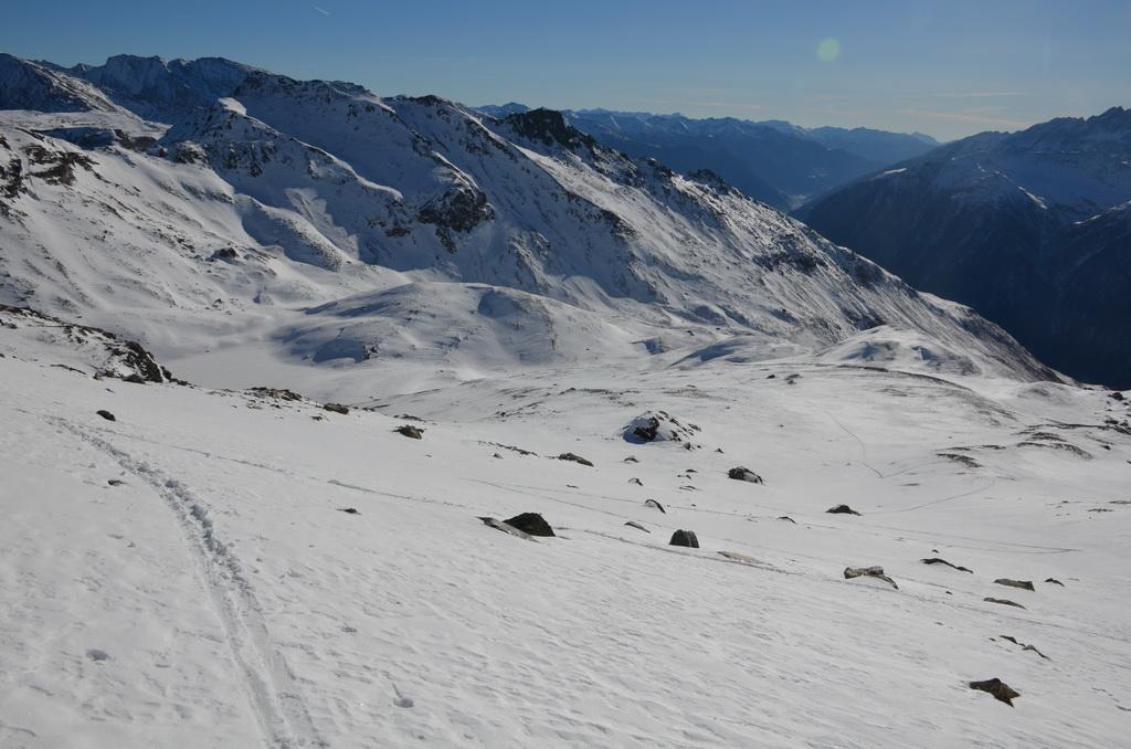 Bei den bescheidenen Bedingungen ist der Brennkogel immer noch eine gute Wahl zur Zeit. Seit meinem letzten Besuch Anfang Dezember hat sich nicht wirklich viel verändert. Ein paar cm Neuschnee sind dazu gekommen, allerdings sind diese ziemlich verblasen worden und liegen vorwiegend in Rinnen und Mulden. Kleinere Triebschneepakete sind gut erkennbar und können auch umgangen bzw. umfahren werden.