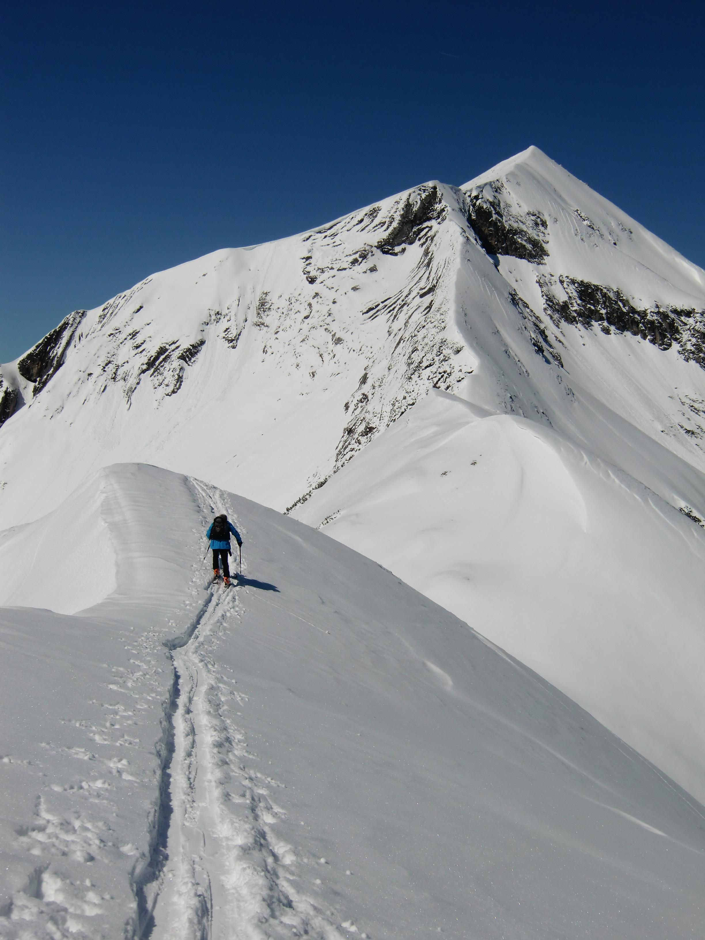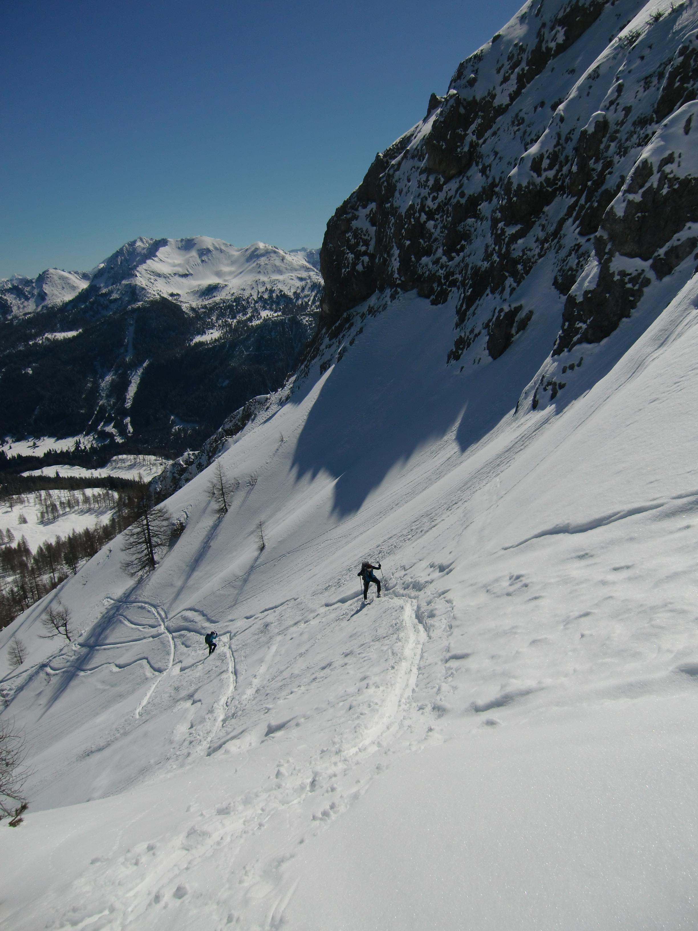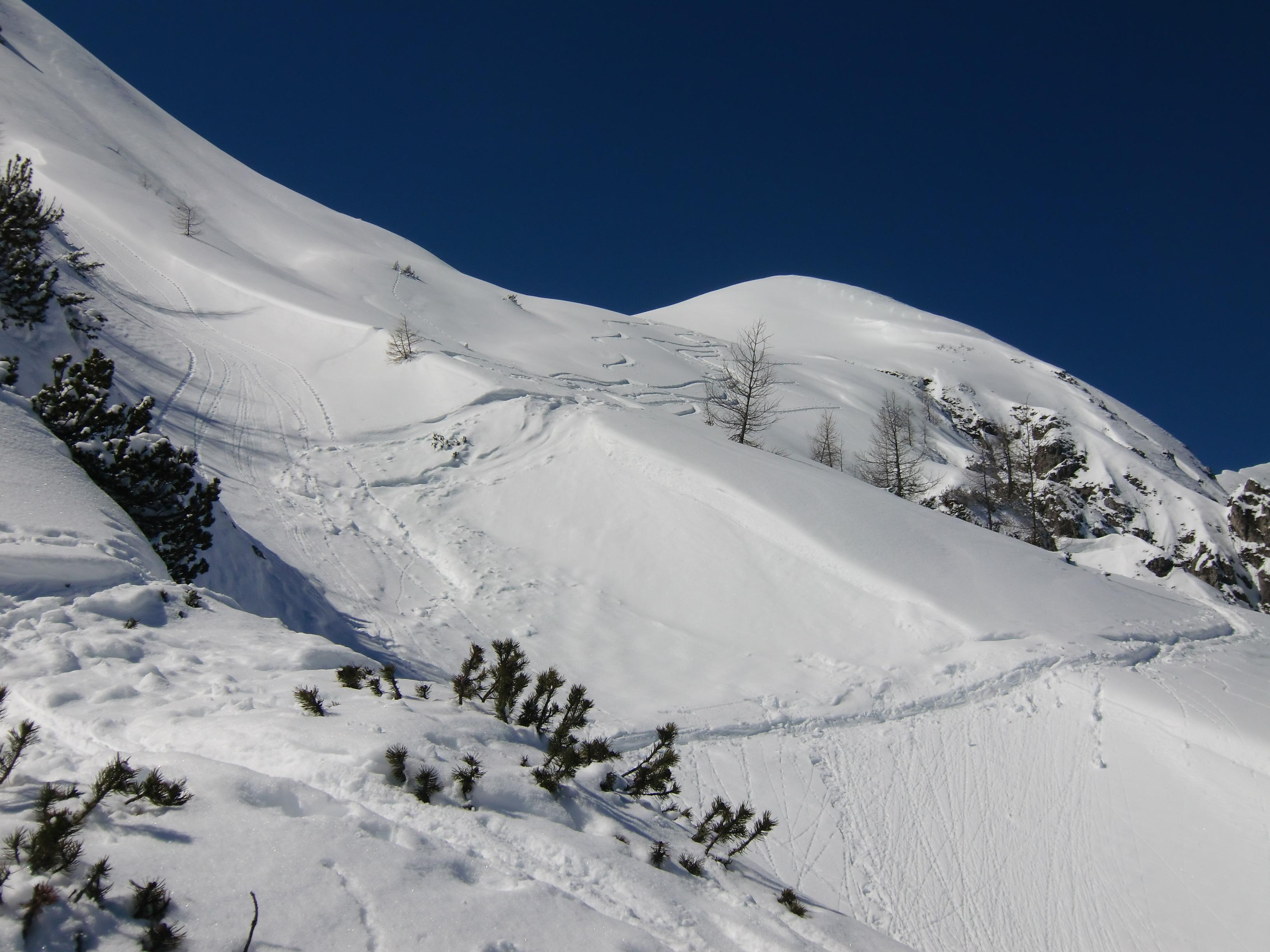 Lawinen: Nur wenige kleinere Spontanentladungen von gestern. Neuschnee unten schon auf ca. 20cm zusammengesessen, oben auf etwa 30cm. Selbstauslösungen wegen fortgeschrittener Setzung kaum mehr ein Thema, eher noch Spontanauslösungen aus den großteils noch nicht entladenen steilen Felspartien oberhalb der Route. Wenn's morgen warm wird....hm,hm.