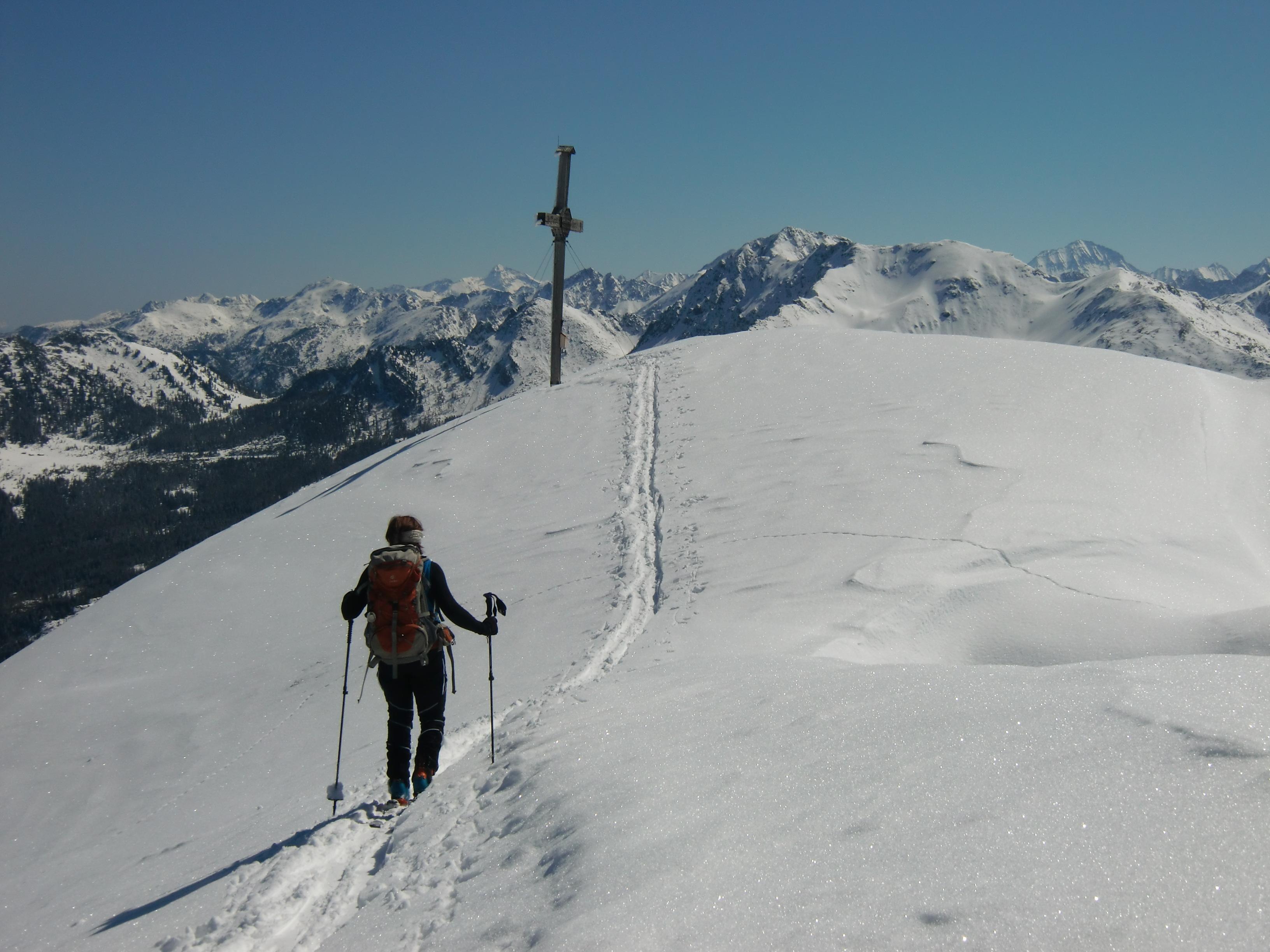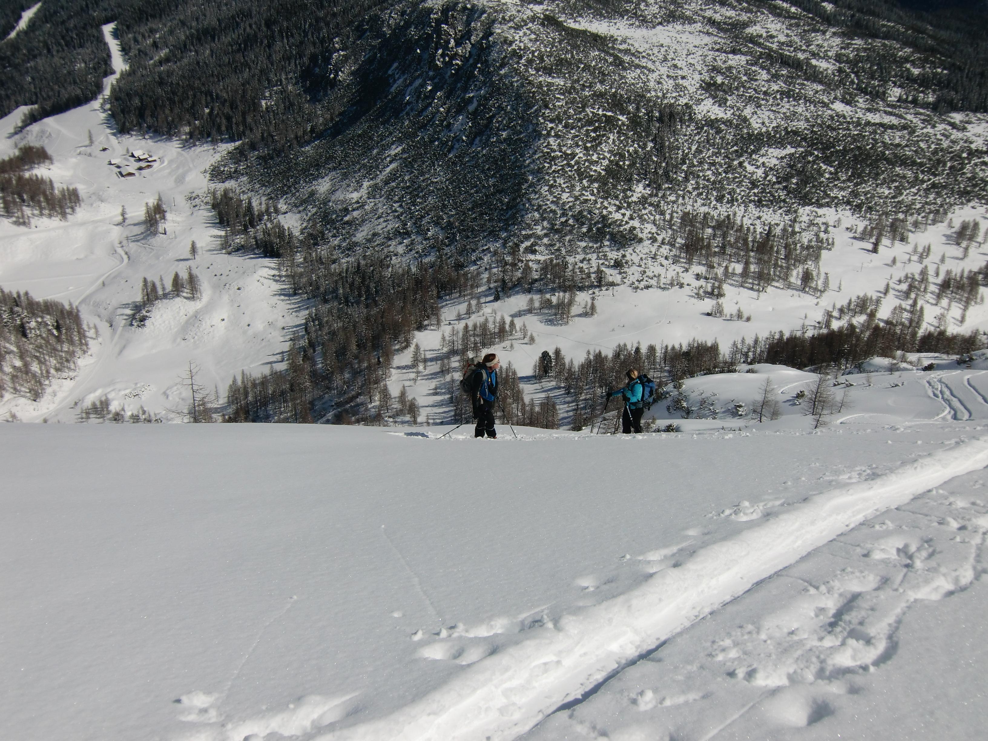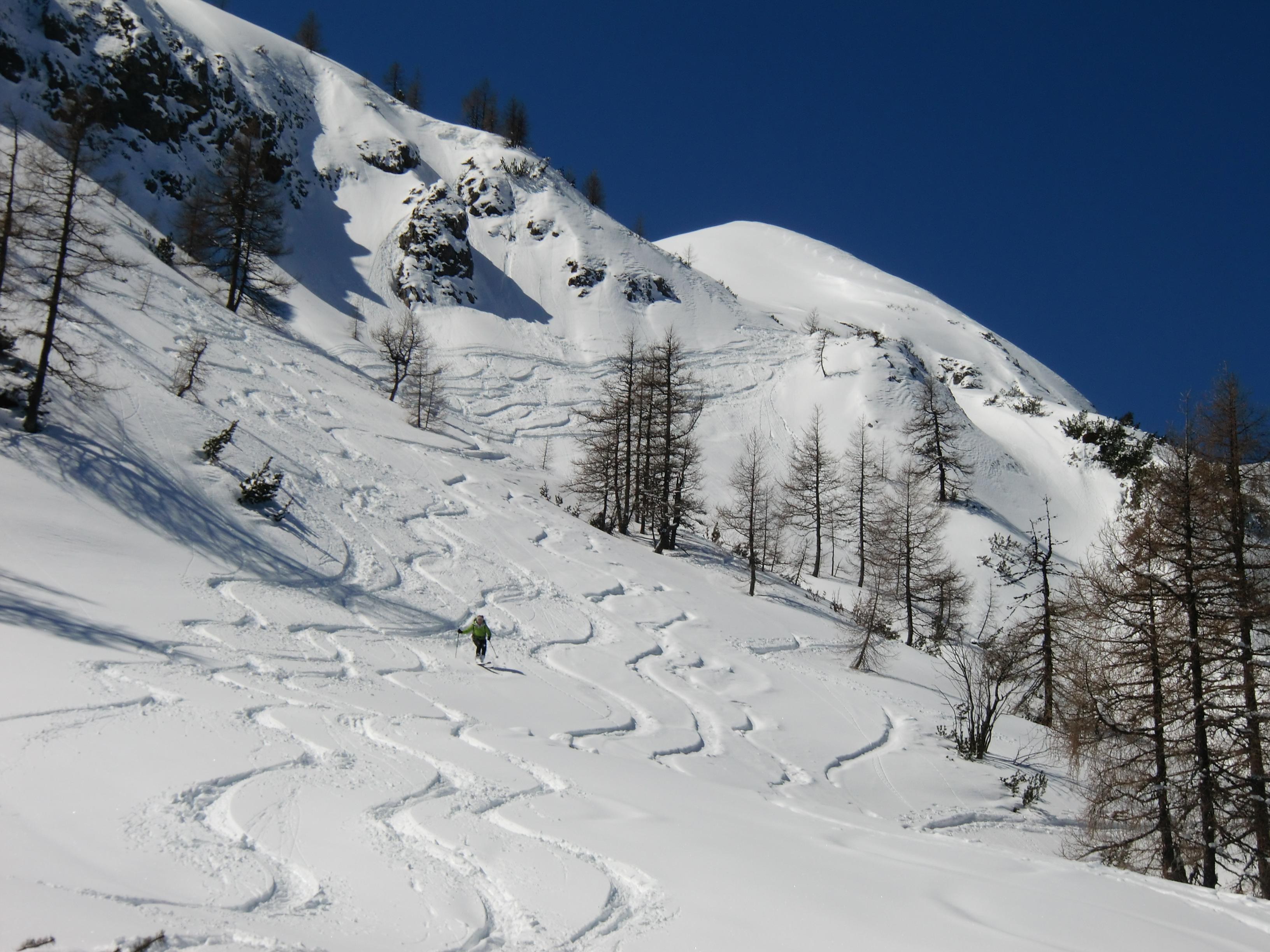 Schnee: Morgens am Parkplatz nach klarer Nacht -7°, also ganz oben schöner fast noch staubiger Pulver, in der Mitte nur leicht angefeuchtet, nach unten zu dann schnell bockiger werdend, trotz Nordexposition. Wird morgen schon nicht mehr so schön sein.