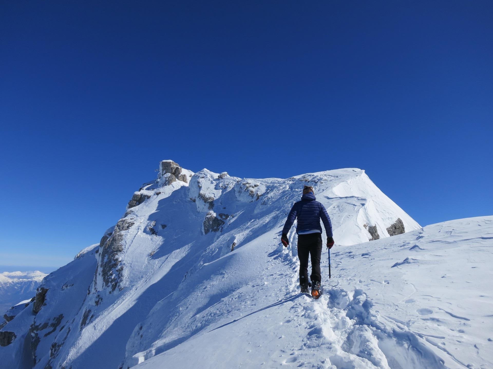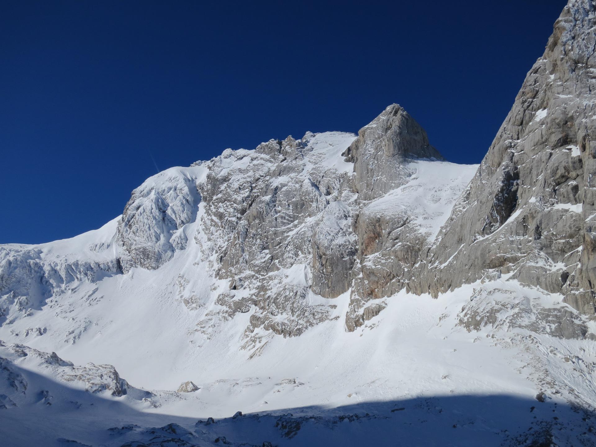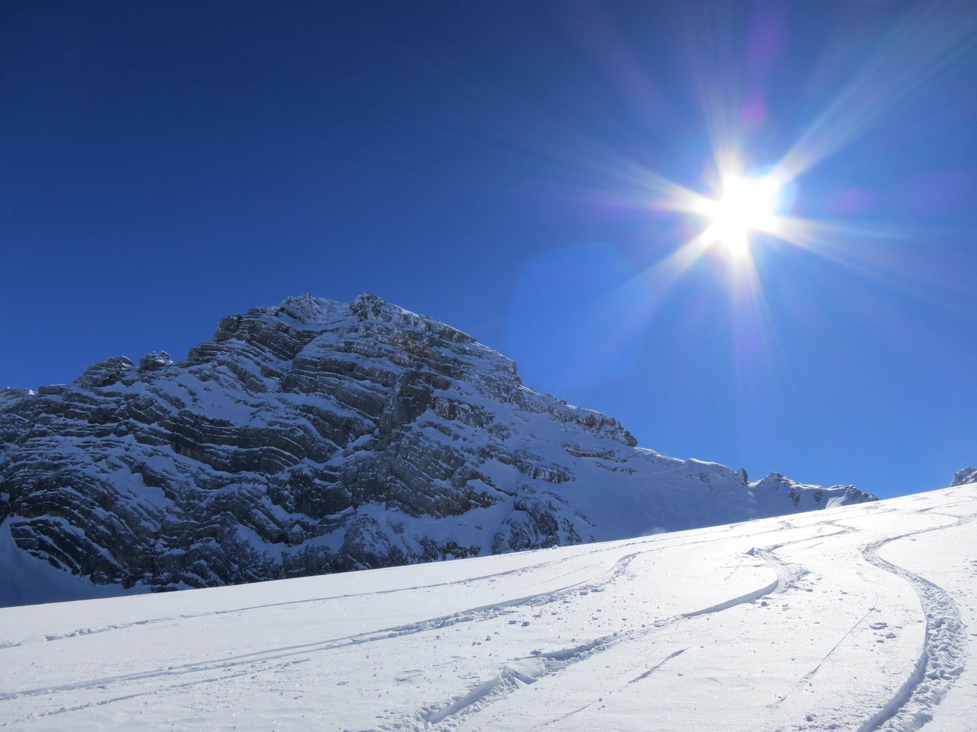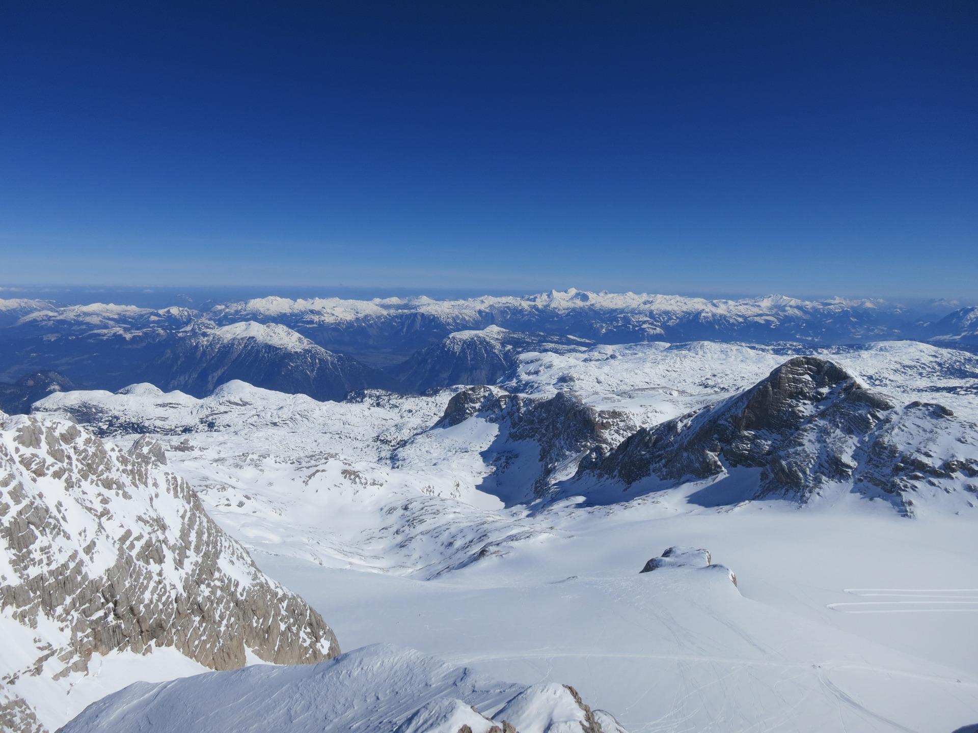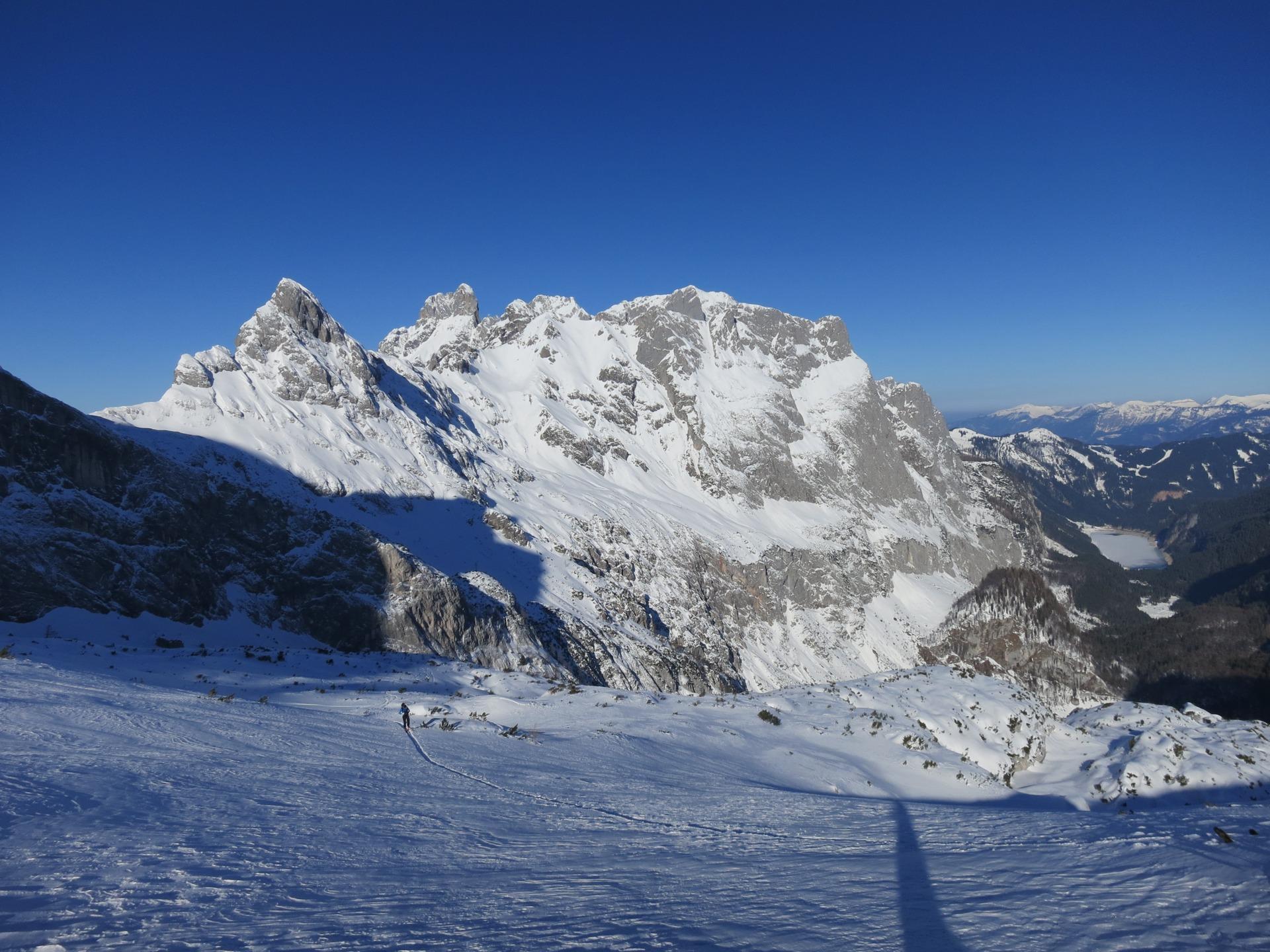 Dachstein vom Gosausee. Gute Verhältnisse. Schnee bereits vorm Ende des vorderen Gosausees. In der Steilstufe nach dem hinteren Gosausee 3 Stellen wo Steine rausschauen. Am Gletscher je nach Exposition und Bearbeitung durch Wind alle Schneesorten vorhanden. Westgrat gut zu gehen, Seil großteils frei.