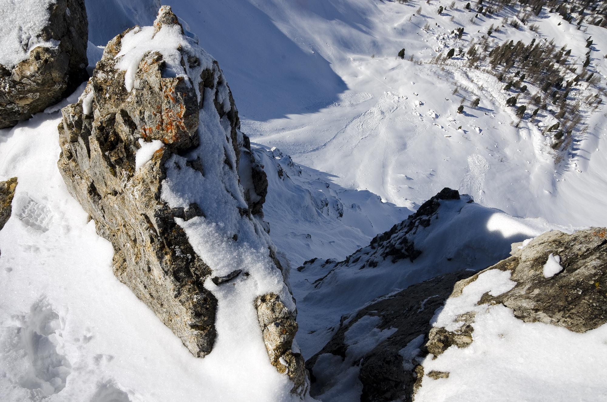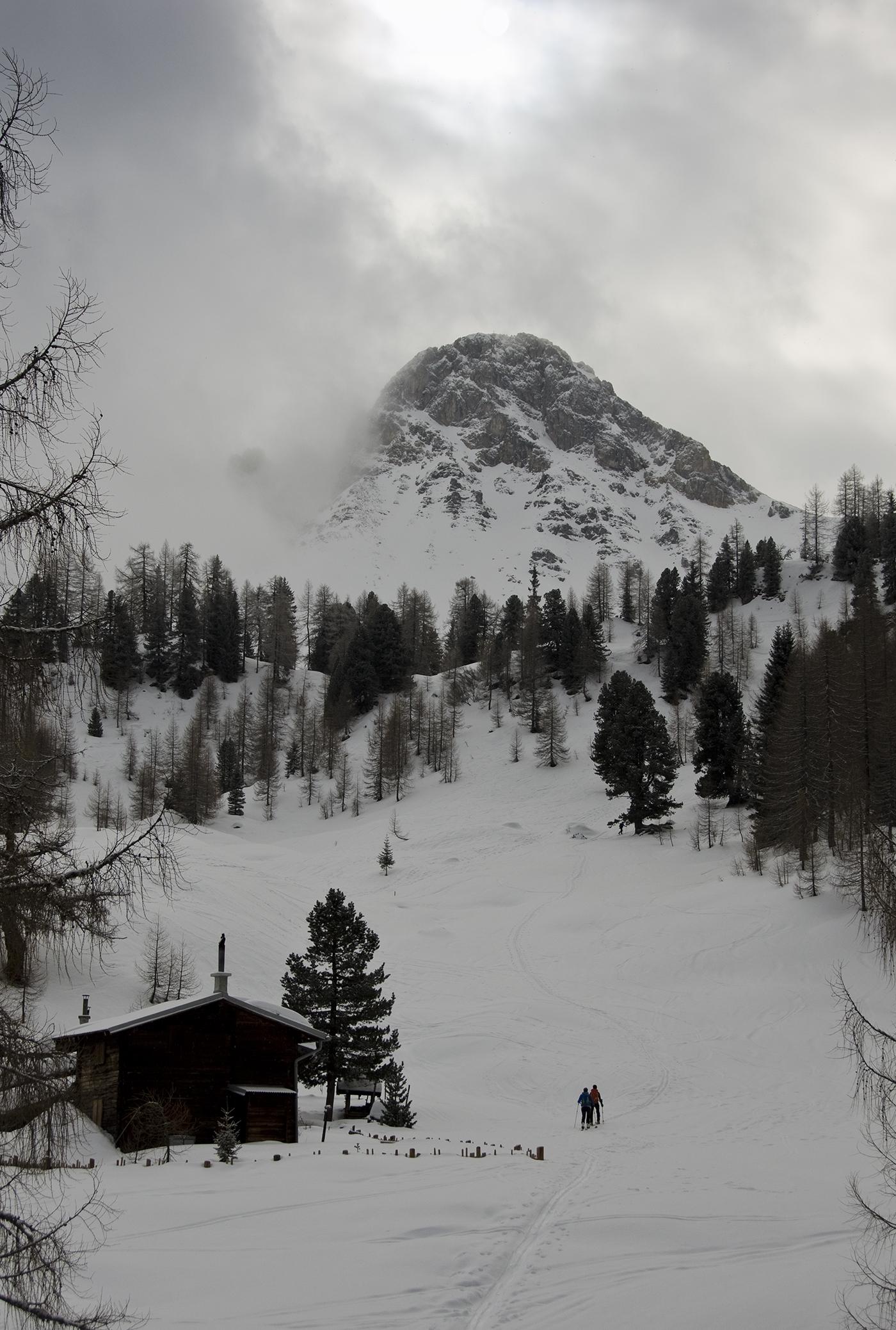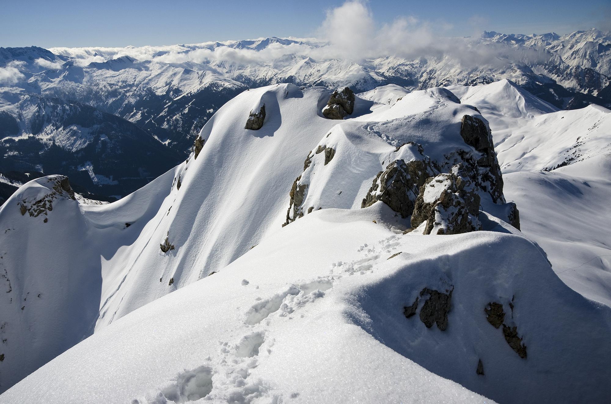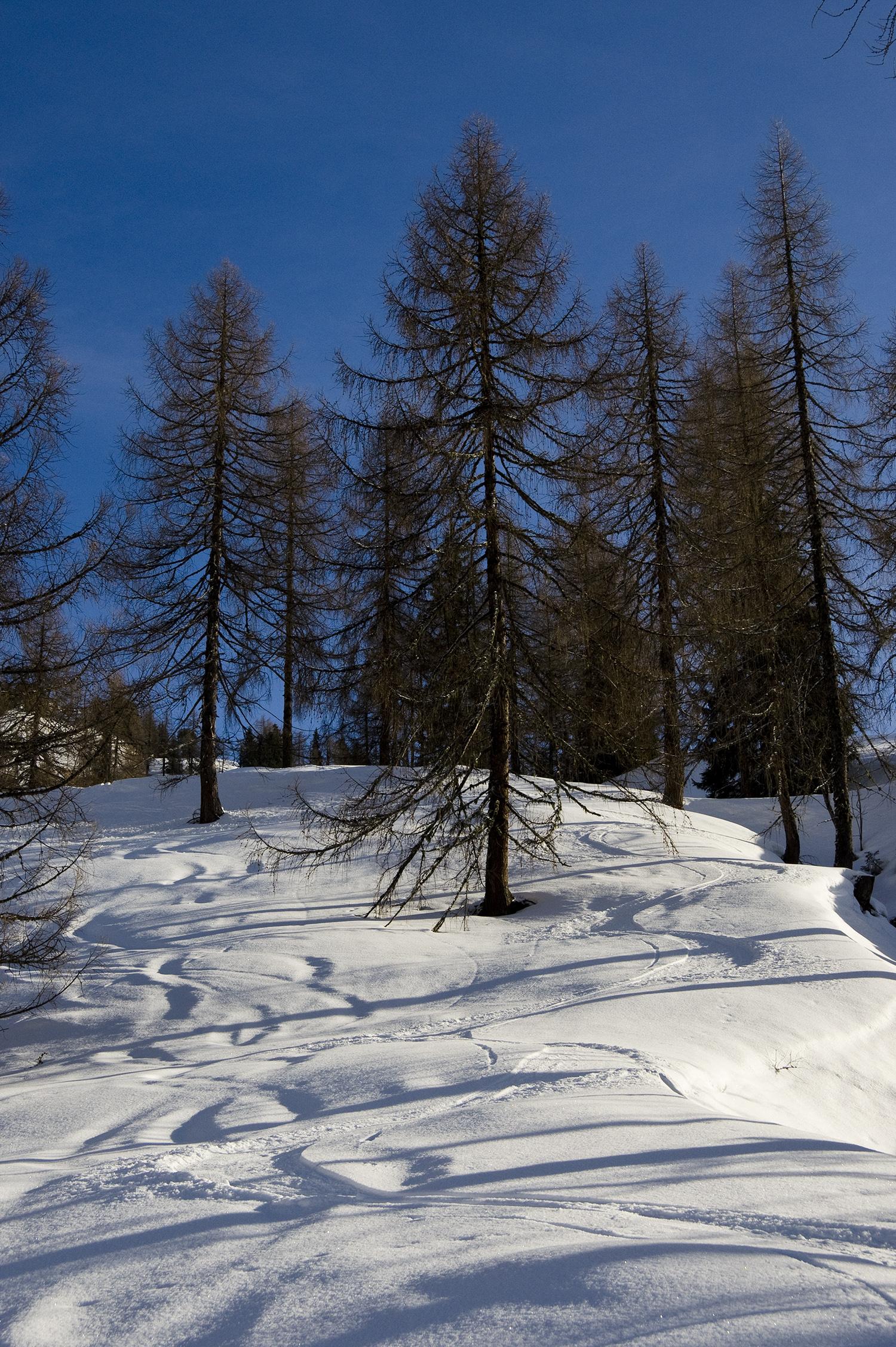 Was für ein Schneeloch, das hinterste Ellmautal! In der Früh blieb ich in der allerletzten Kehre vor dem Parkplatz mit dem Auto hängen, Strasse vereist. Nachmittags war die Strasse dann aper. Aber der weite, flache, nordseitig ausgerichtete Talkessel hat satt Schnee, und besonders das Filzmooshörndl war heute gut besucht. Die direkte Nordabfahrt wurde von den meisten genommen. Am Draugstein war ich allein und habe mit den Schuhspitzen manchmal ordentlich Tritte hacken müssen (aber es ging ohne Steigeisen). Etwas heikel waren die oberen 100 Hm, weil die steilen Felsen nur gering überschneit waren - und darunter mit Eisglasur versehen. Doch die Sonne wirds schon richten (so wie die Strasse). Skidepot habe ich schon auf der Schulter gemacht, weil der Schnee in der Steilflanke mir zu abwechslungsreich zum Abfahren war: manchmal zu wenig, manchmal einbrechen, manchmal beinhart, mir zu riskant bei bis zu 40°. Bei perfektem Firn kann man hier herrlich zur Südseite abfahren. Bei der Abfahrt in der Nordflanke hatte ich dann 10cm Pulver über nicht immer tragender Altschneedecke. Der Gegenanstieg zum Loosbichl über sonnige flache Hänge ist eine wunderbare Wanderung. Wie eine Zugabe gab es dann in der Nordwestabfahrt vom Loosbichl herrlichen Pulverschnee auf tragender Altschneeschicht. Kein Tiefschnee, aber wunderbar zum Schwingen, Stauben, Schweben. Was für ein Traumtag, - ich habe wohl wirklich einen Vertrag mit den Naturgeistern?