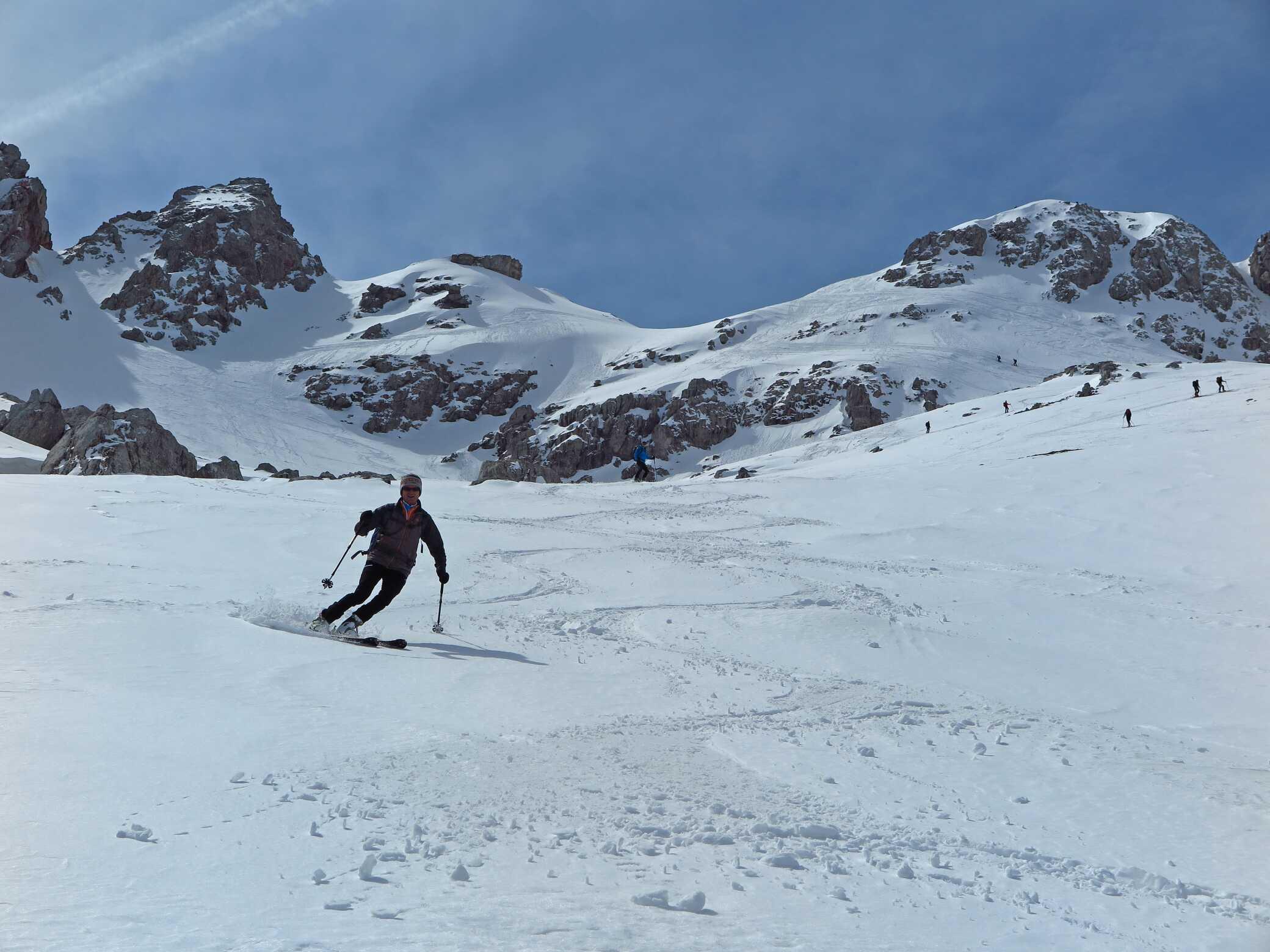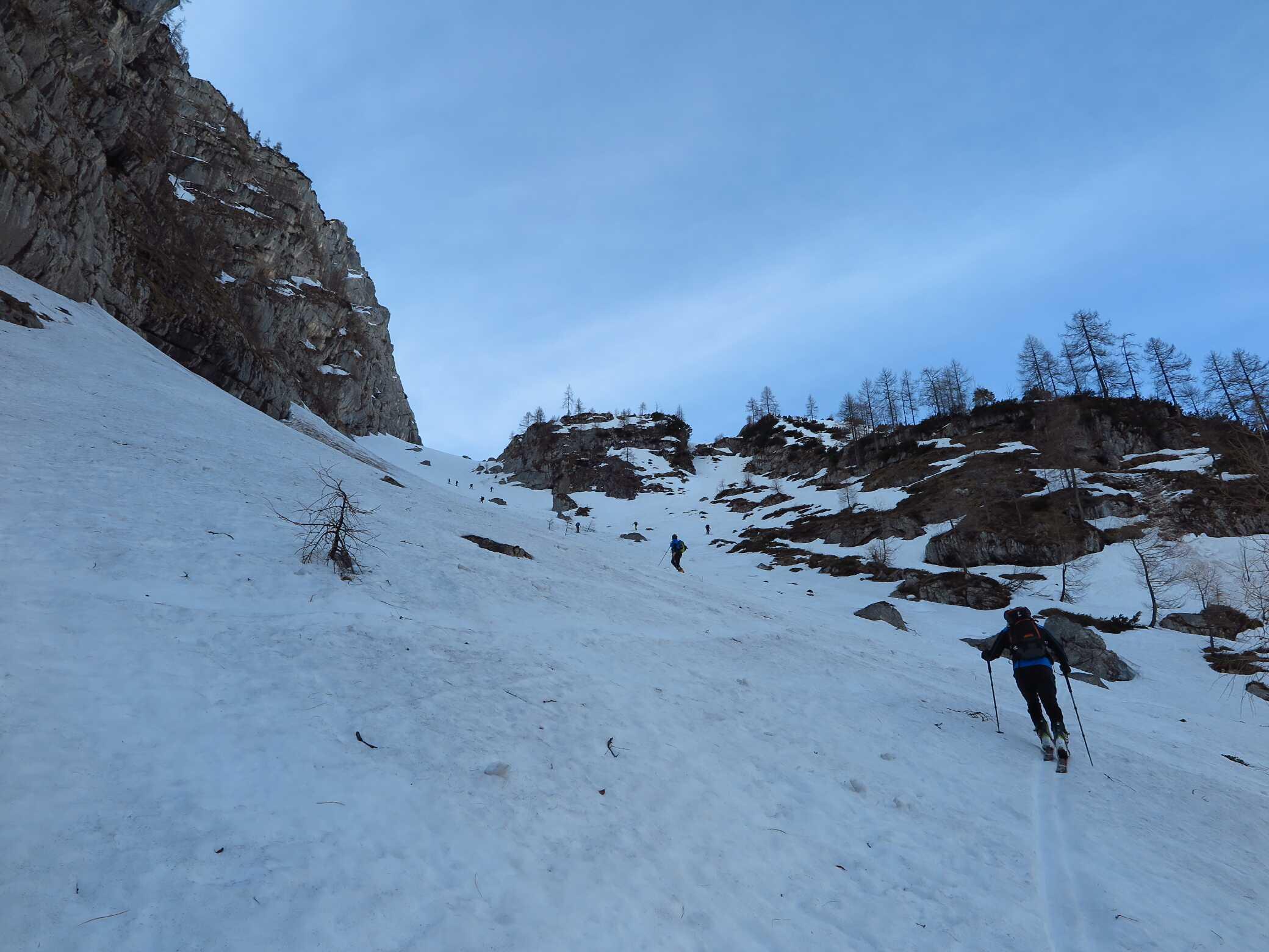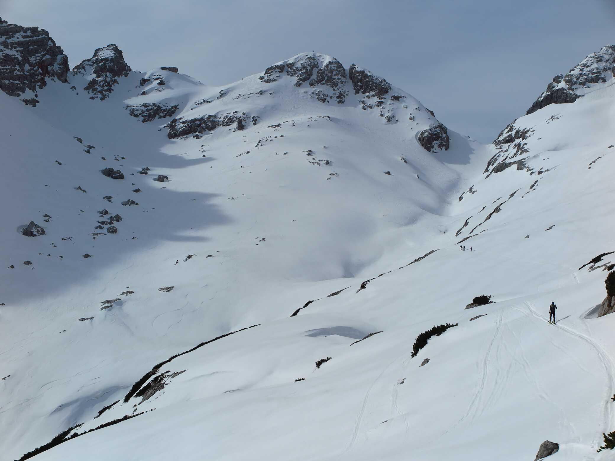 Schneelage: Bis ca. 1070m mussten die Ski getragen werden (ca. 40min), dann gings auf sehr gut angelegter Spur hinauf. Harscheisen waren nirgends nötig. Oberhalb ca. 1800m hatte es am Donnerstag einige cm Neuschnee gegeben, der gut mit der Unterlage verbunden ist. Abfahrt war recht gut, der Neuschnee oben war allerdings recht pappig und bremste stark; je weiter man nach unten kam, desto besser war der Firn.