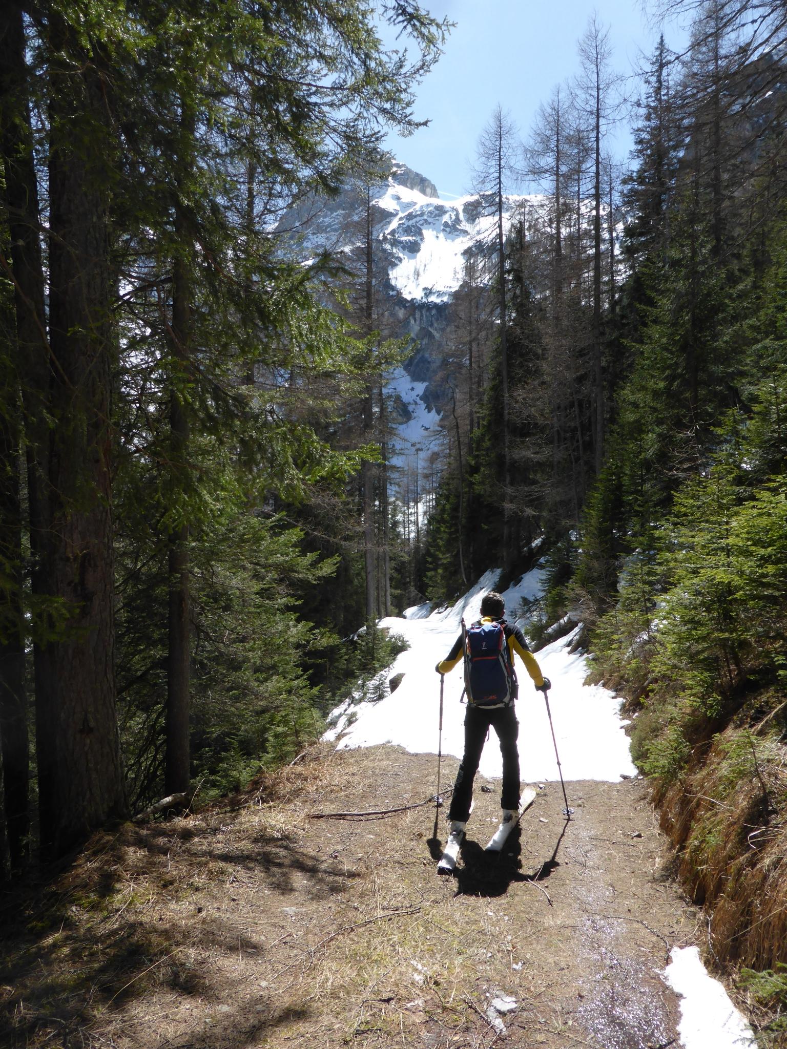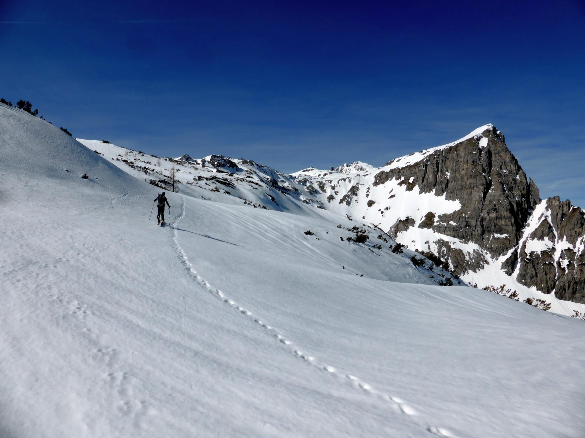 Allgemeine Verhältnisse, Schnee: Schnee bis zur Waldgrenze grundloser Sumpf mit dünner Kruste, dann tragfähig, im Schatten hart gefroren, im oberen Teil sogar noch etwas pulvrig. Gipfelanstieg durch den sogenannten „Kamin“ problemlos, Drahtseile etwa zur Hälfte freiliegend, alte zugewehte Spuren, harter Schnee, sicherheitshalber mit Pickel und Steigeisen, wäre zur Not auch ohne gegangen. Abfahrt bis zur Waldgrenze hart griffig bzw. leicht aufgefirnt, danach etwa 10 cm Einsinktiefe, in der Latschenzone tief, aber nicht so schlimm, wie beim Aufstieg zu befürchten war. Kurze Unterbrechungen im unteren Teil am Weg, Abfahrt gerade noch bis zum Parkplatz beim Schranken möglich.