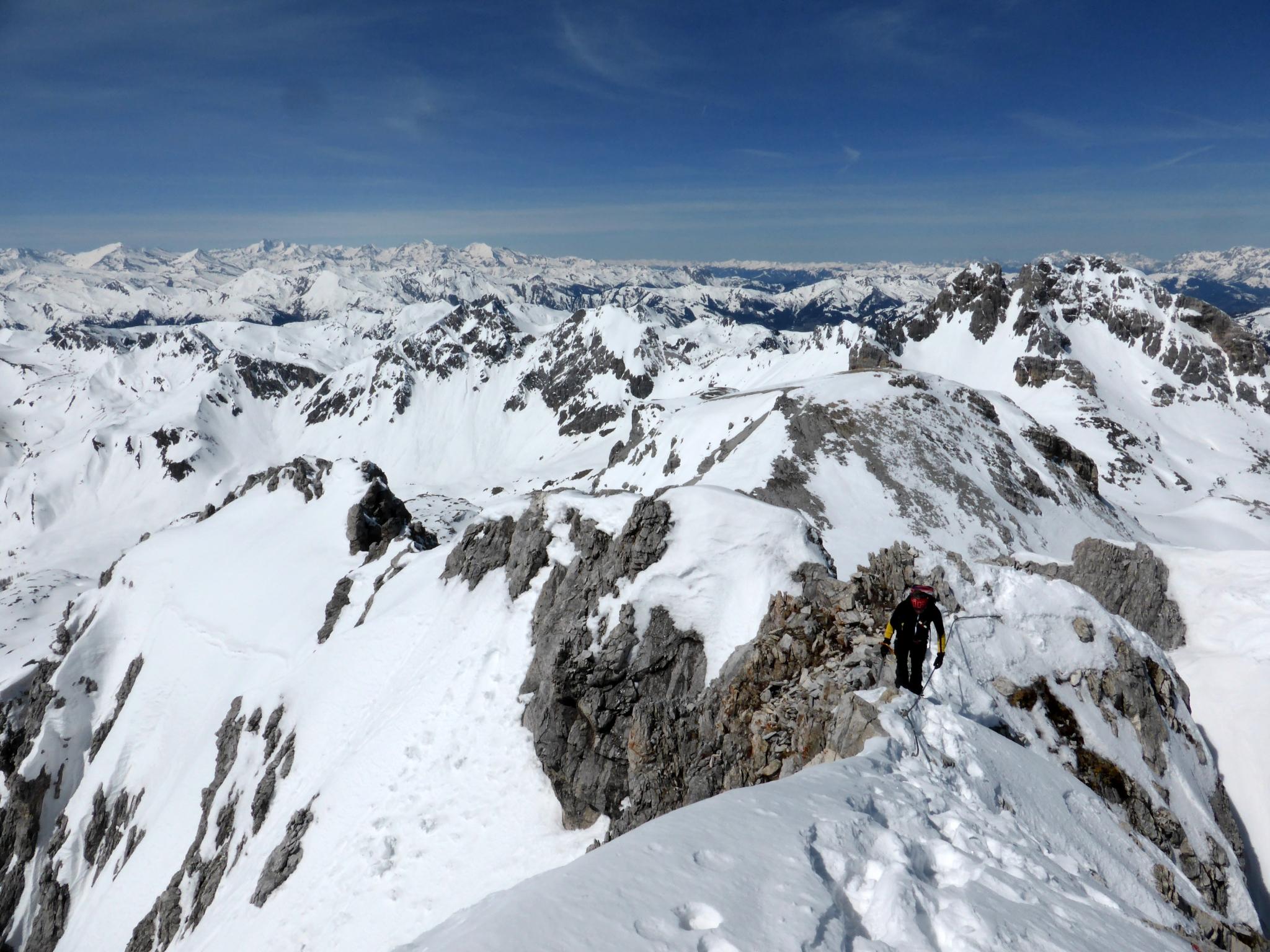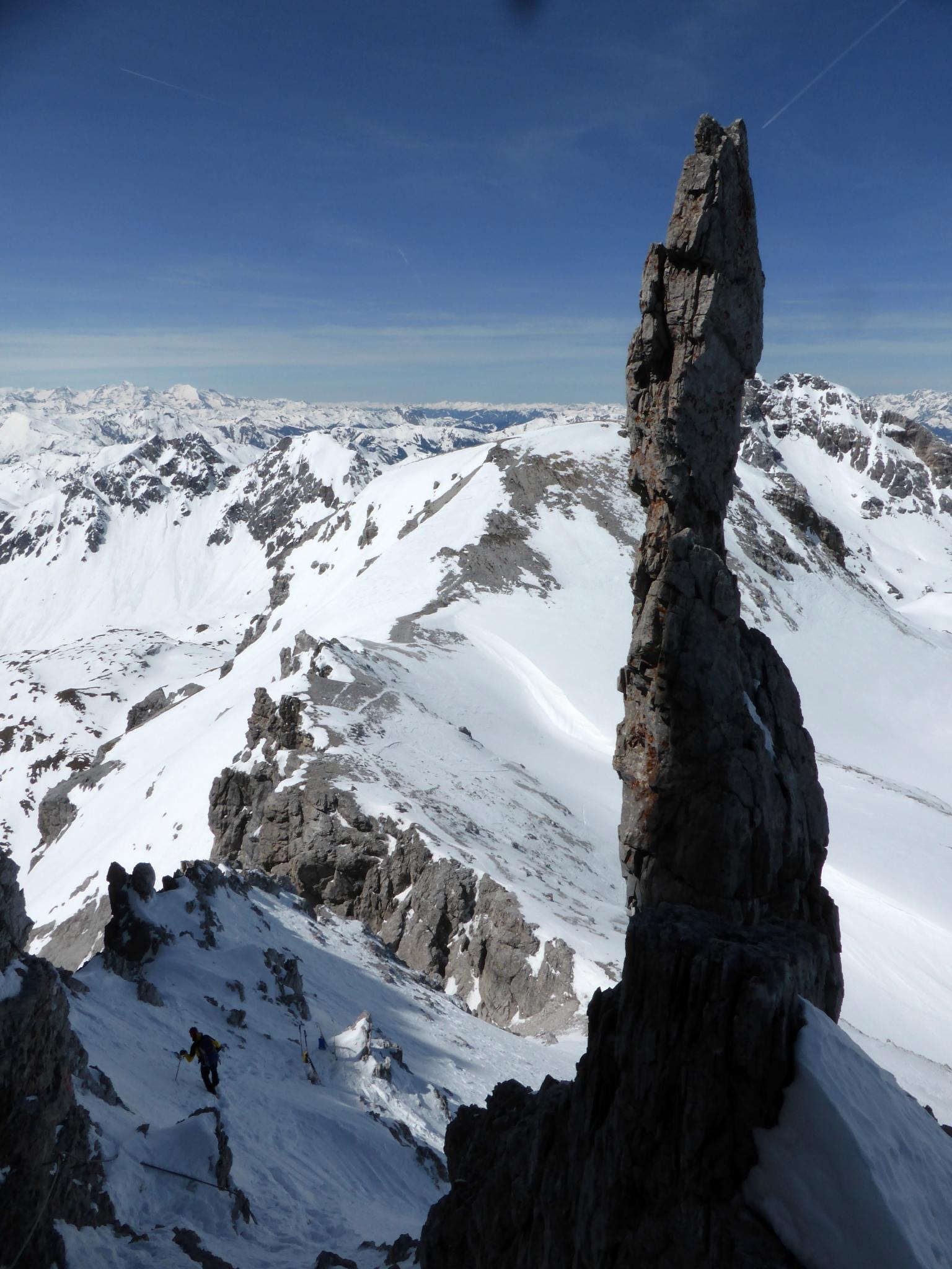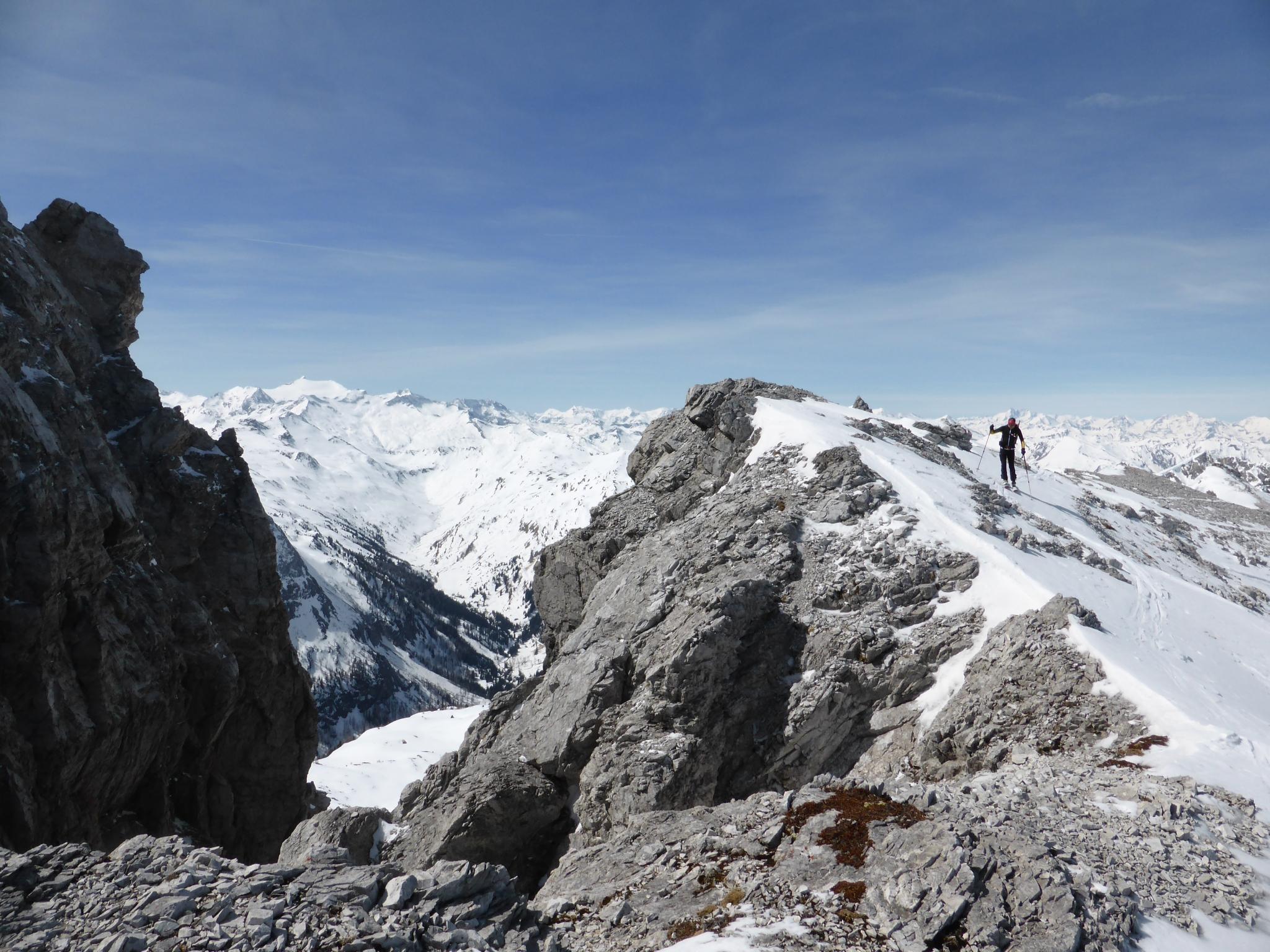 Wetter: Heiter mit hohen Schleierwolken, im Gasthofkar zeitweise scharfer, eher frischer Wind, schattseitig beim Aufstieg im „Kamin“ zum Gipfel kalt, bei der Abfahrt frühlingshaft warm