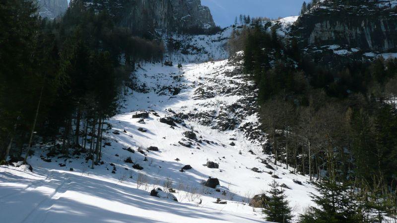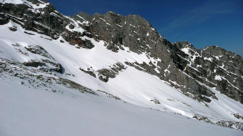 Da einerseits bereits zwei Vorspurer über die Wies aufgestiegen sind und andererseits die Tennengebirgsüberquerer noch nicht über die Schwer herunter gefahren sind, wählte ich also die Wies als Aufstiegsroute. Etwa auf Höhe 1600 m sah man bereits einige abgegangene mittelgrosse Schneerutsche, welche von der Schwerwand abgegangen sind. Ab etwa dieser Höhe konnte man auch beliebig eine eigene Spur setzen, da der Schnee hier deutlich gesetzter war als im unteren Teil.