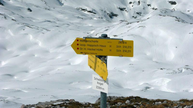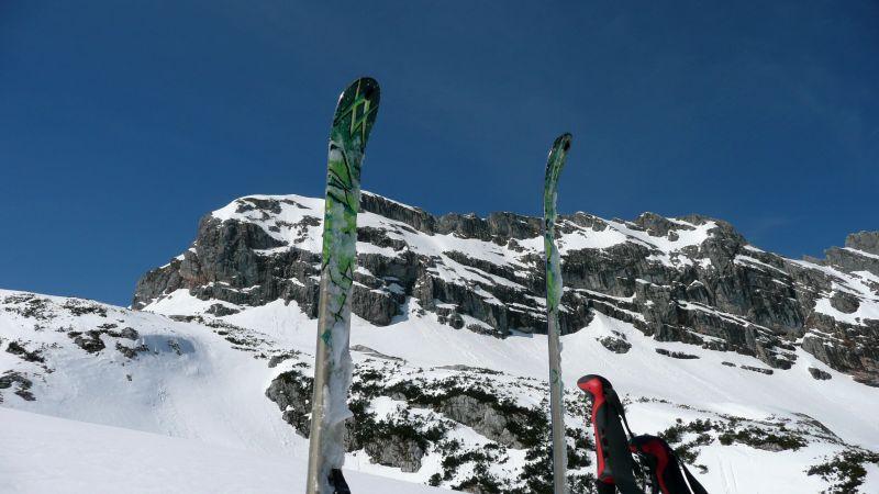 Da fällt mir spontan der Scheiblingkogel im Tennengebirge mit Ausgangspunkt Oberscheffau und Varianten Schwer oder Wies ein. Also schnell den Rucksack gepackt, in die Oberscheffau gefahren zum Parkplatz vor dem Schranken, Ski geschnappt und losgegangen. Bei der Forststrasse kurz unterhalb der Rossberghütte kann man die Ski anschnallen und dann stehe ich schon vor der Entscheidung: Schwer oder Wies?