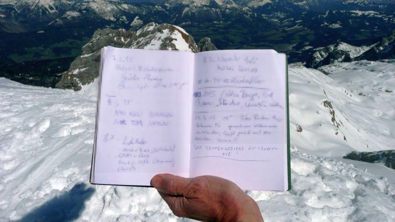 Oben am Gipfel angelangt wurde ich mit einer grandiosen Aussicht und dem wunderschönen Gipfelkreuz belohnt. Einem Eintrag im Gipfelbuch von einem gewissen (mir bekannten) Herrn P.P. vom 13.03 entnahm ich: "Das Tennengebirge enttäuscht nie!" Dem ist nichts hinzuzufügen.