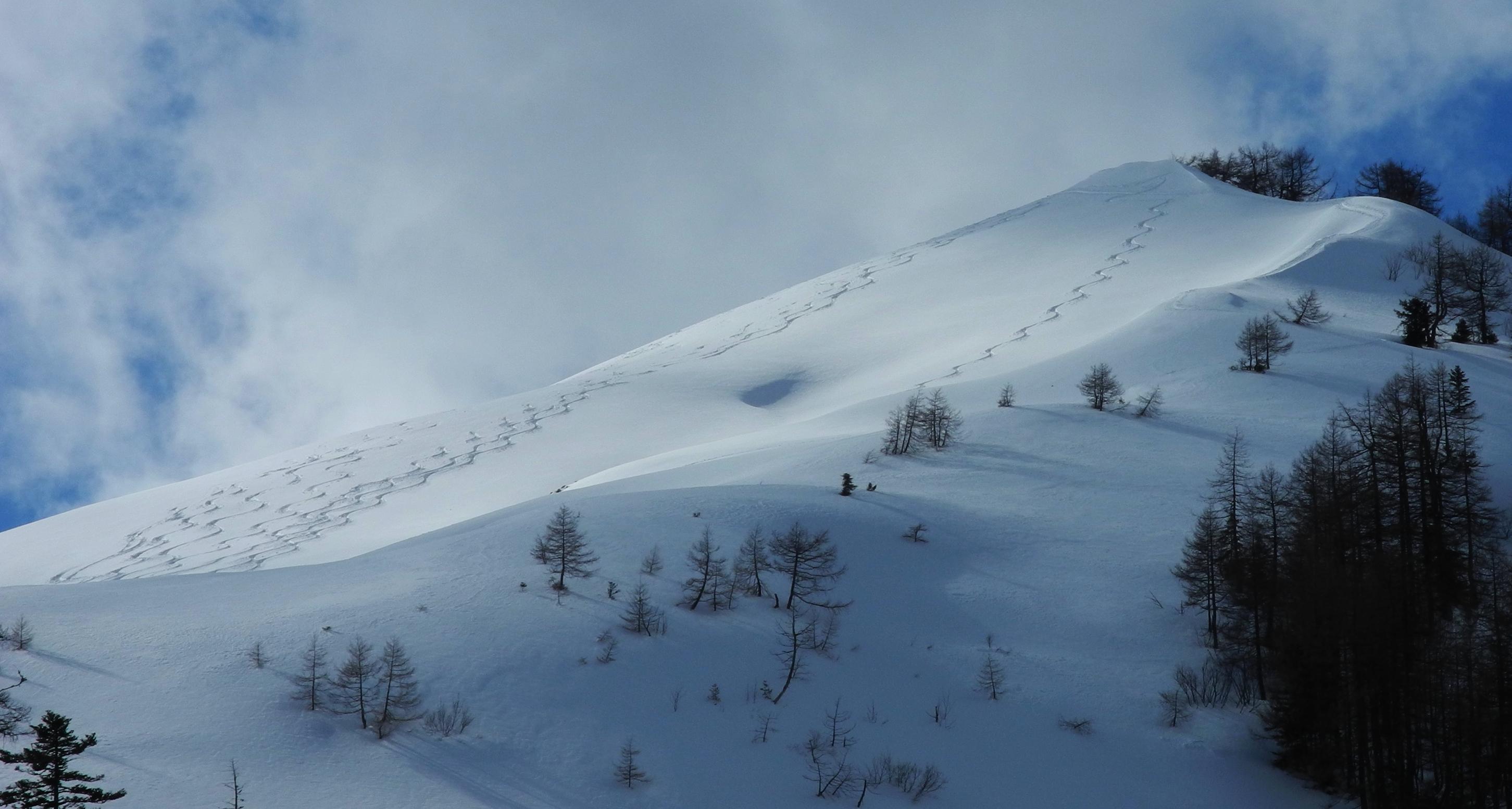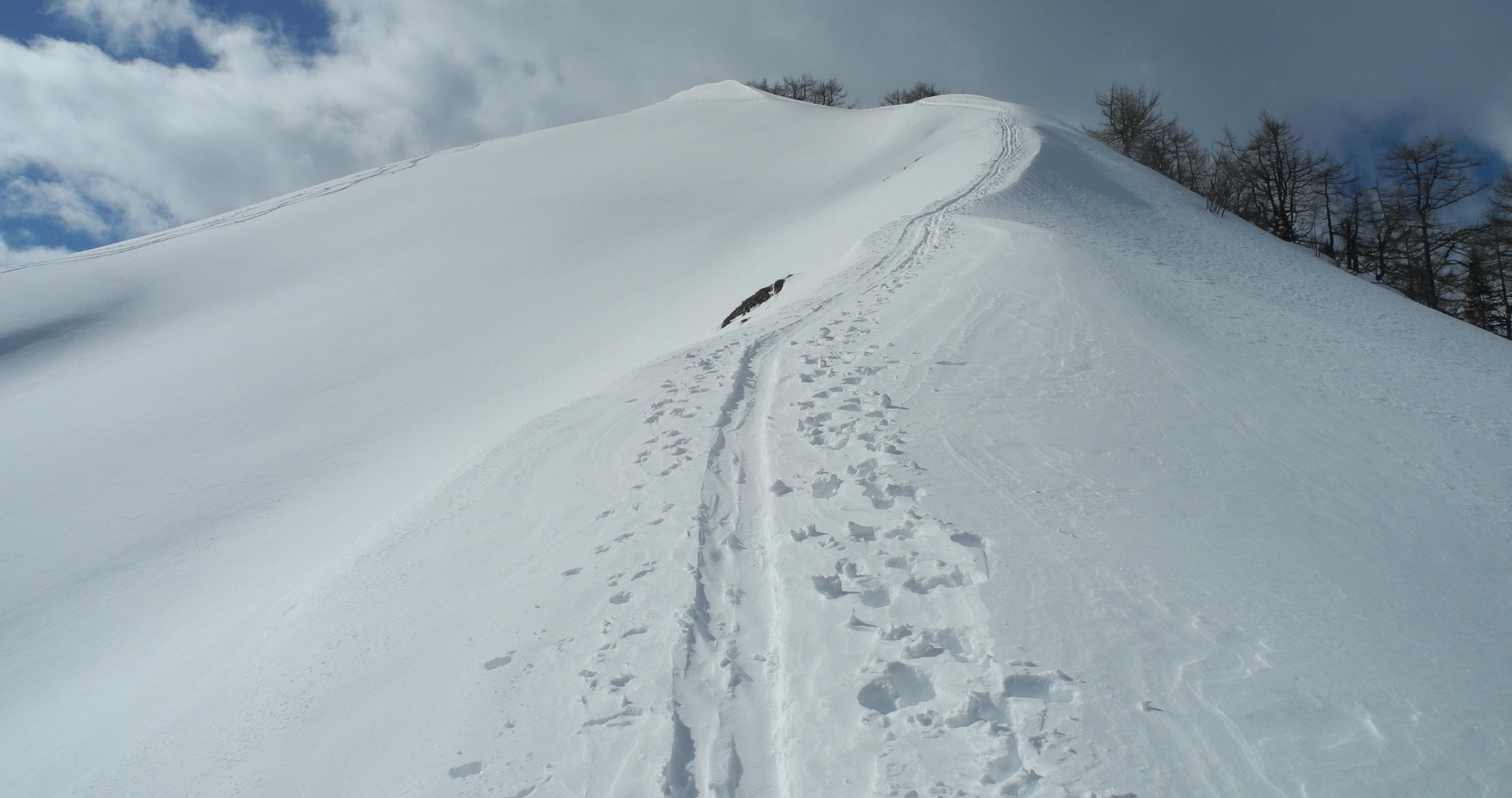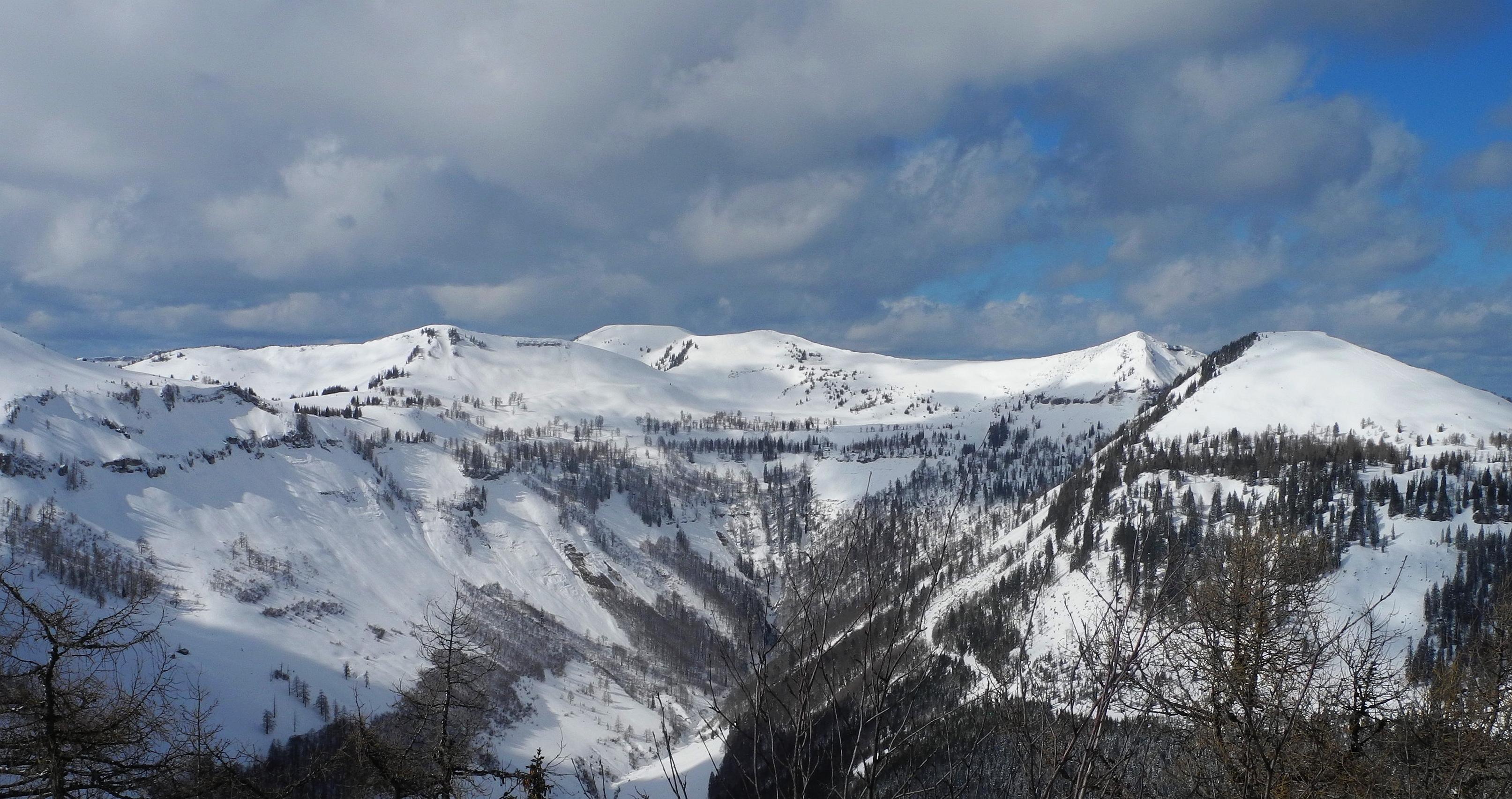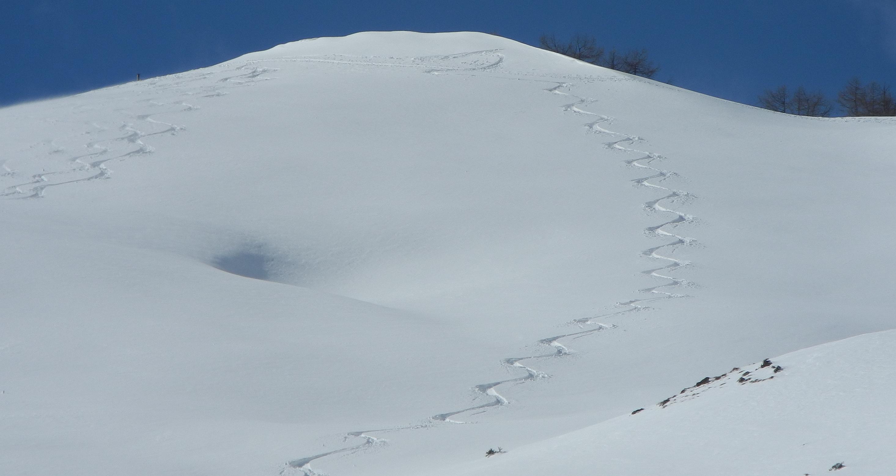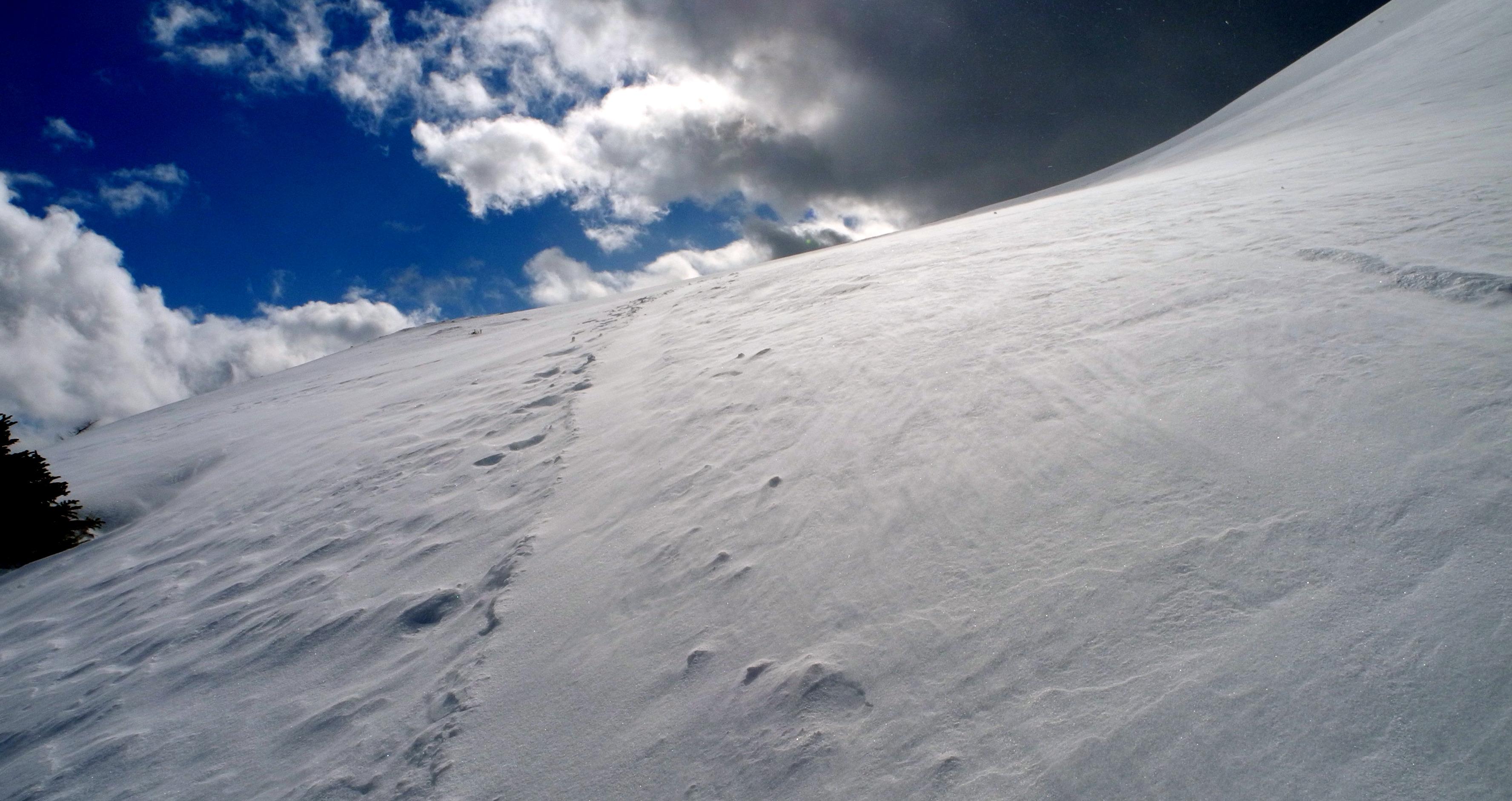 Gefahrenstufe 3 - viel Wind - wohin? Am Labenberg müsste man doch im Windschatten Pulverschnee vorfinden! Die Überlegung war richtig. So war es lohnend den Gipfelhang gleich zweimal hinaufzugehen.