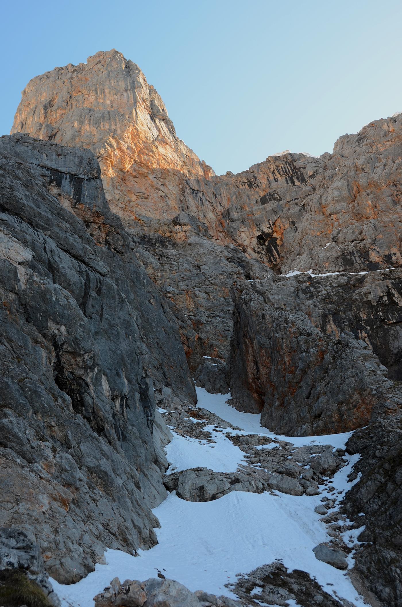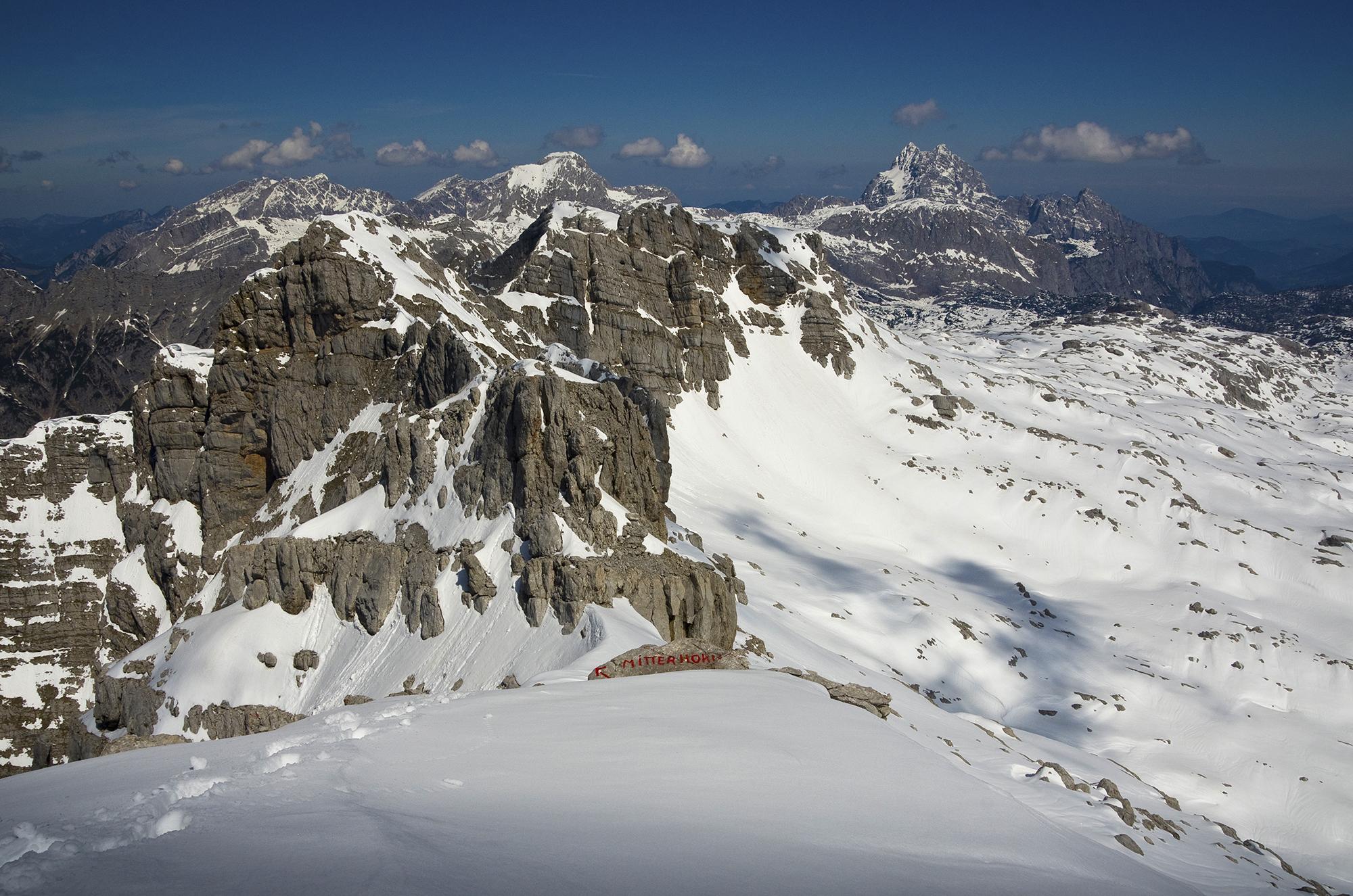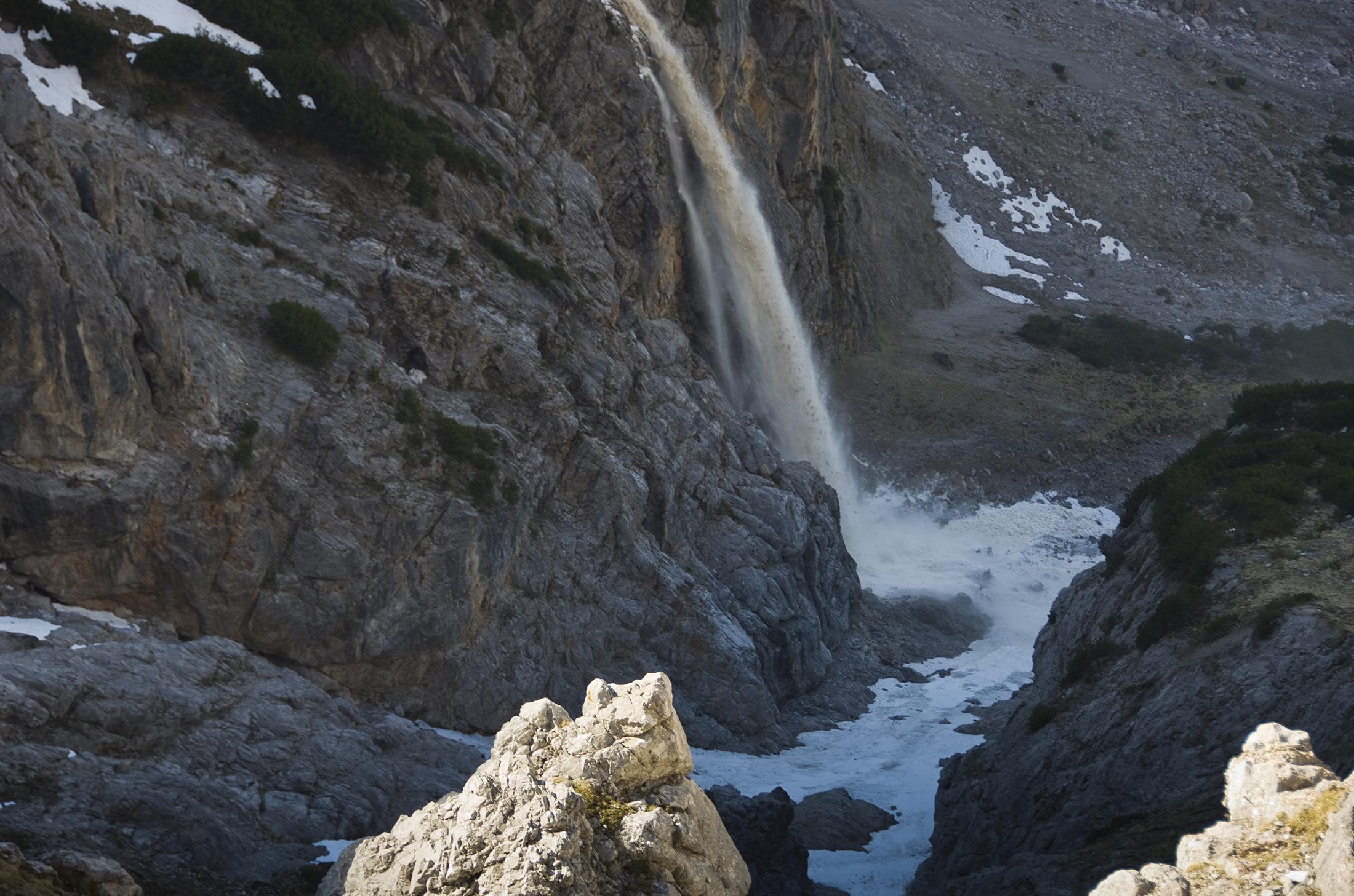 Morgens um 9: Aus der SCHATTIGEN nahezu SCHNEELOSEN Nordwestseite vom Wurmkopf rauscht, nein, donnert (wegen des Echos in der Sommersteinschlucht wirklich gruselig!) eine ganze Minute lang eine Lawine hinunter. Man kann nicht einsehen, wo die vielen Schneemassen herkommen. Vielleicht war im Gipfelbereich eine Wechte abgebrochen?
