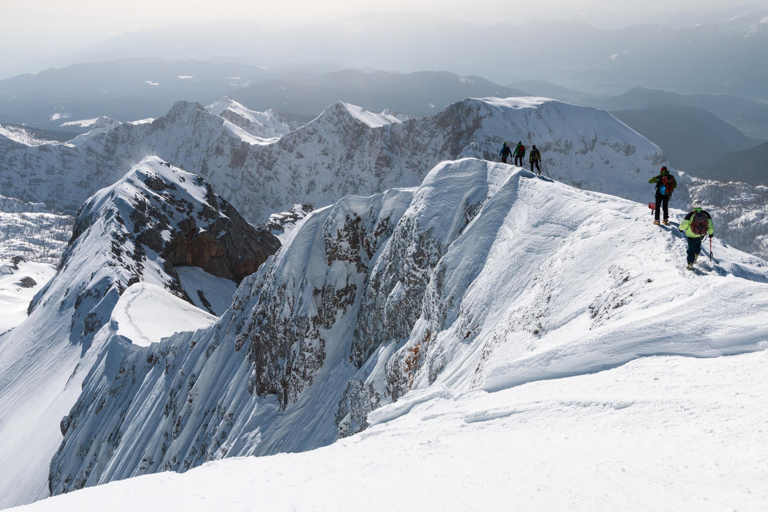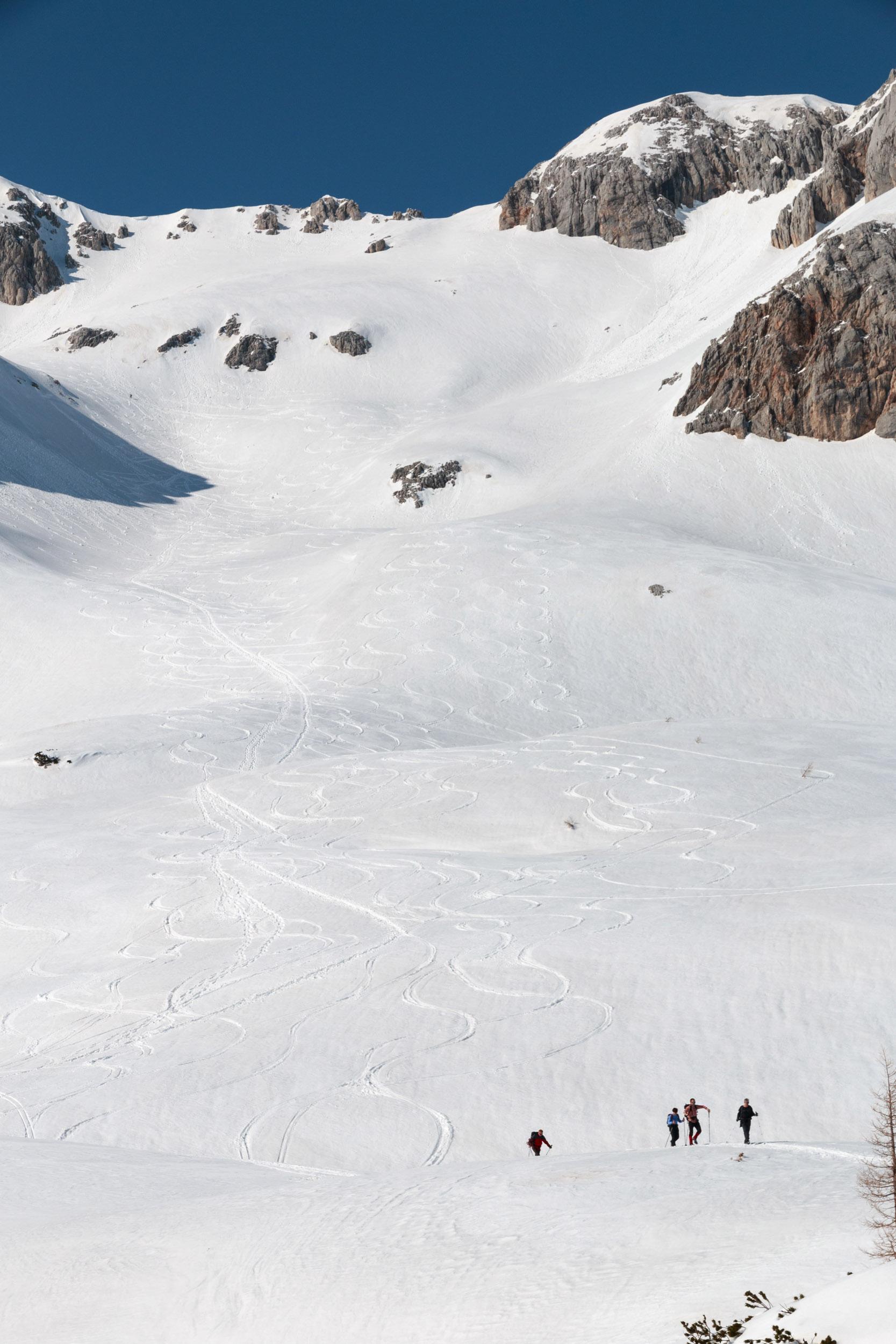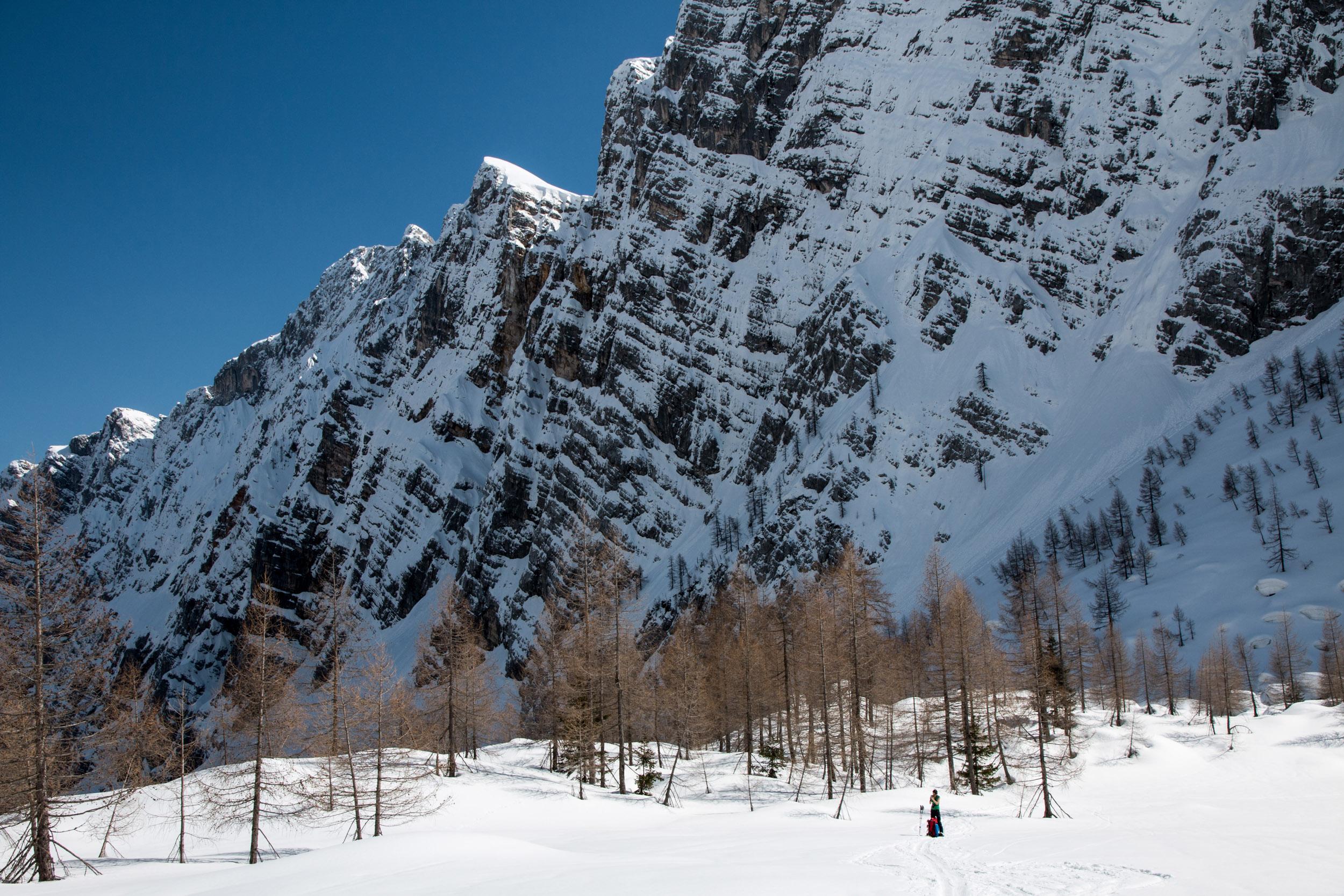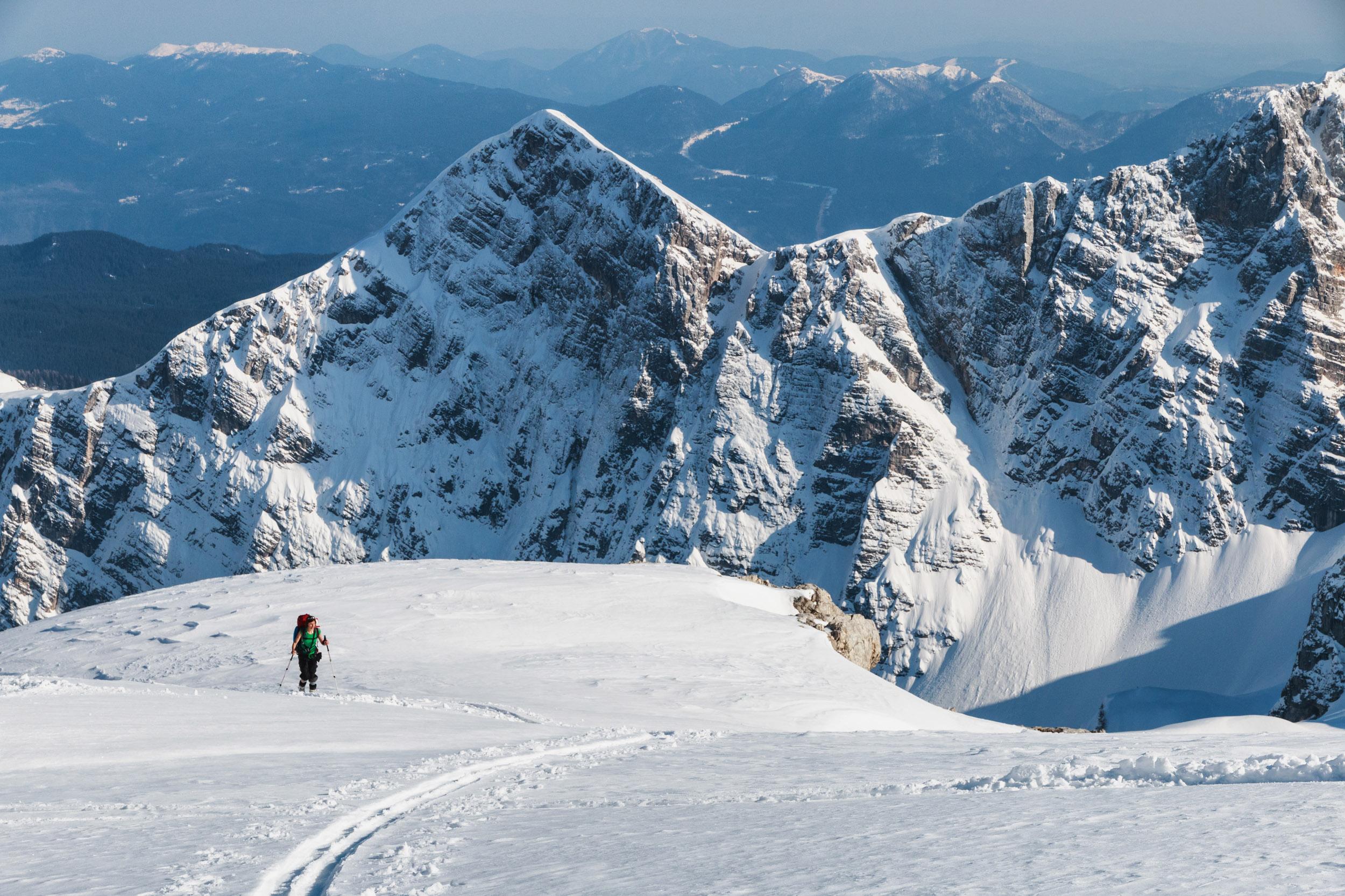 Etwas unheimlich der Aufstieg durch das schluchtartige Krma-Tal. Sonnseitig donnern die Lawinen über die Felsen, schattseitig hängen dicke Wechten in den Wänden. Und die Spur verläuft fast pausenlos über Lawinenkegel. Danach weitet sich das Gelände und man hat wunderbare Blicke in die wilden Julischen Alpen.