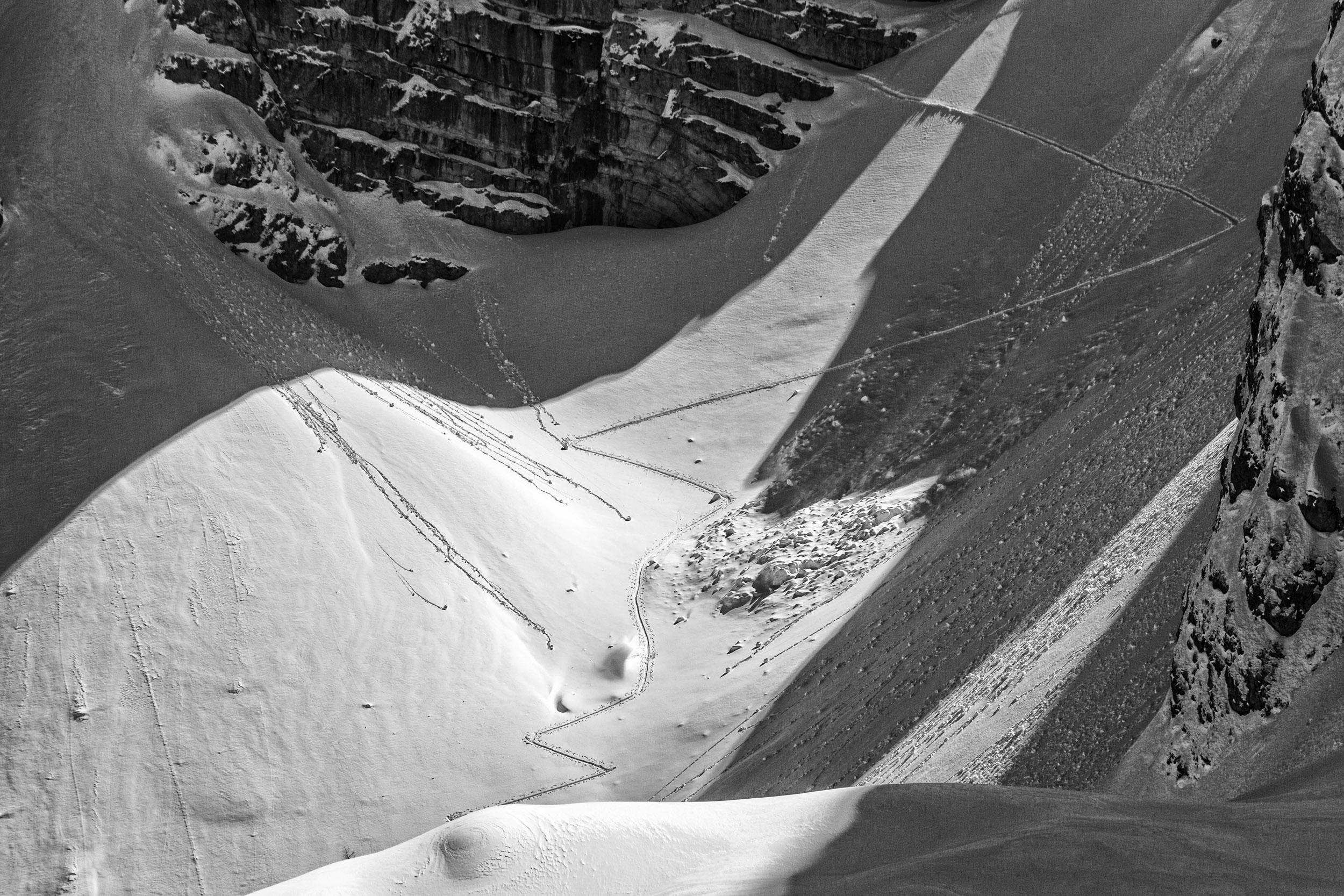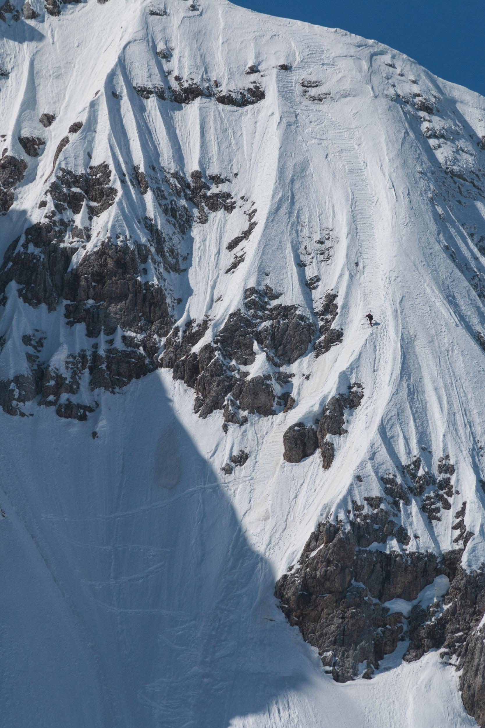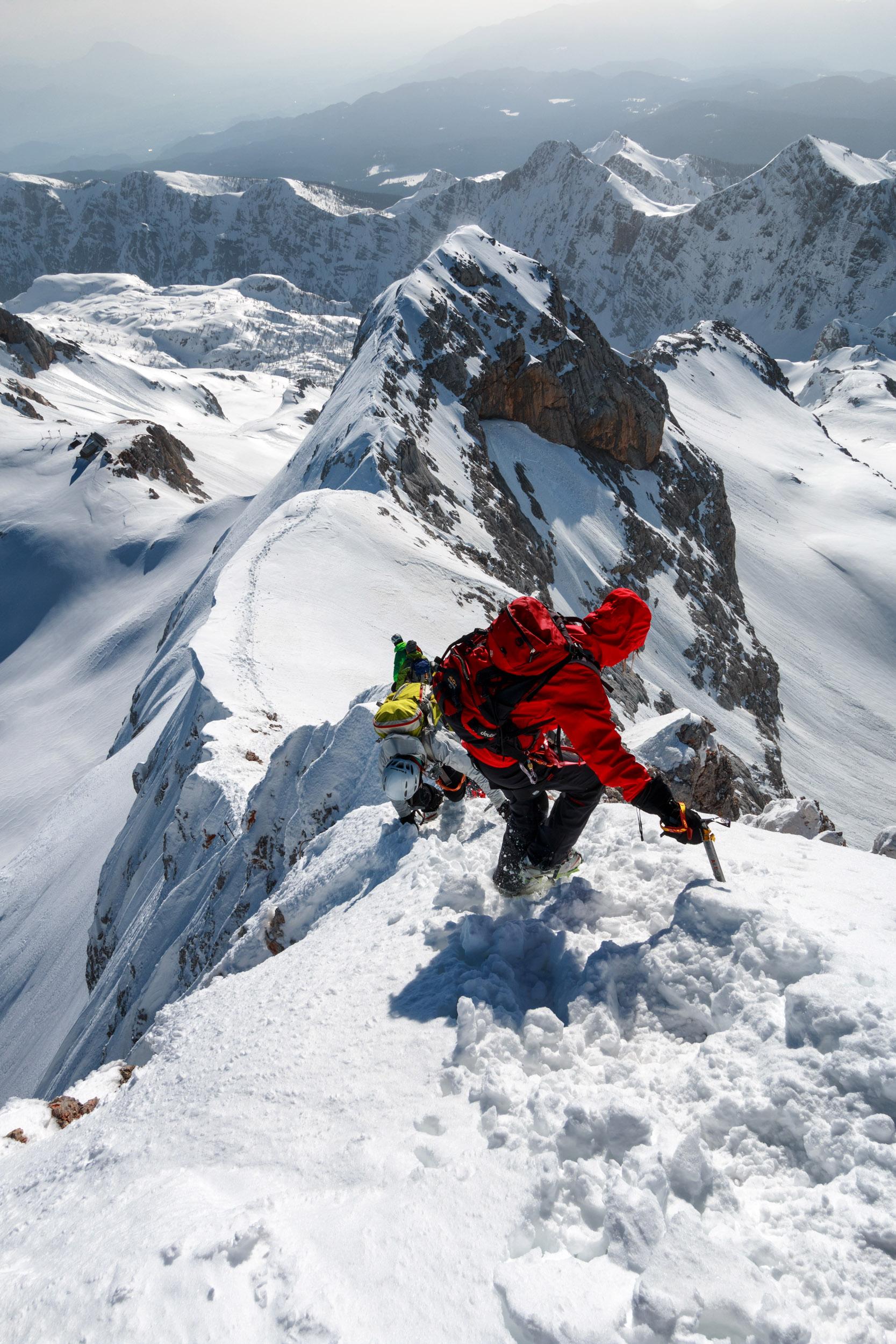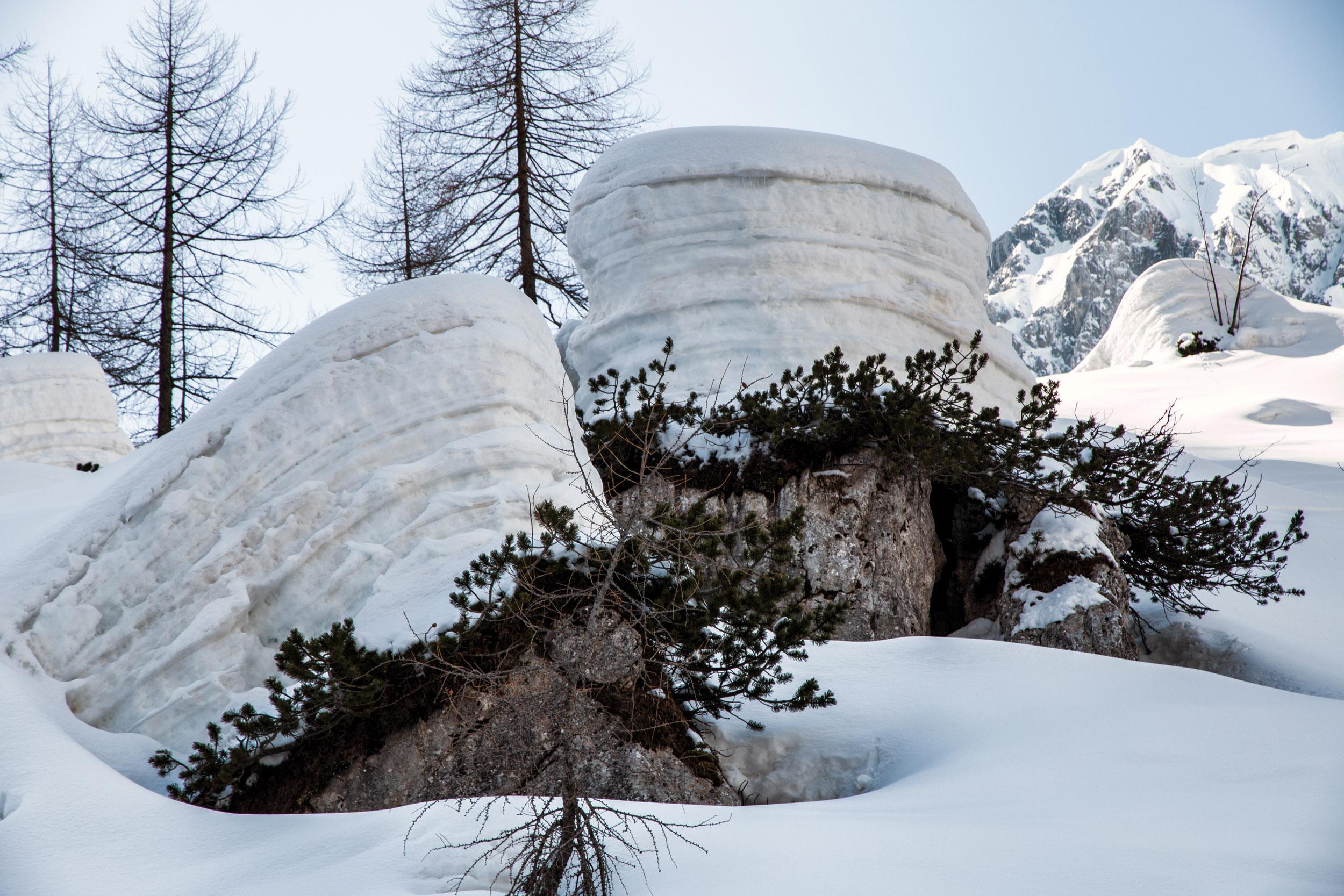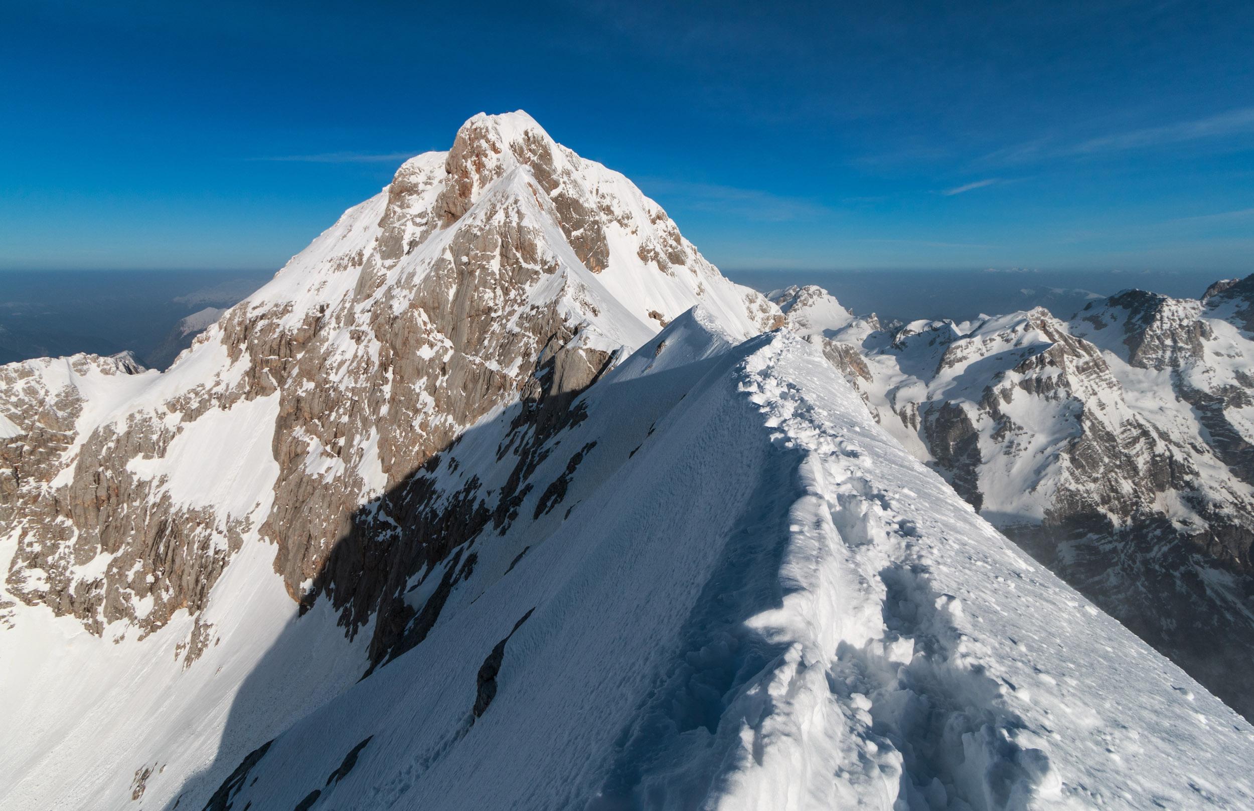 Etwas unheimlich der Aufstieg durch das schluchtartige Krma-Tal. Sonnseitig donnern die Lawinen über die Felsen, schattseitig hängen dicke Wechten in den Wänden. Und die Spur verläuft fast pausenlos über Lawinenkegel. Danach weitet sich das Gelände und man hat wunderbare Blicke in die wilden Julischen Alpen.