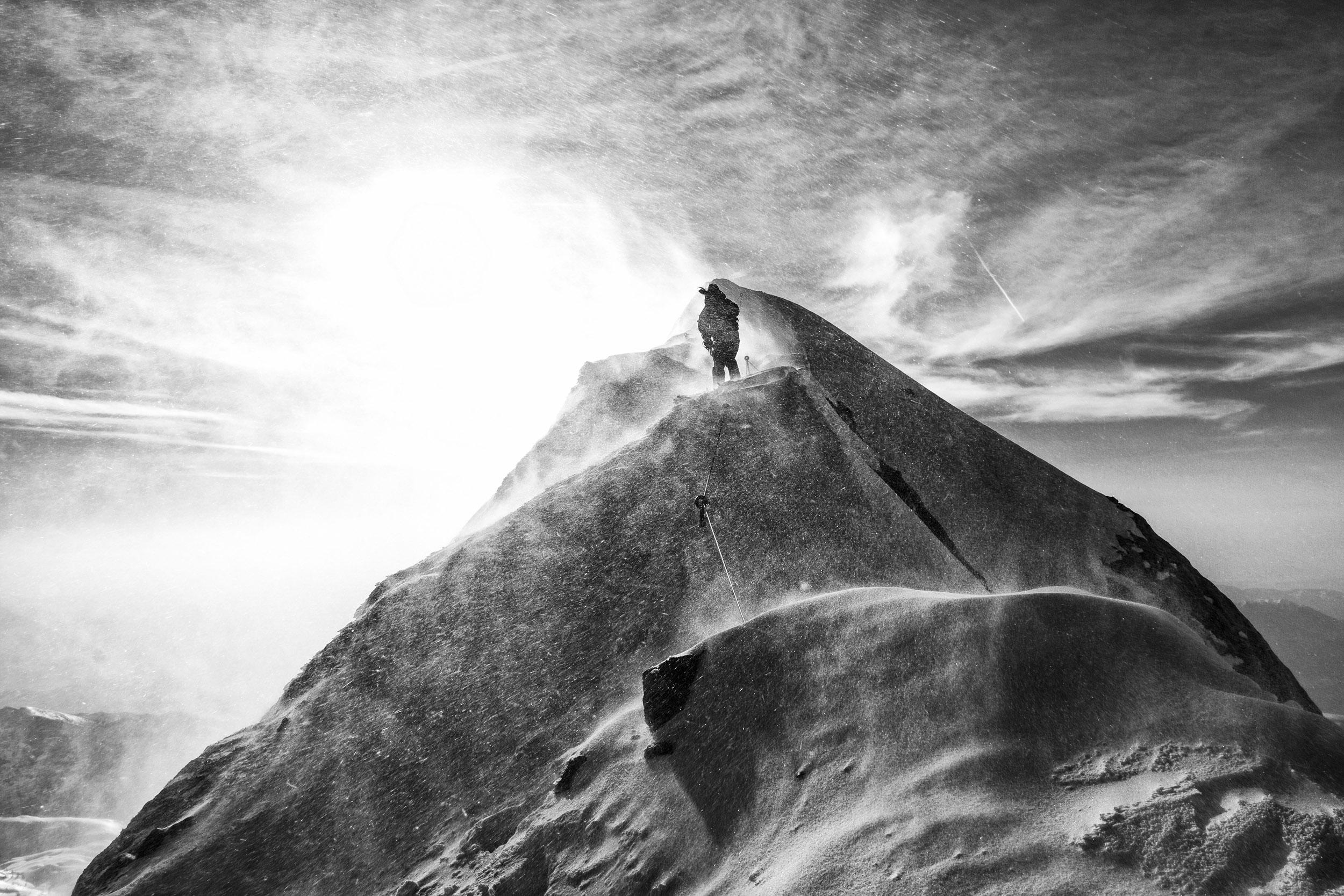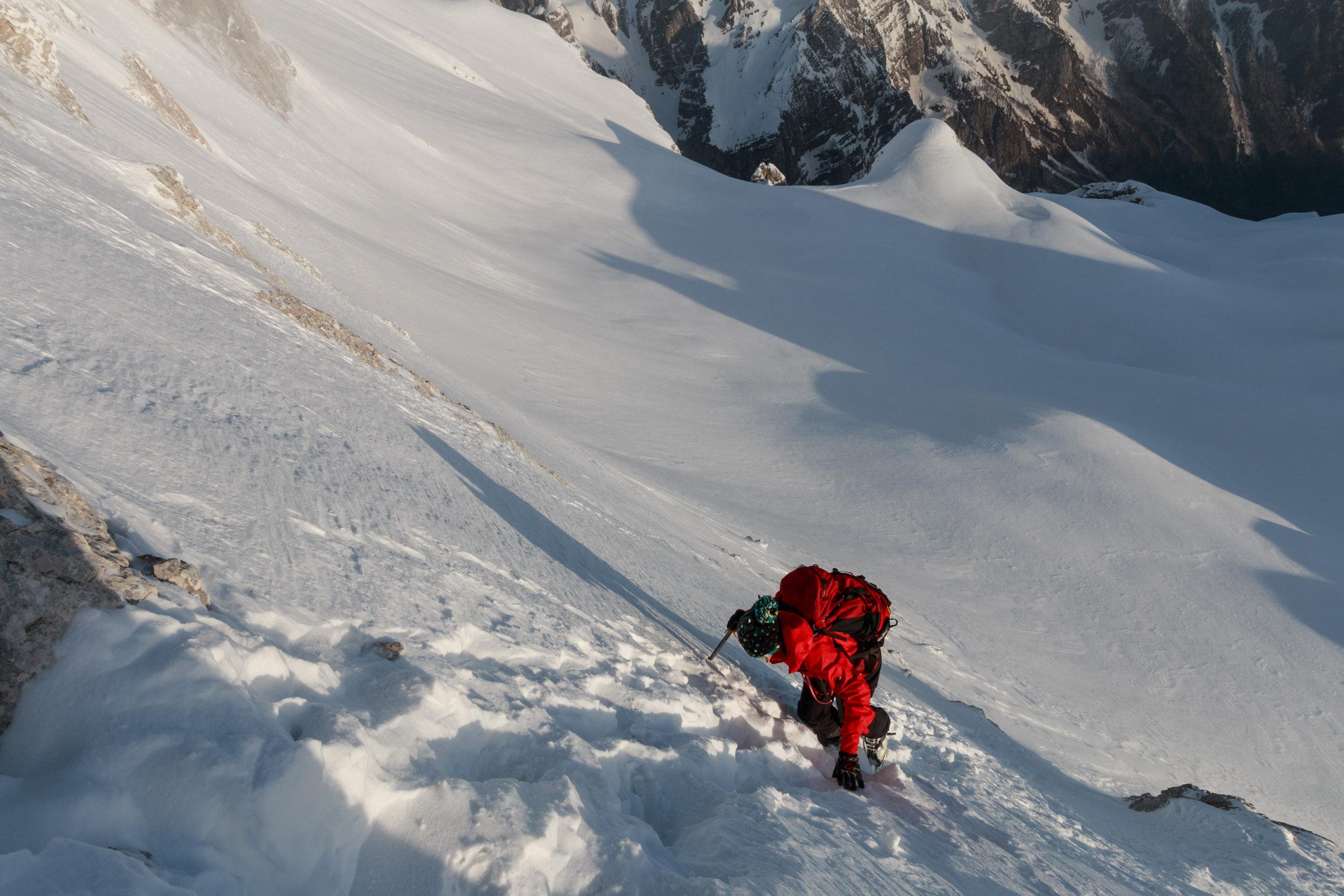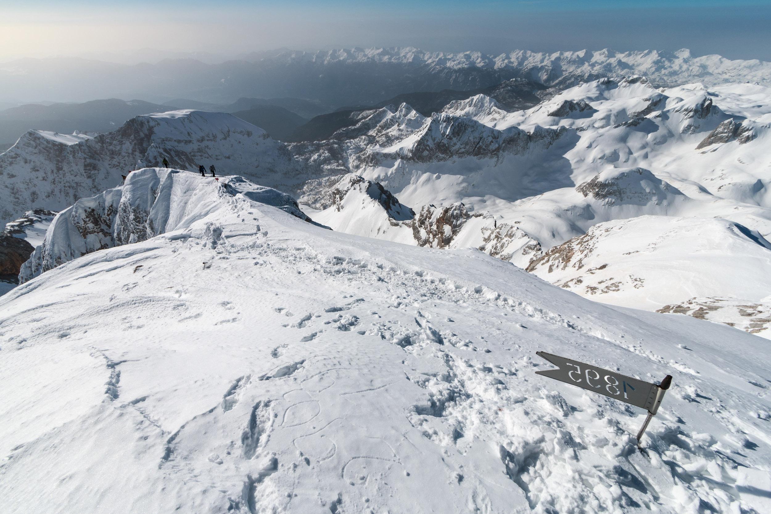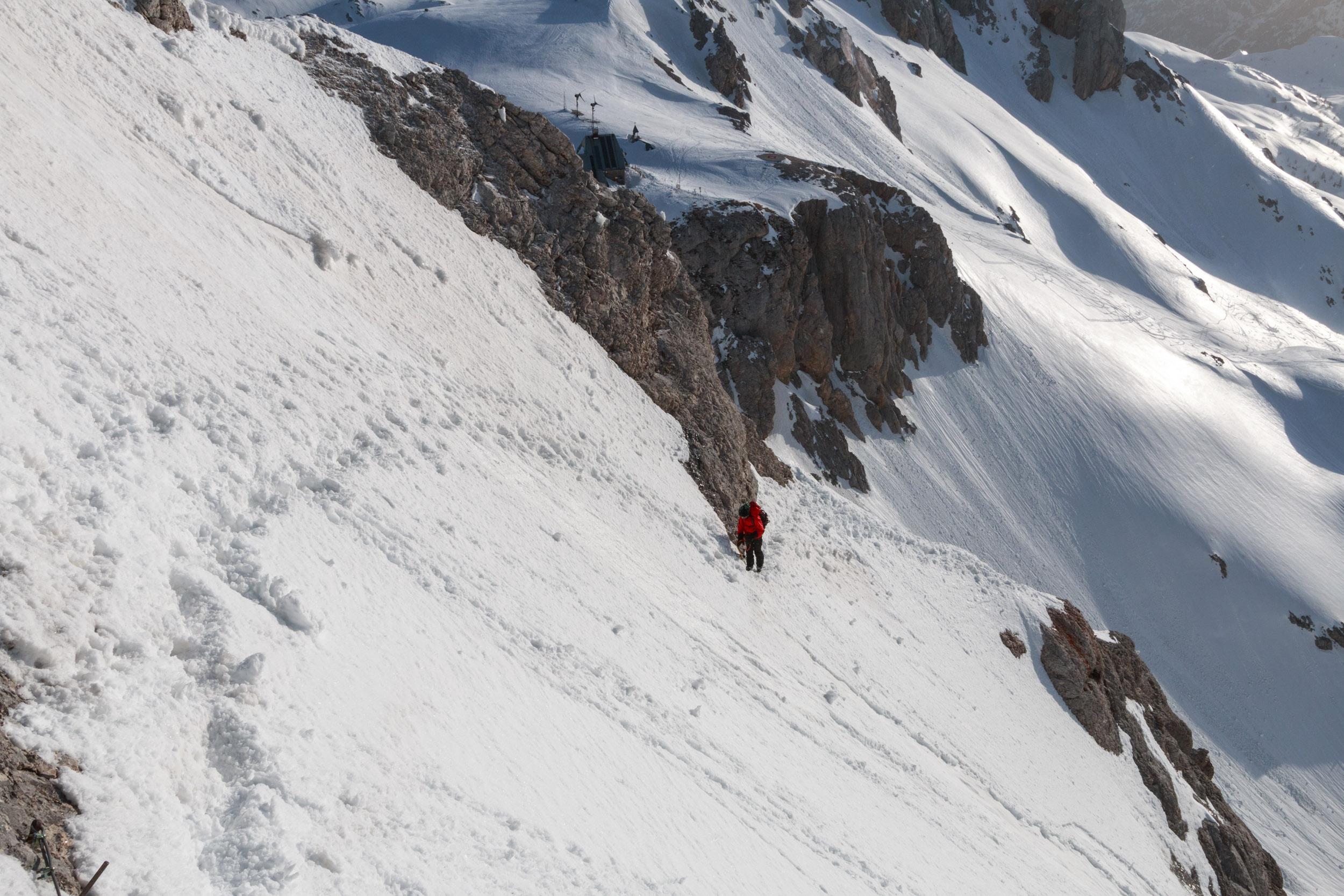 Am Sonntag in der Früh sind wir dann mit Steigeisen und Pickel auf den Gipfel. Die Spur war noch nicht sehr ausgeprägt aufgrund der Schneefälle in der Woche davor. Insgesamt ist die Gipfeletappe doch ziemlich anspruchsvoll (v.a. im Abstieg), mMn. deutlich mehr als zB. die auf den Großglockner. Der Gipfel selber ist im Moment mindestens 4m höher als normal! Von dem runden Türmchen schaut gerade mal die Fahne aus dem Schnee, und das ist noch gar nicht der höchste Punkt.