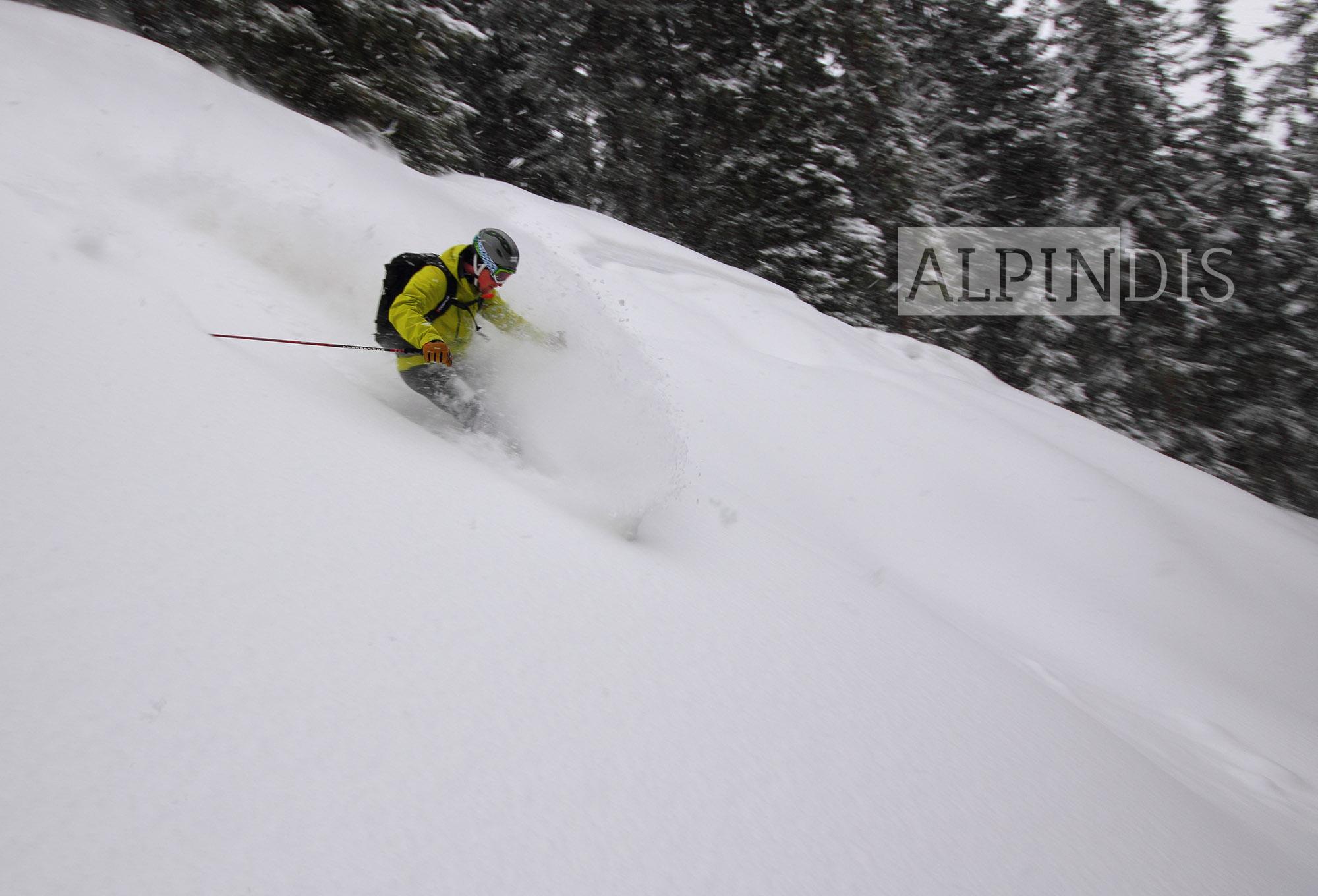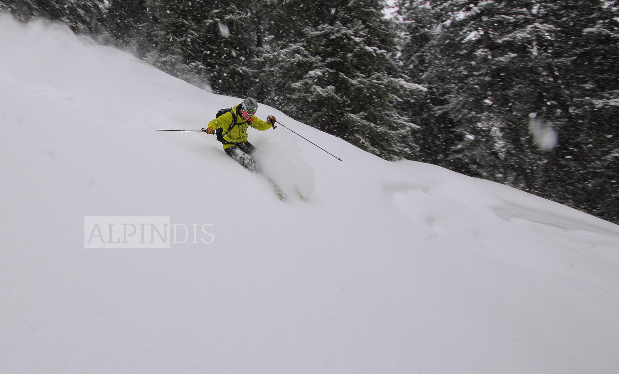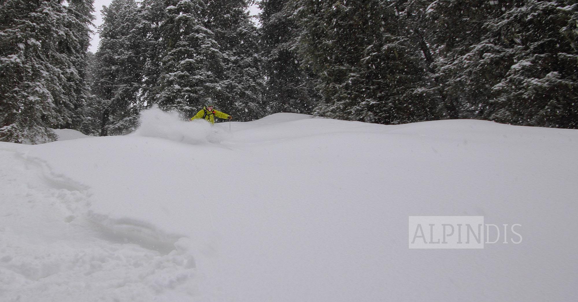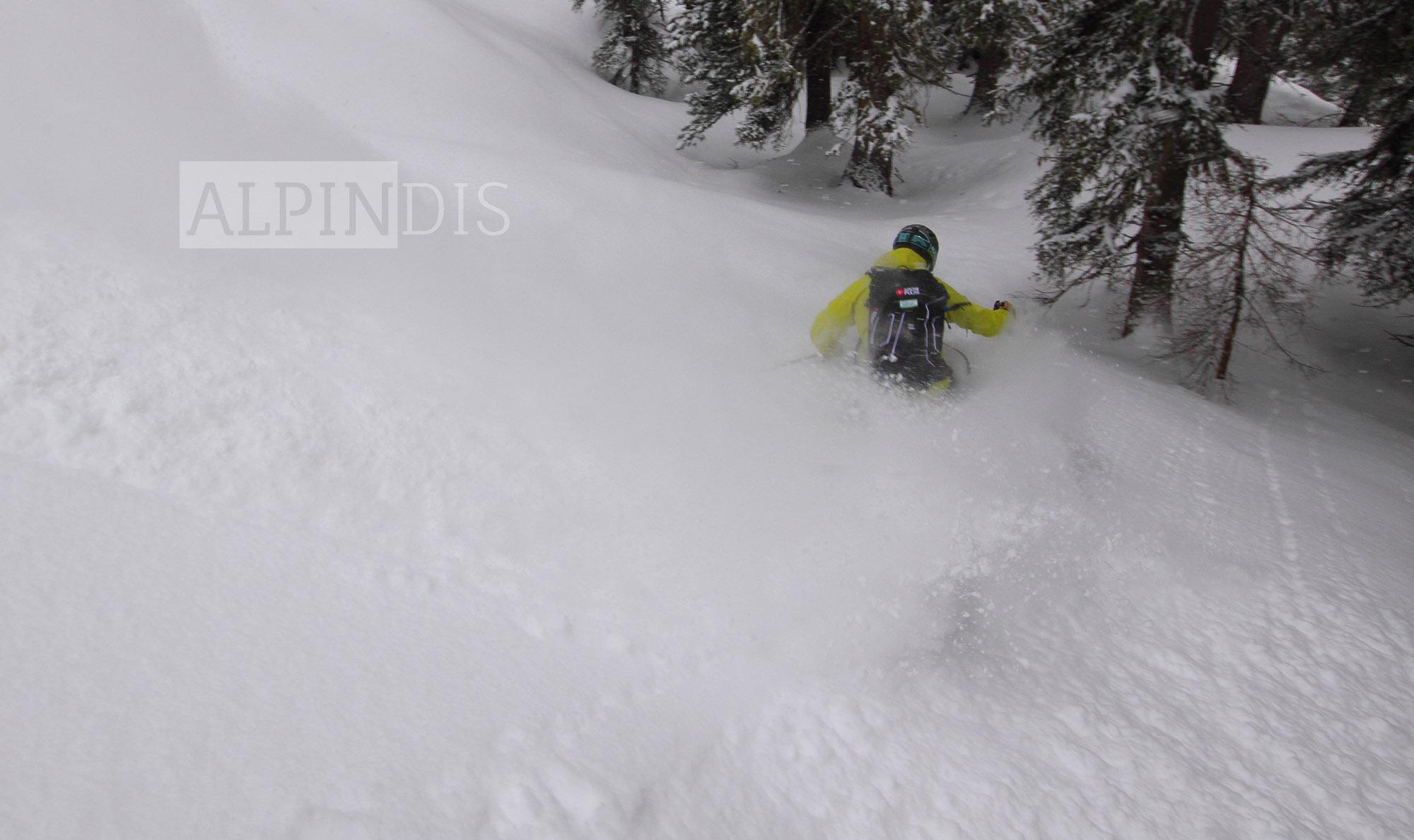 Kammfern günstige Verhältnisse, der Neuschnee liegt ungebunden auf der dieser dünnen Schmelzharschicht.