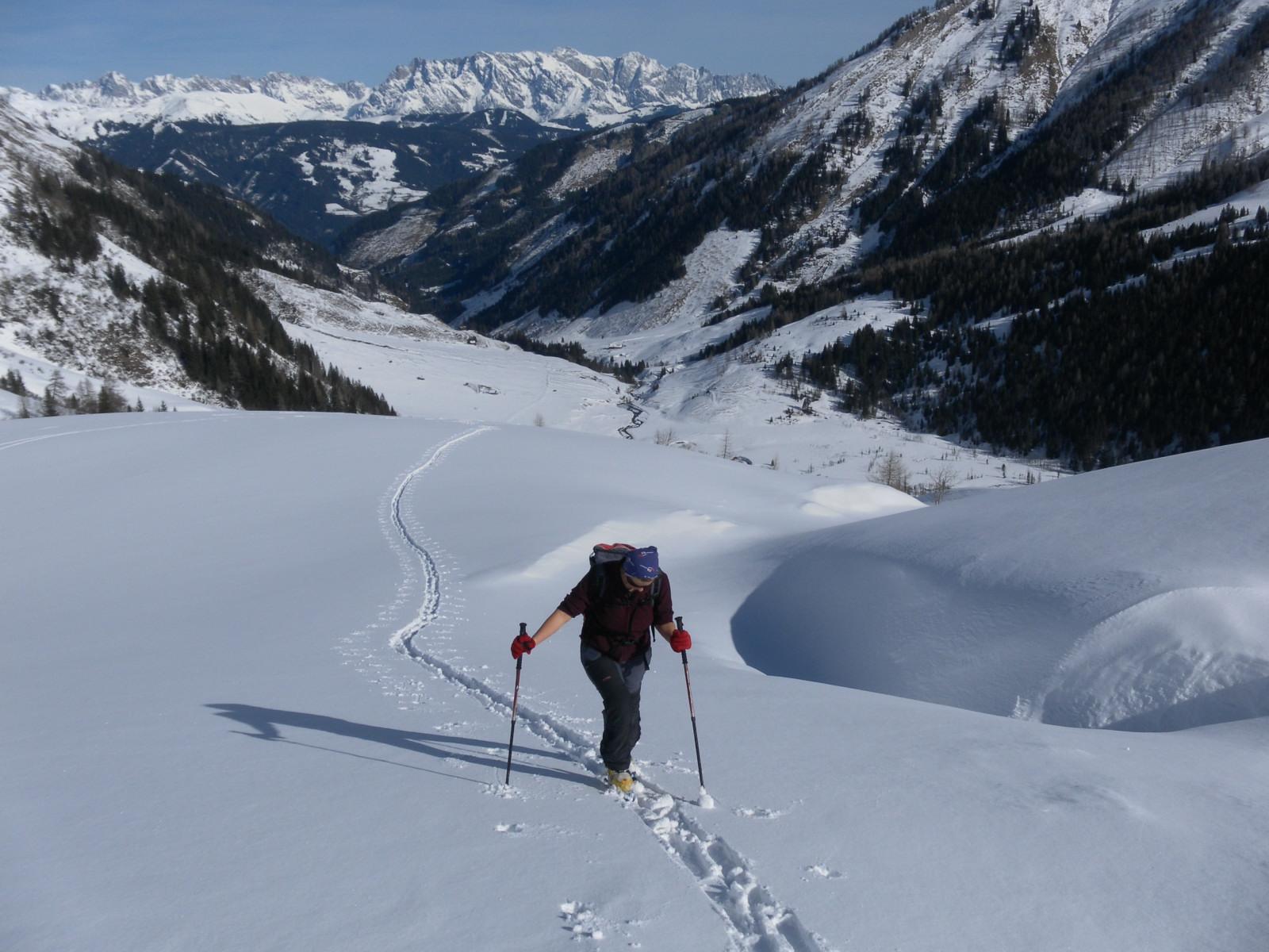 Die Schneedecke im Tal ist dürftig, der Forstweg gerade noch mit Ski begehbar. Wir zweigen zur Schreckalm ab und steigen über herrliches Skigelände auf leicht angefeuchtetem und gut gesetzten Pulver zum Nordgipfel der Tristenwand an. Erst im Kammbereich etwas Windeinfluss.