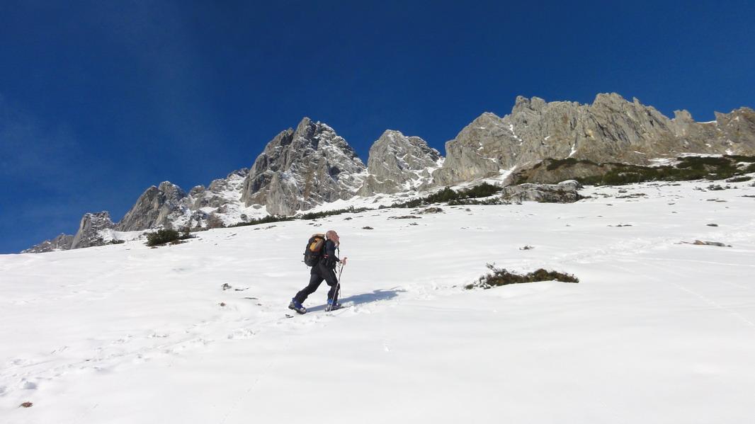Da der Latschengürtel noch komplett offen ist, empfiehlt sich eine vorherige Besichtigung der Latschengassen vom Hochkeil aus. In der Vierrinnenscharte liegt derzeit fast kein Schnee!