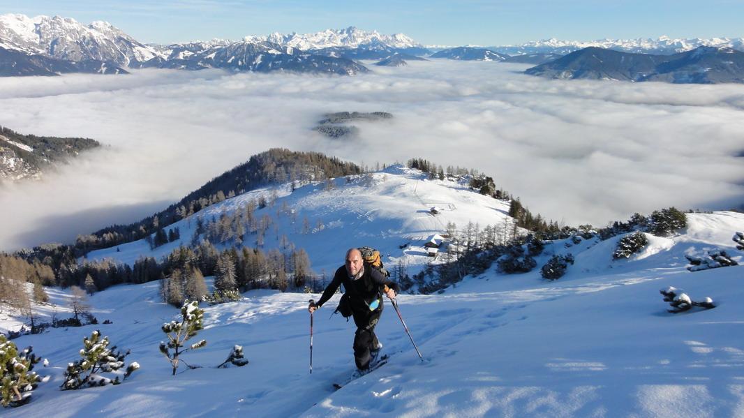 Auf einer dünnen, aber sehr kompakten Altschneedecke (zumindest in den Mulden) lagen südseitig 5 bis 15 cm Neuschnee. Ostseitig Richtung Höllntal wars ein bissl mehr.