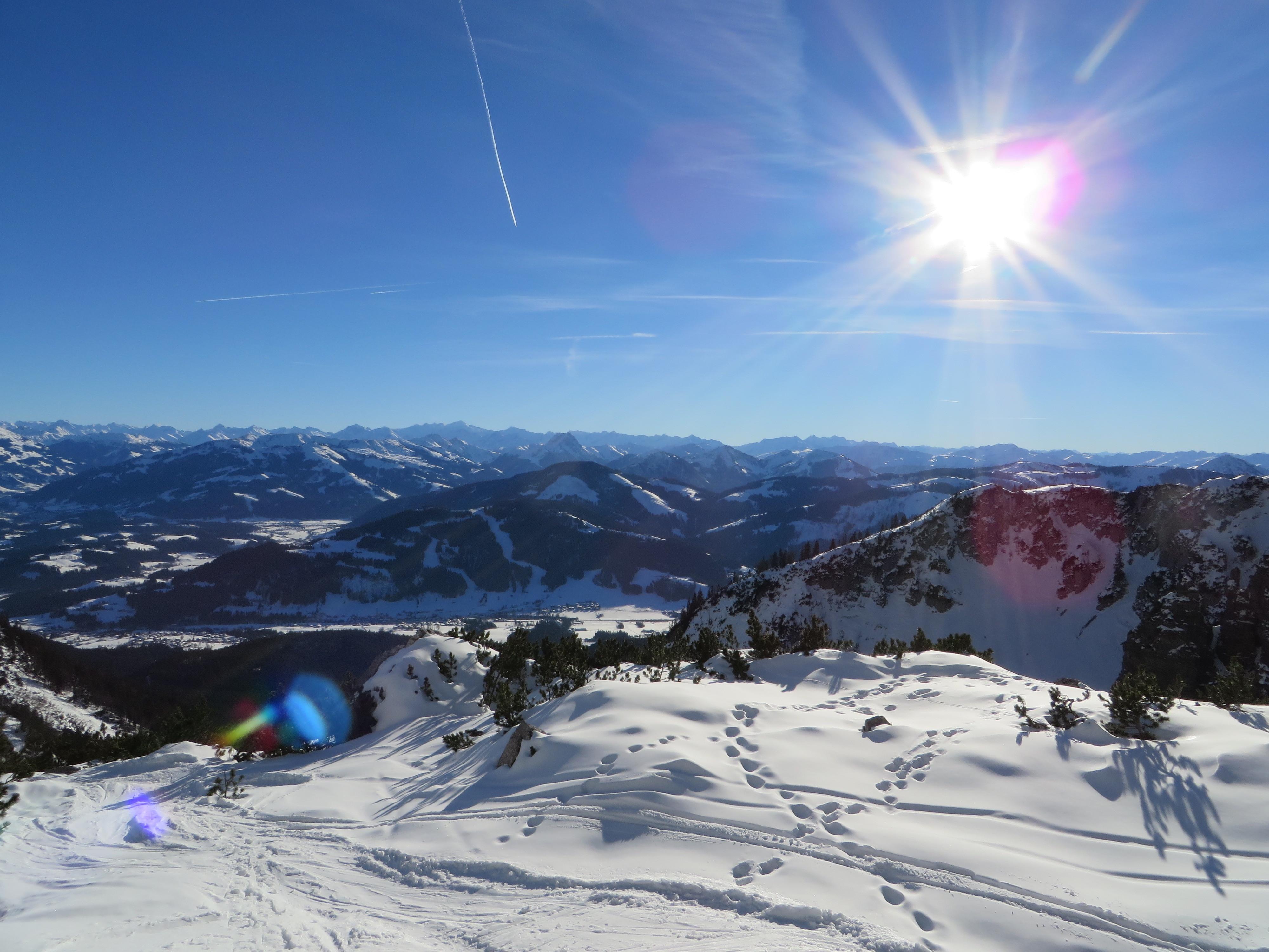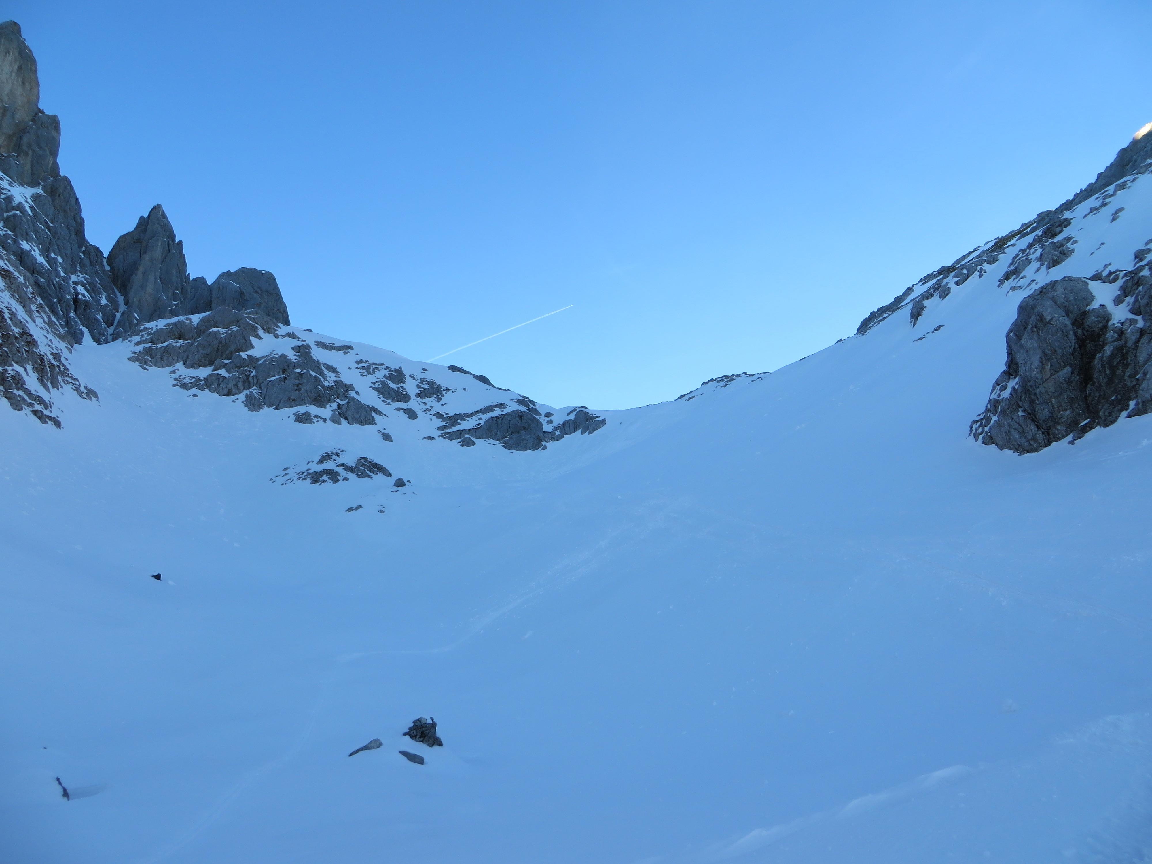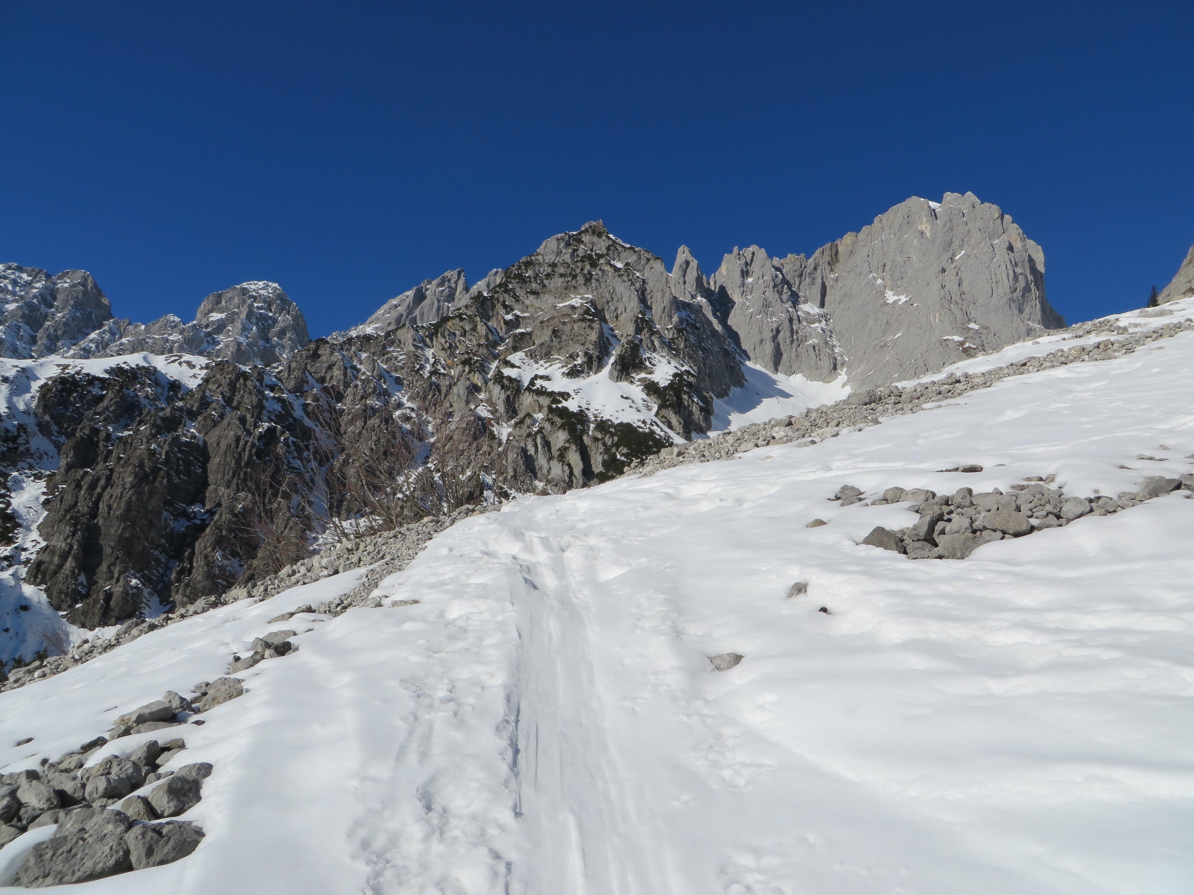 Quasi vorauseilend als Ergänzung zu Alois Herzigs "Firntest Wilder Kaiser“ einen Tag zuvor Start mit Schneeschuhen am späteren Vormittag an der Wochenbrunner Alm (mit dem heckgetriebenen Fahrzeug beinahe auf dem Weg hierher glättehalber gescheitert, niemand an der Mautstelle, am Parkplatz nur eine Handvoll Autos) bei wolkenlos-blauem Himmel, Sonnenschein und gemessenen -2° C (gefühlt deutlich wärmer) über den Normalweg zur Gaudeamushütte (ab hier noch im T-Shirt viel zu warm, Mütze als Sonnenschutz unverzichtbar), von dort älteren Skispuren wechselnd folgend und den mageren Schnee bestmöglich nutzend entsprechend einem Wegverlauf irgendwo zwischen dem Sommerweg und der in der Alpenvereinskarte eingetragenen Skiroute aufwärts und einige richtig schneearme weil abgewehte und/oder zusammengeschmolzene Bereiche mit erheblicher Steinspickung sowie eine gänzlich apere Rinne kurz unterhalb der Terrassenkante im unteren Kübelkar querend; nach ausgedehnter Rast in der Sonne bei perfektem Panorama bei ab hier mehr und wieder geschlossen Schnee auf etlichen Alt-Lawinen mit teils grösseren Knollen weiter vorwiegend in der Falllinie ansteigend und Querungen tunlichst meidend bis etwa 1920 m (Hangneigung teils bis um 45° mit vollkommen gesetzter und verfestigter Schneedecke variabler Mächtigkeit), dann im oberen Kübelkar vor dem letzten Hang knapp unterhalb vom Ellmauer Tor angesichts der fortgeschrittenen Zeit und des anbrechenden Schattens umgedreht und zum Abstieg die etwas flacheren Hangbereiche nutzend und weiter unterhalb des Kübelkars und seinen eben so ein bisserl eingeschneiten Latschen über die schmalen gerade schneebedeckten Rinnen absteigend auf den Weg zur Gaudeamushütte zu und von dort zum Parkplatz zurück.