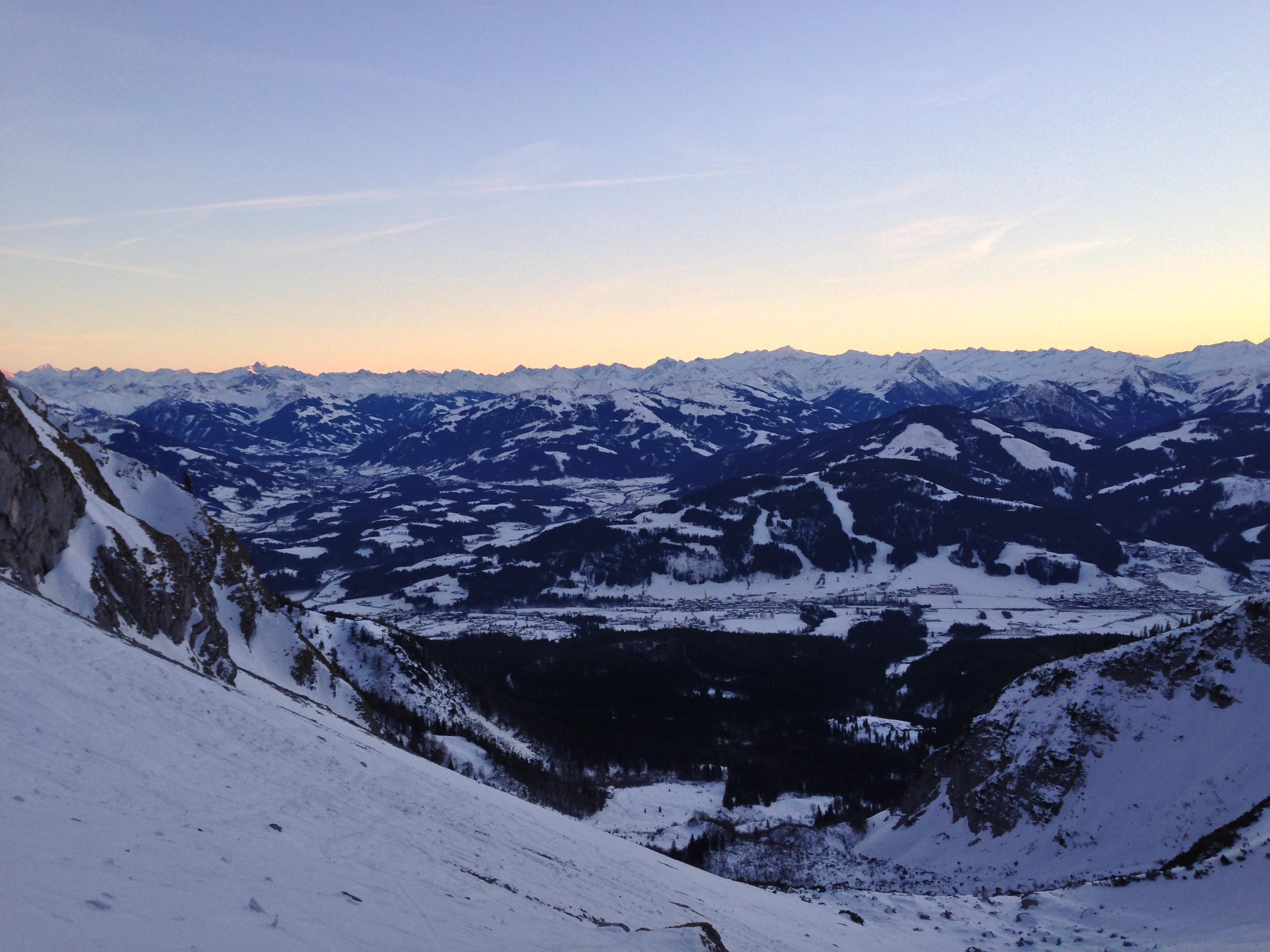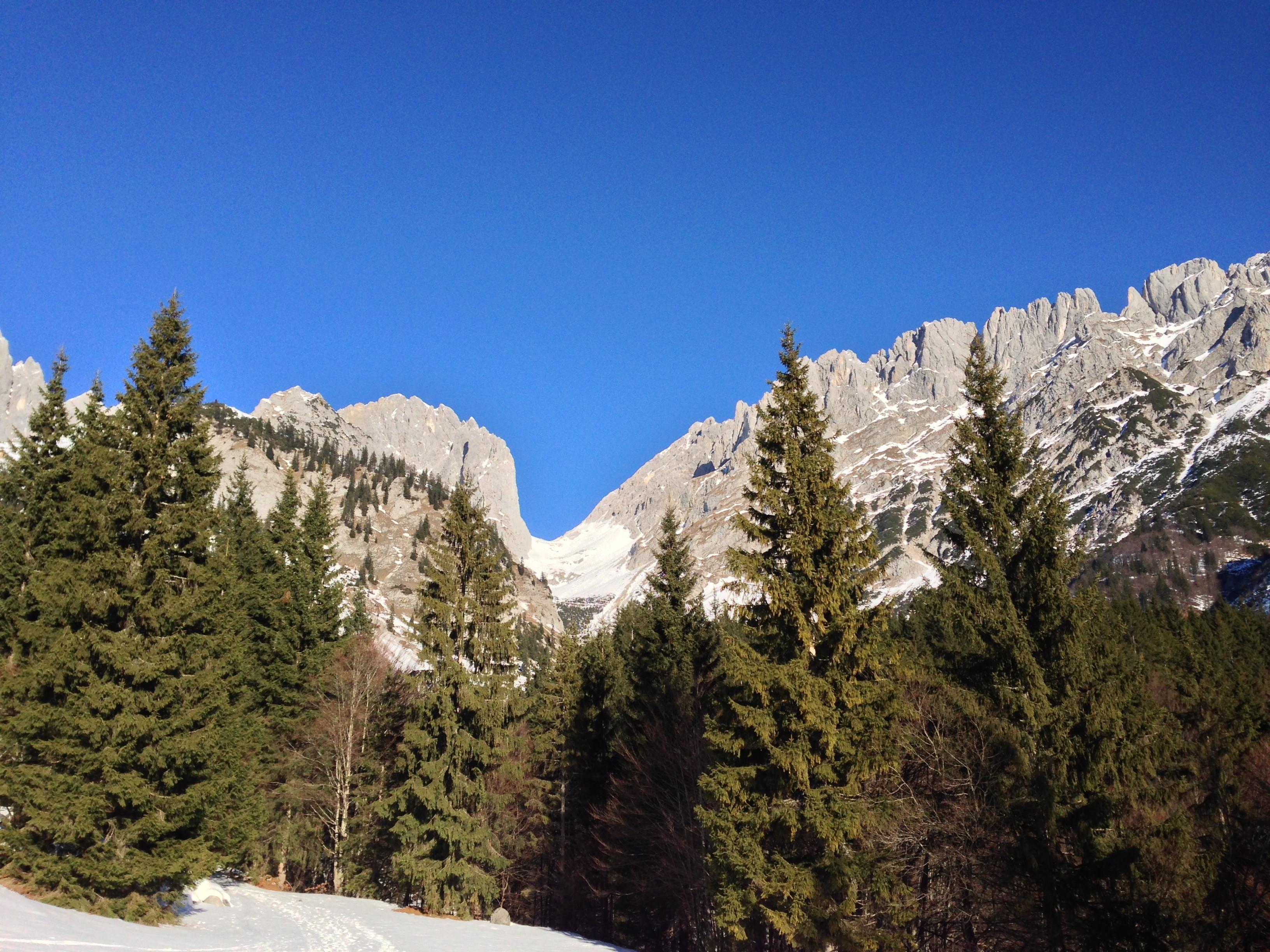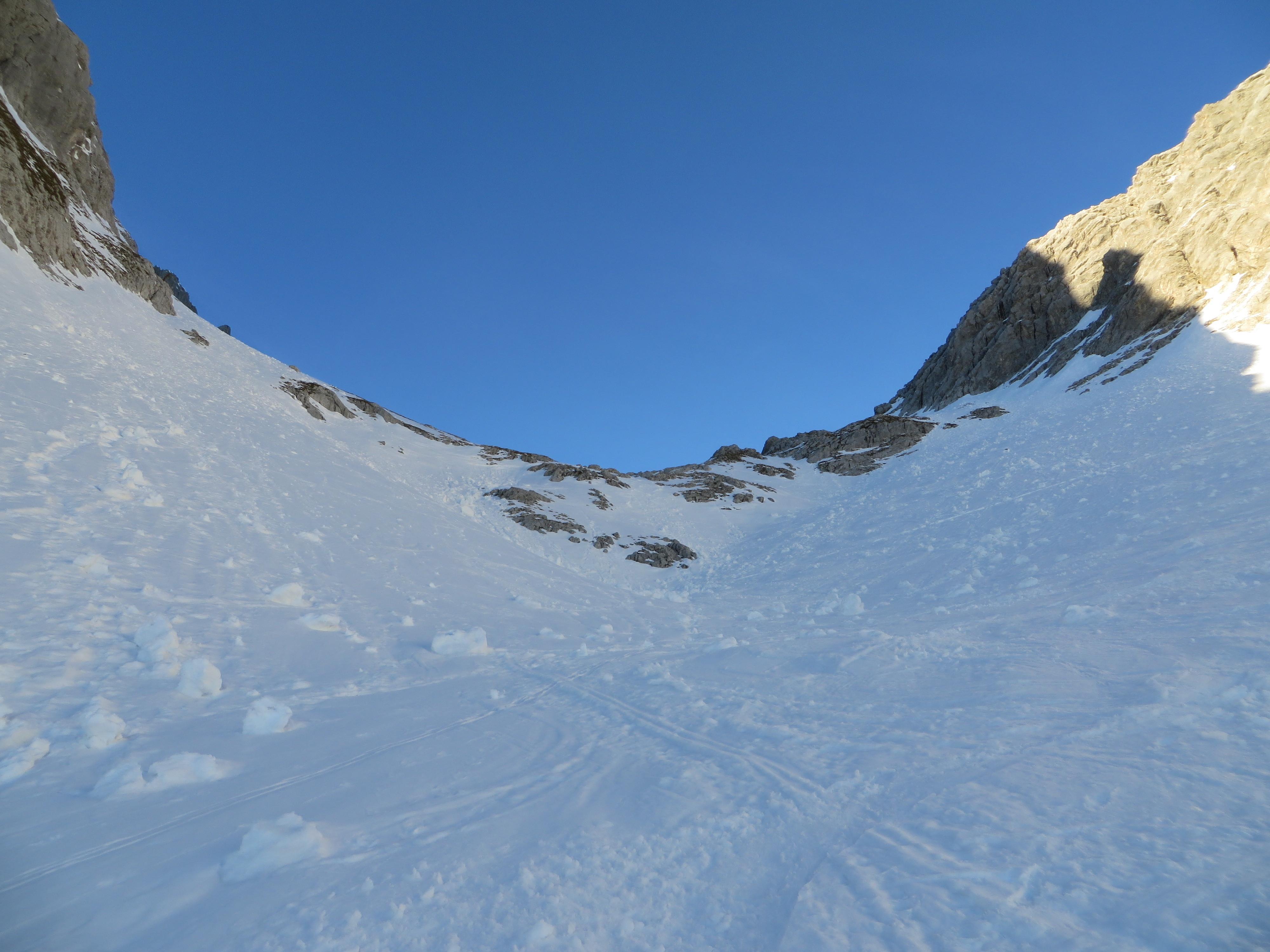 Quasi vorauseilend als Ergänzung zu Alois Herzigs "Firntest Wilder Kaiser“ einen Tag zuvor Start mit Schneeschuhen am späteren Vormittag an der Wochenbrunner Alm (mit dem heckgetriebenen Fahrzeug beinahe auf dem Weg hierher glättehalber gescheitert, niemand an der Mautstelle, am Parkplatz nur eine Handvoll Autos) bei wolkenlos-blauem Himmel, Sonnenschein und gemessenen -2° C (gefühlt deutlich wärmer) über den Normalweg zur Gaudeamushütte (ab hier noch im T-Shirt viel zu warm, Mütze als Sonnenschutz unverzichtbar), von dort älteren Skispuren wechselnd folgend und den mageren Schnee bestmöglich nutzend entsprechend einem Wegverlauf irgendwo zwischen dem Sommerweg und der in der Alpenvereinskarte eingetragenen Skiroute aufwärts und einige richtig schneearme weil abgewehte und/oder zusammengeschmolzene Bereiche mit erheblicher Steinspickung sowie eine gänzlich apere Rinne kurz unterhalb der Terrassenkante im unteren Kübelkar querend; nach ausgedehnter Rast in der Sonne bei perfektem Panorama bei ab hier mehr und wieder geschlossen Schnee auf etlichen Alt-Lawinen mit teils grösseren Knollen weiter vorwiegend in der Falllinie ansteigend und Querungen tunlichst meidend bis etwa 1920 m (Hangneigung teils bis um 45° mit vollkommen gesetzter und verfestigter Schneedecke variabler Mächtigkeit), dann im oberen Kübelkar vor dem letzten Hang knapp unterhalb vom Ellmauer Tor angesichts der fortgeschrittenen Zeit und des anbrechenden Schattens umgedreht und zum Abstieg die etwas flacheren Hangbereiche nutzend und weiter unterhalb des Kübelkars und seinen eben so ein bisserl eingeschneiten Latschen über die schmalen gerade schneebedeckten Rinnen absteigend auf den Weg zur Gaudeamushütte zu und von dort zum Parkplatz zurück.