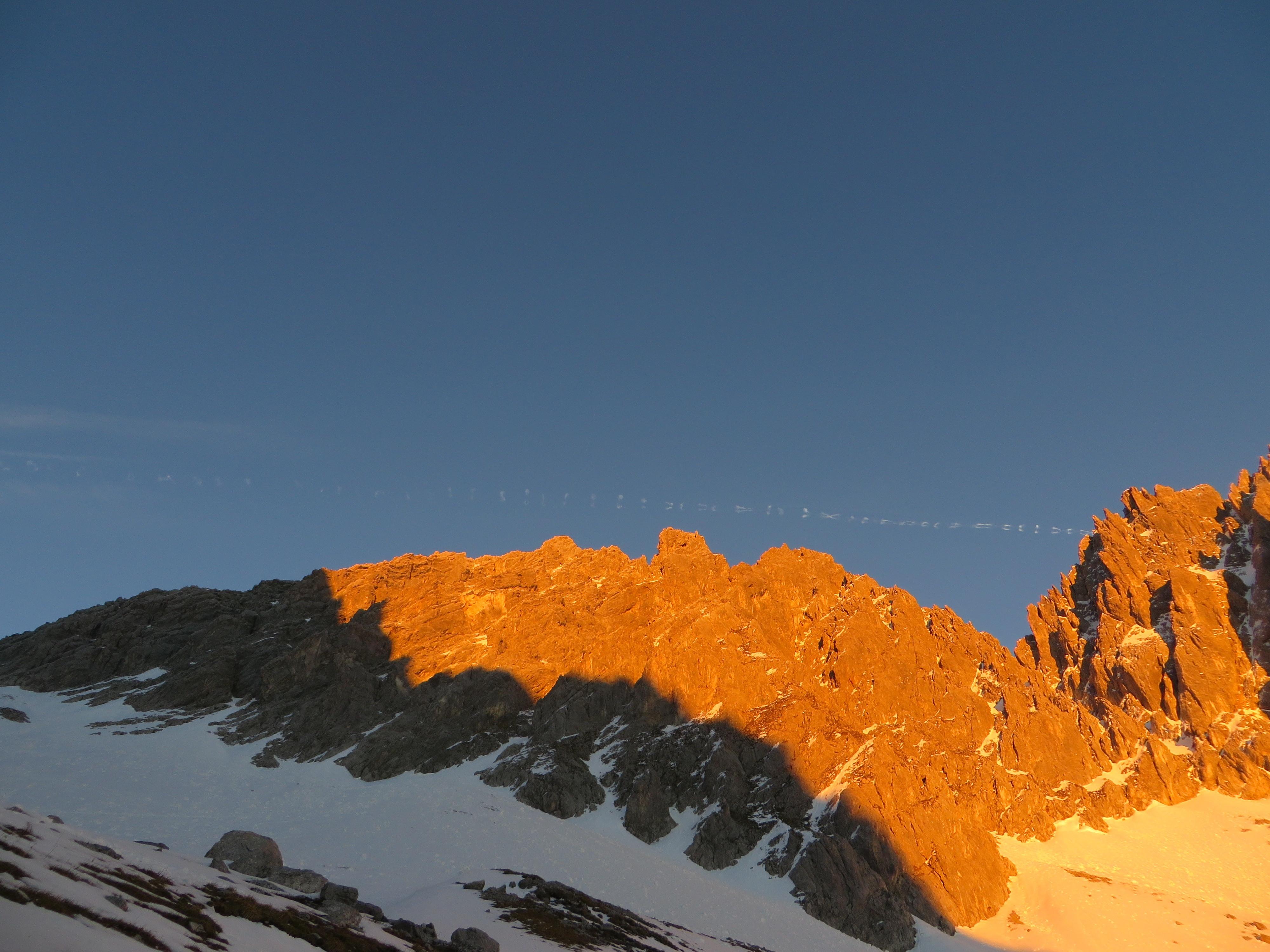 Schnee: buntes Allerlei bis auf Bruchharsch, schattseitig erfreulicher Pulver, gesetzte Schneedecke bei bescheidenen Schneehöhen mit vielen verblasenen/aperen/abgetauten Bereichen insbesondere zwischen Gaudeamushütte und unterem Kübelkar (der eine einzige Skitourengeher, den ich aus der Ferne gesehen habe, tat mir richtig leid), in den oberen Bereichen auch an steilen Hängen fest, wenige eingewehte Areale; insgesamt aber viel zu wenig Schnee - und wo er ist ziemlich zerfahren...