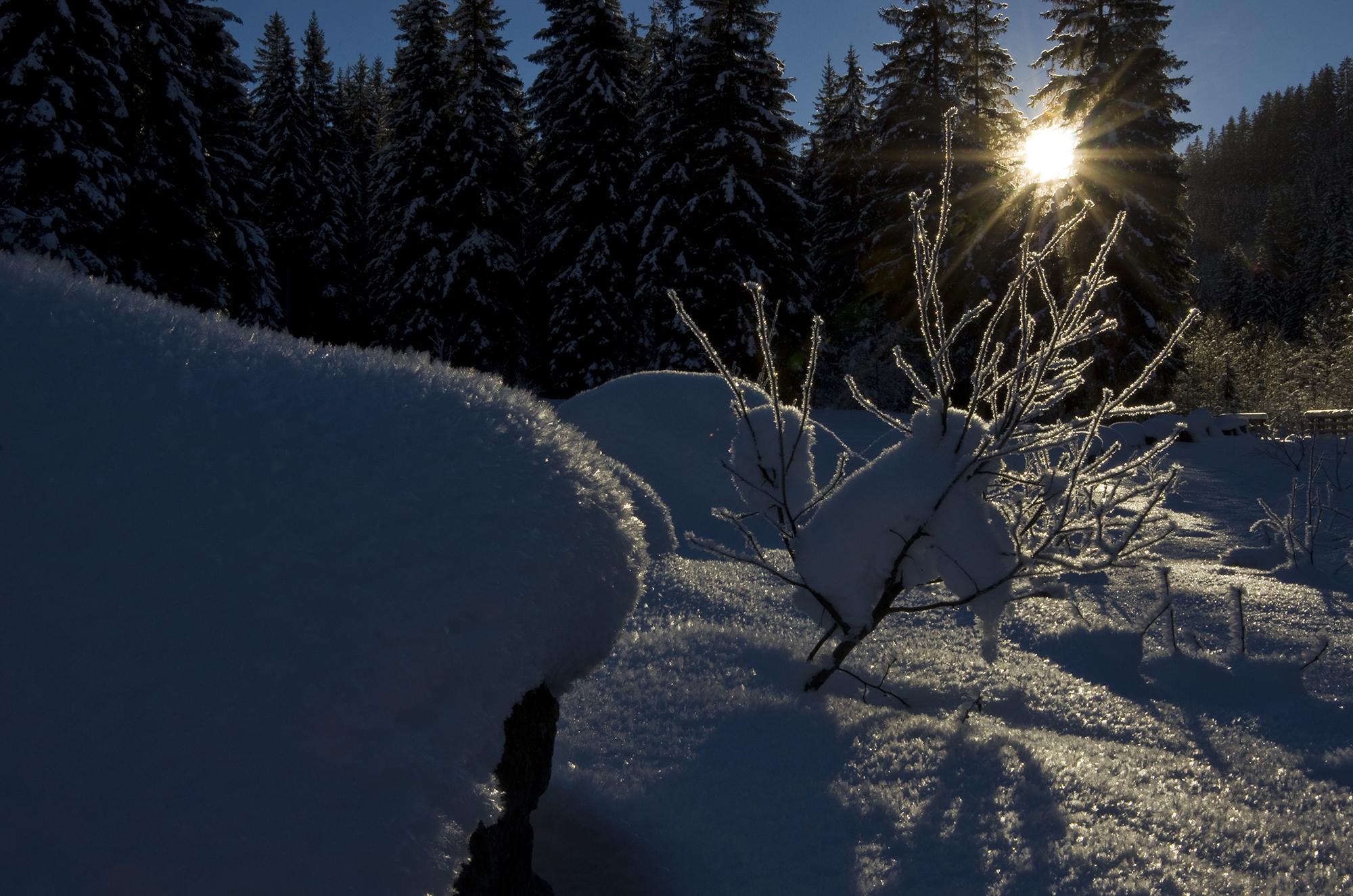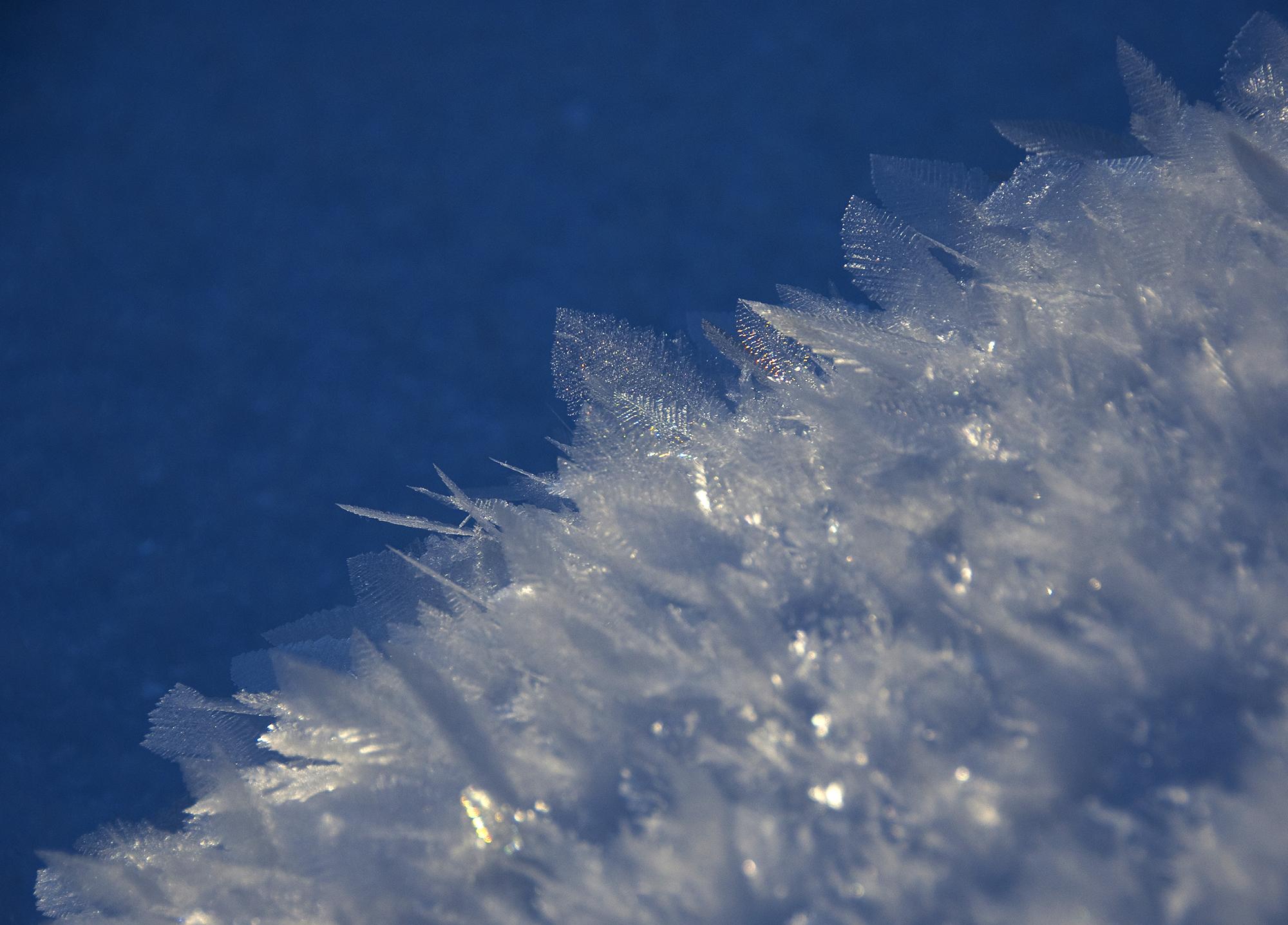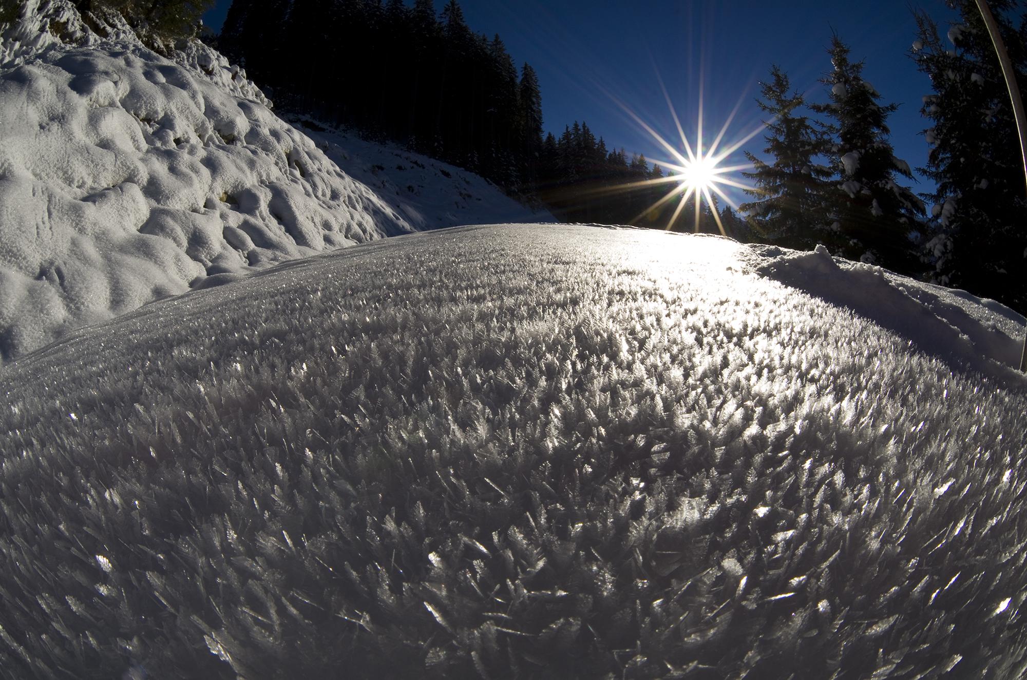 Bei minus 13,5° im Schwarzachgraben sind über Nacht den Sträuchern Blätter gewachsen. Es raschelt beim Anstieg in den großen Reifkristallen.