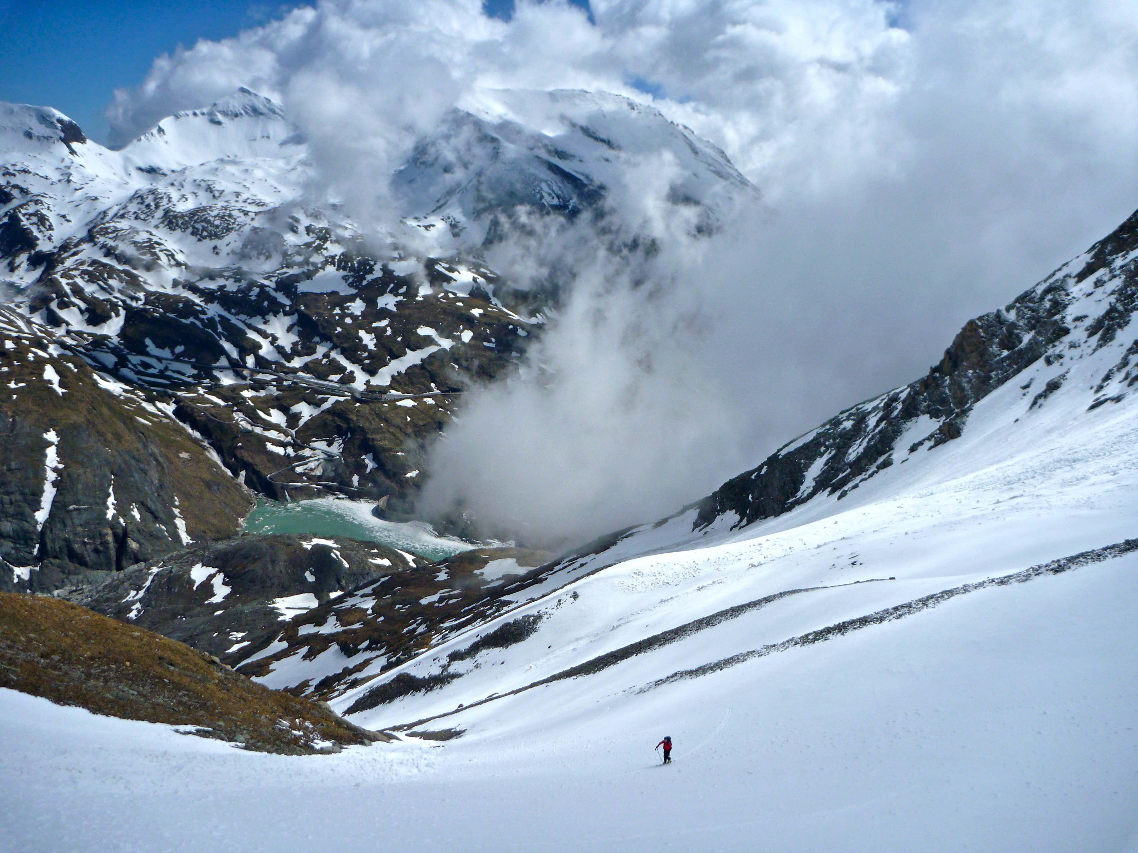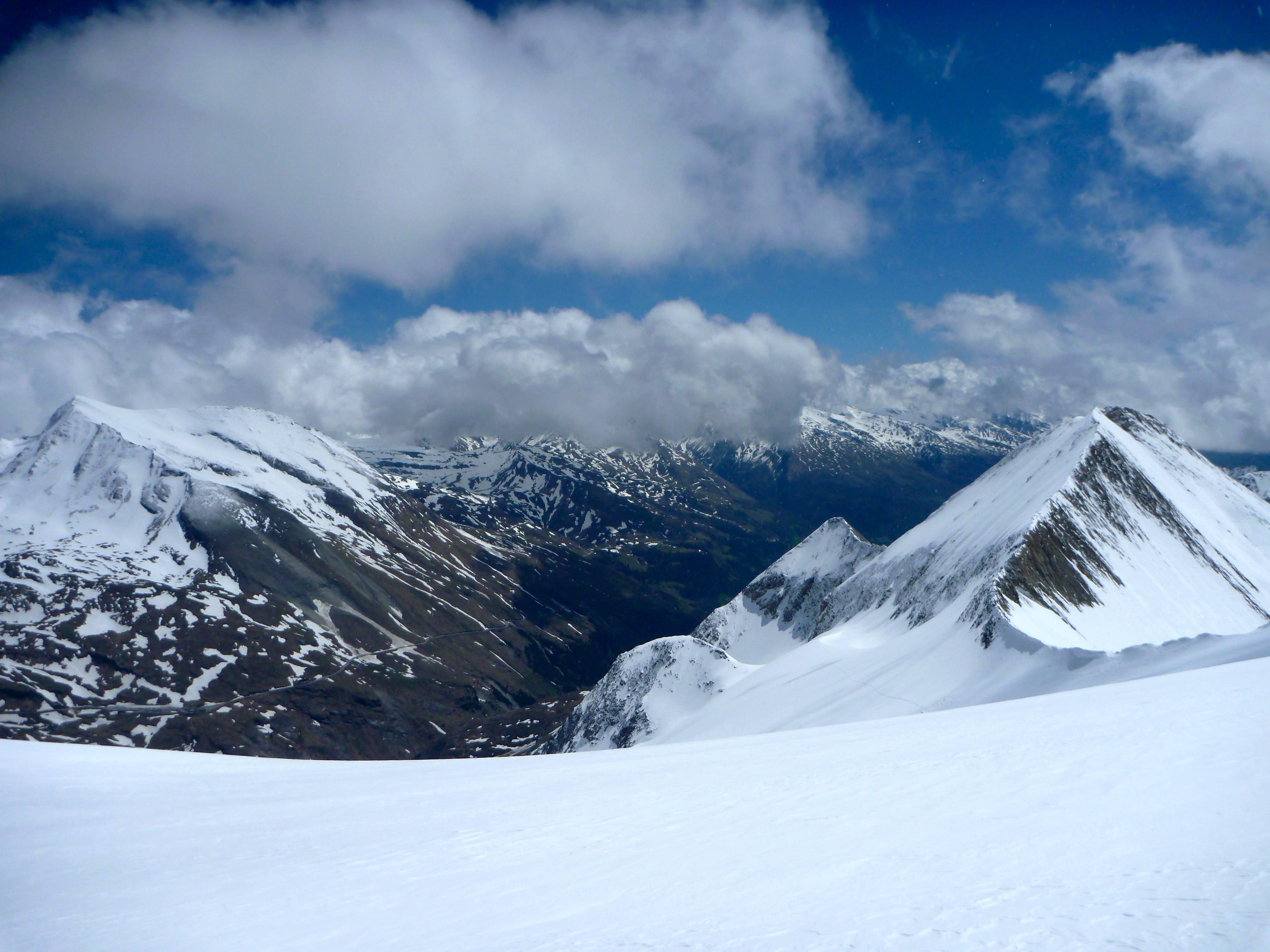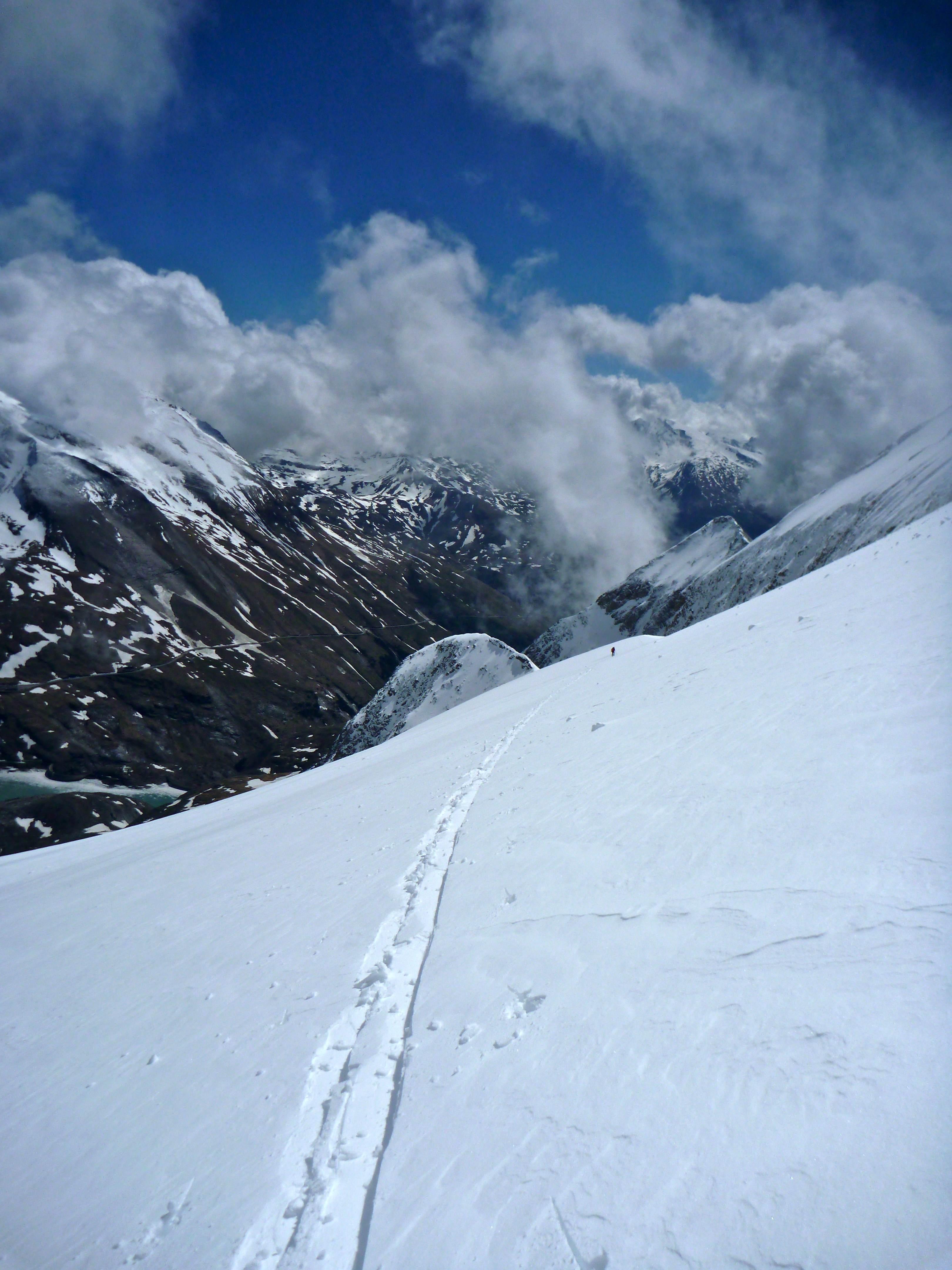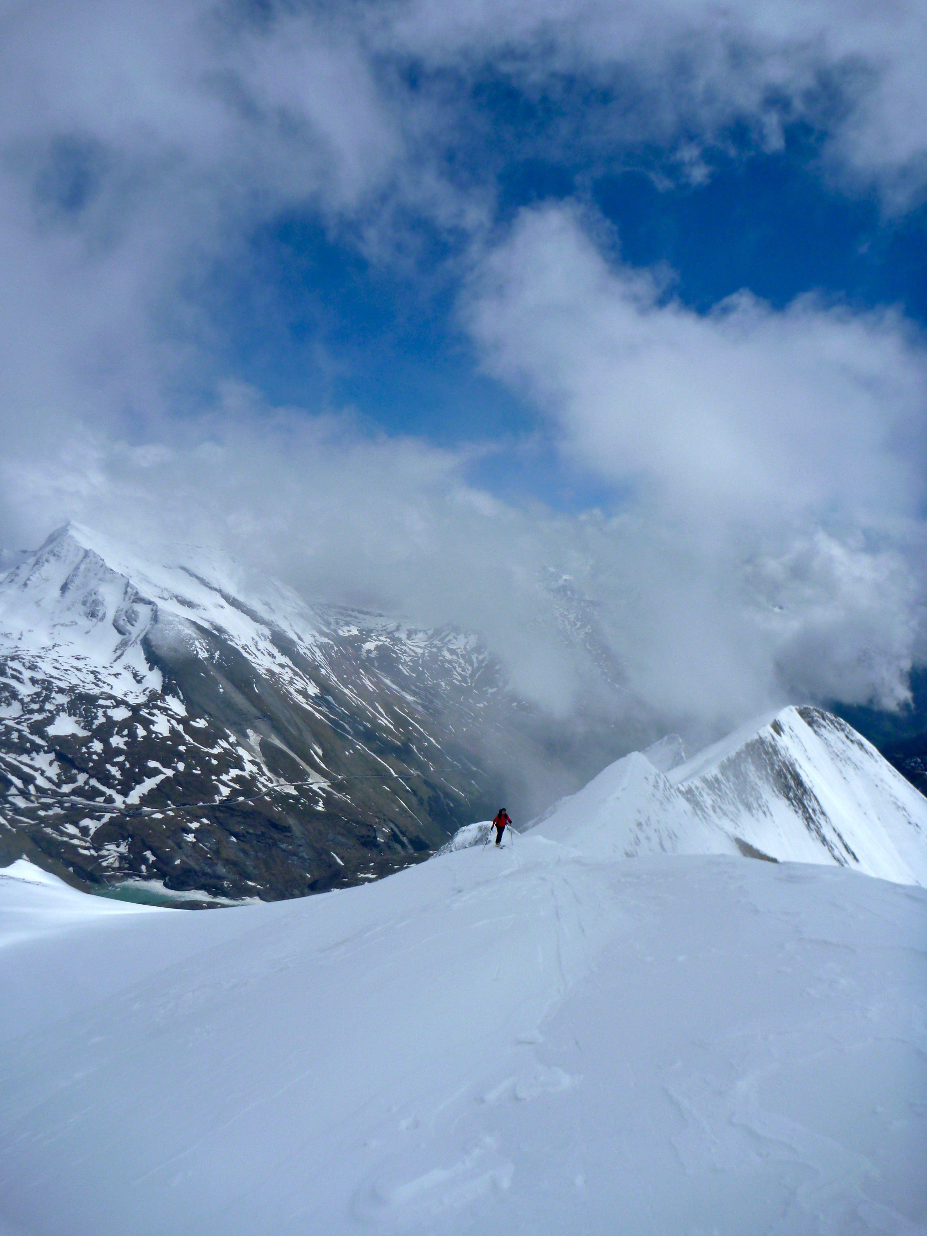 Vom Glocknerhaus ging`s hinab zum Margaritzenspeicher dann ein wenig zu Fuß und bald mit Skiern bis zum Gipfel des Schwertecks. Lästiger Wind war ein ständiger Begleiter, zwischendurch gab`s auch Sonne und Nebelbänke, bei der Schneedecke war von windgepresstem Pulver über Windharsch, nassem Altschnee oder reinem Gras bzw. Schotter alles dabei.