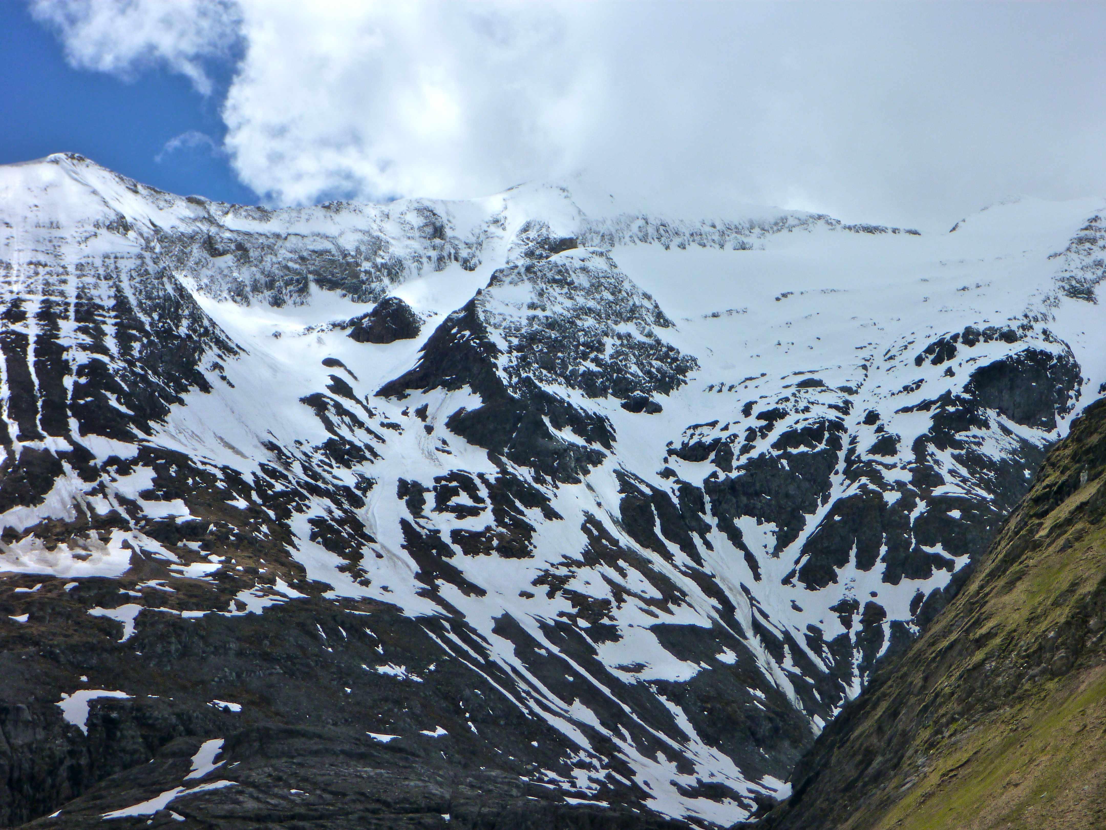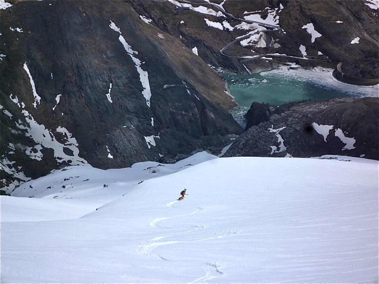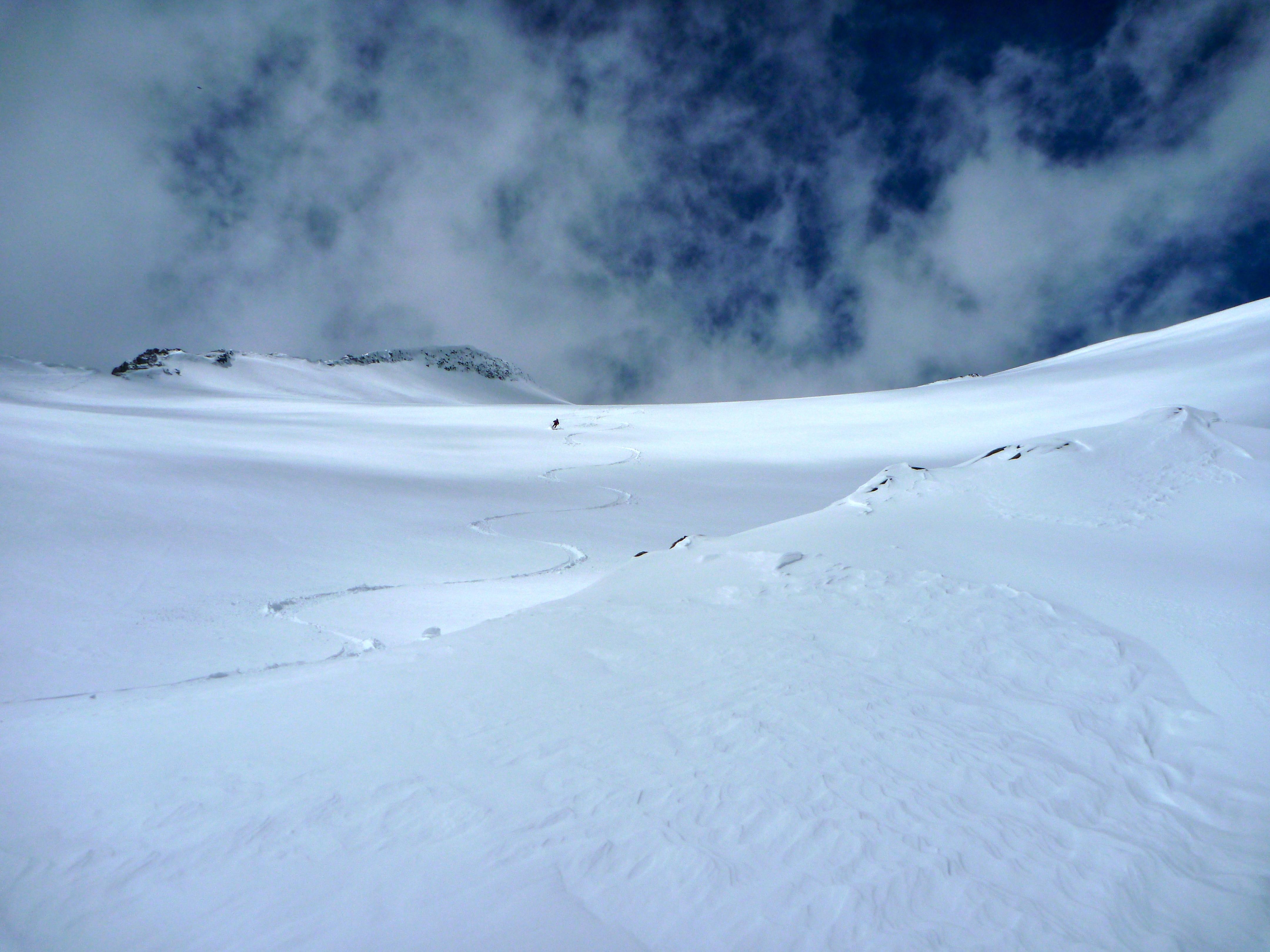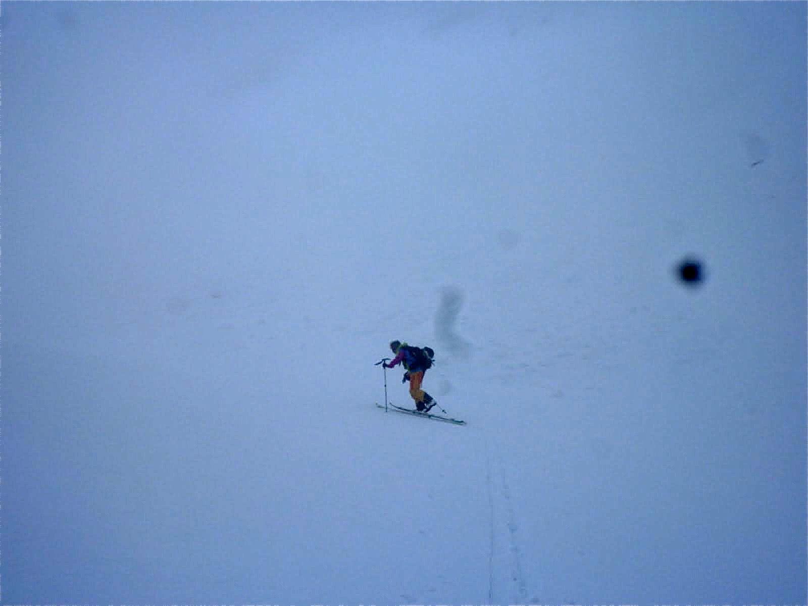 Vom Glocknerhaus ging`s hinab zum Margaritzenspeicher dann ein wenig zu Fuß und bald mit Skiern bis zum Gipfel des Schwertecks. Lästiger Wind war ein ständiger Begleiter, zwischendurch gab`s auch Sonne und Nebelbänke, bei der Schneedecke war von windgepresstem Pulver über Windharsch, nassem Altschnee oder reinem Gras bzw. Schotter alles dabei.