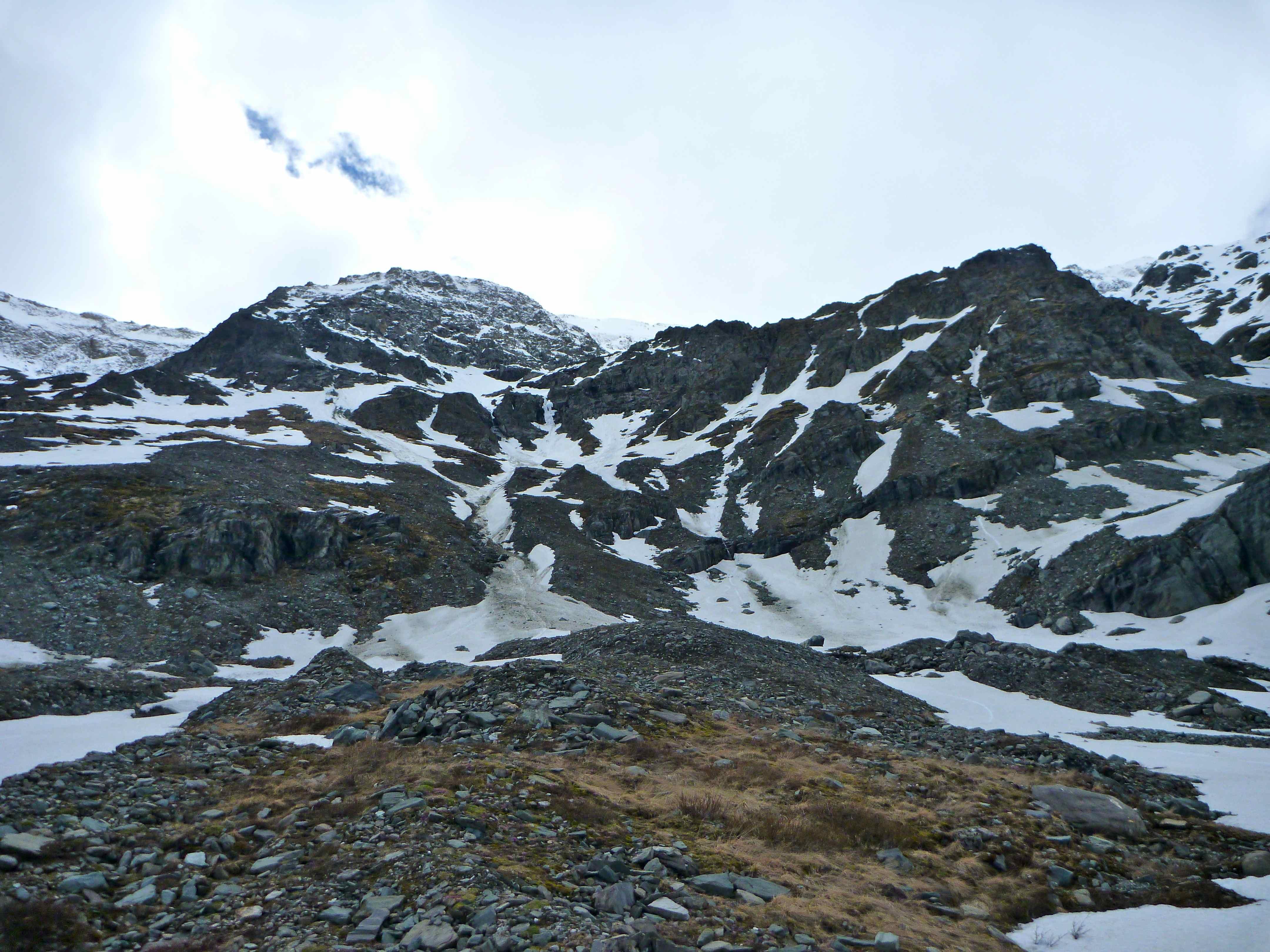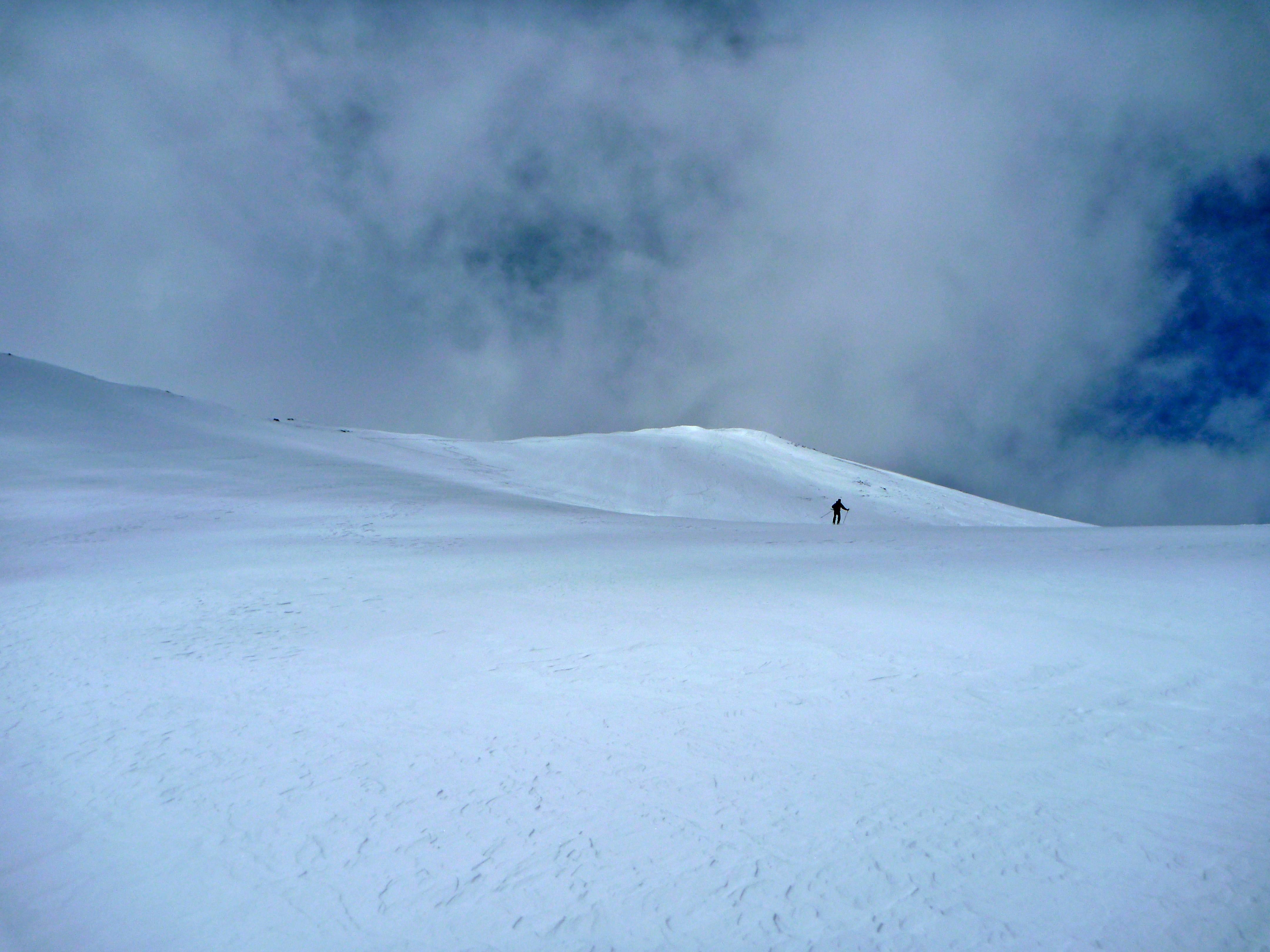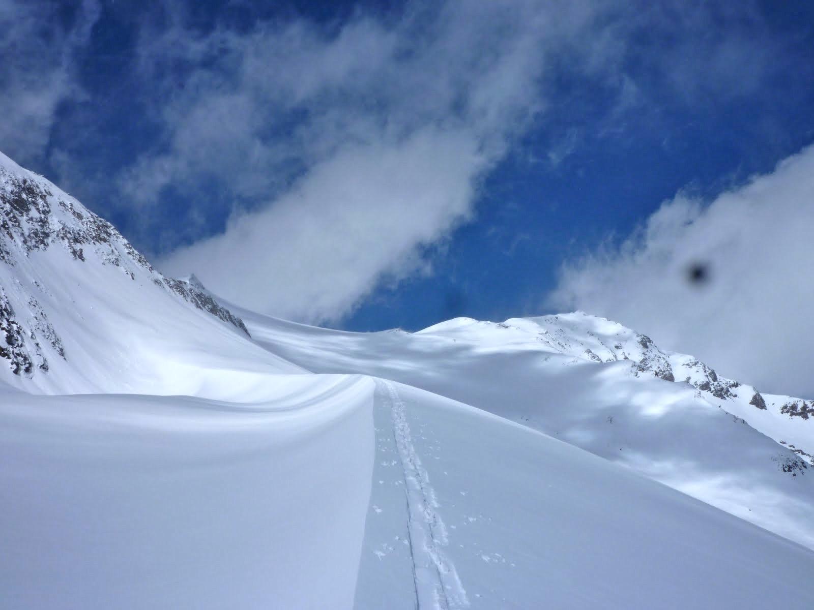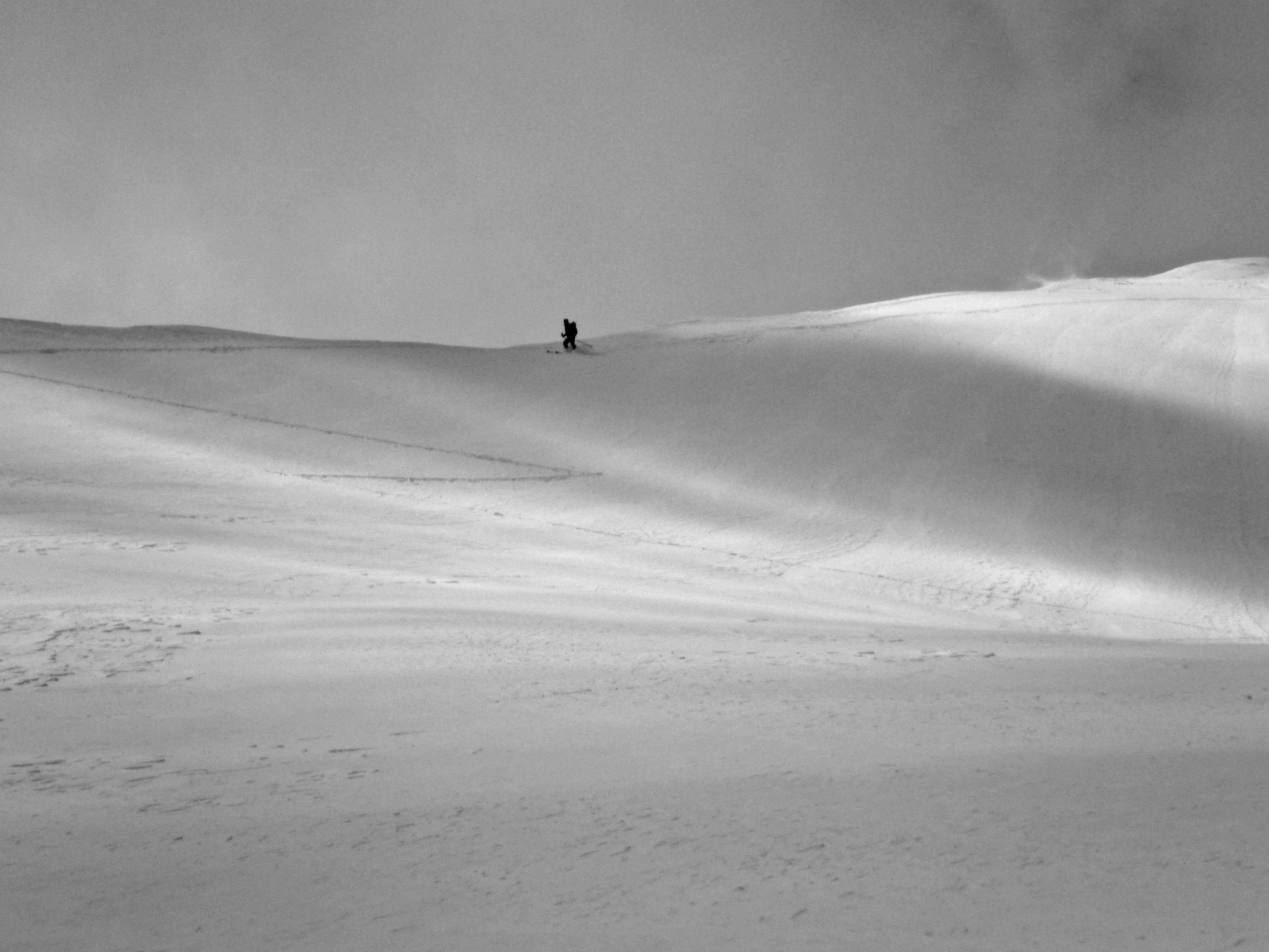 Vom Glocknerhaus ging`s hinab zum Margaritzenspeicher dann ein wenig zu Fuß und bald mit Skiern bis zum Gipfel des Schwertecks. Lästiger Wind war ein ständiger Begleiter, zwischendurch gab`s auch Sonne und Nebelbänke, bei der Schneedecke war von windgepresstem Pulver über Windharsch, nassem Altschnee oder reinem Gras bzw. Schotter alles dabei.