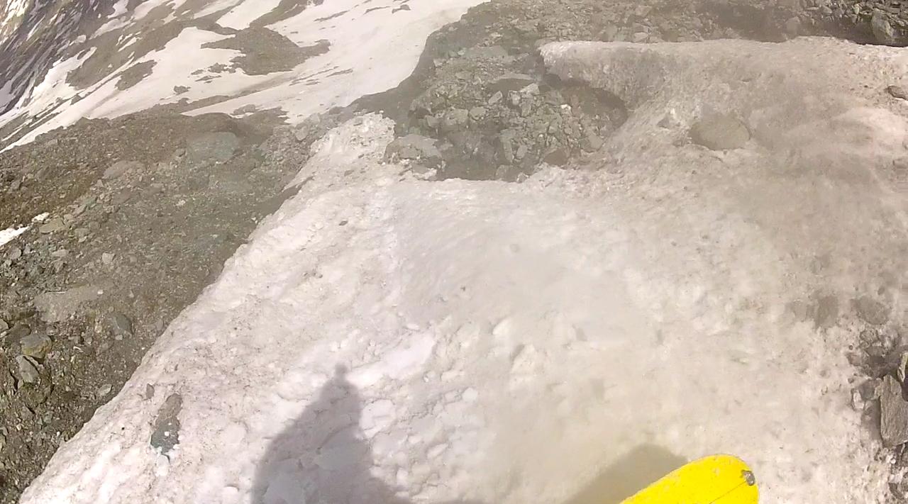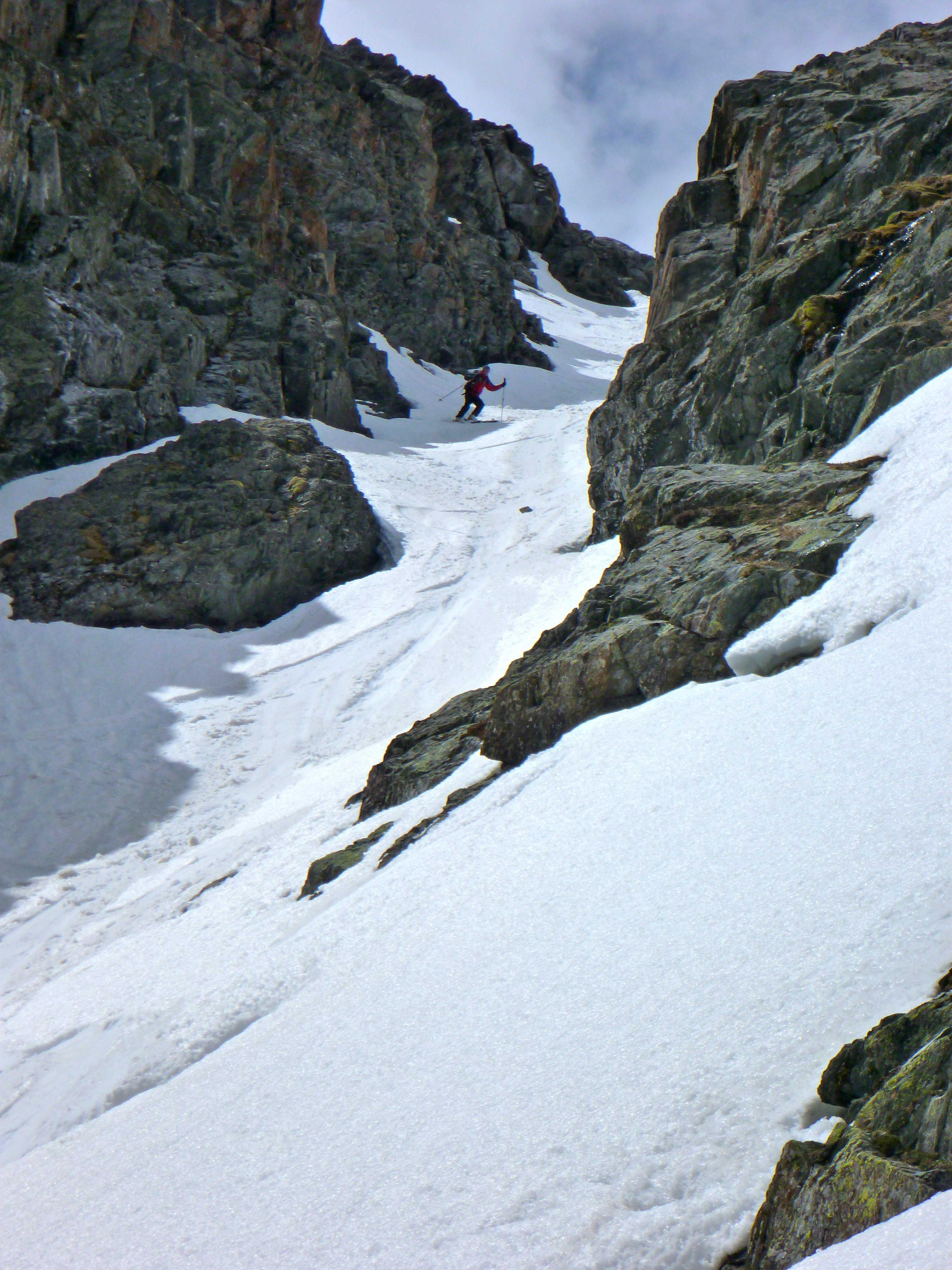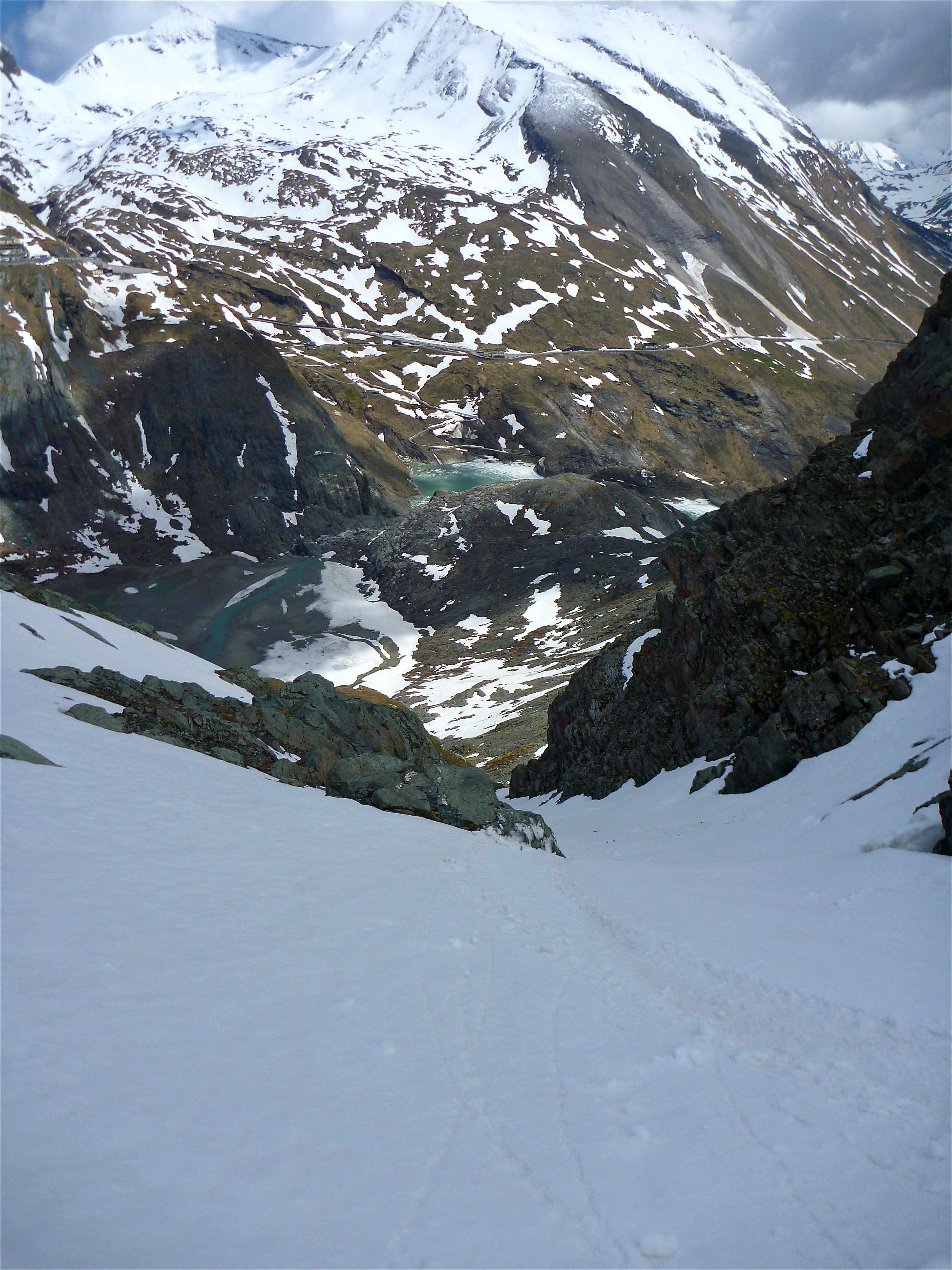Die direkte Abfahrt durch die schmale (min. 5m) nicht allzu steile (max. 40°) Rinne war mit einer kurzen Unterbrechung im untersten Teil bis zum Sandersee möglich und echt lässig.