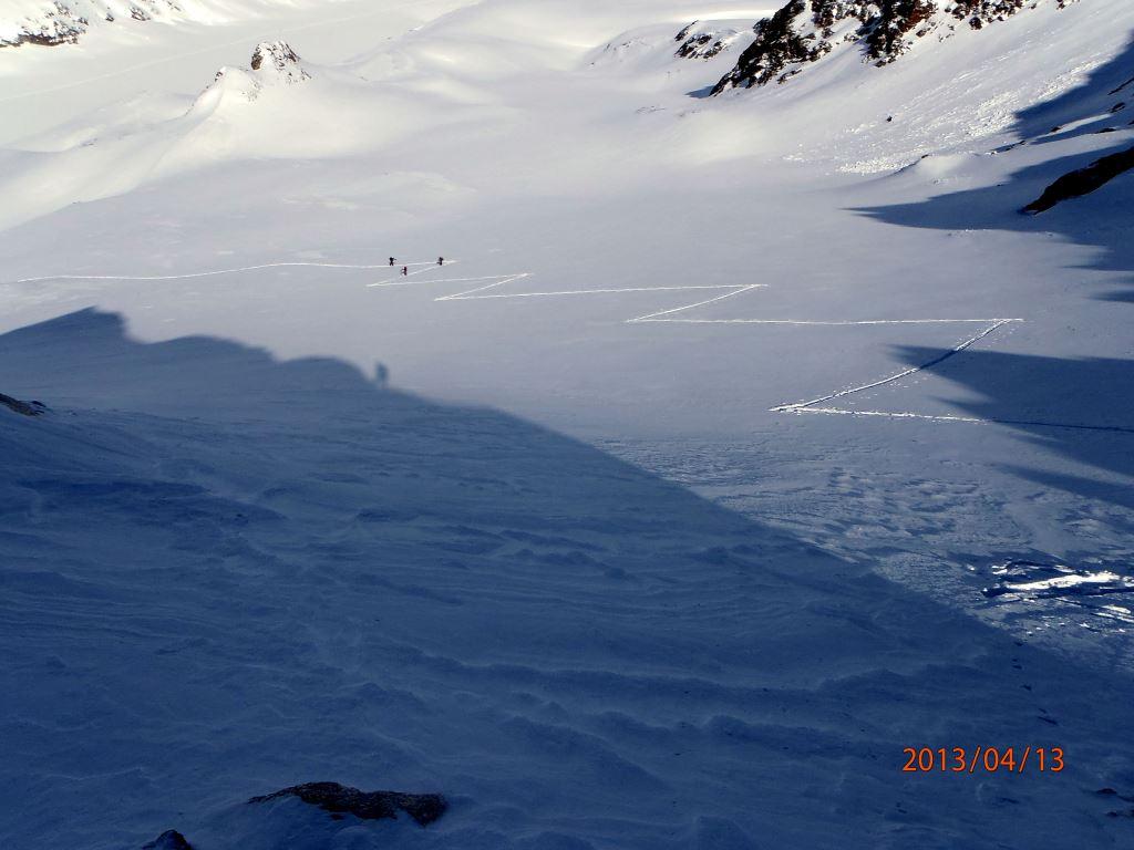 Es hatte sich gelohnt, den bei der Abfahrt um 11 Uhr hatten wir 20 cm Pulver auf griffiger Unterlage, während sich auf den Sonnenhängen bereits nasse Lockerschneelawinen bemerkbar machten.