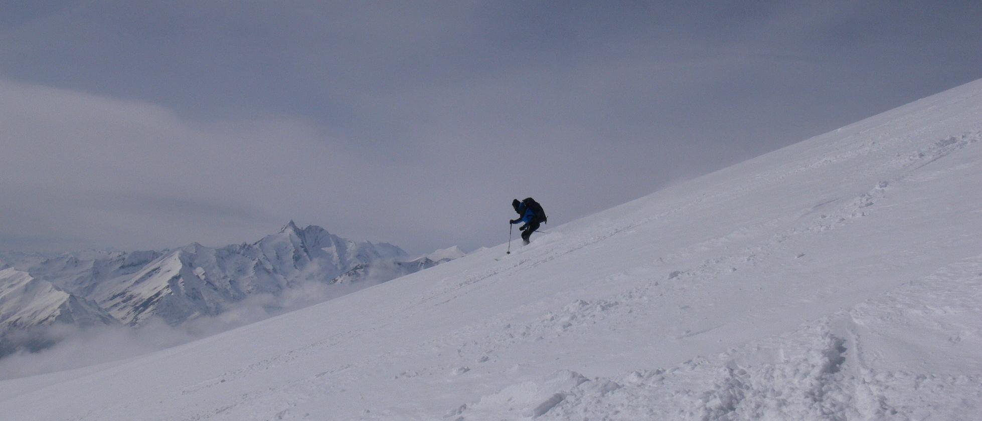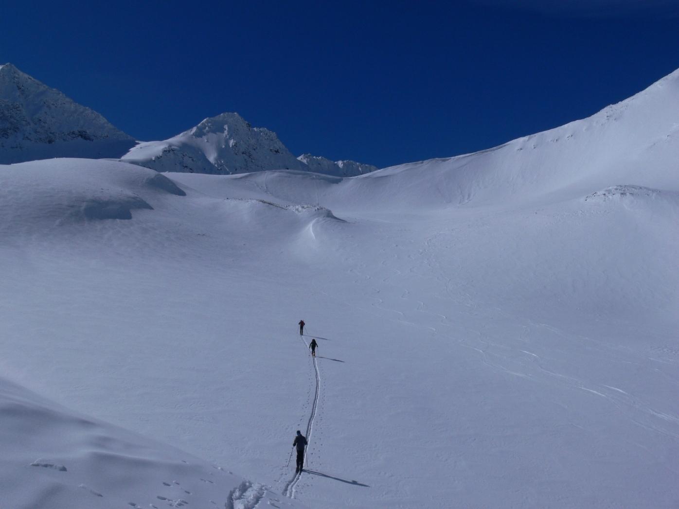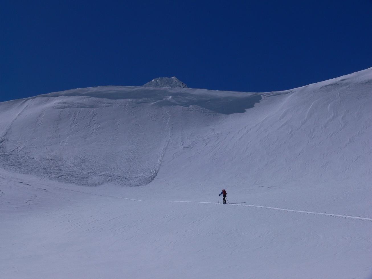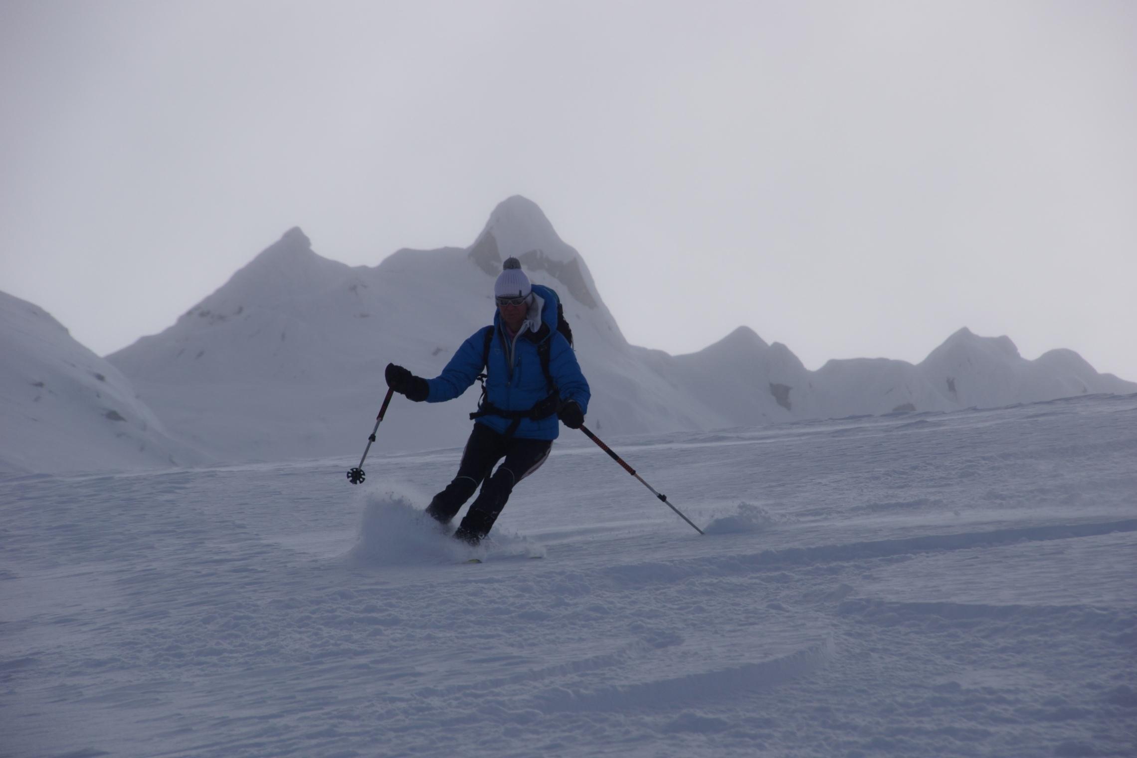 Im Anstieg waren Harscheisen von Vorteil, da der vom Wind verfrachtete Schnee auf der festen Altschneedecke ständig abrutschte. Perfekte Abfahrtsbedingungen: vom Gipfel bis zum „Neubau“ ca. 15 cm gesetzter Pulver, unterhalb des Neubaus hat der starke Wind die Schneedecke entsprechend bearbeitet.